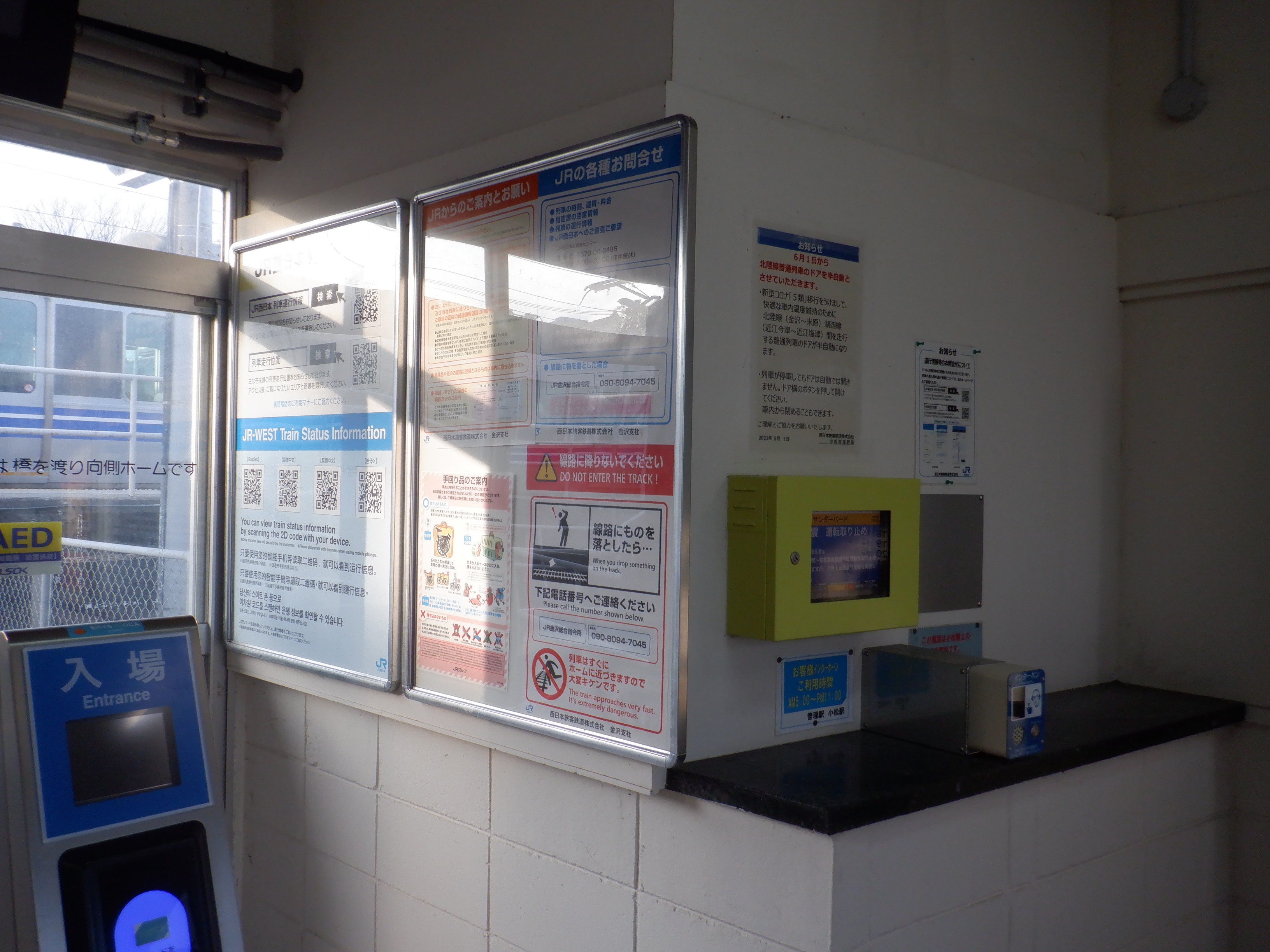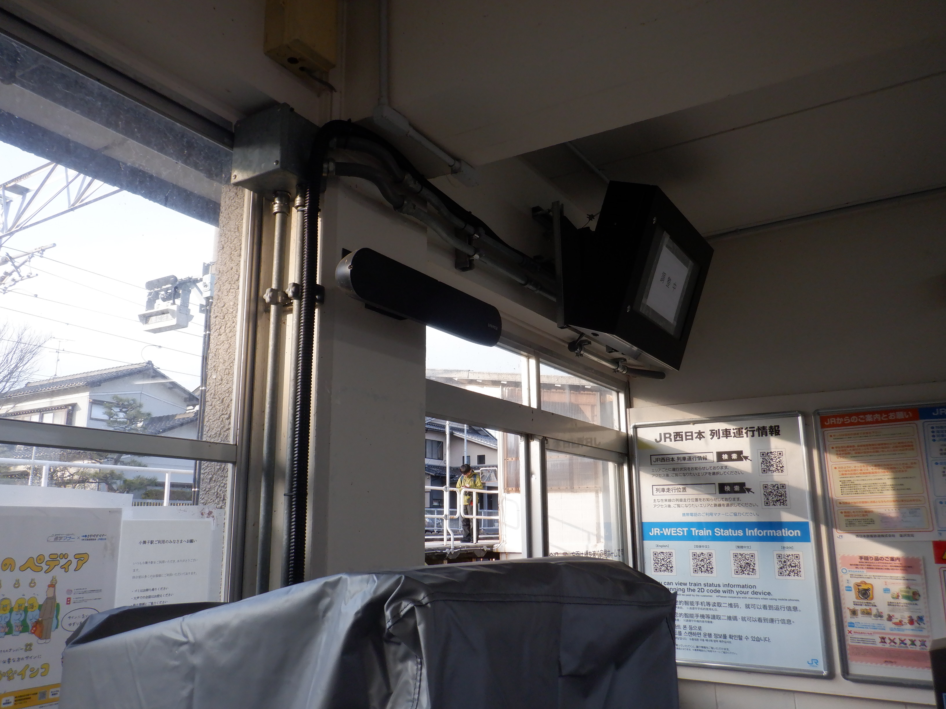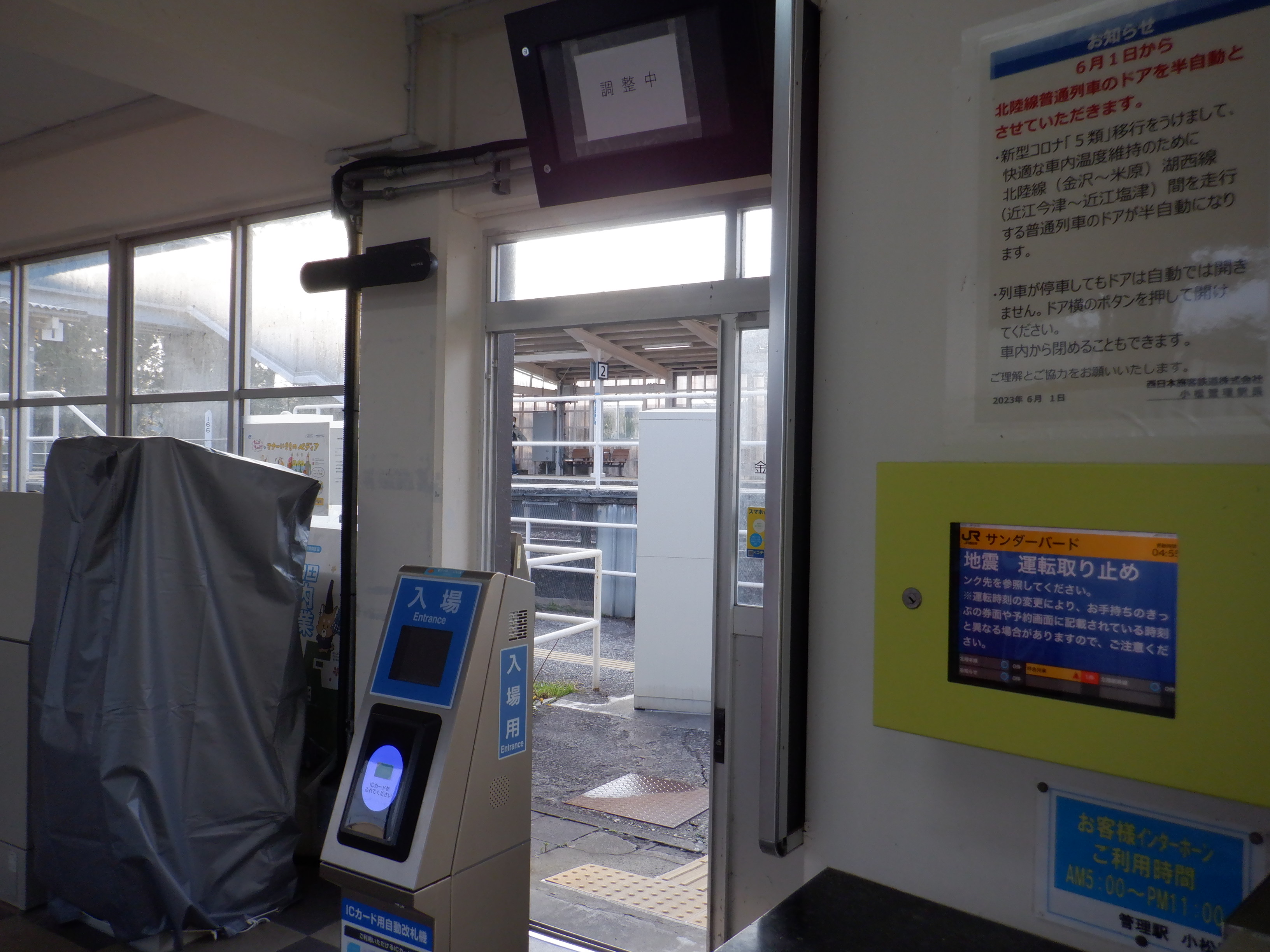 カバーを被った移管後の券売機。その後ろにIRいしかわ鉄道県内全線開業ポスターがあります。
