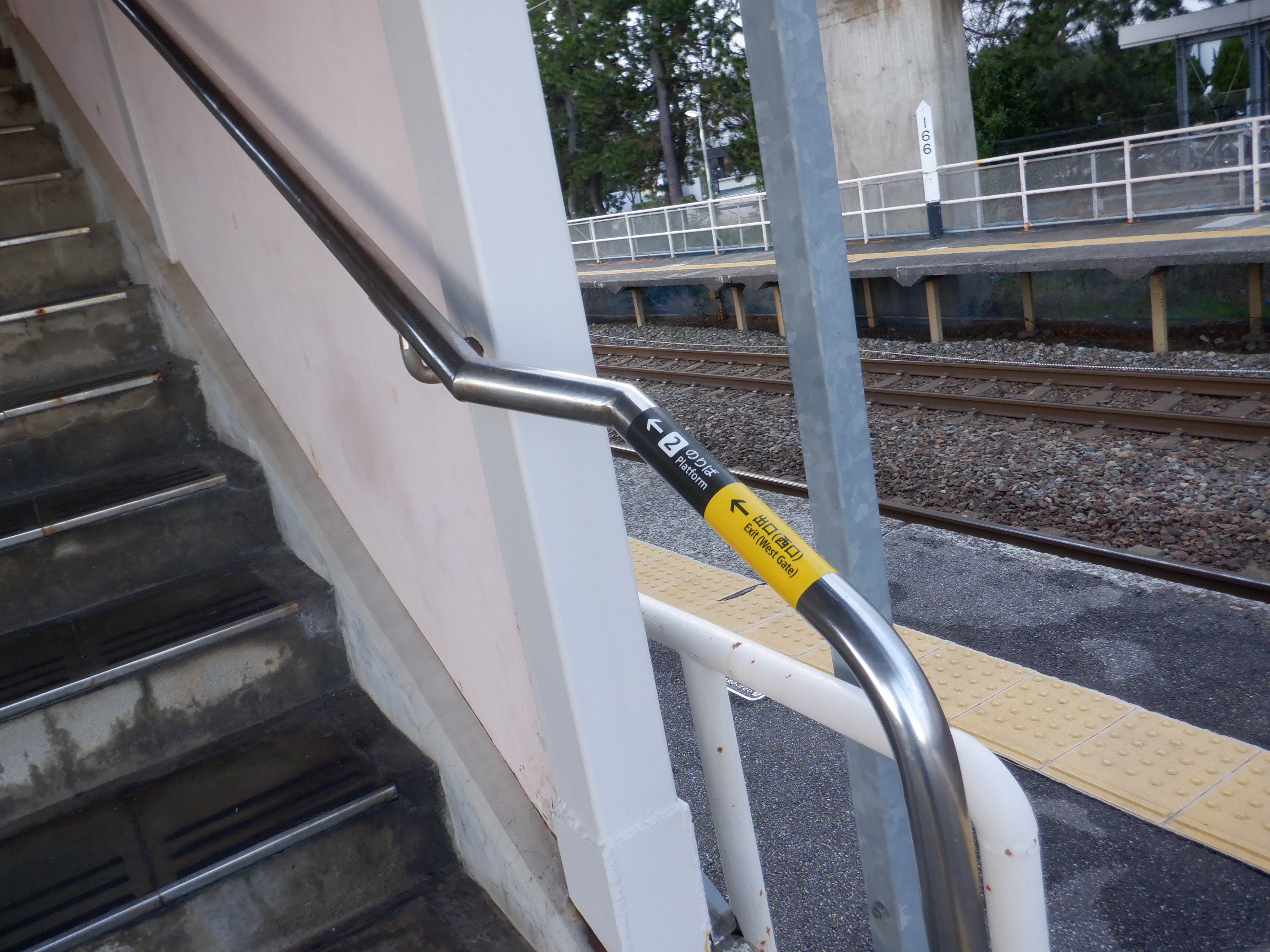 2番のりば側の跨線橋階段。手すりの案内は前回新しくなっていましたが、改めて今回見ています。