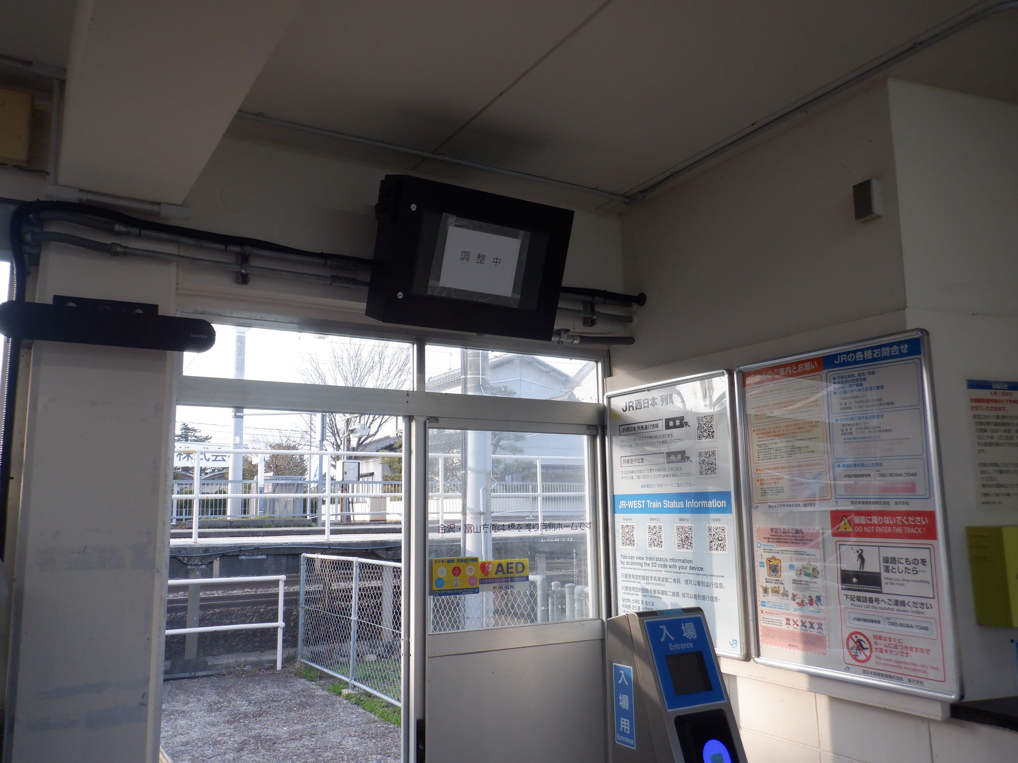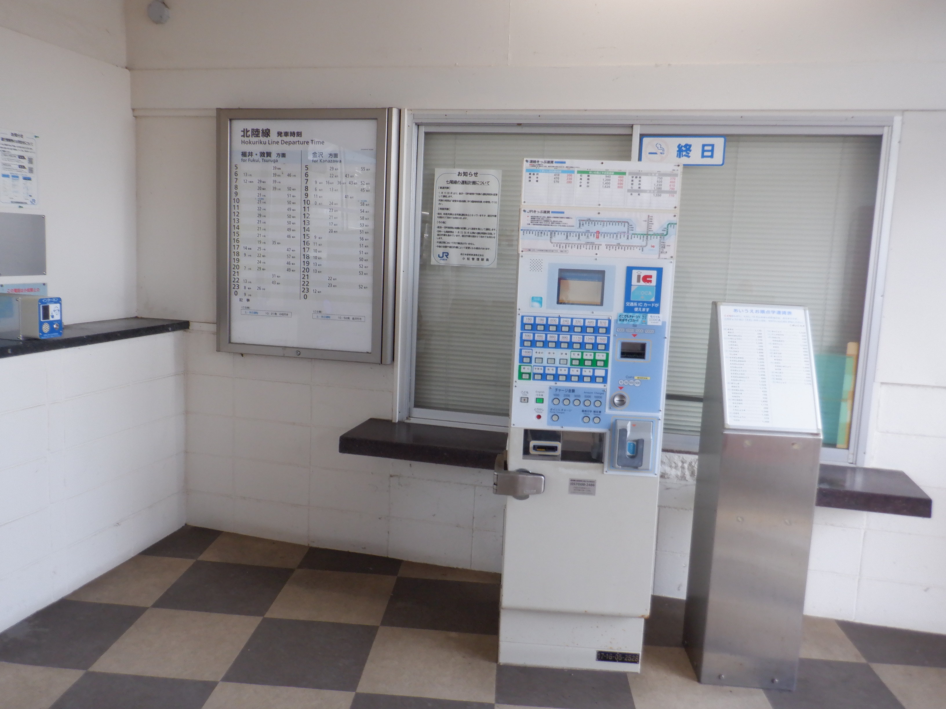 新しい券売機の背後のIRいしかわ鉄道県内全線開業ポスター。