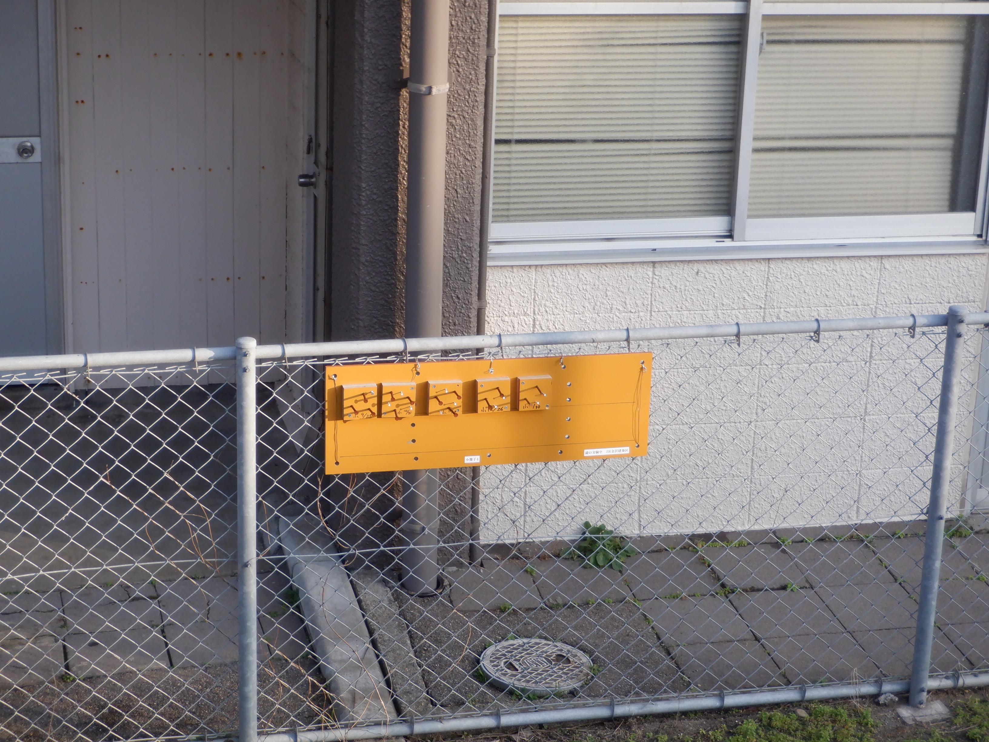 駅舎とホームの間の庭のフェンスに設置された錆実験。