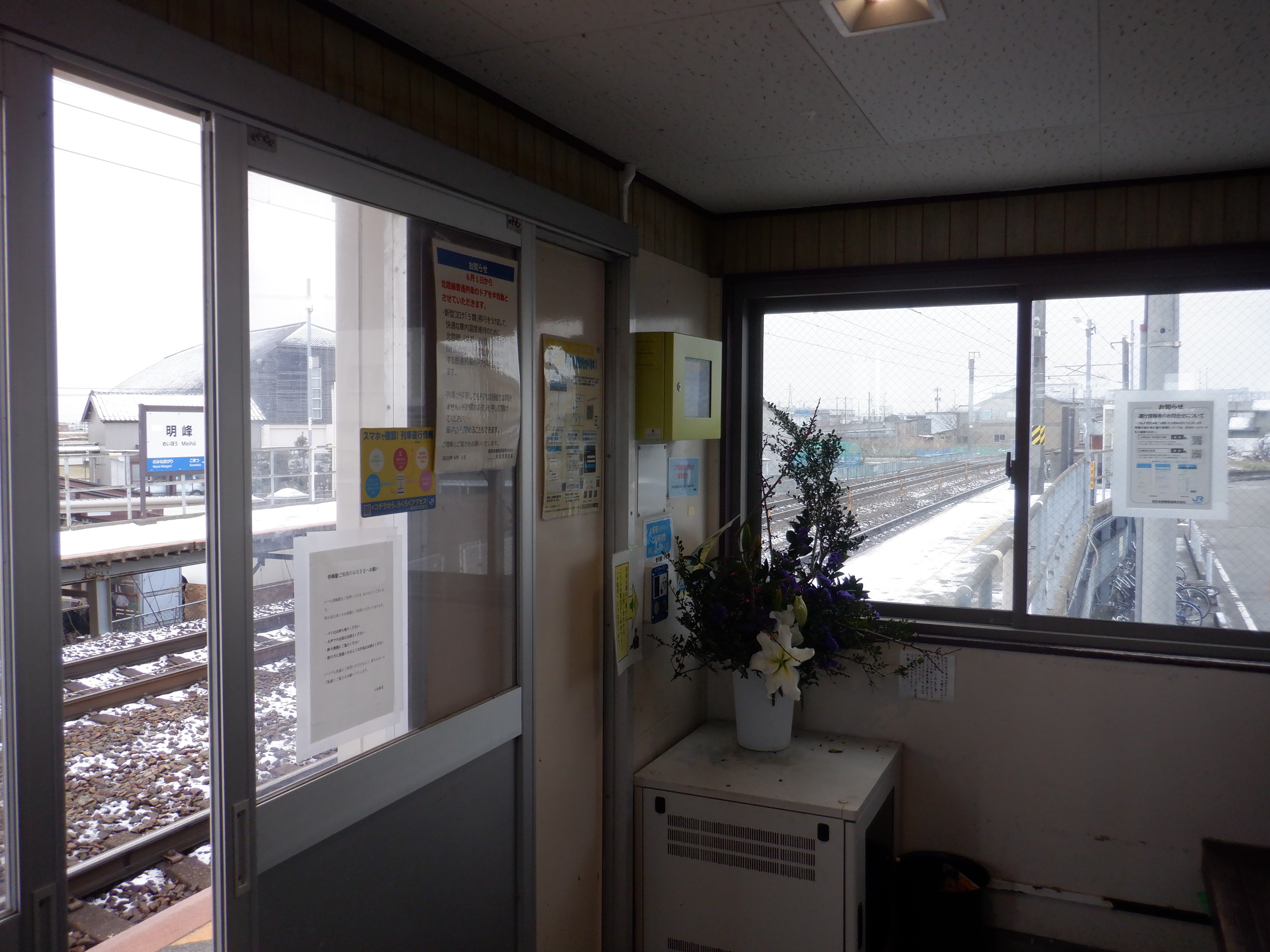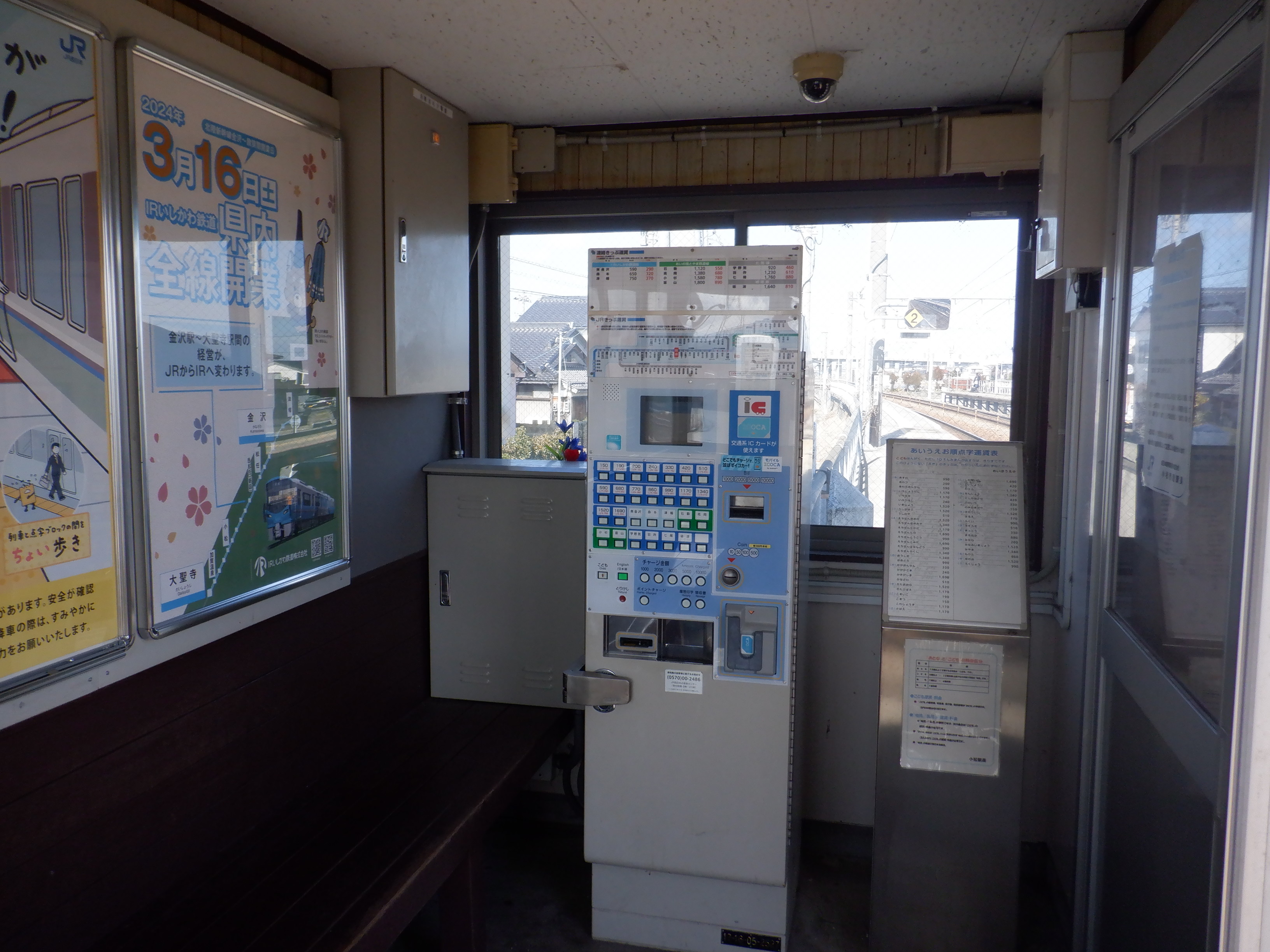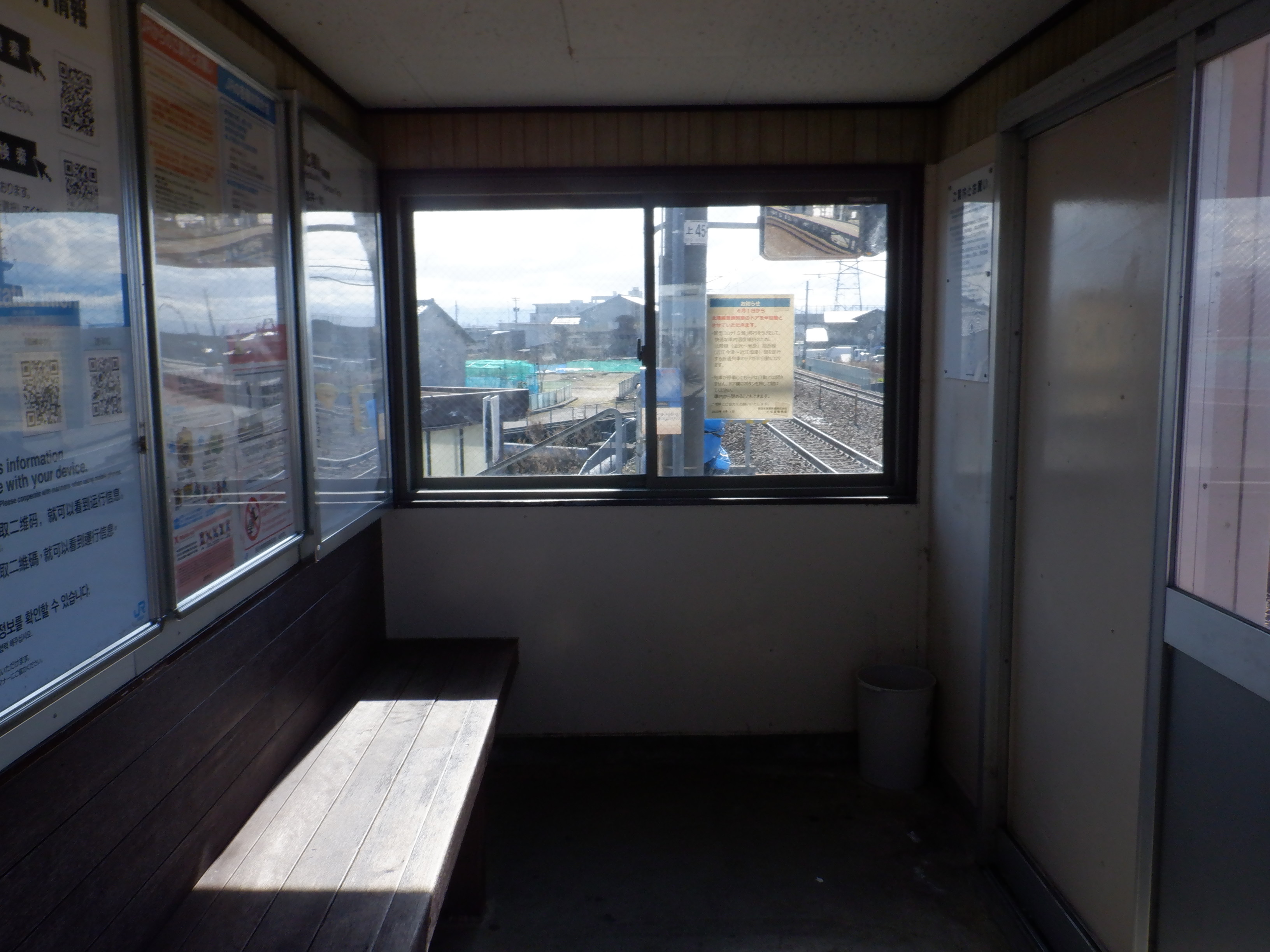 移管の1週間前となりました。待合室背後の第一種駅名標にIRのロゴが隠された状態で貼られていました。