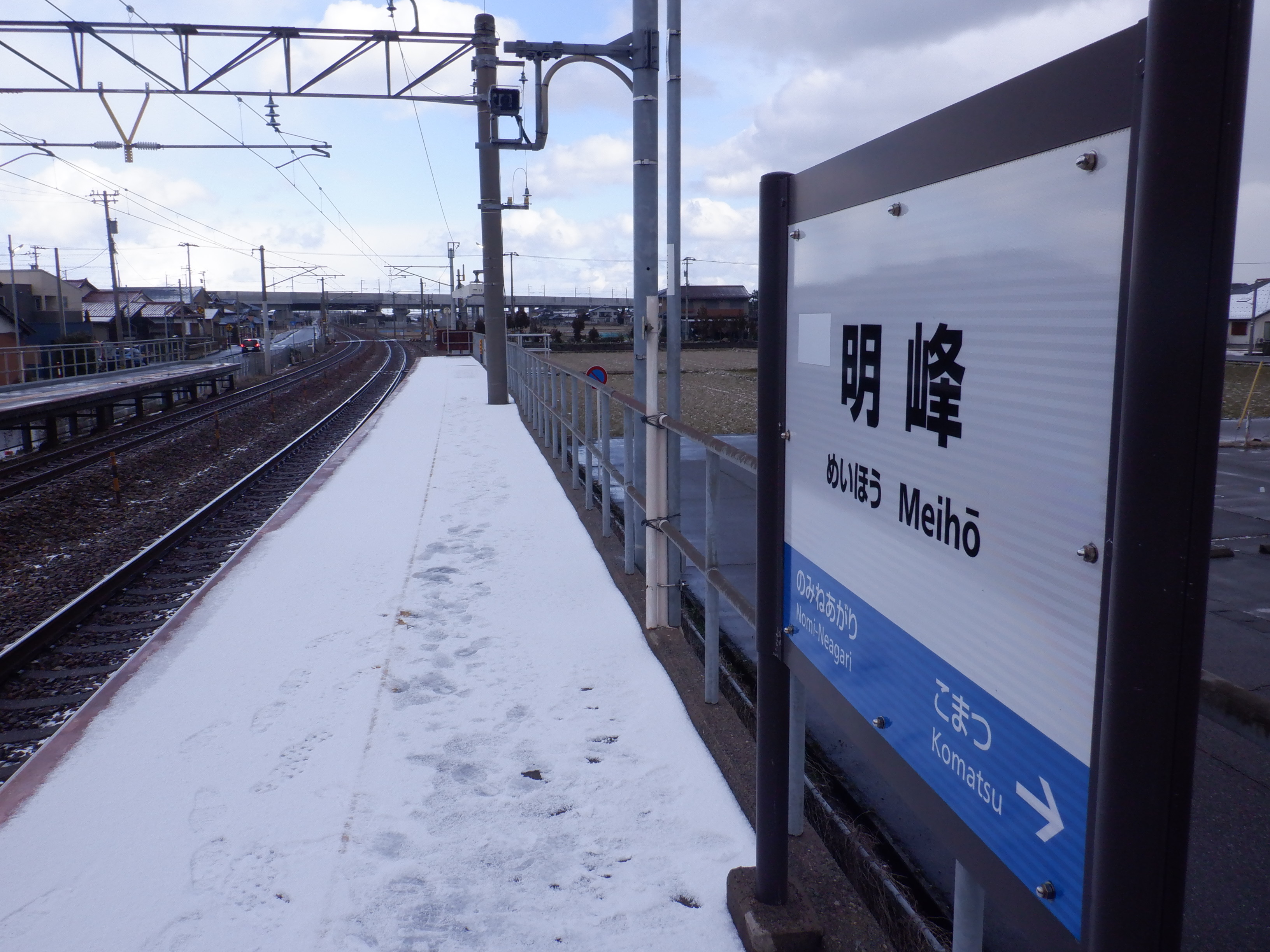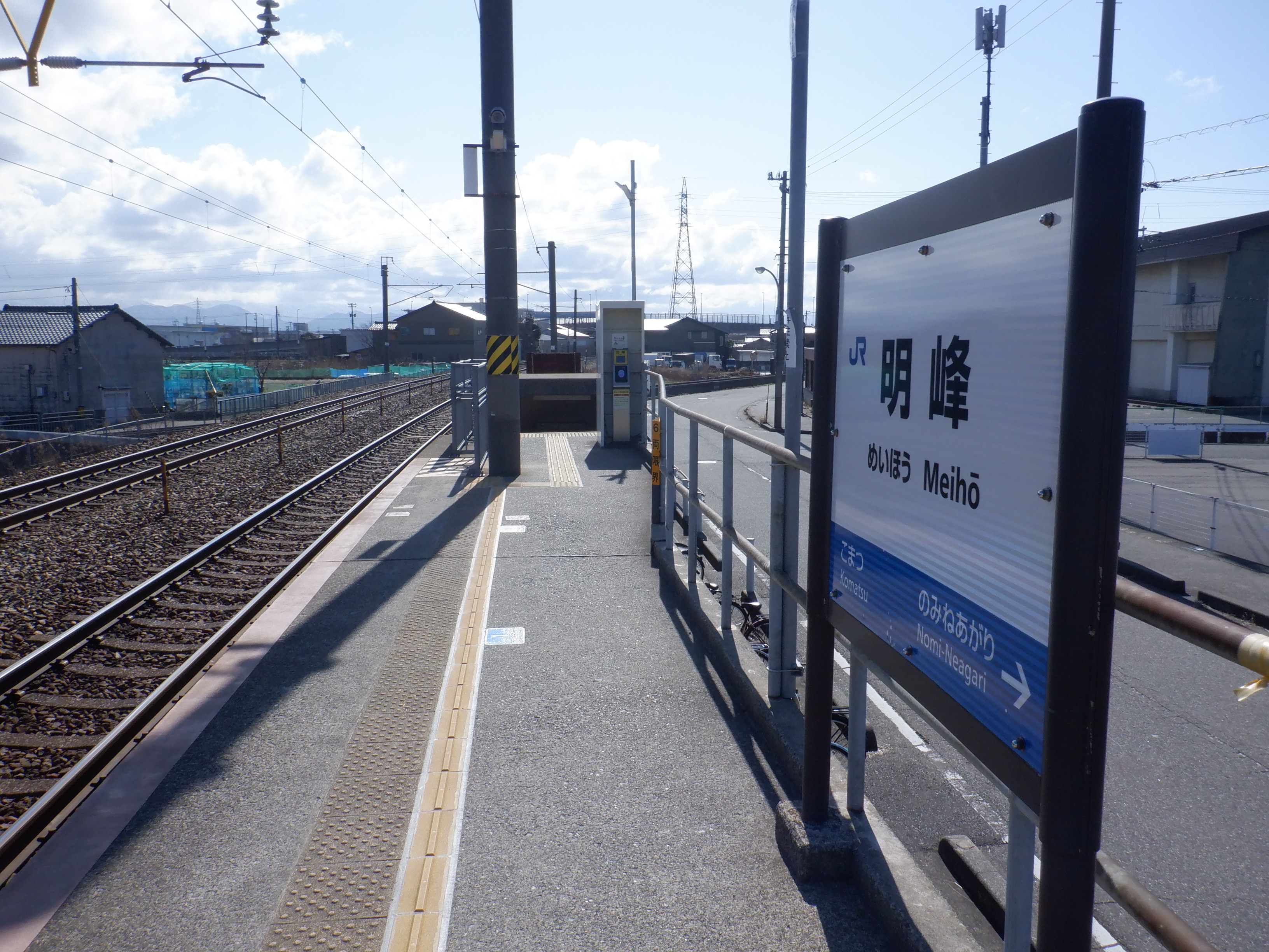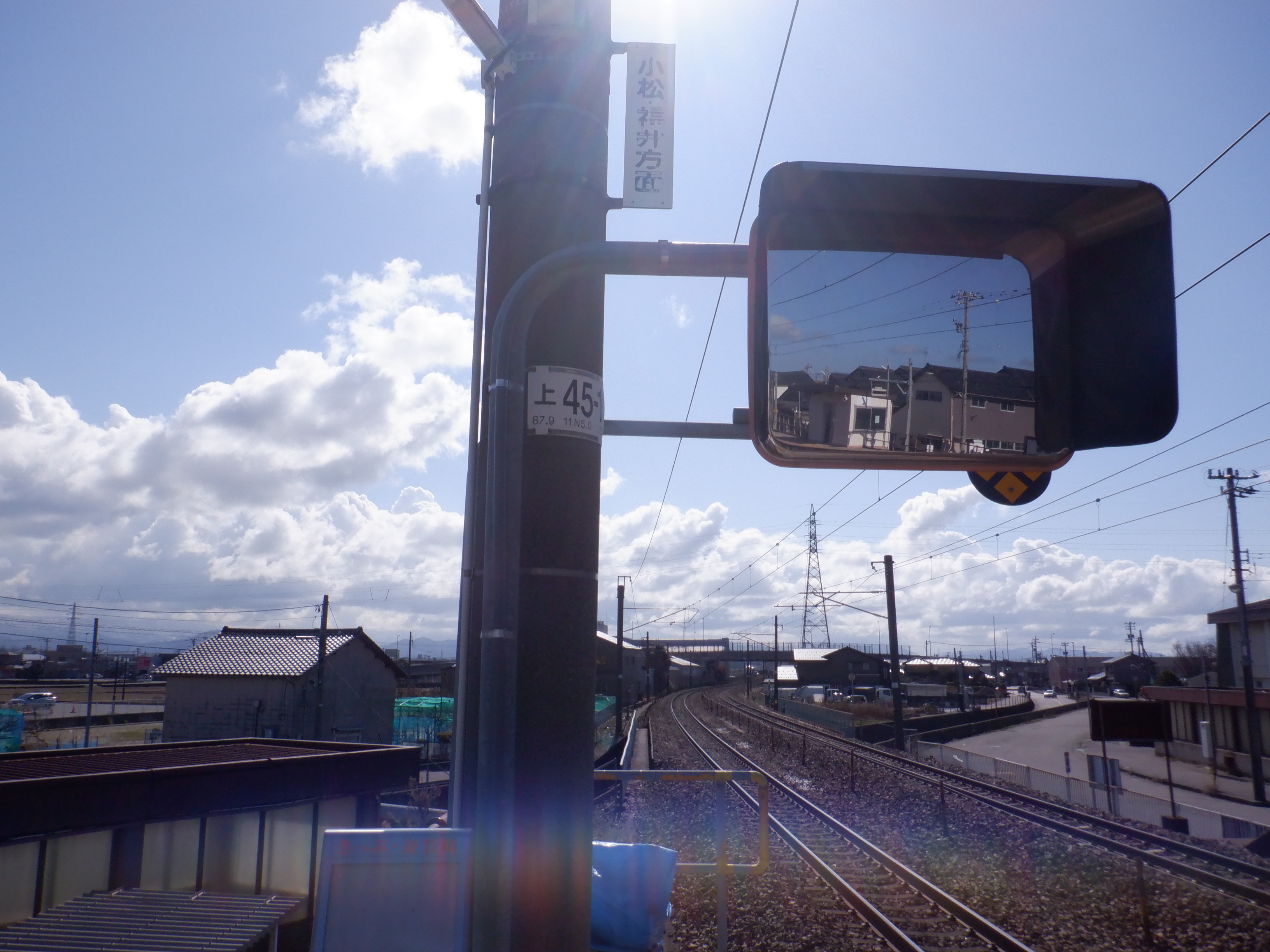 少し小松駅側に進んだところの架線柱の表示。「マツ・メイ」の表示があります。