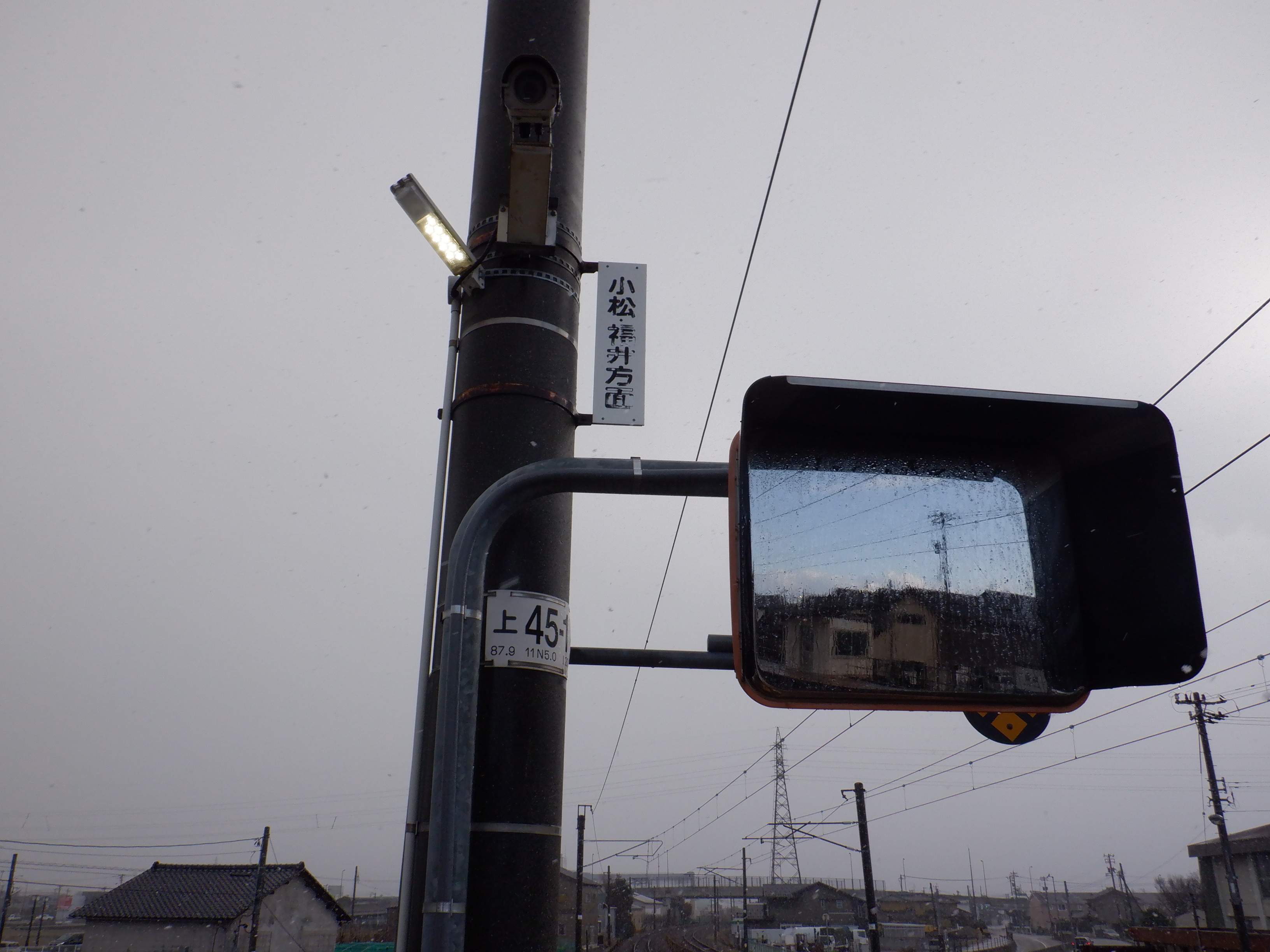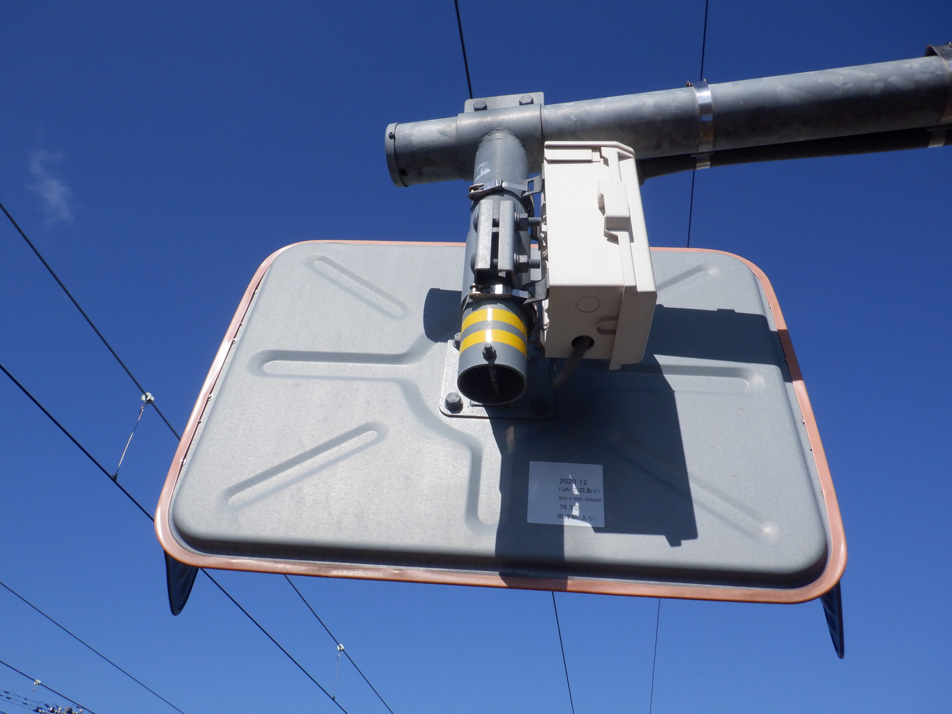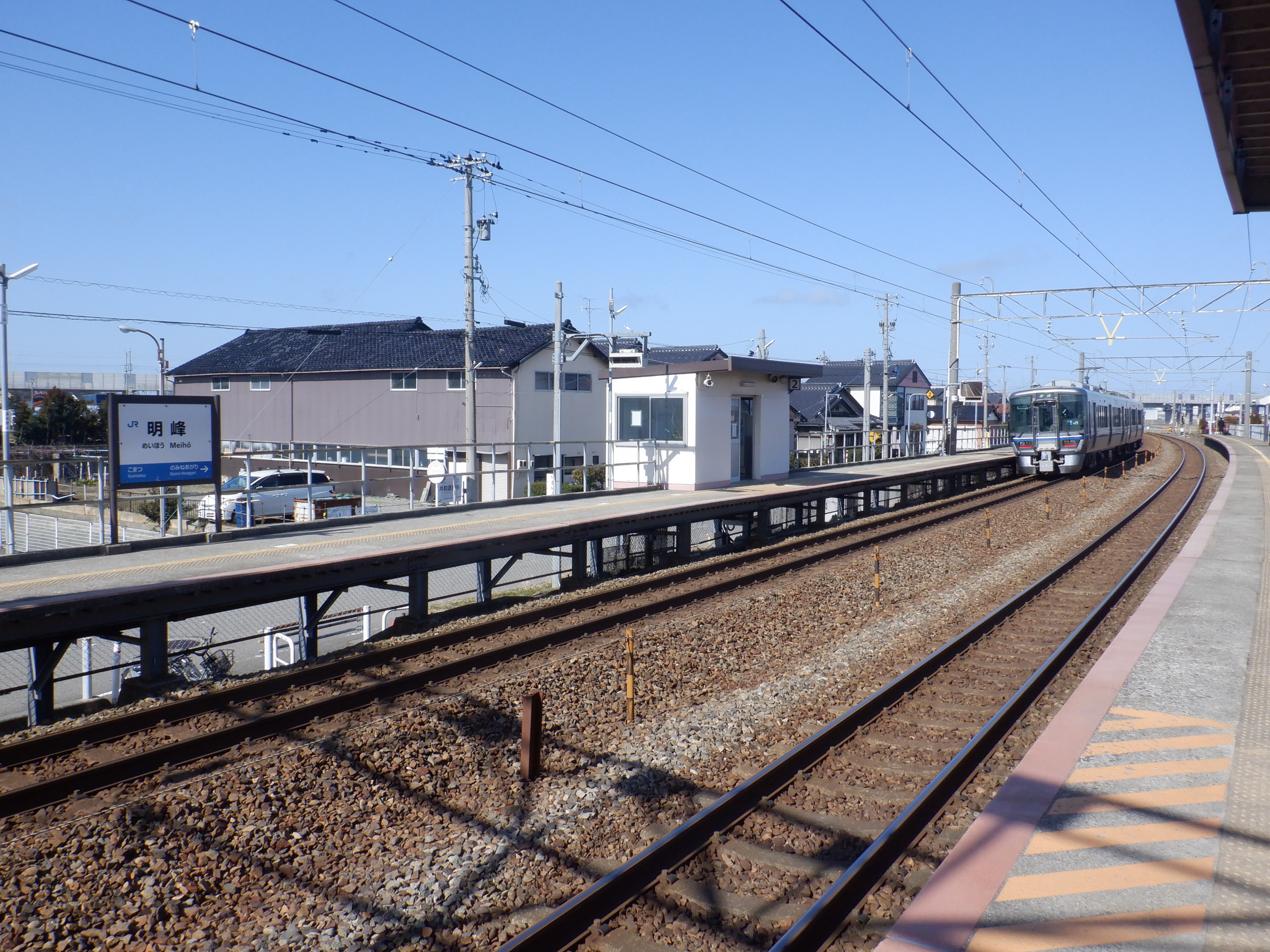 少し小松駅側に進んだところの架線柱の表示。「マツ・メイ」の表示があります。