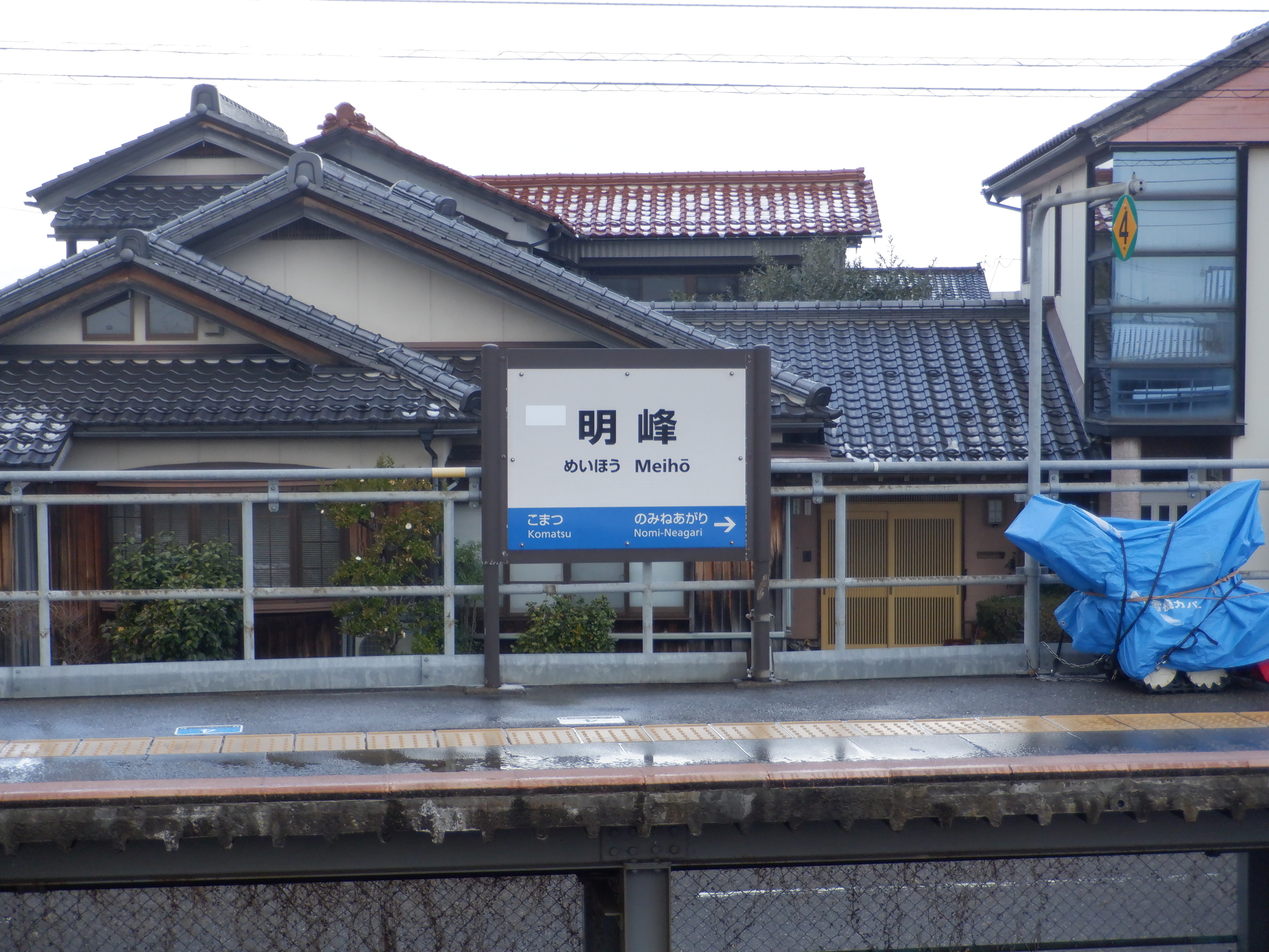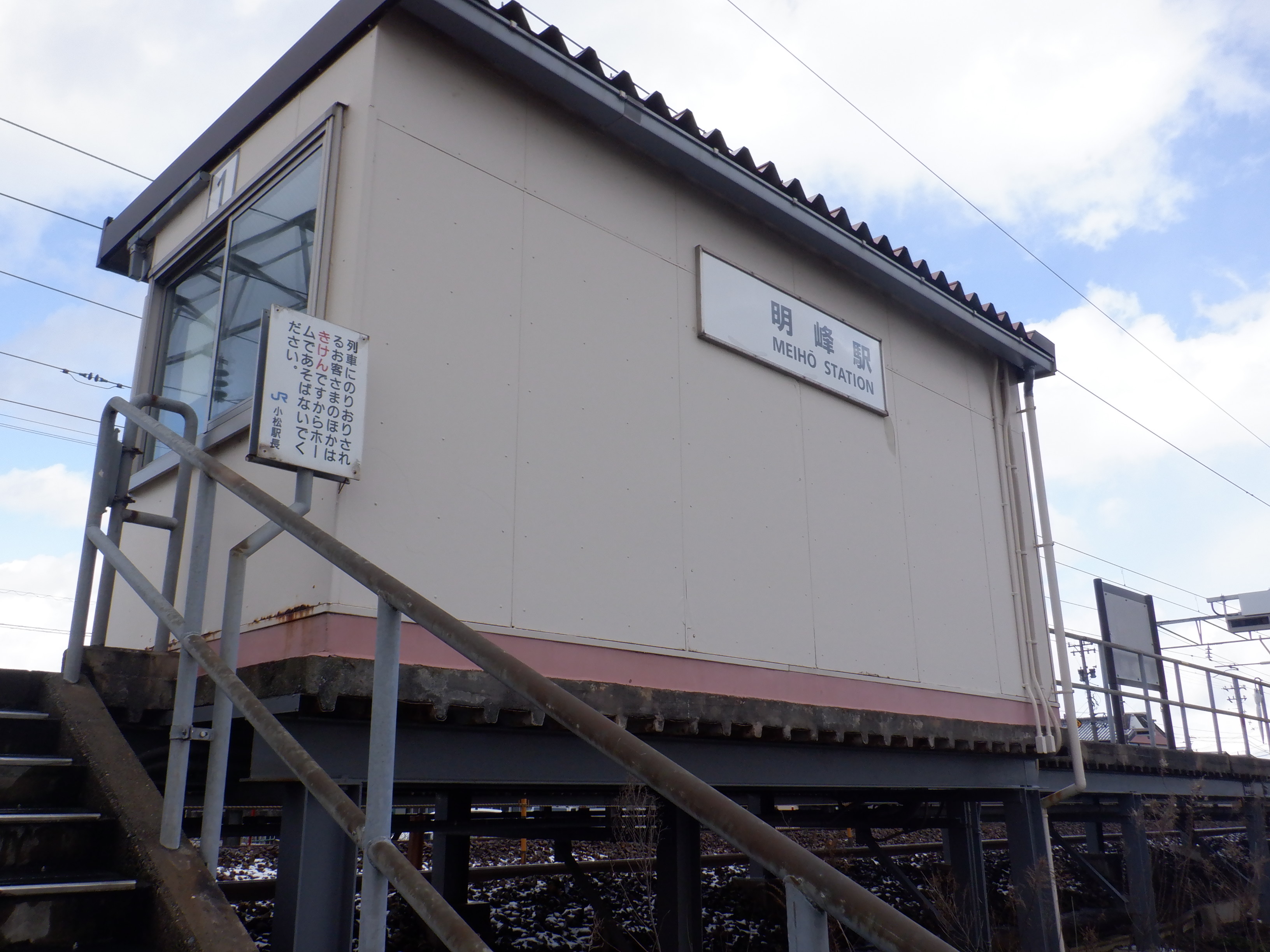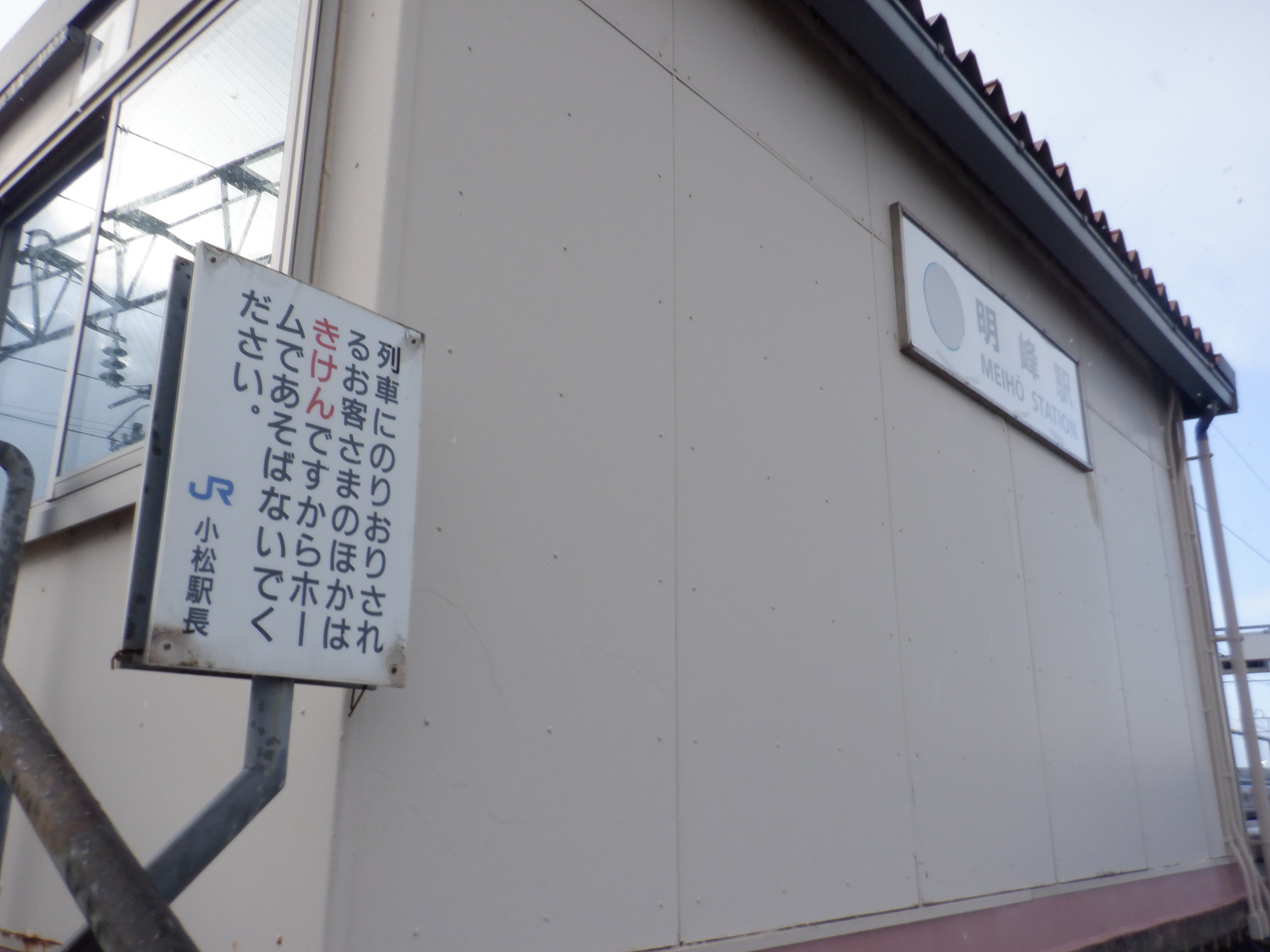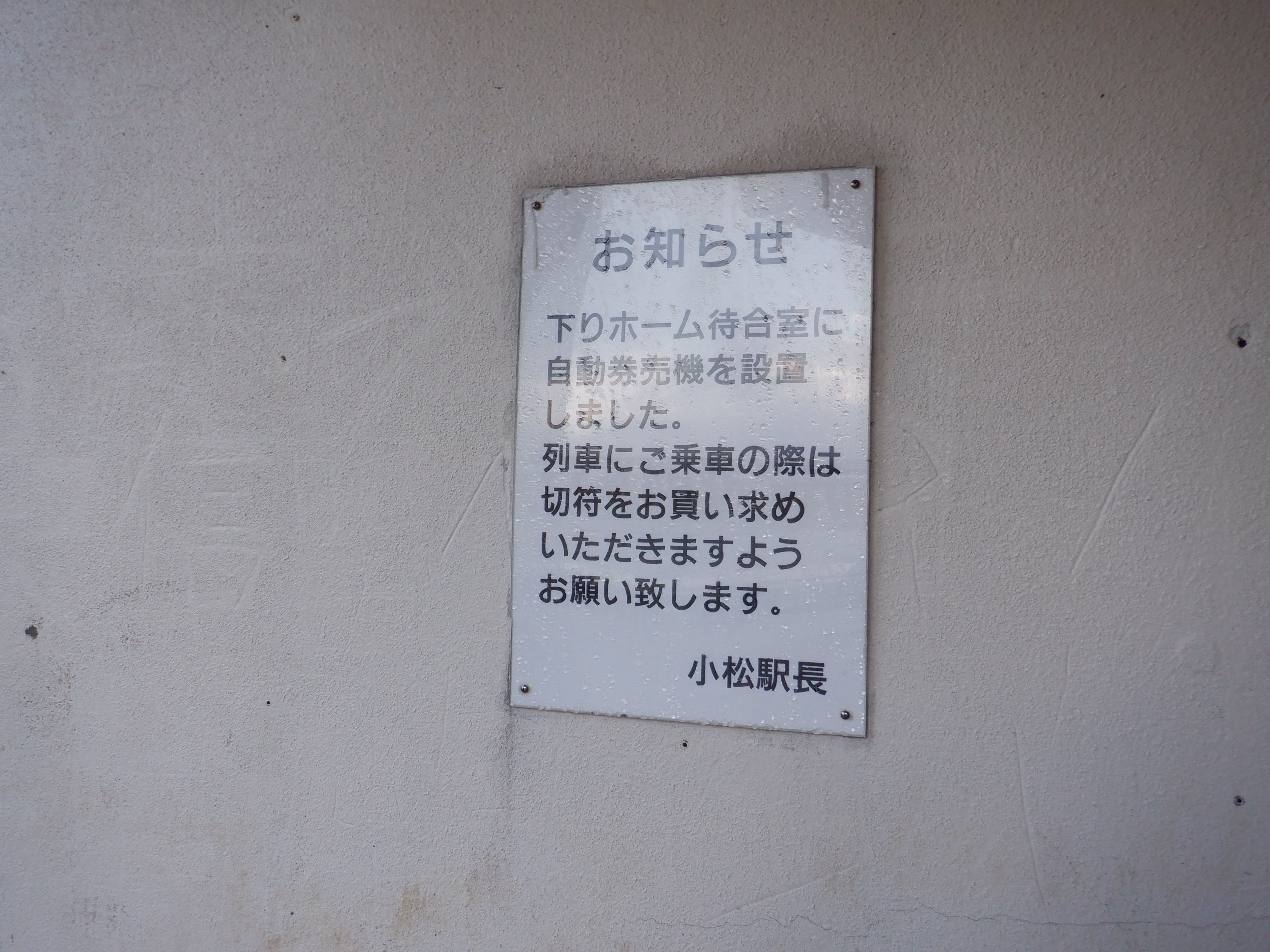1番のりば小松駅側の駅名標。こちらは移管後はIRの駅名標となるのですが、この時点ではロゴが隠された状態でした。