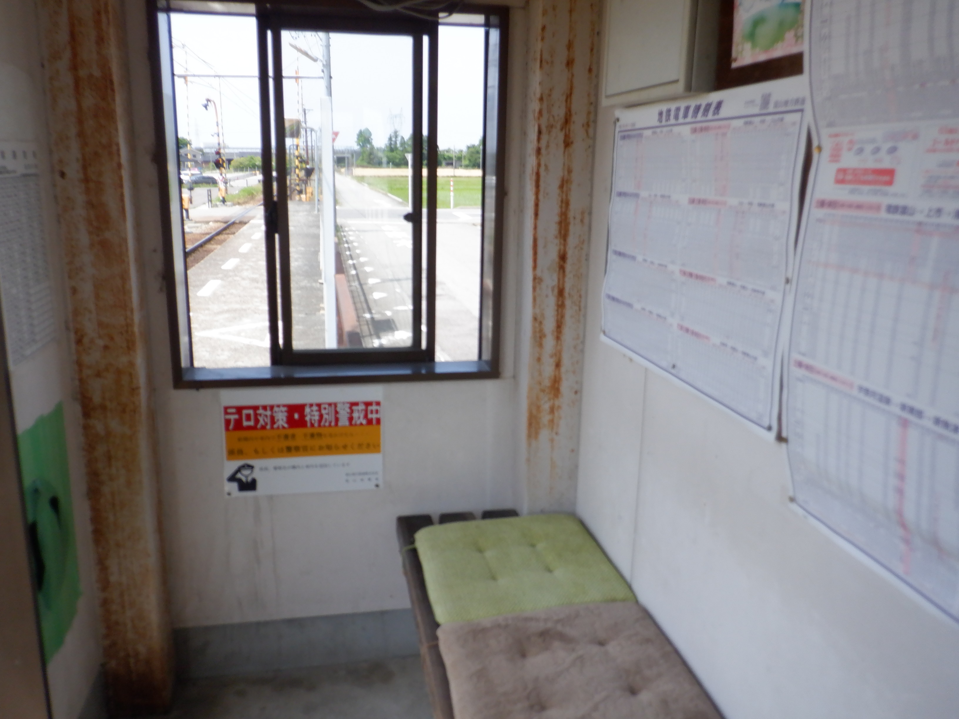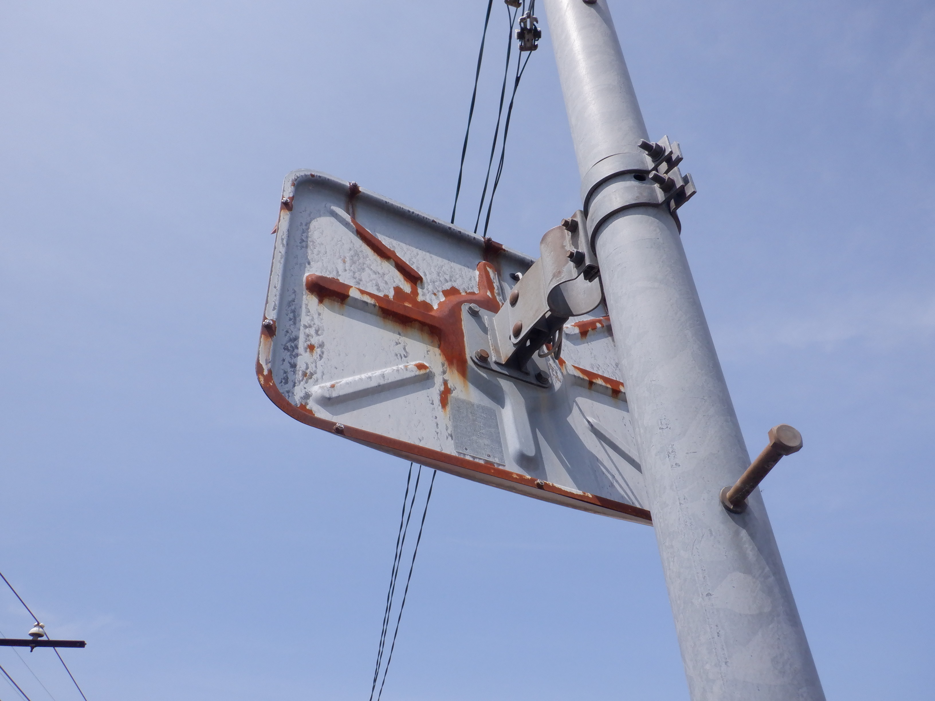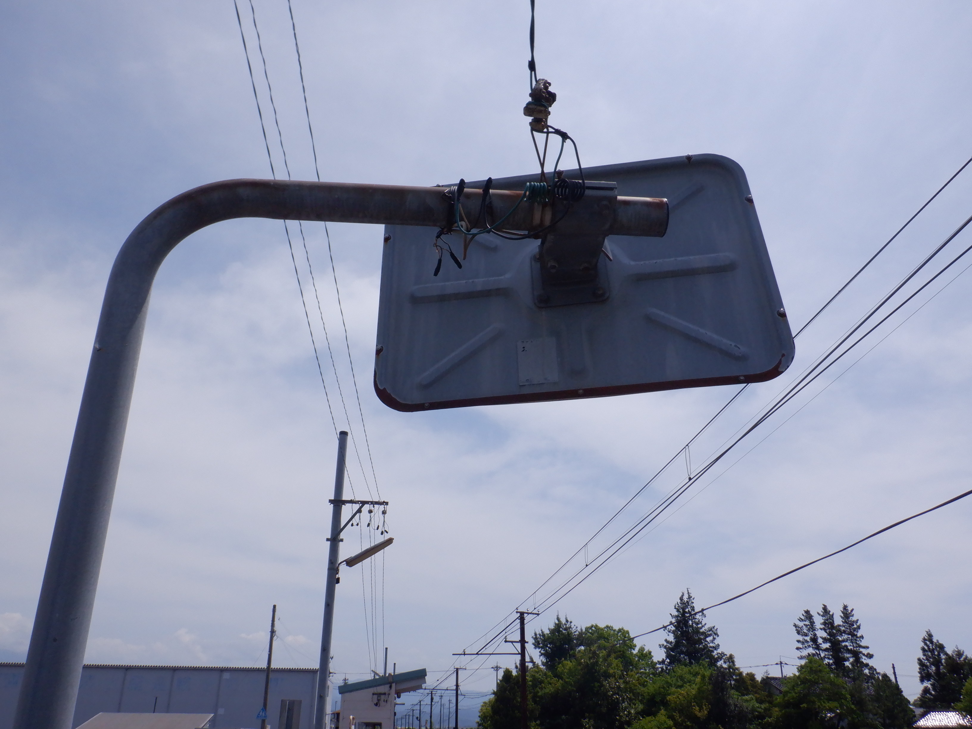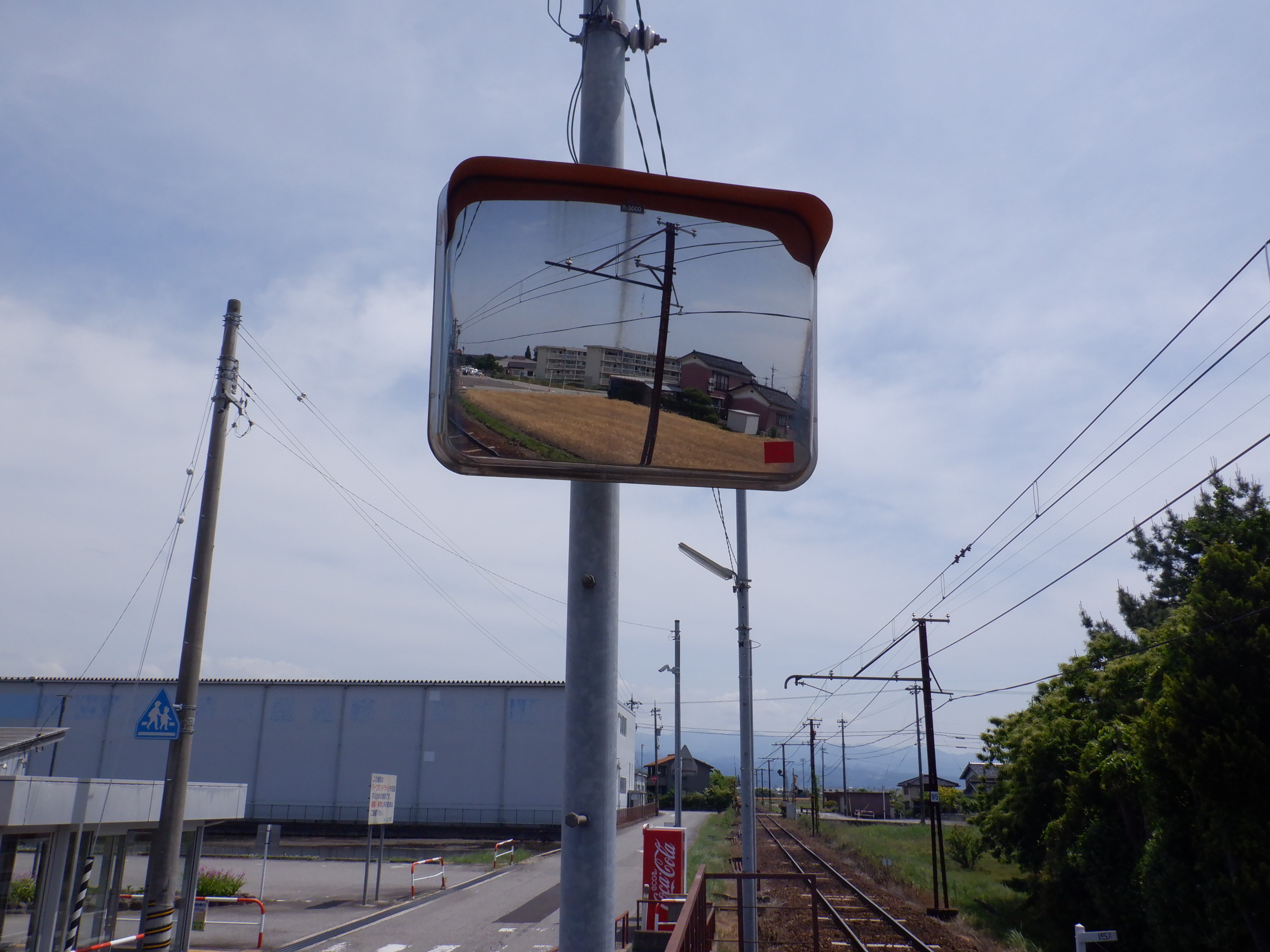 上市駅側のワンマンミラーとその配線。この画像で待合室側にある支柱がかつてのワンマンミラーの位置だったようです。(当ページ下部の2005年の様子参照。)