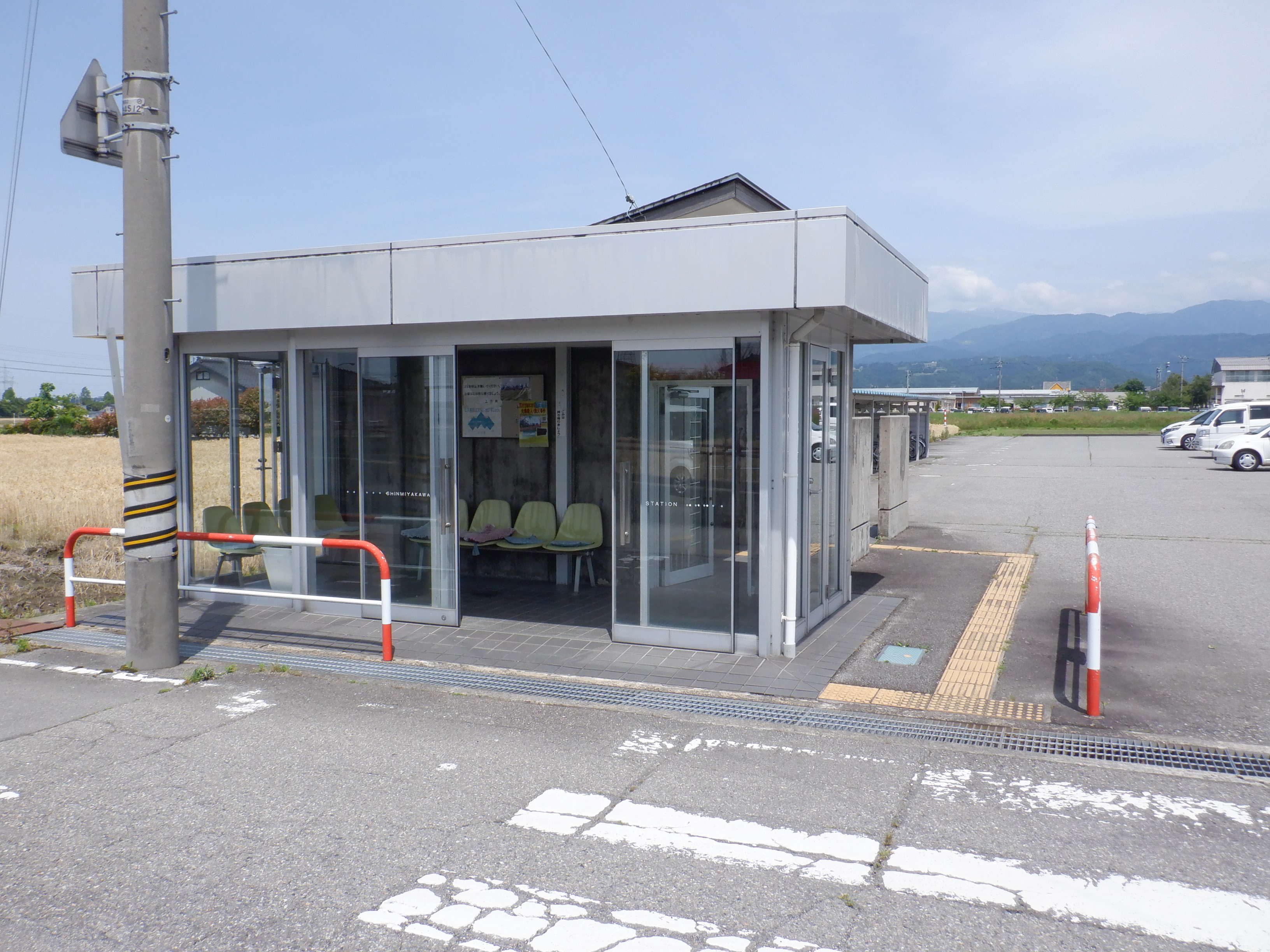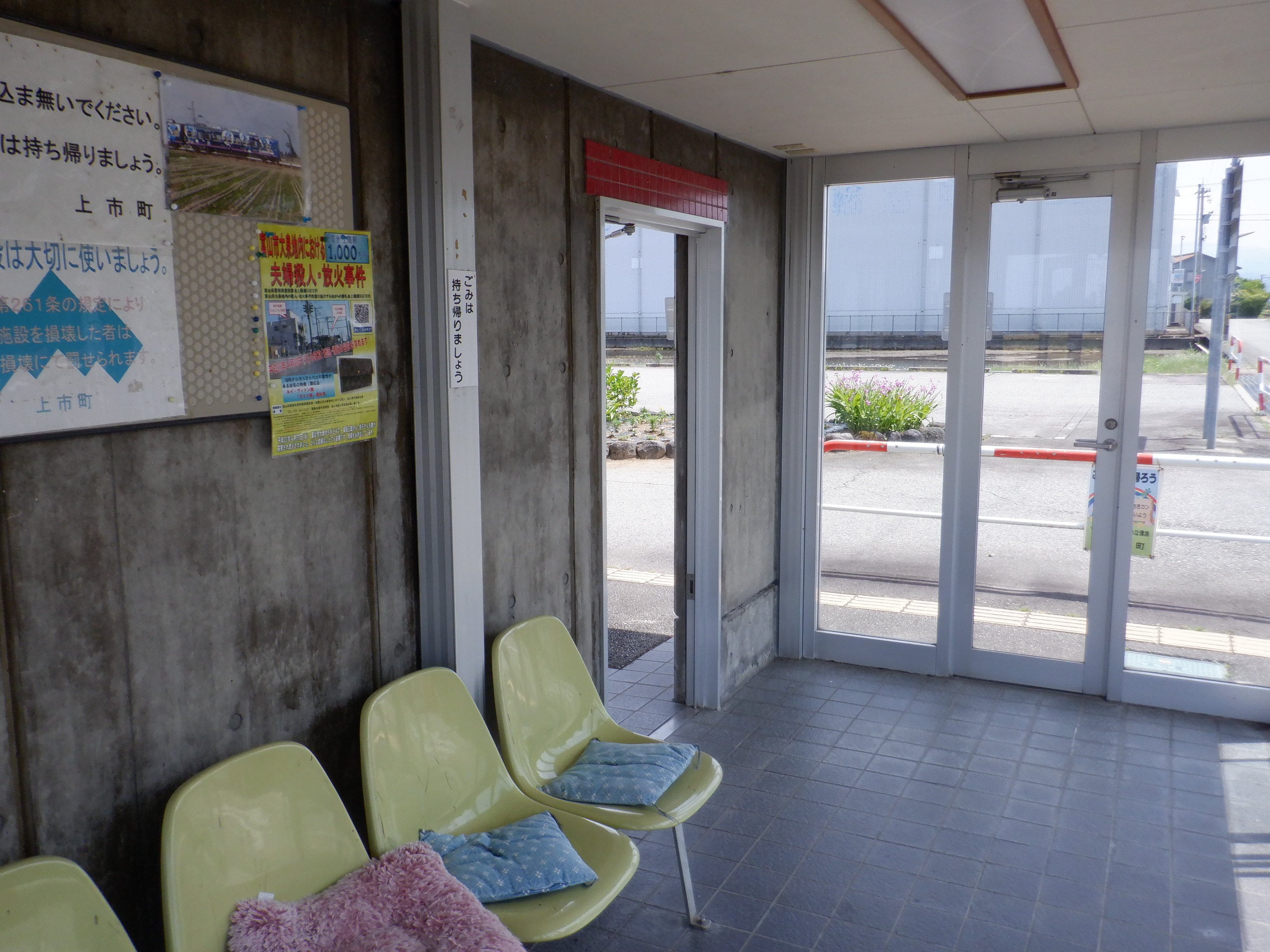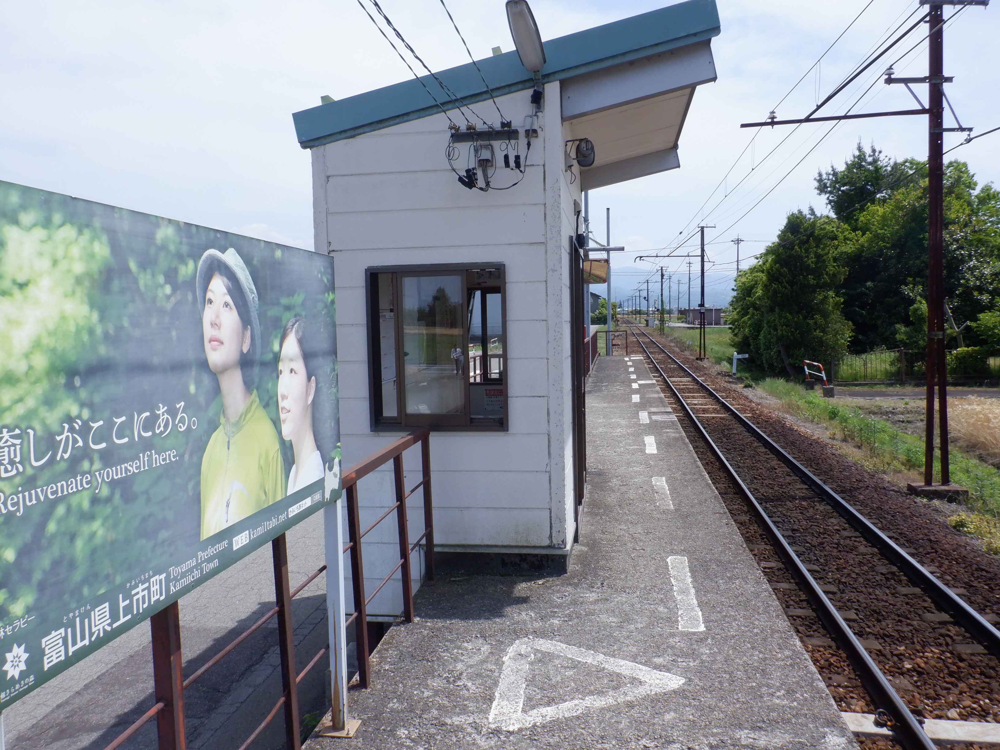 水田(年によっては麦畑)が広がる集落の近くにある駅です。また、近くには北陸自動車道の上市スマートICがあります。ホームに待合室がありますが、道路を挟んで向かい側にはパークアンドライドの駐車場とさらに待合室が整備されています。