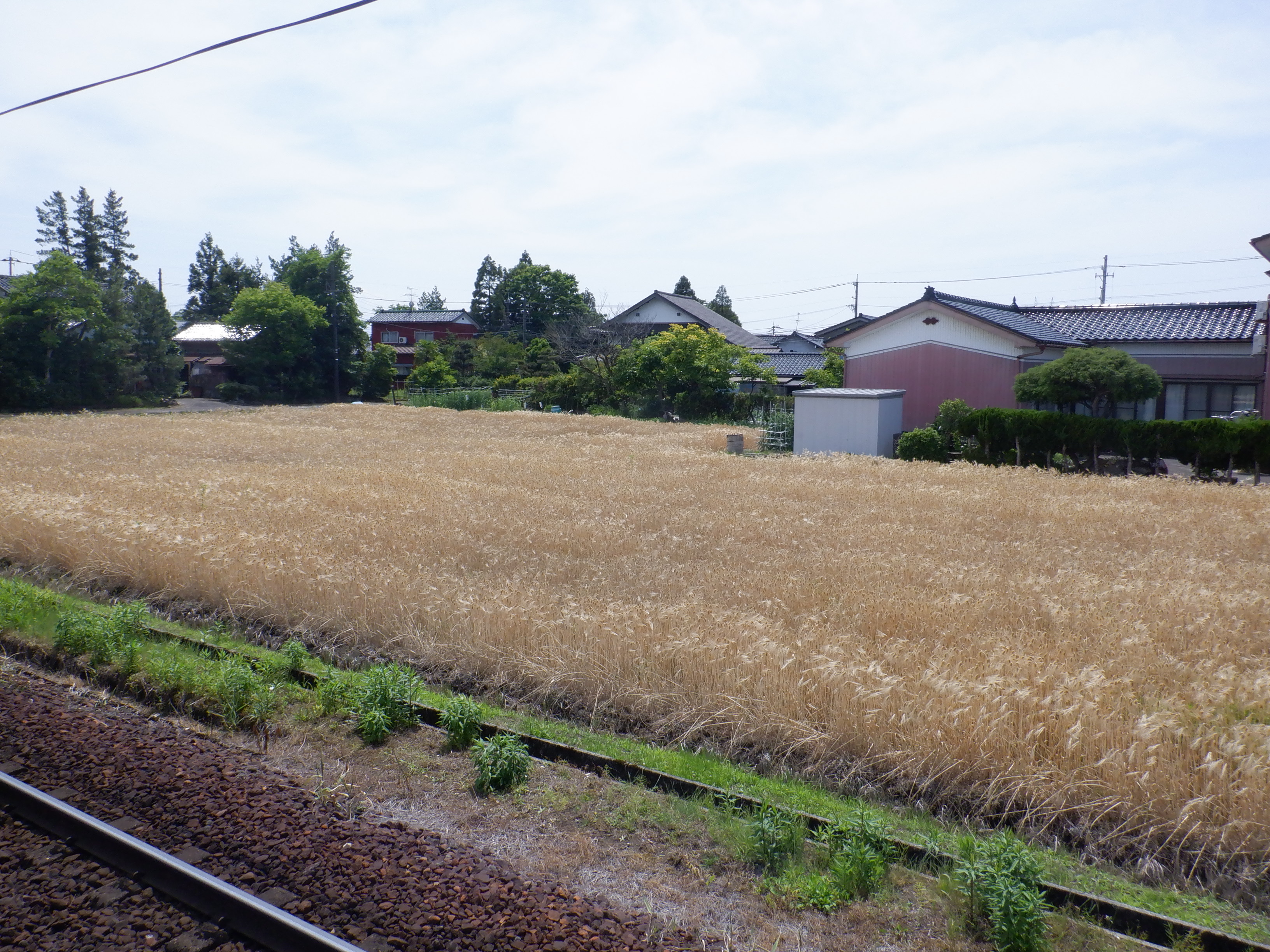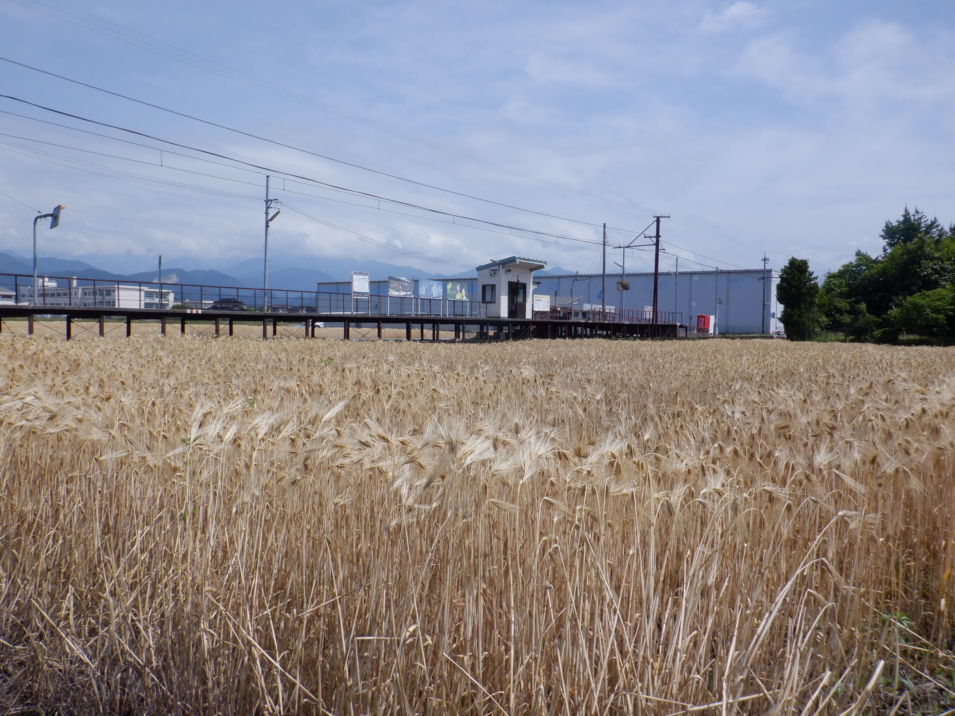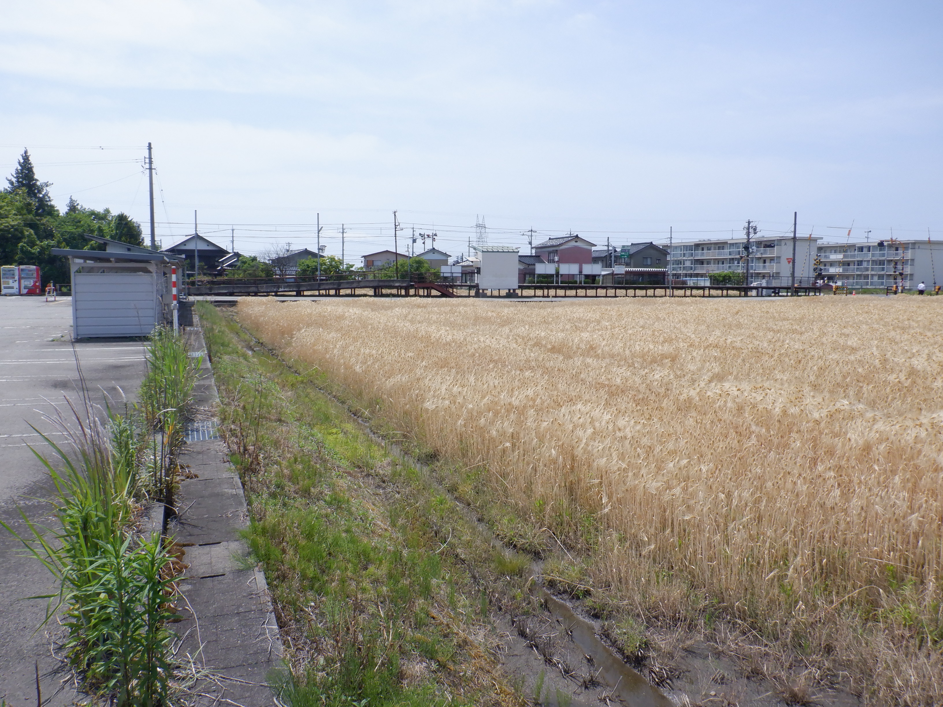 ホームから見た線路の反対側の様子。この年は麦が植えられていてちょうど麦秋のシーズンでした。