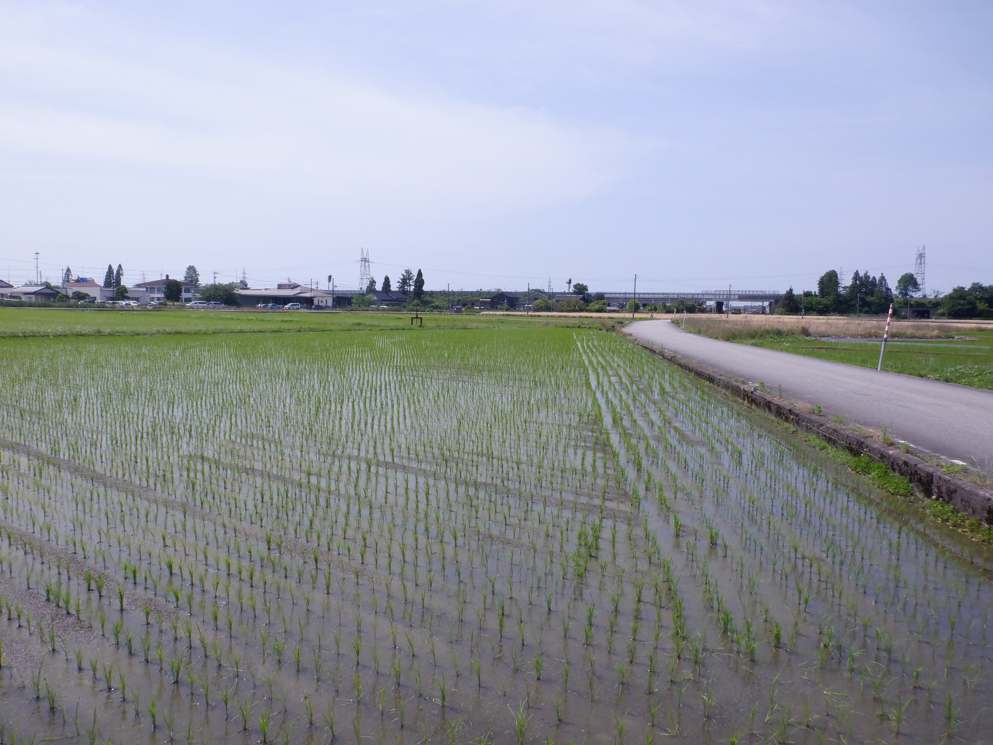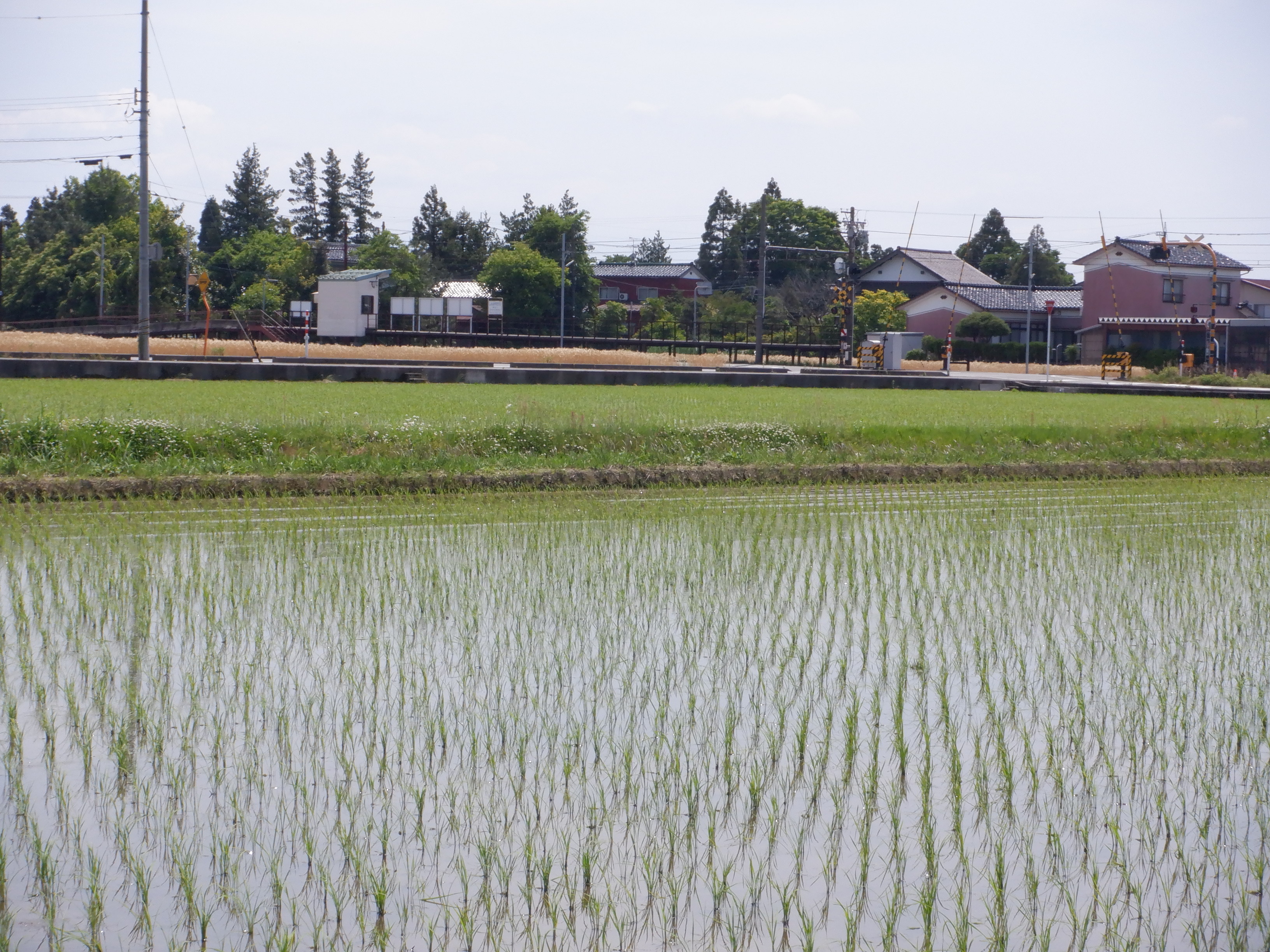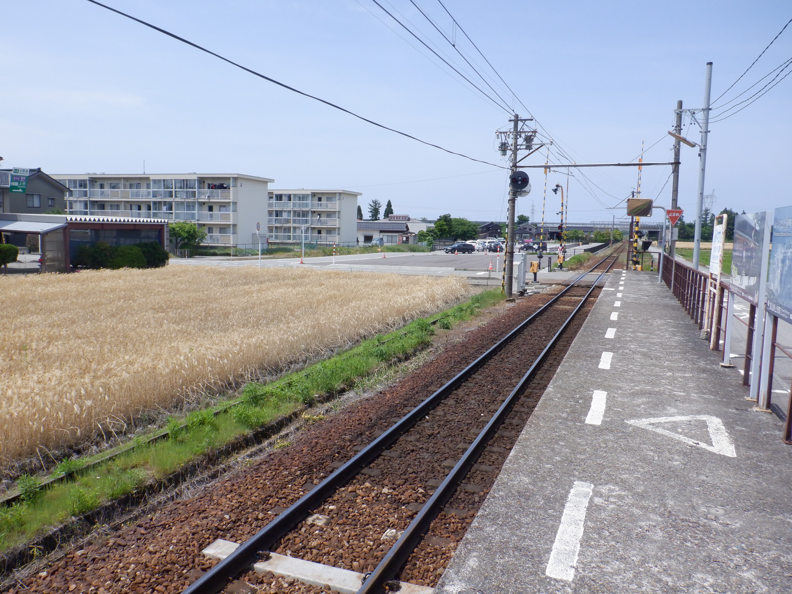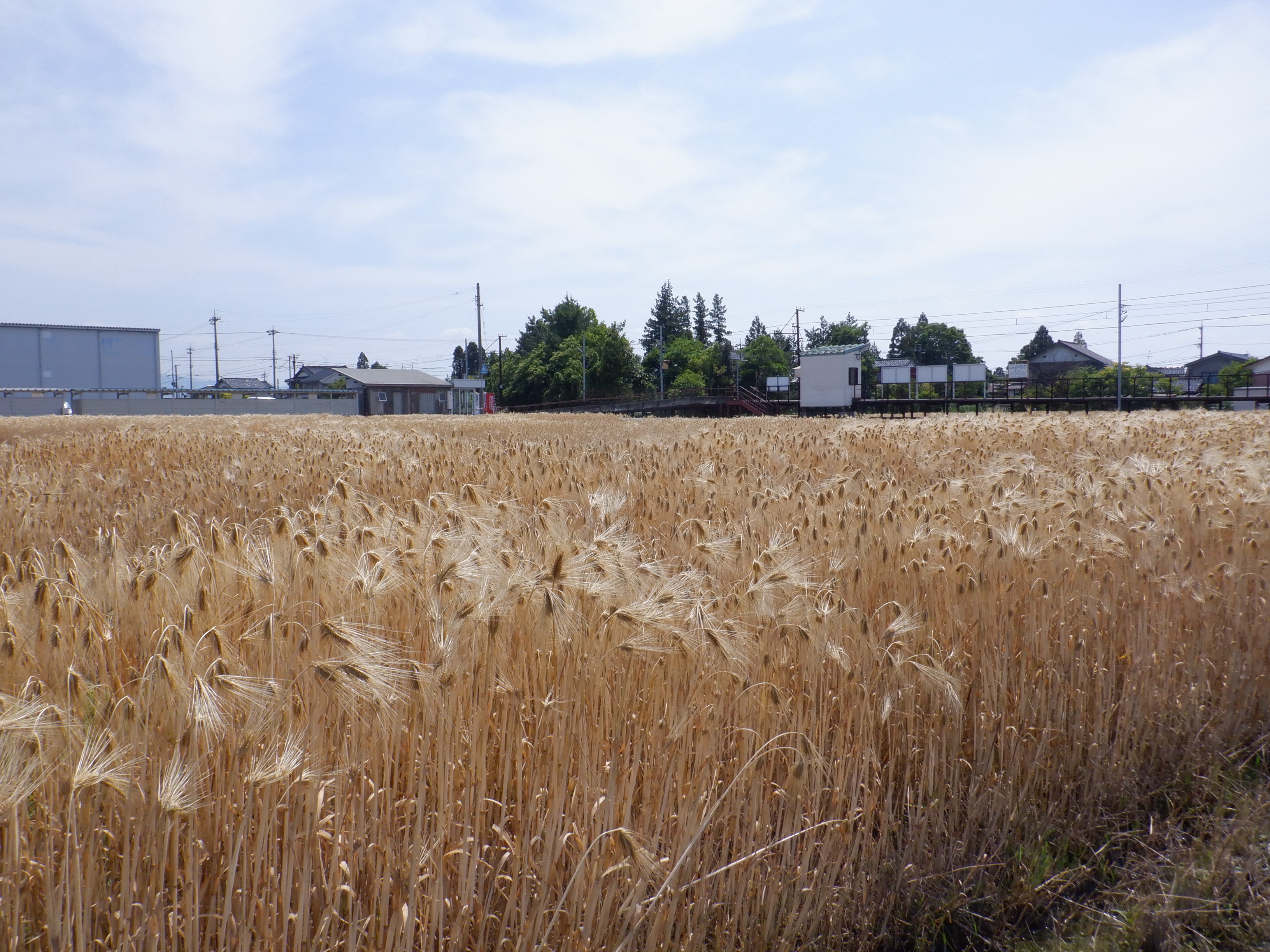 ホームから見た線路の反対側の様子。この年は麦が植えられていてちょうど麦秋のシーズンでした。