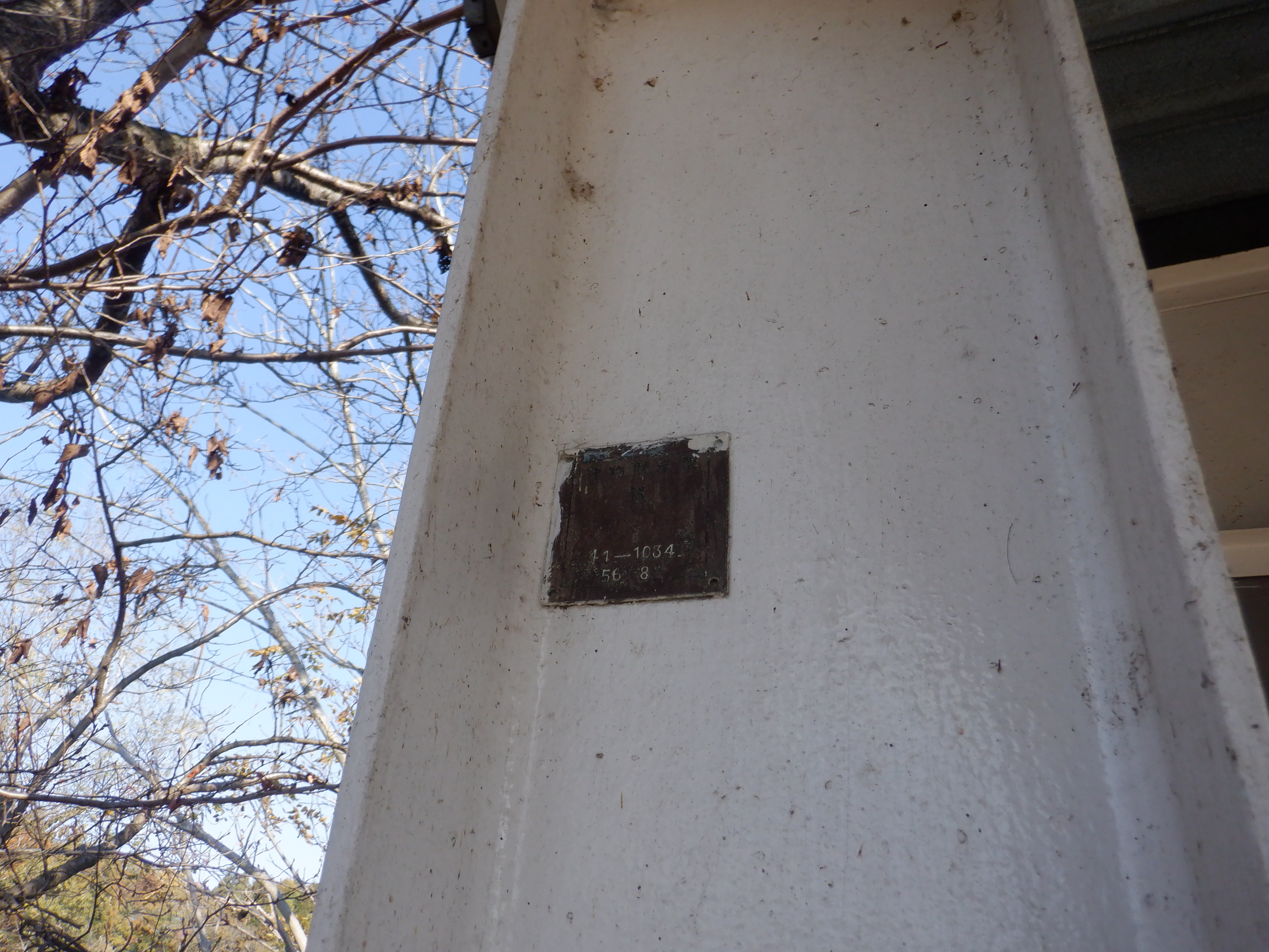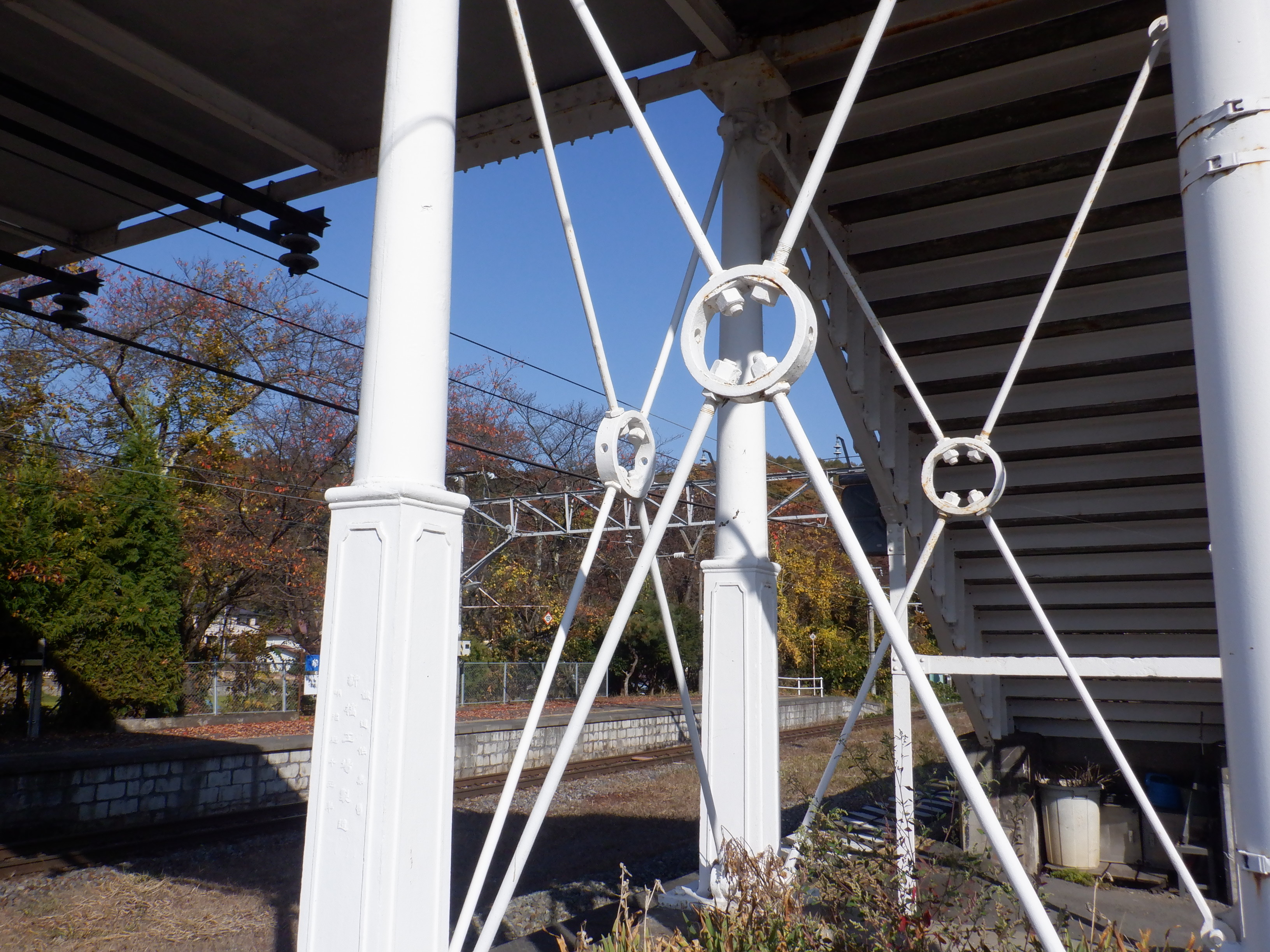 1番線の跨線橋支柱。明治33年の製造で、1956年に豊野駅から移築したという経緯が見えます。