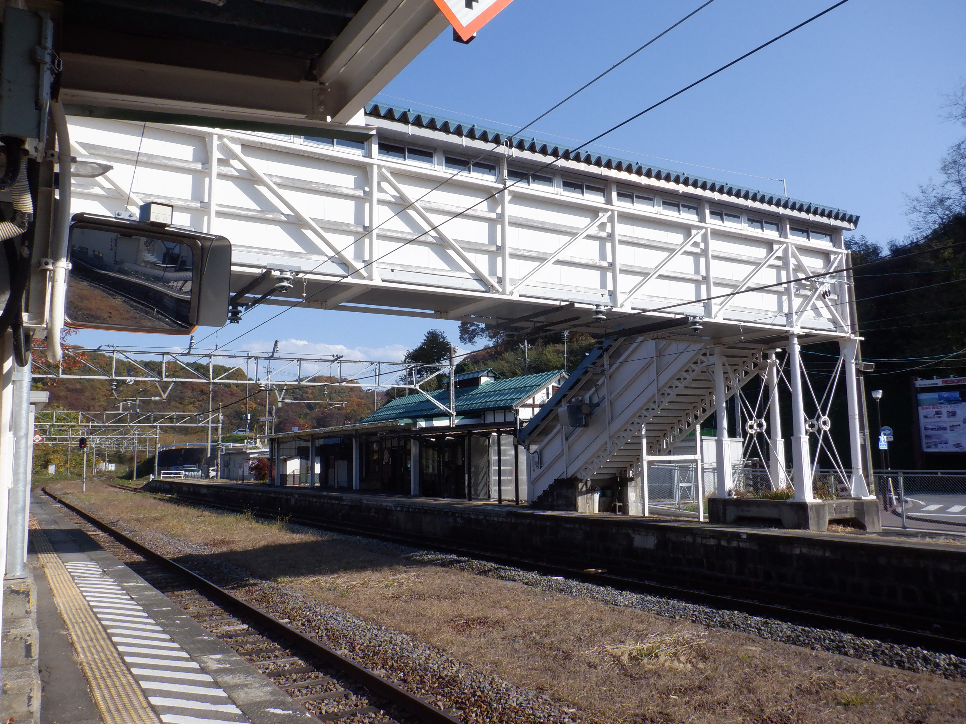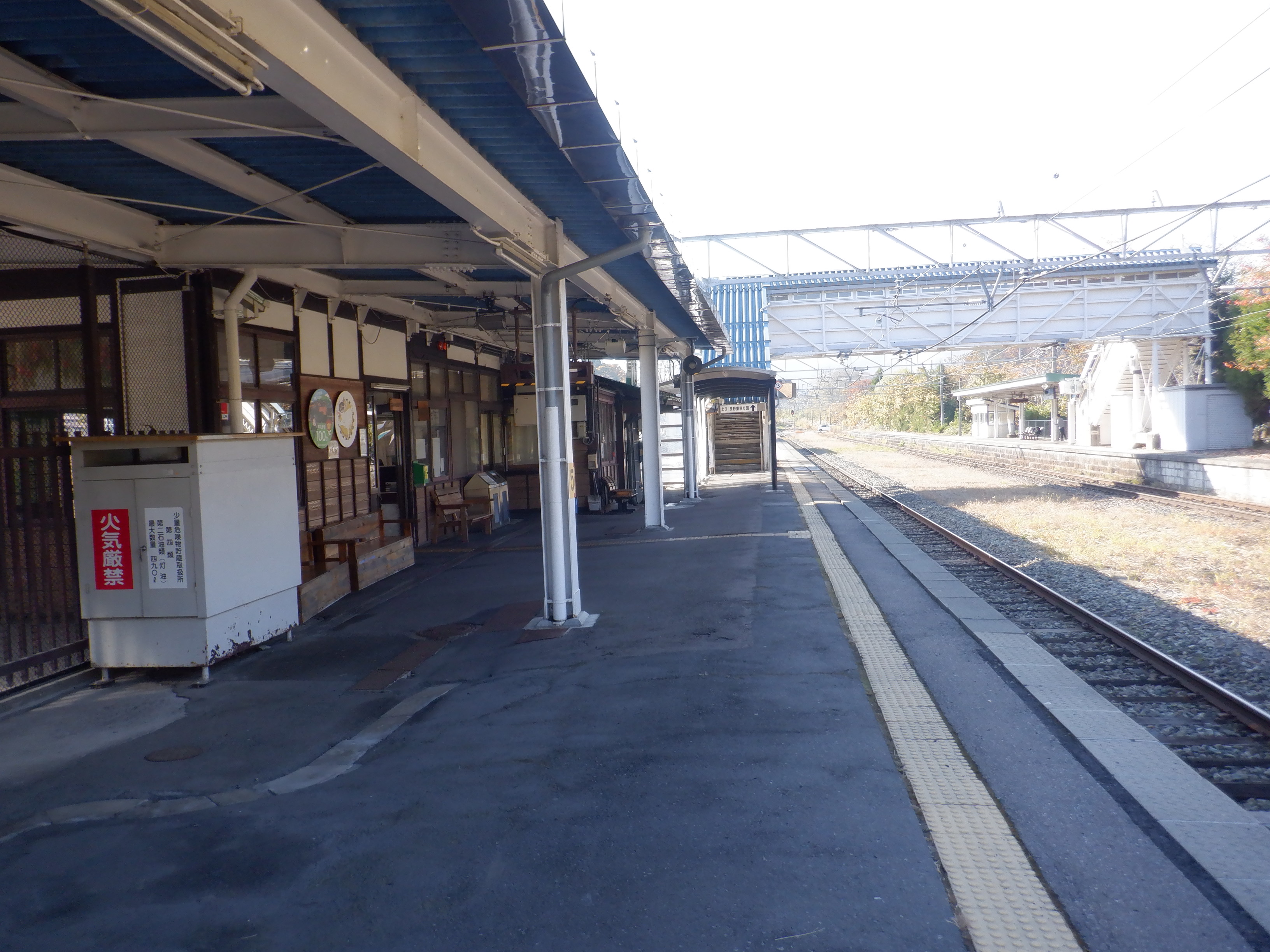 黒姫〜古間の間から北しなの線に寄り添っている鳥居川が駅の反対側にあります。両方向のホームは少し開いていて、歴史がある跨線橋が繋いでいます。駅を出ると右側には商店街が続きます。