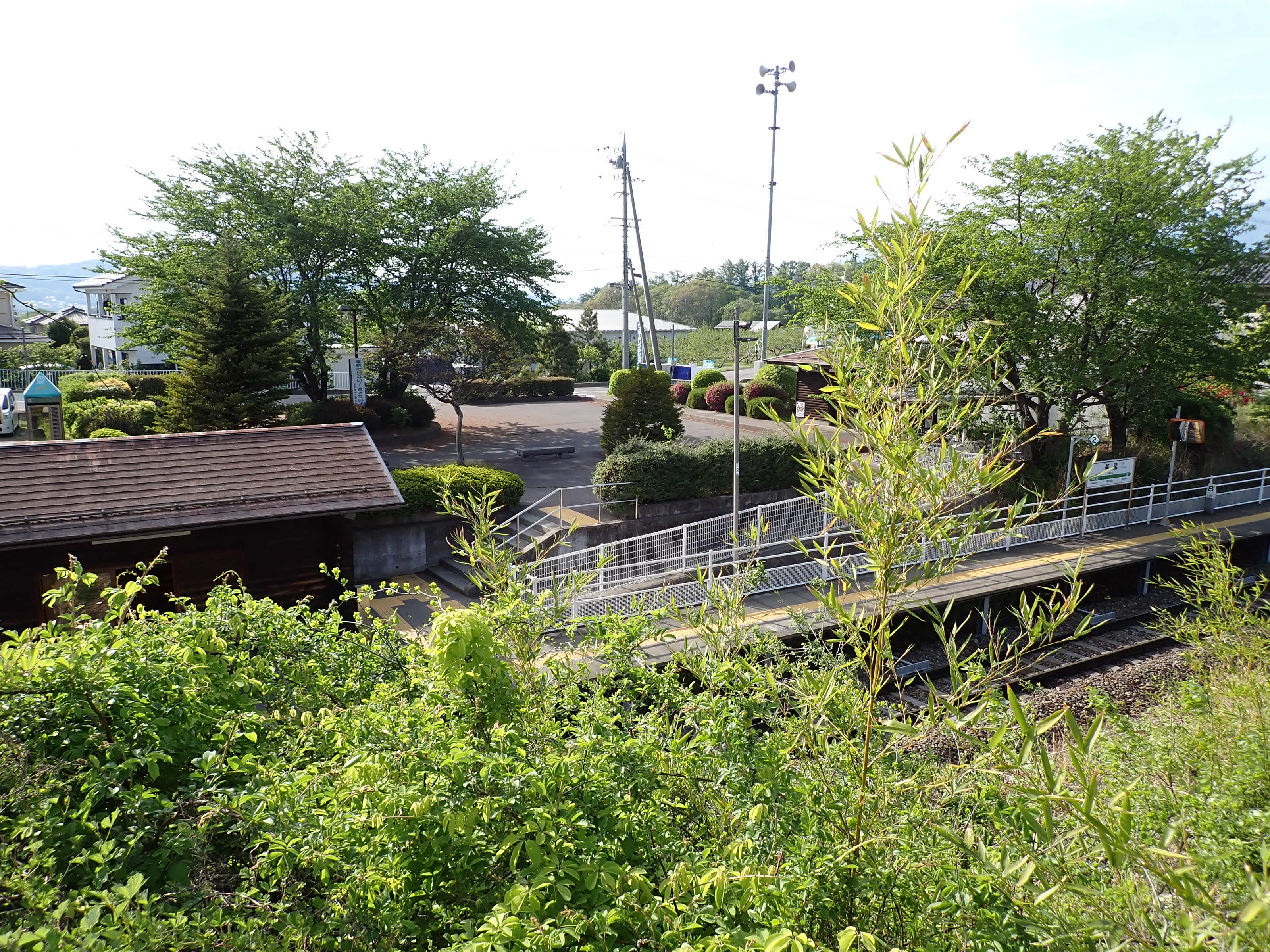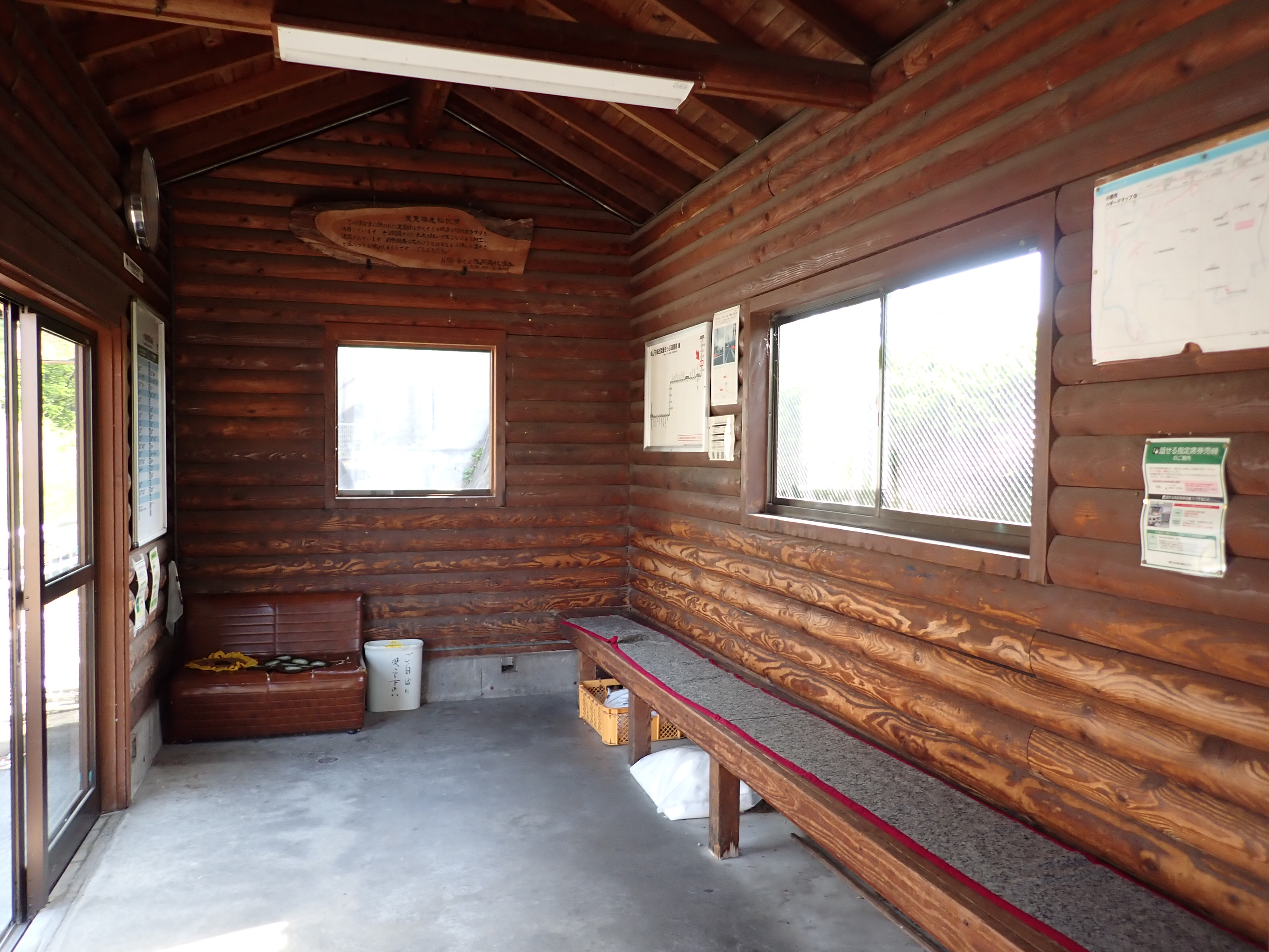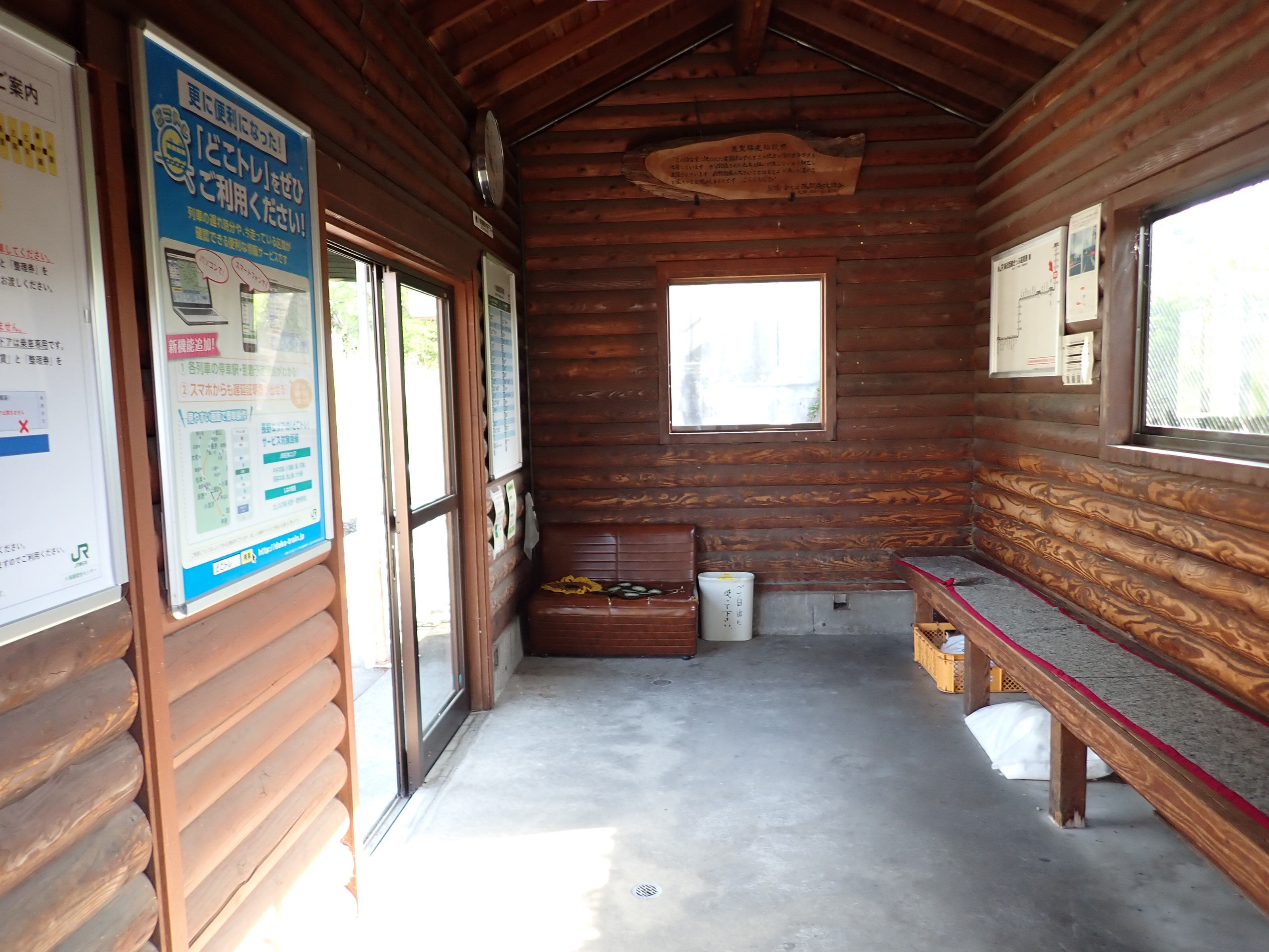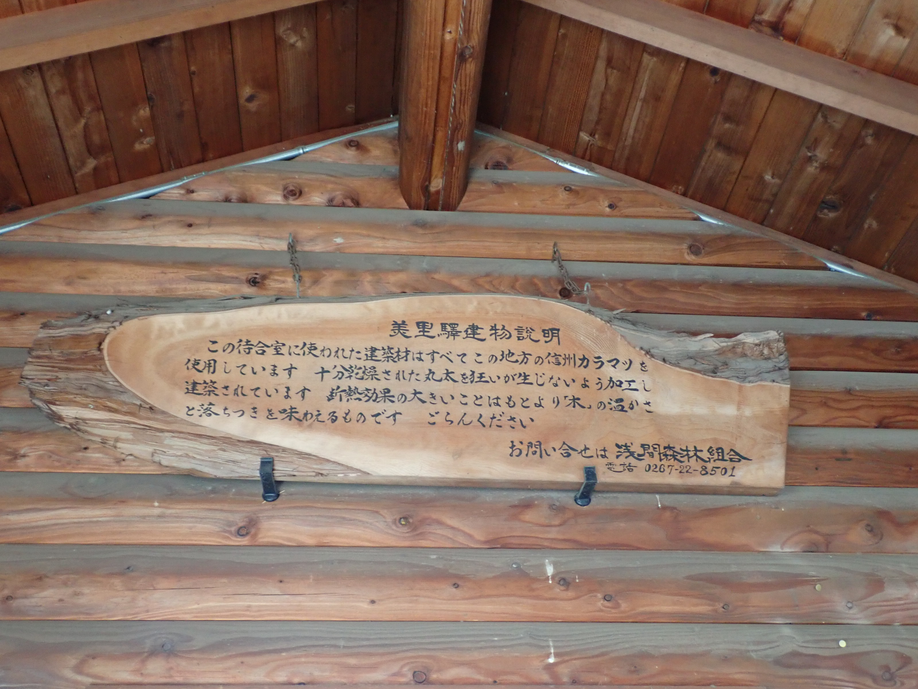 ログハウス風の待合室があり、森林組合による解説が書かれています。公園のような空間の奥に待合室やホームがある感じになっています。周辺には住宅や工場、果樹園などがあります。