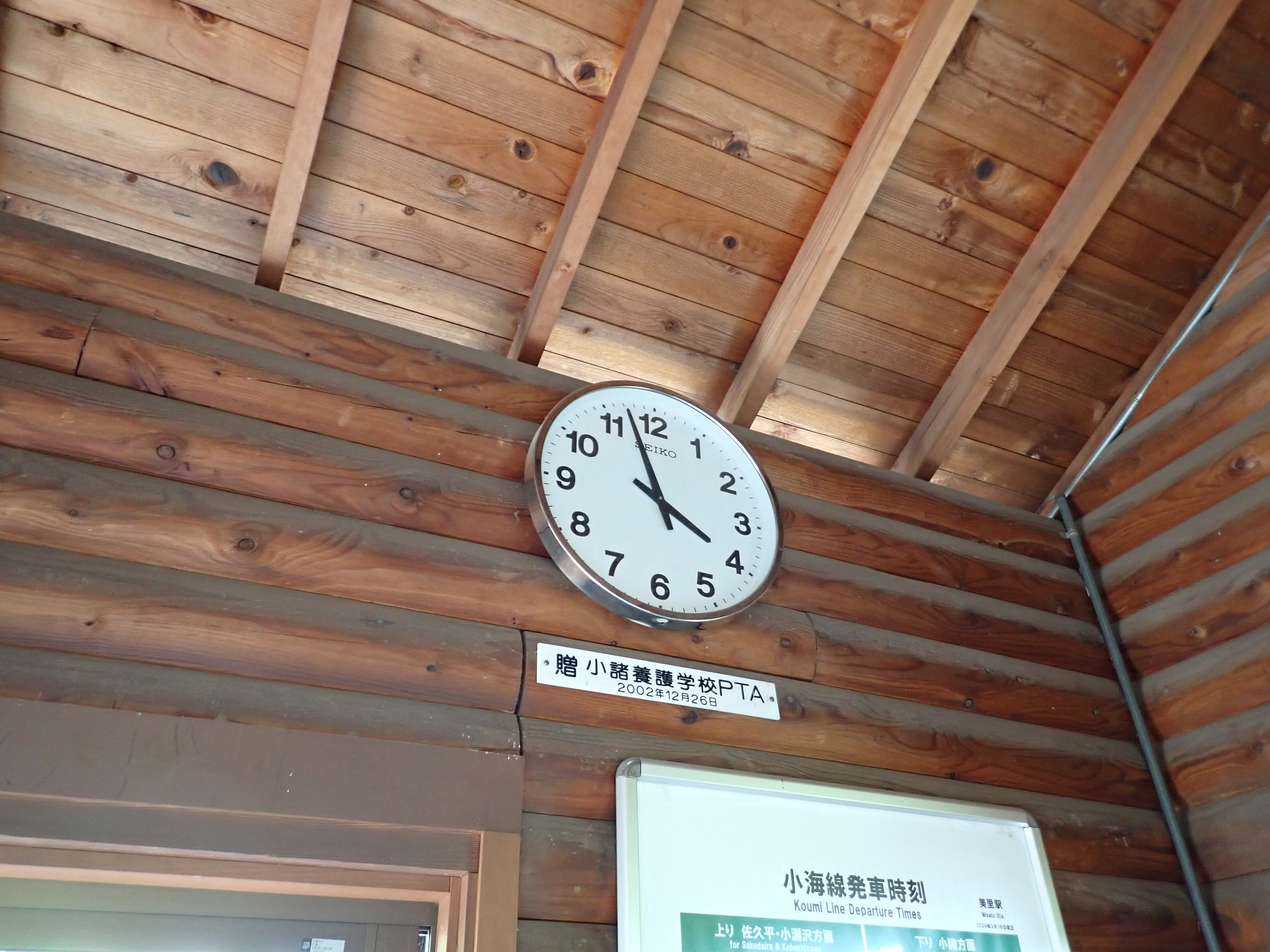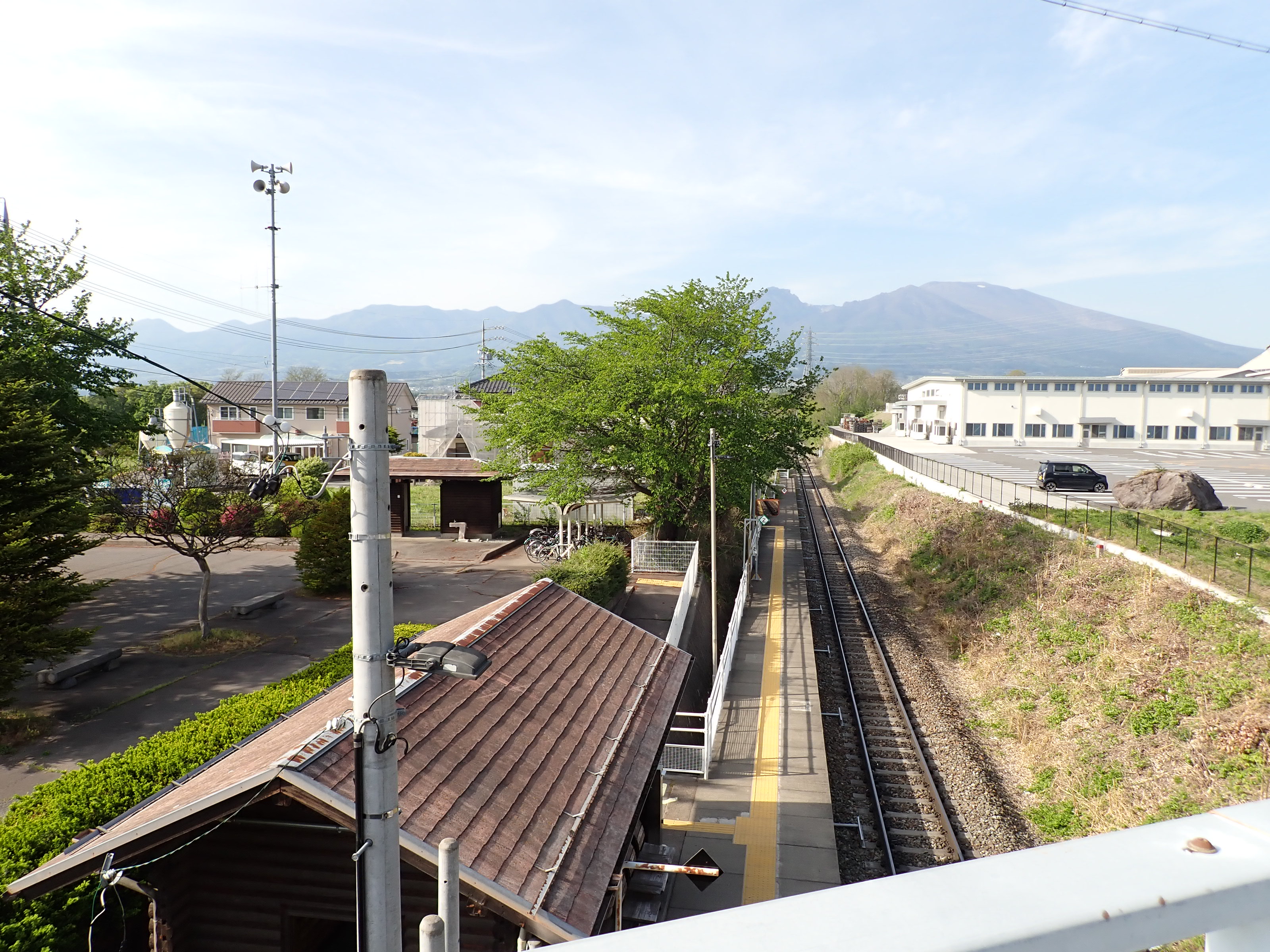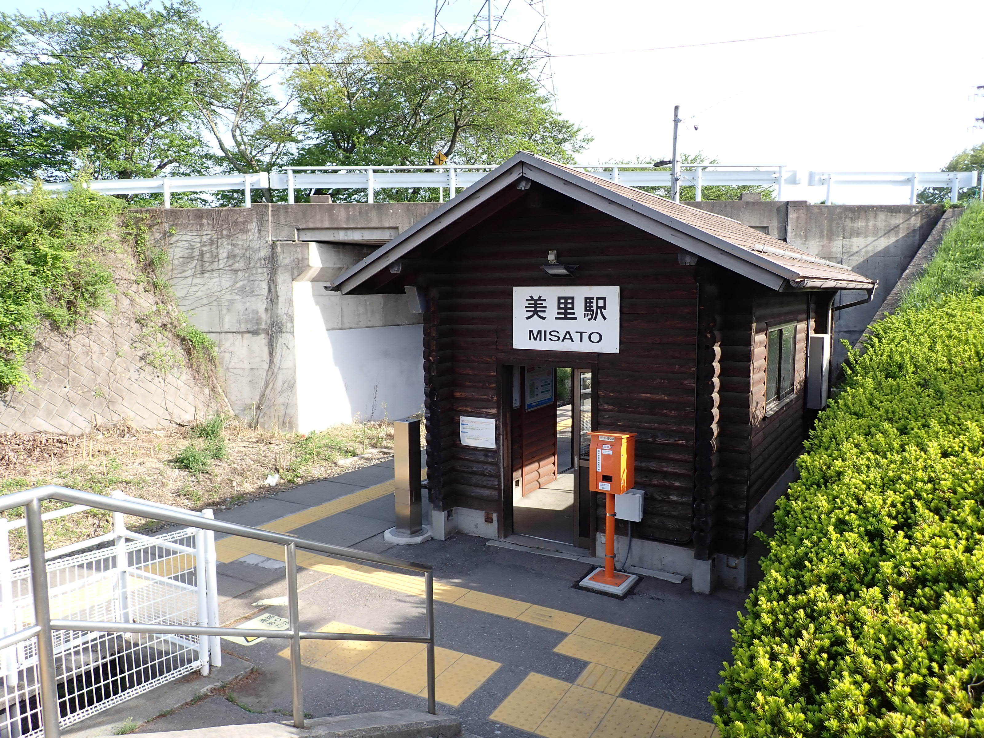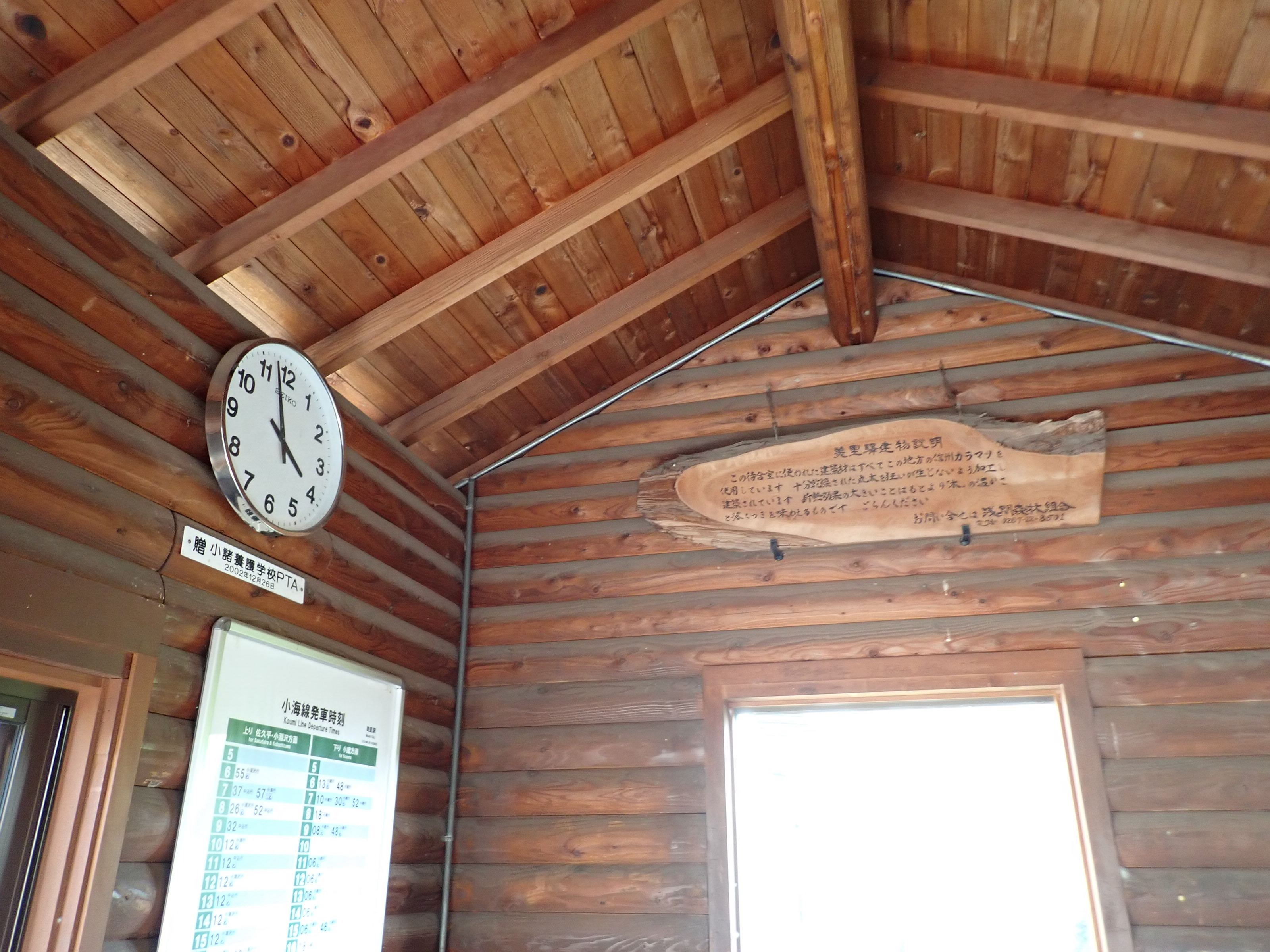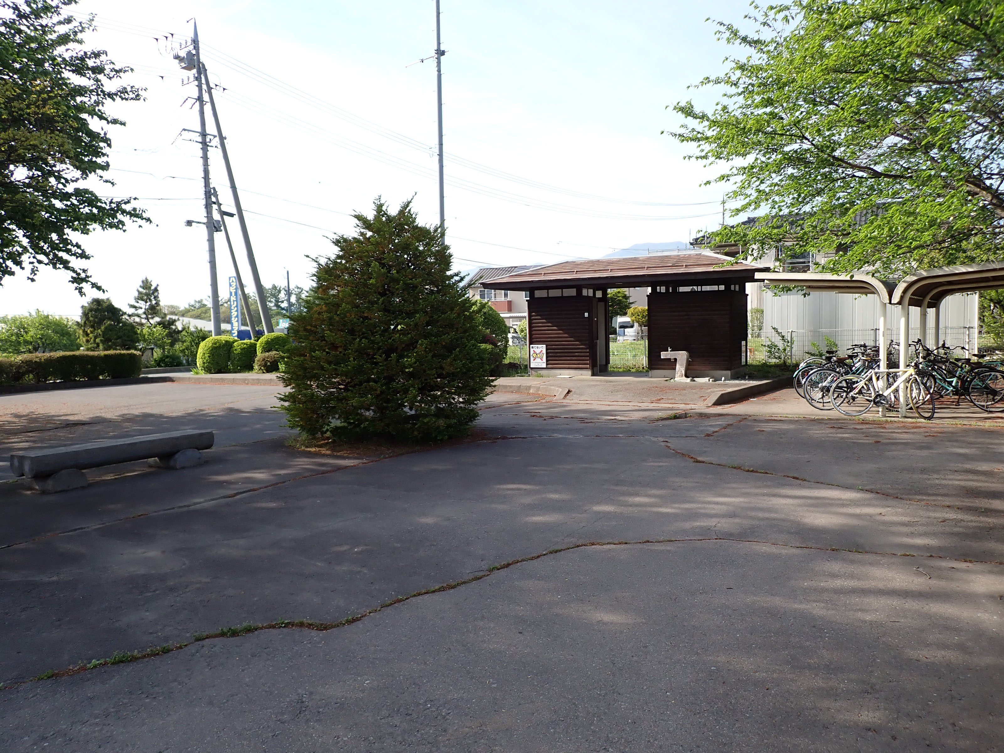 ログハウス風の待合室があり、森林組合による解説が書かれています。公園のような空間の奥に待合室やホームがある感じになっています。周辺には住宅や工場、果樹園などがあります。