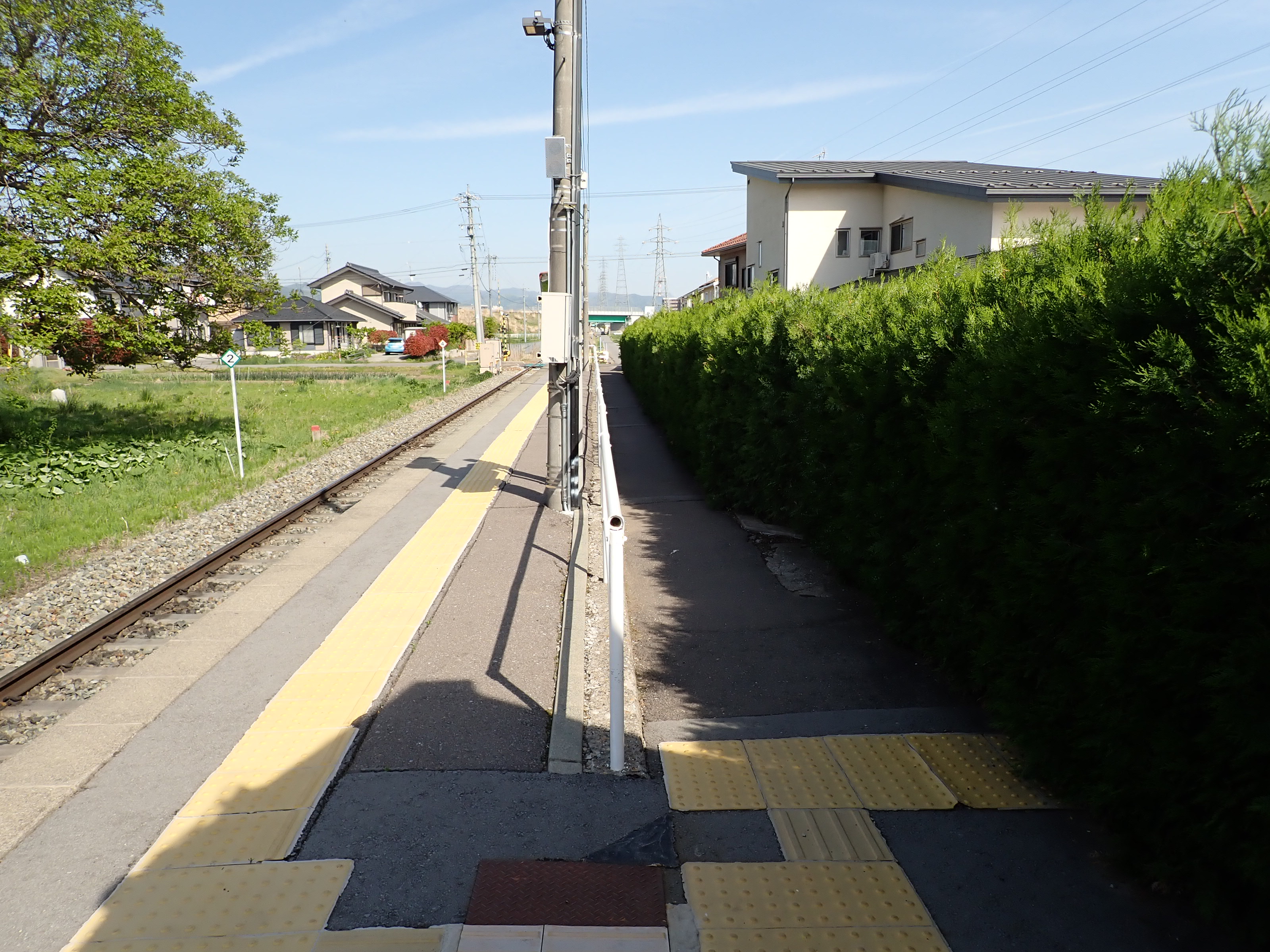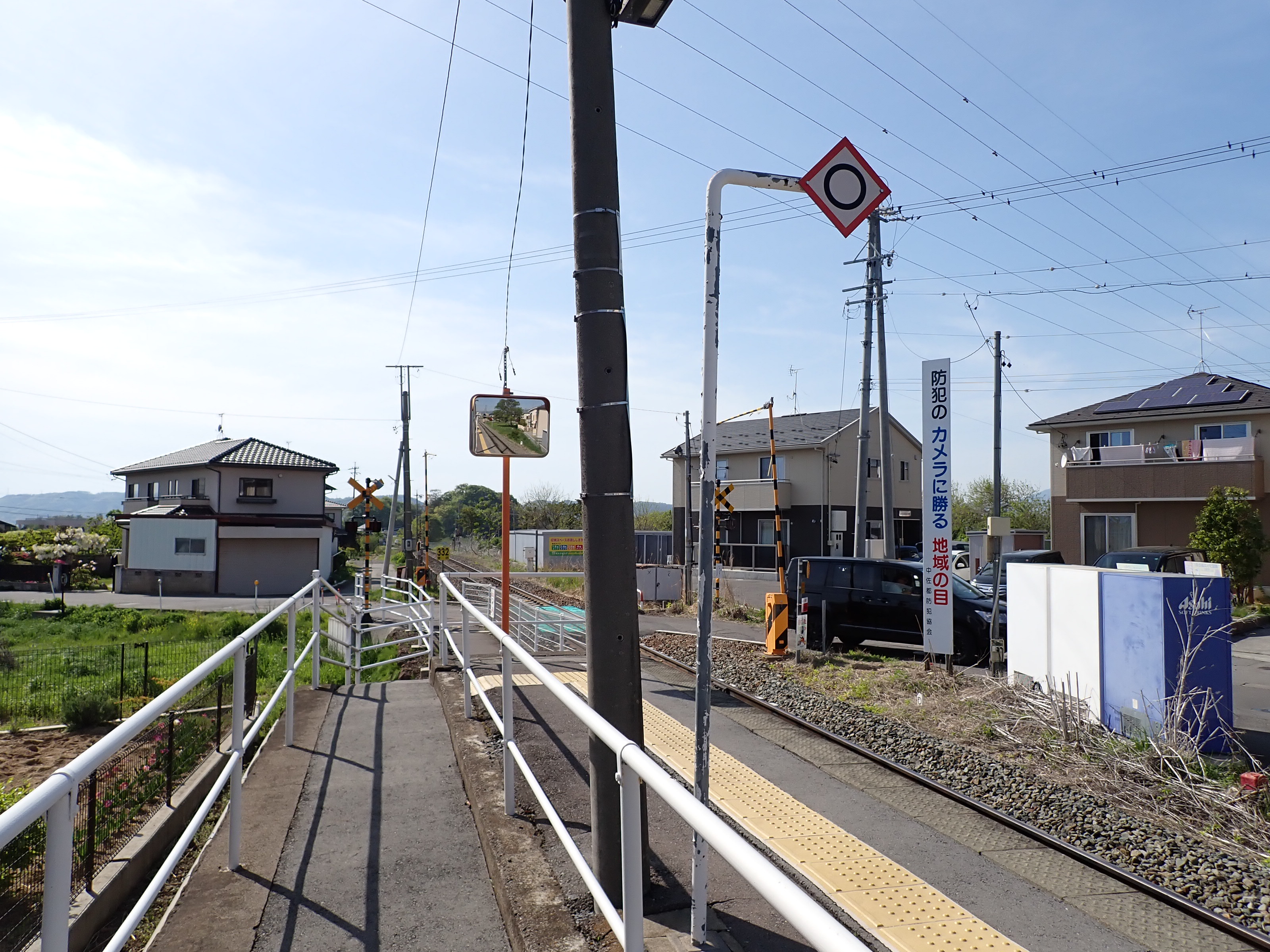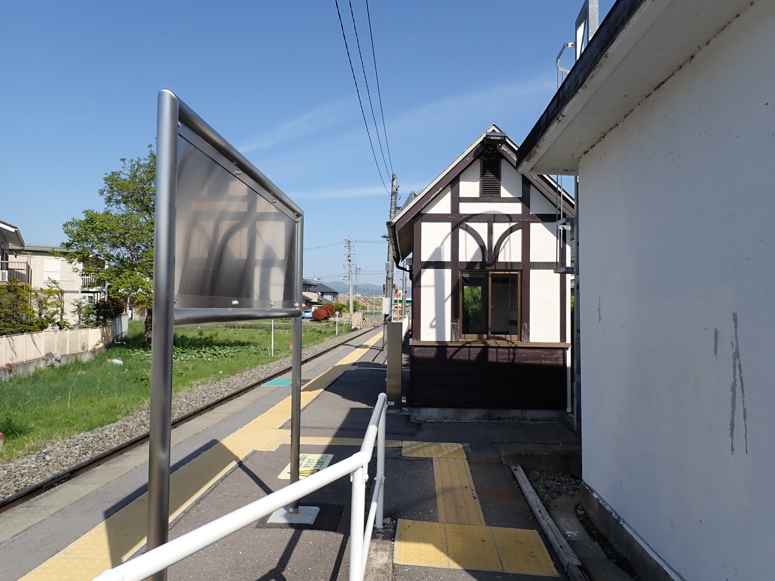 線路1本の駅で、ホームから見て両側の進行方向に出入口があり、それぞれに駐輪場があります。待合室の建物が洒落ています。周辺は新しい住宅も多くありながら、畑が広がるところです。