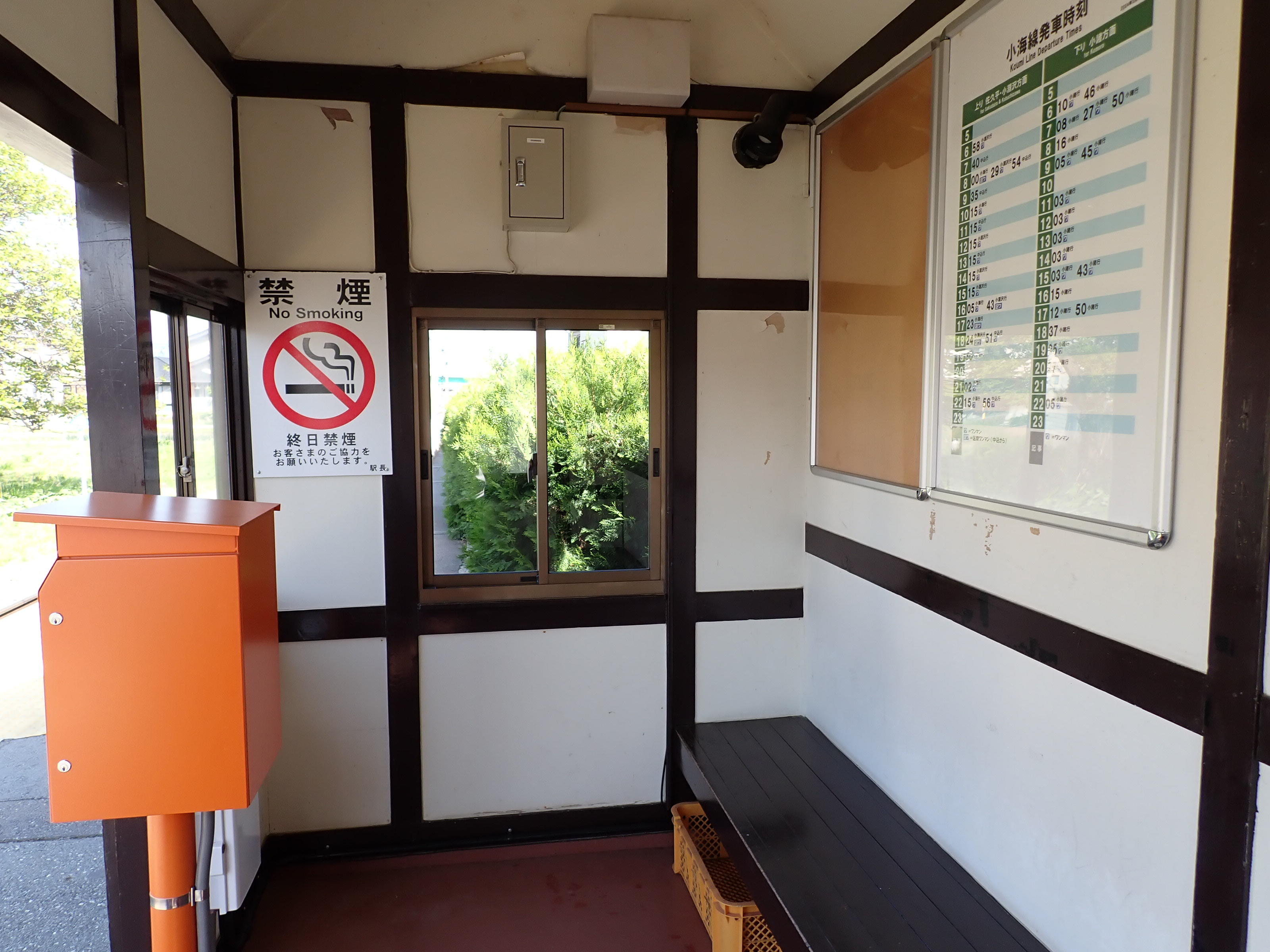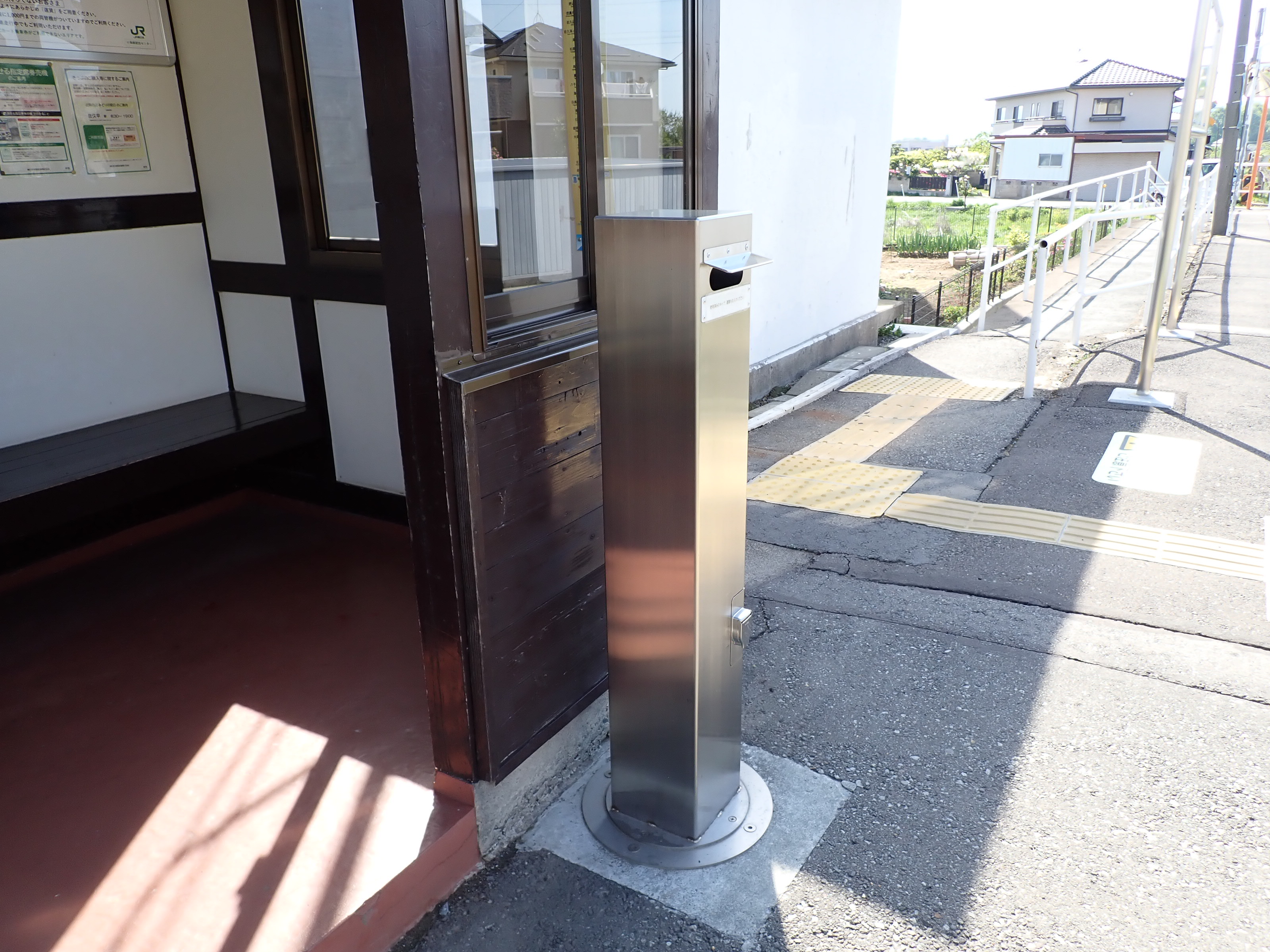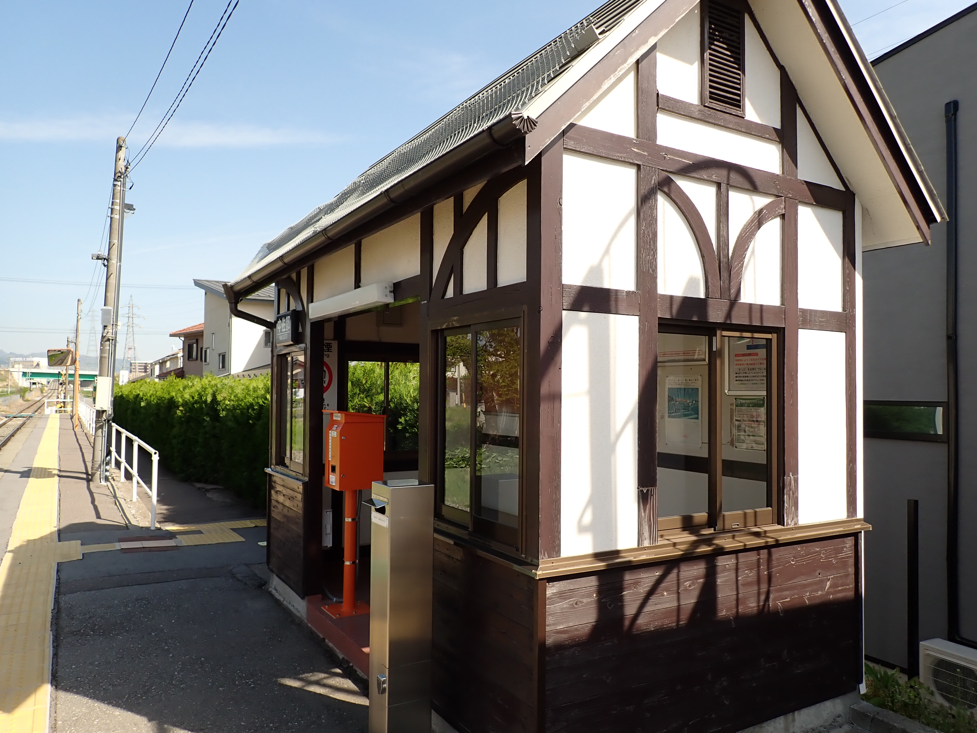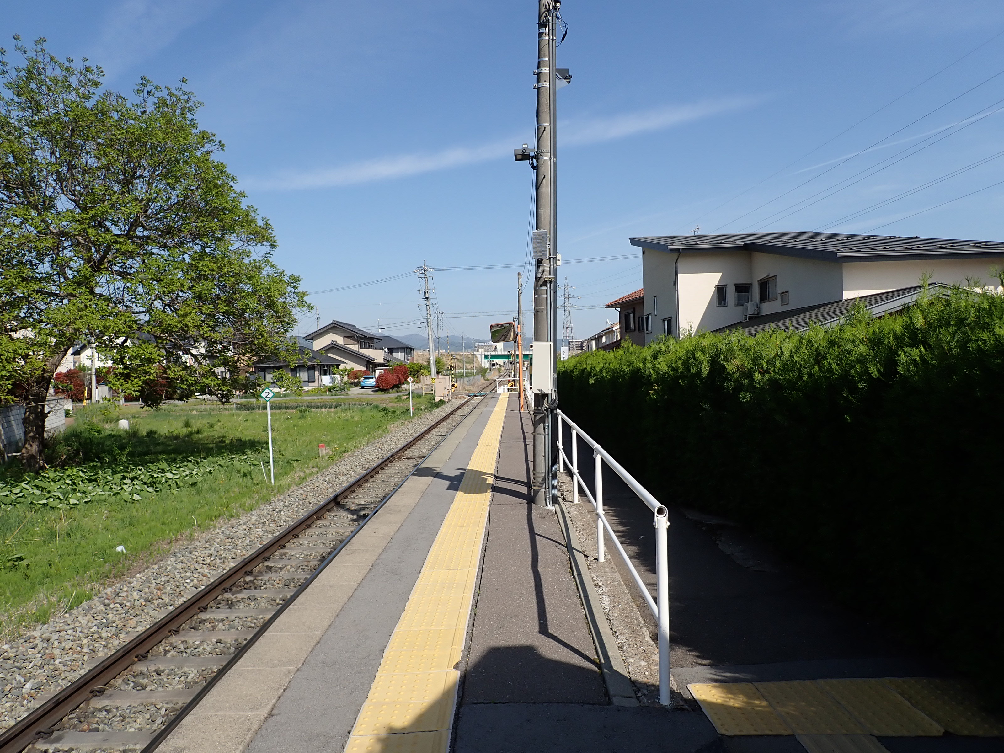 線路1本の駅で、ホームから見て両側の進行方向に出入口があり、それぞれに駐輪場があります。待合室の建物が洒落ています。周辺は新しい住宅も多くありながら、畑が広がるところです。