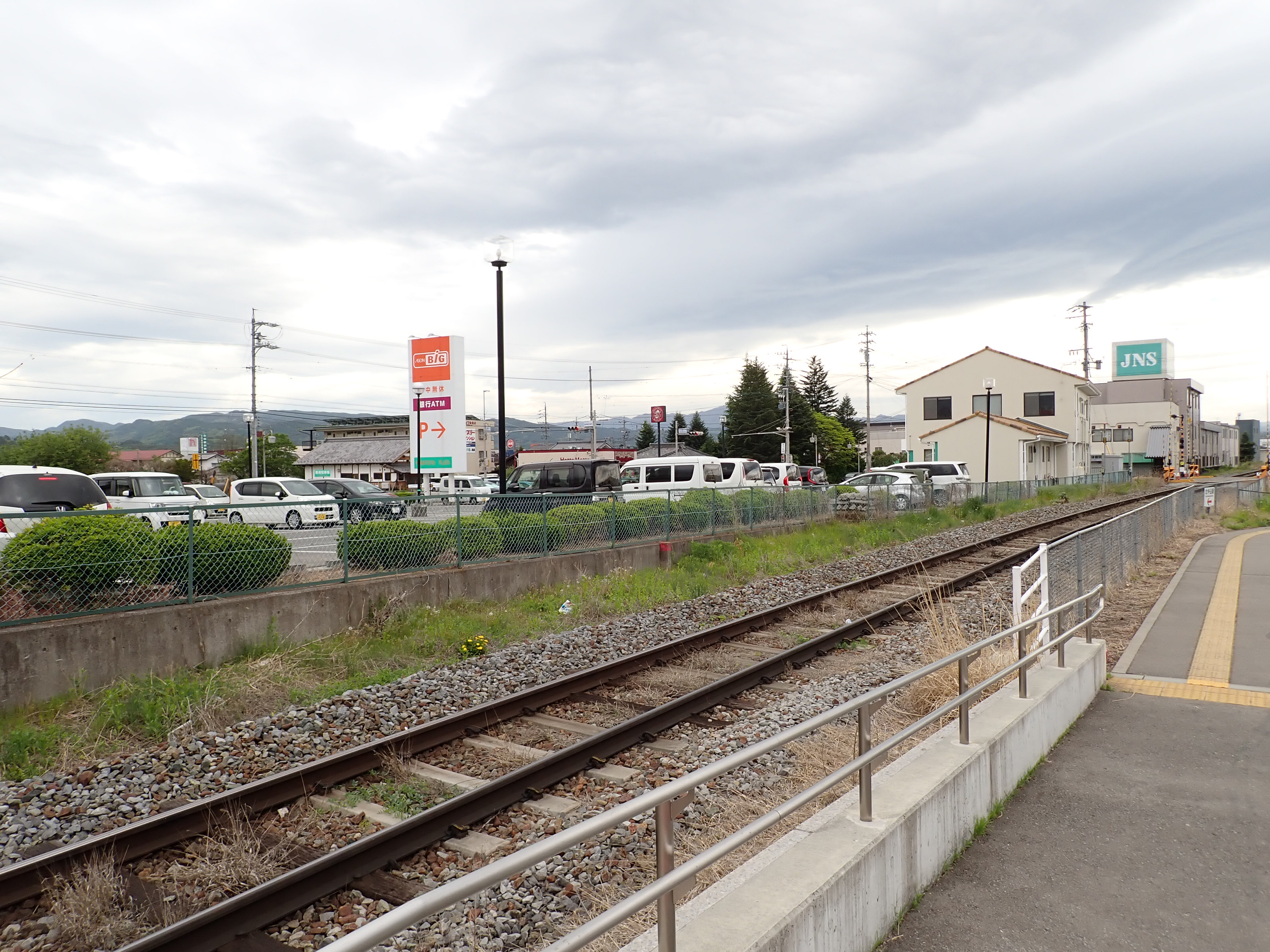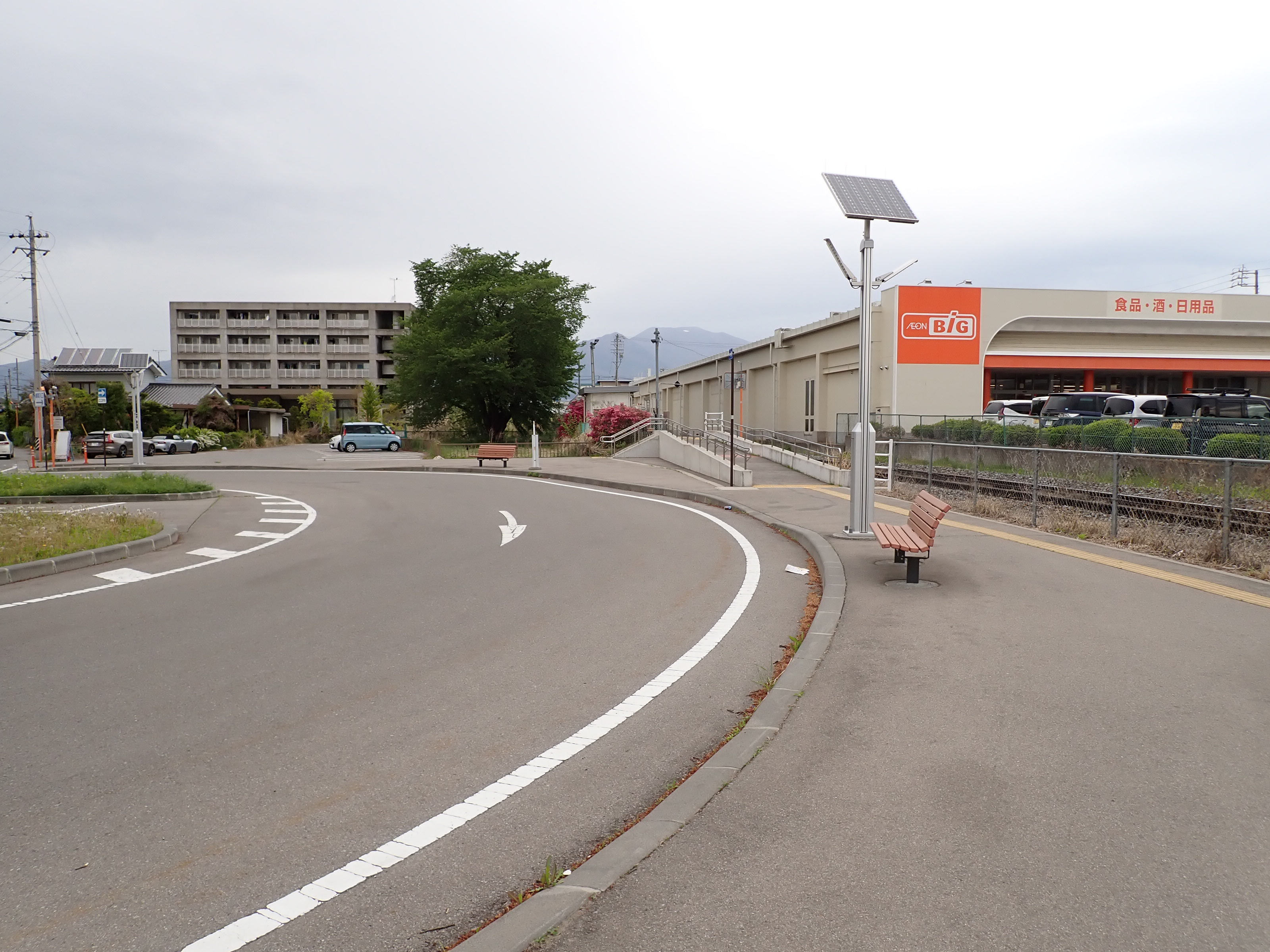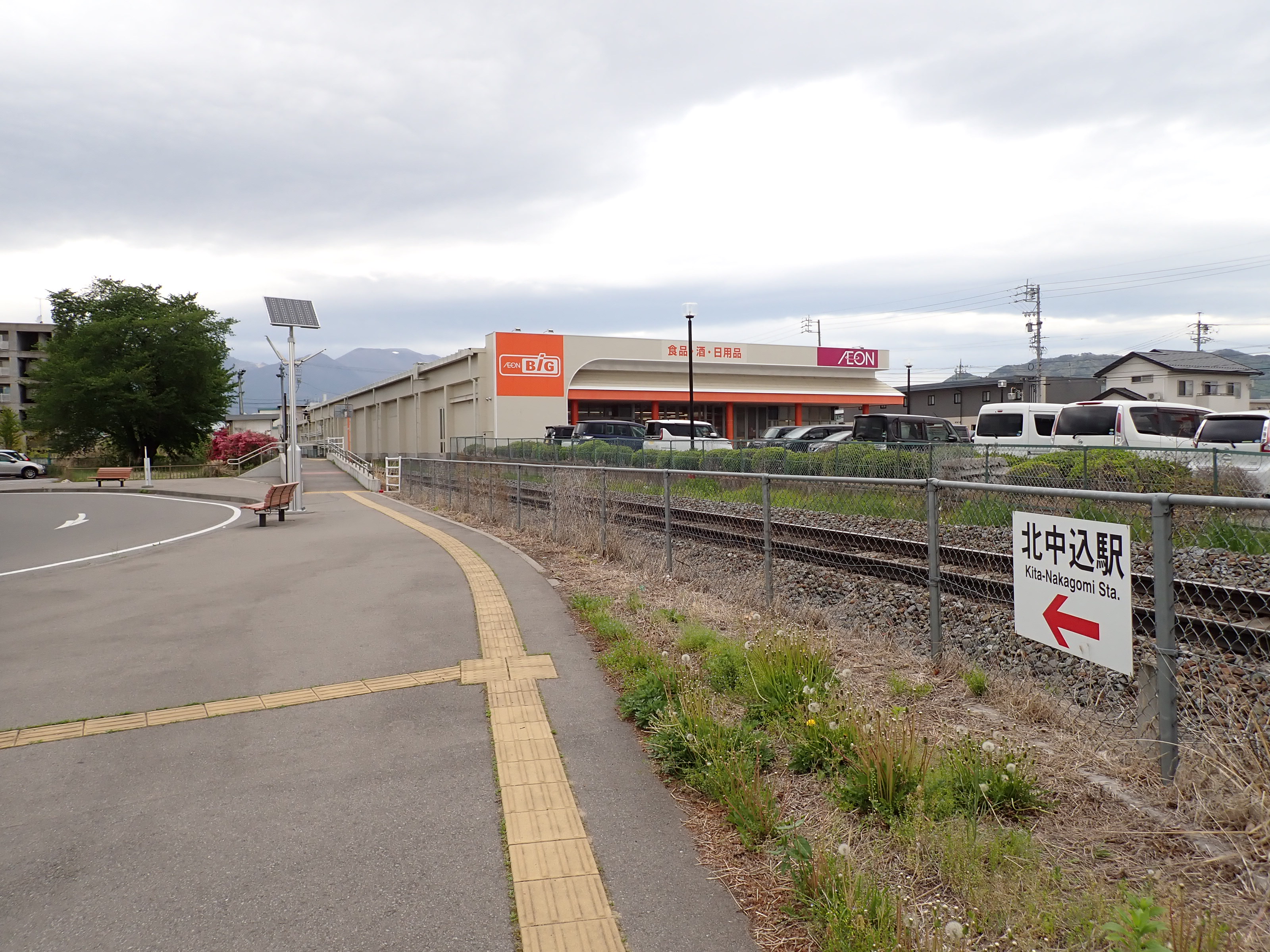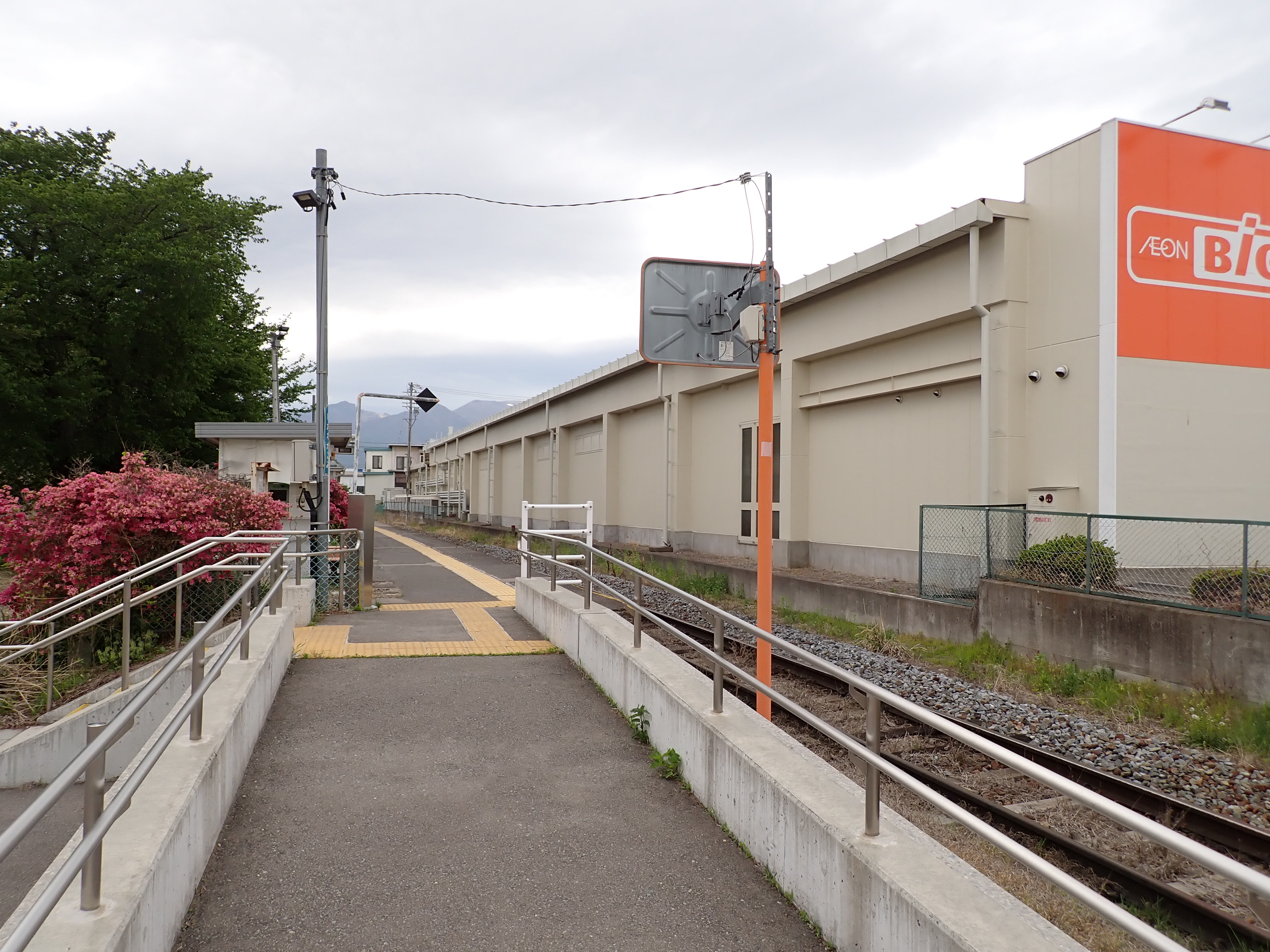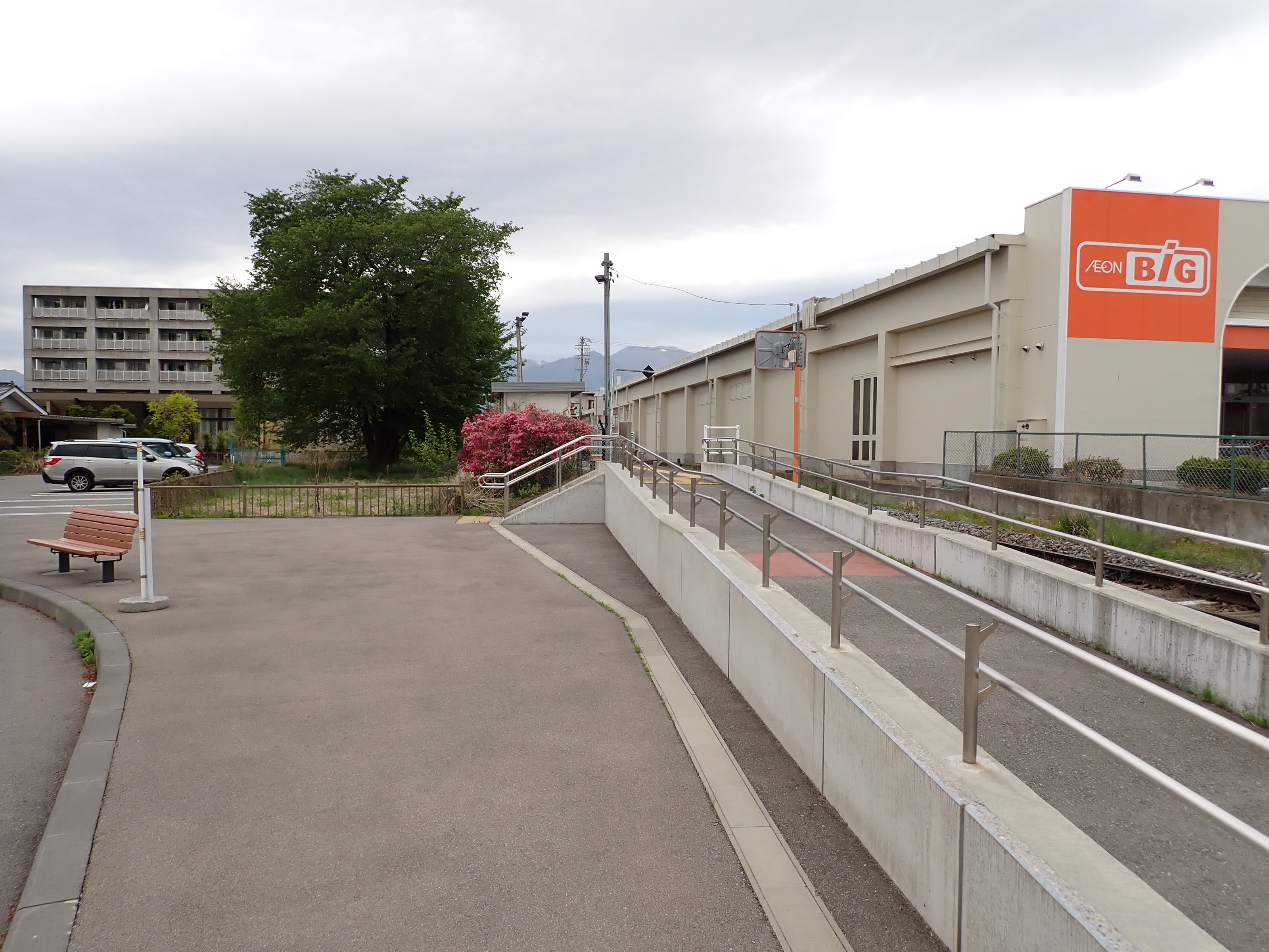 ホームの向かい側はショッピングセンターで、その他にもロードサイド型の店が駅のそばにあります。公園のような雰囲気の広い駅前広場があります。この駅から滑津駅方向に進んで行くと佐久市役所があります。