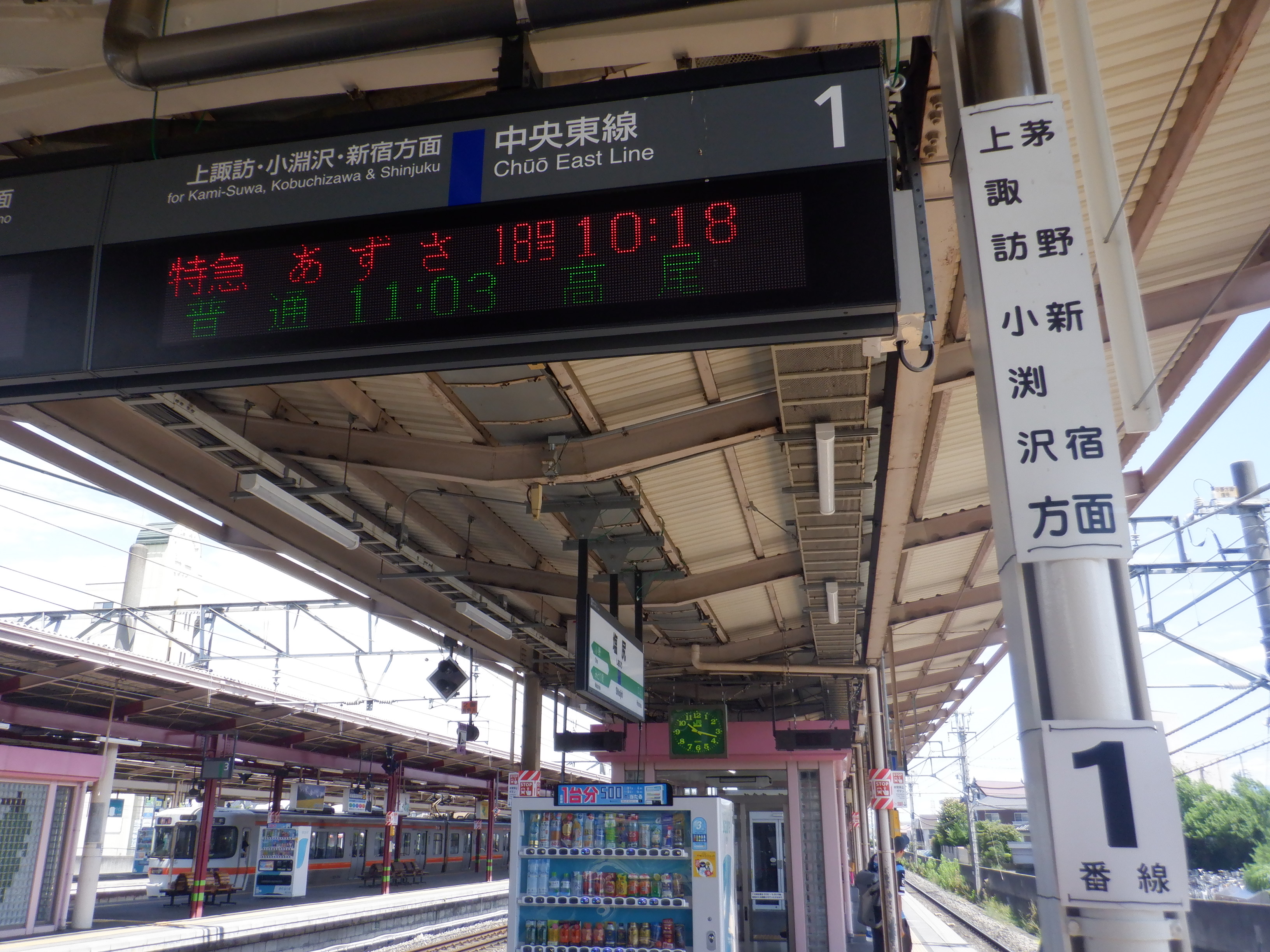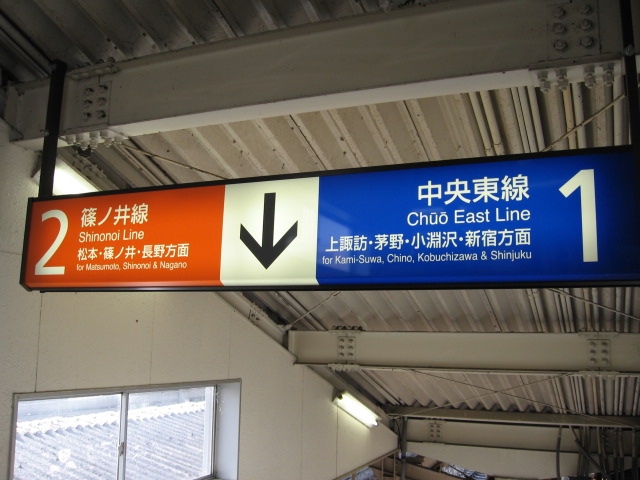 中央東線と中央西線が両方向に別れていく様子を見ることができる駅です。そして篠ノ井線に合流しますが、中央東線も2ルートに別れるため、駅名標は4方向に隣駅が表示されているものもあります。3・4番線の広丘駅側にはぶどう園があります。