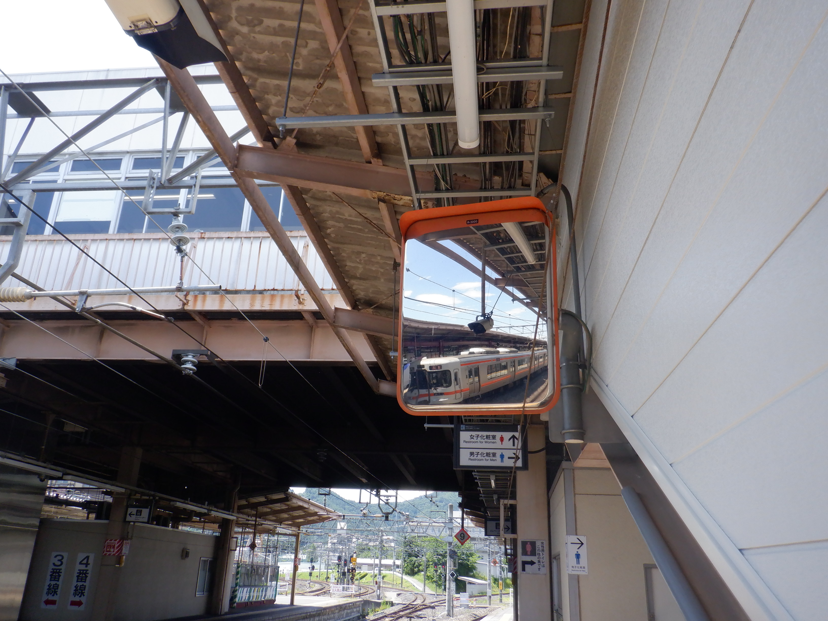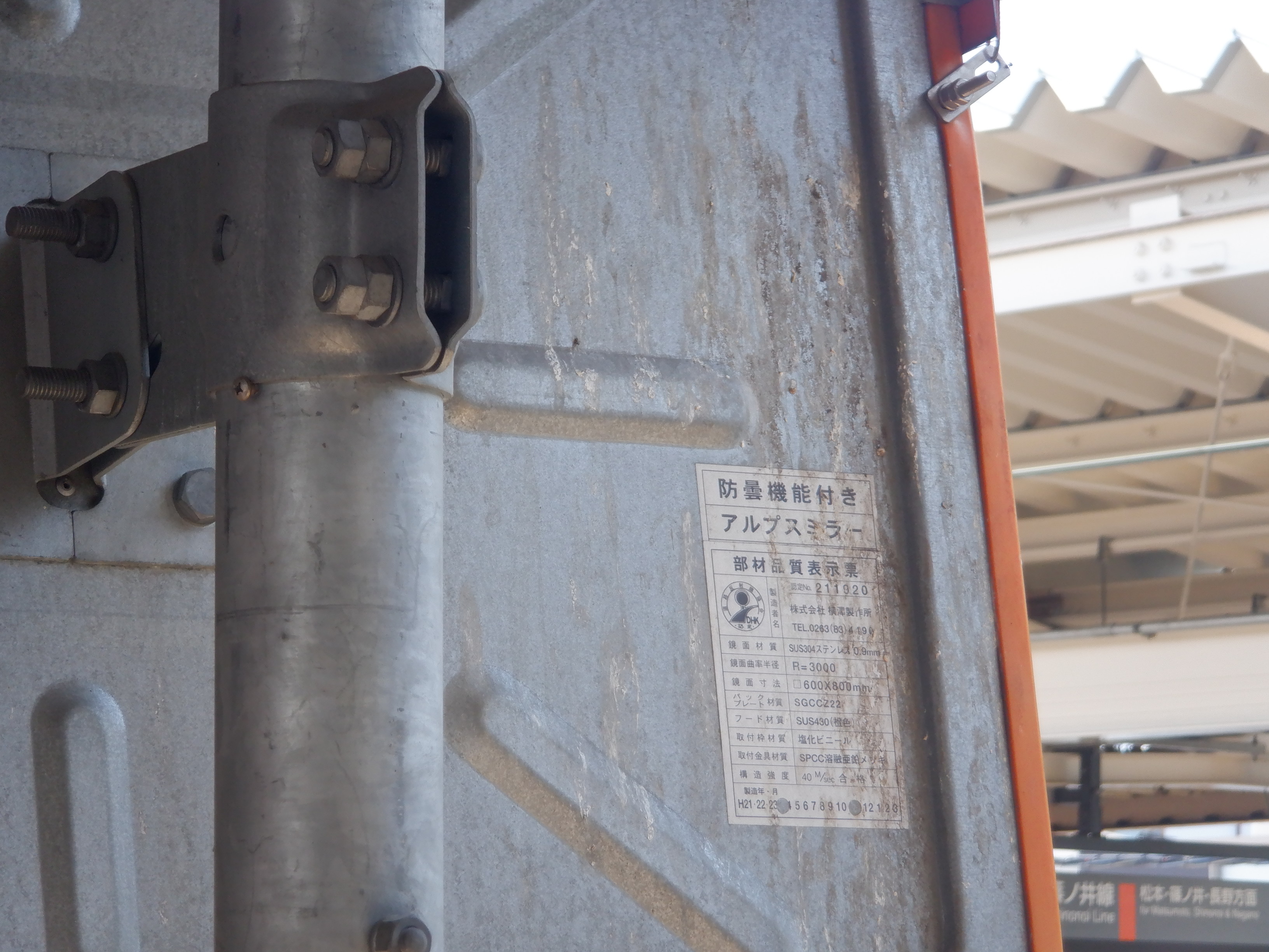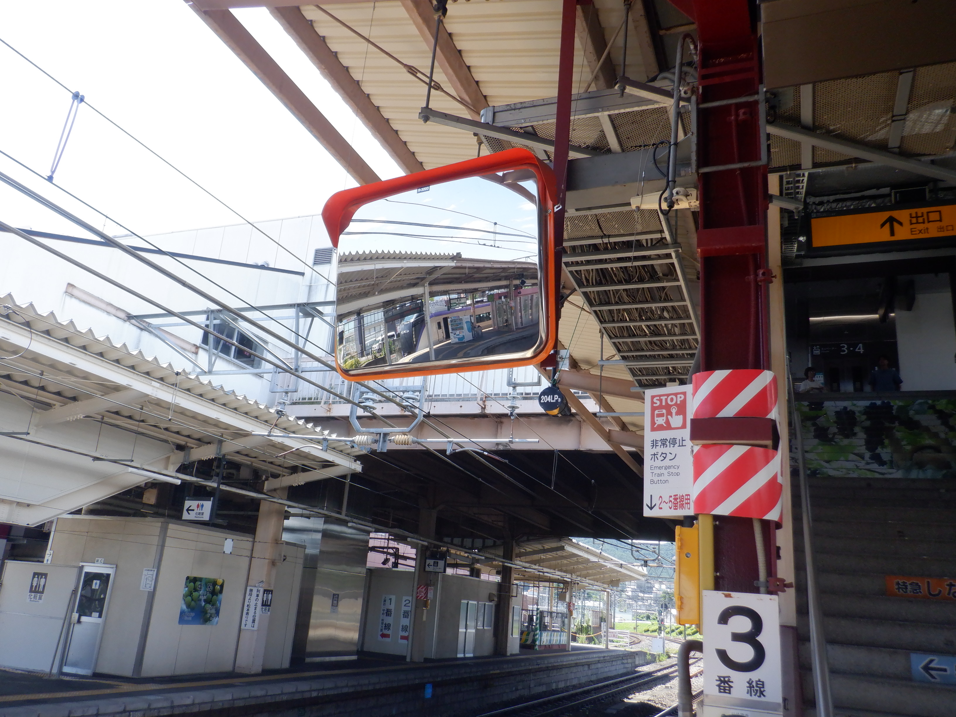 3番線階段付近のワンマンミラー。こちらもアルプスミラーが使われています。