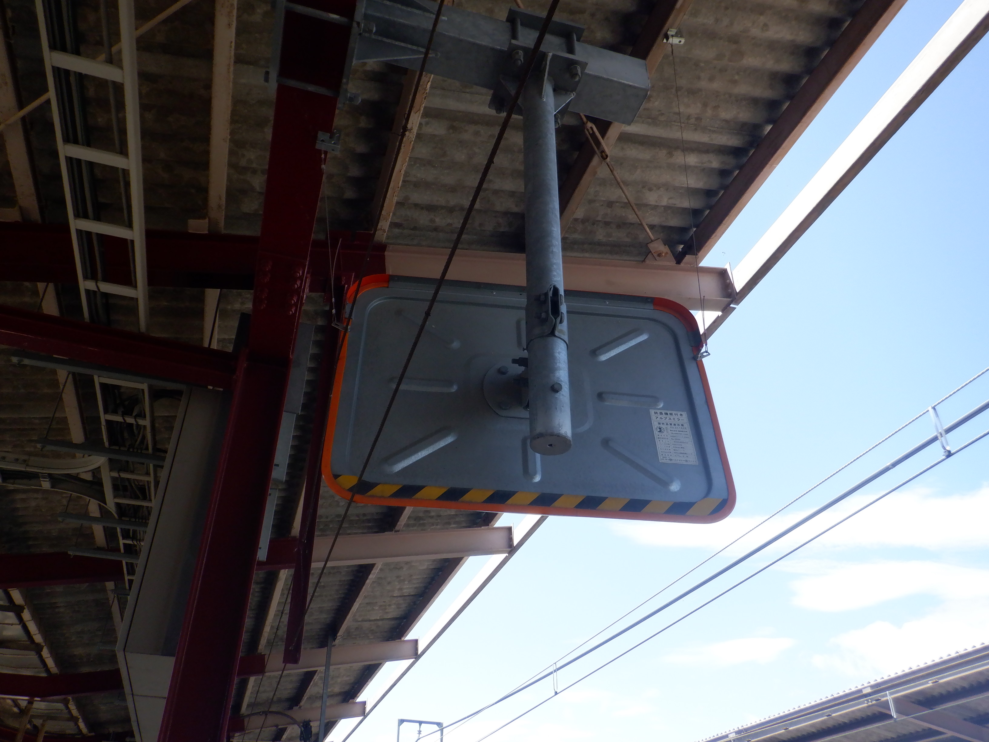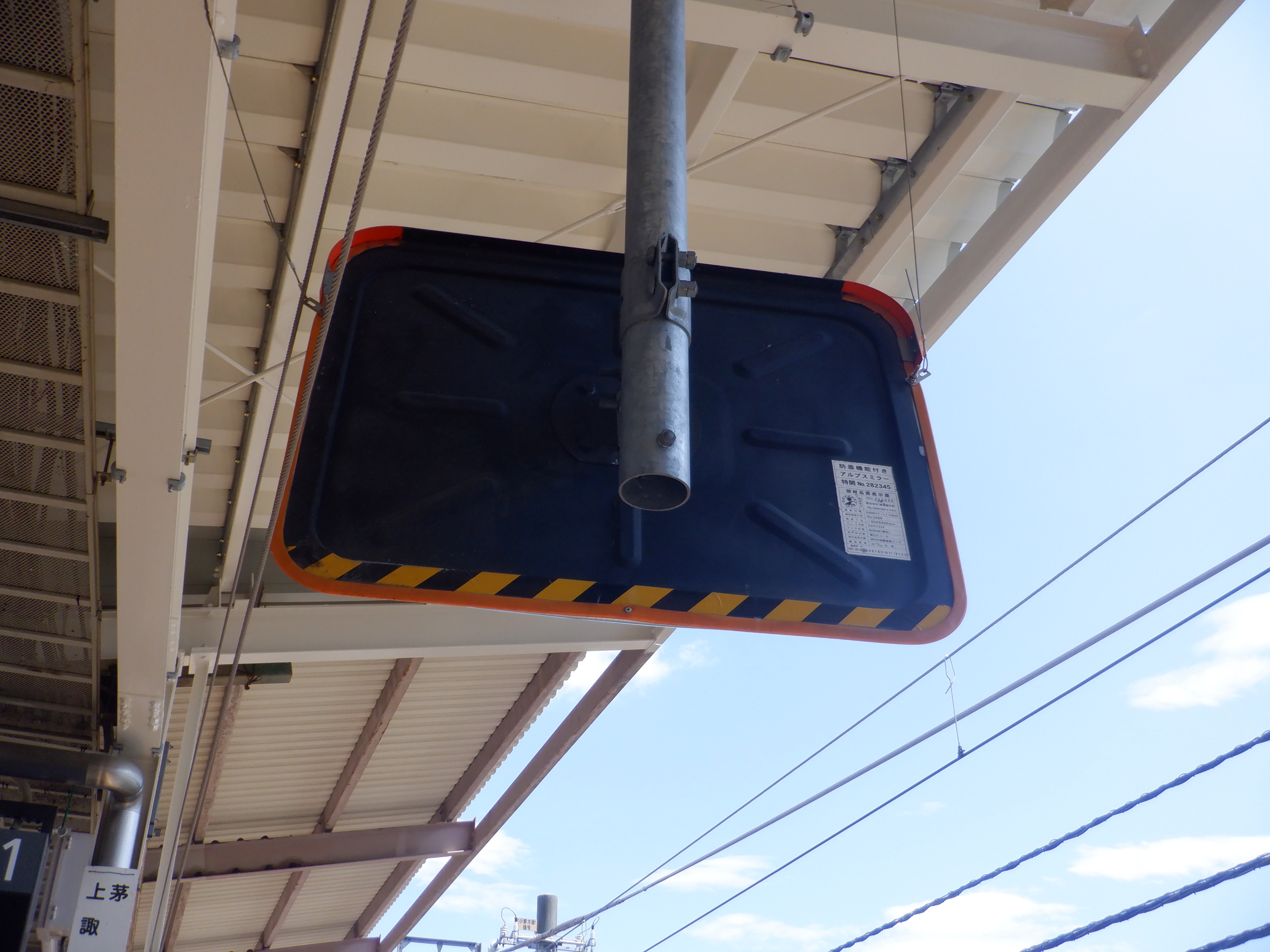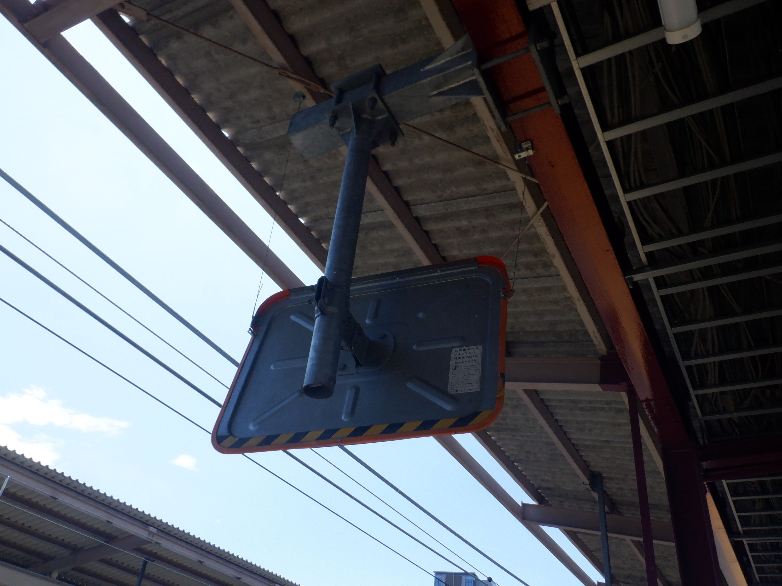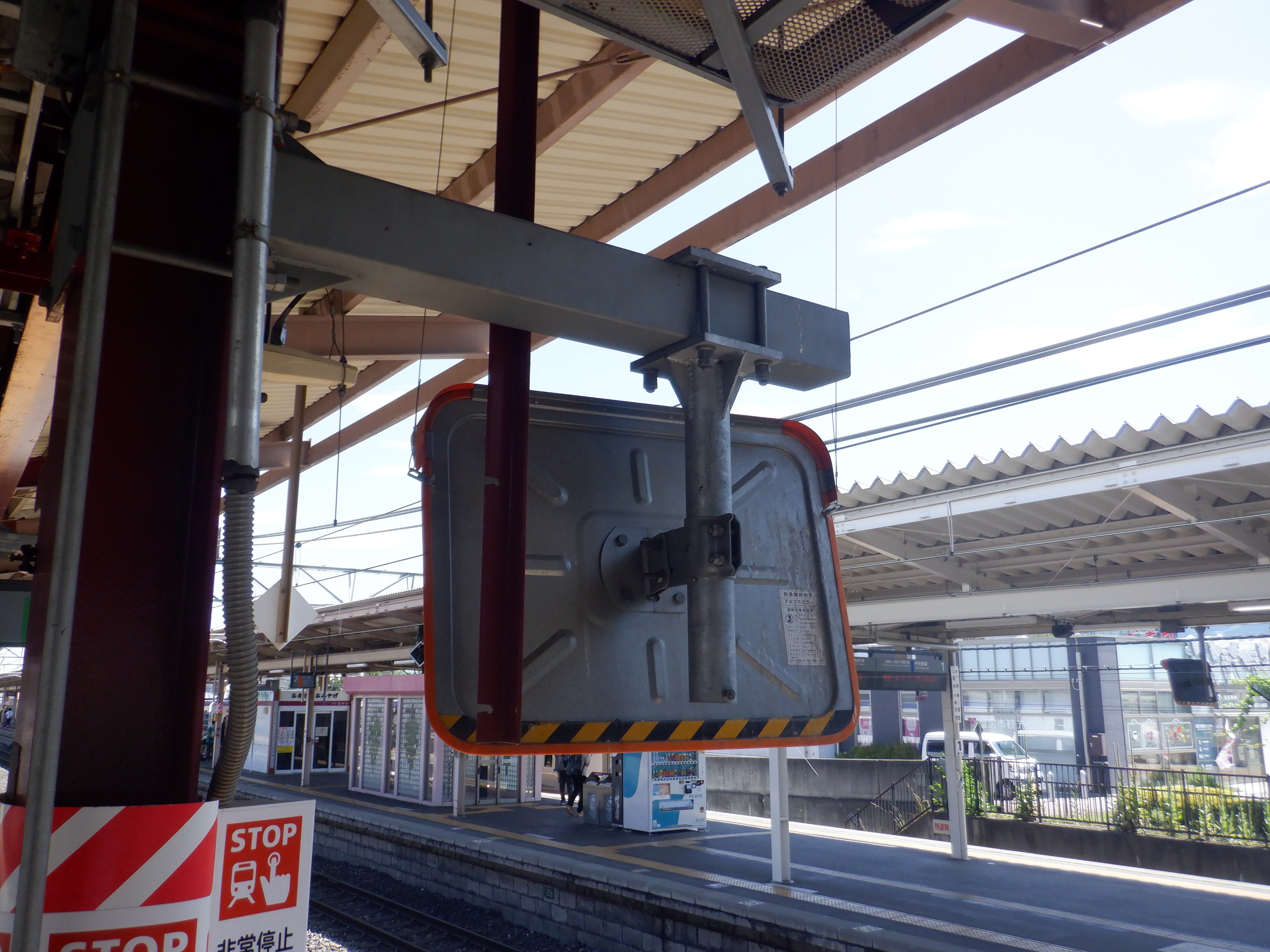 1番線の階段付近のワンマンミラー。アルプスミラーが使われています。