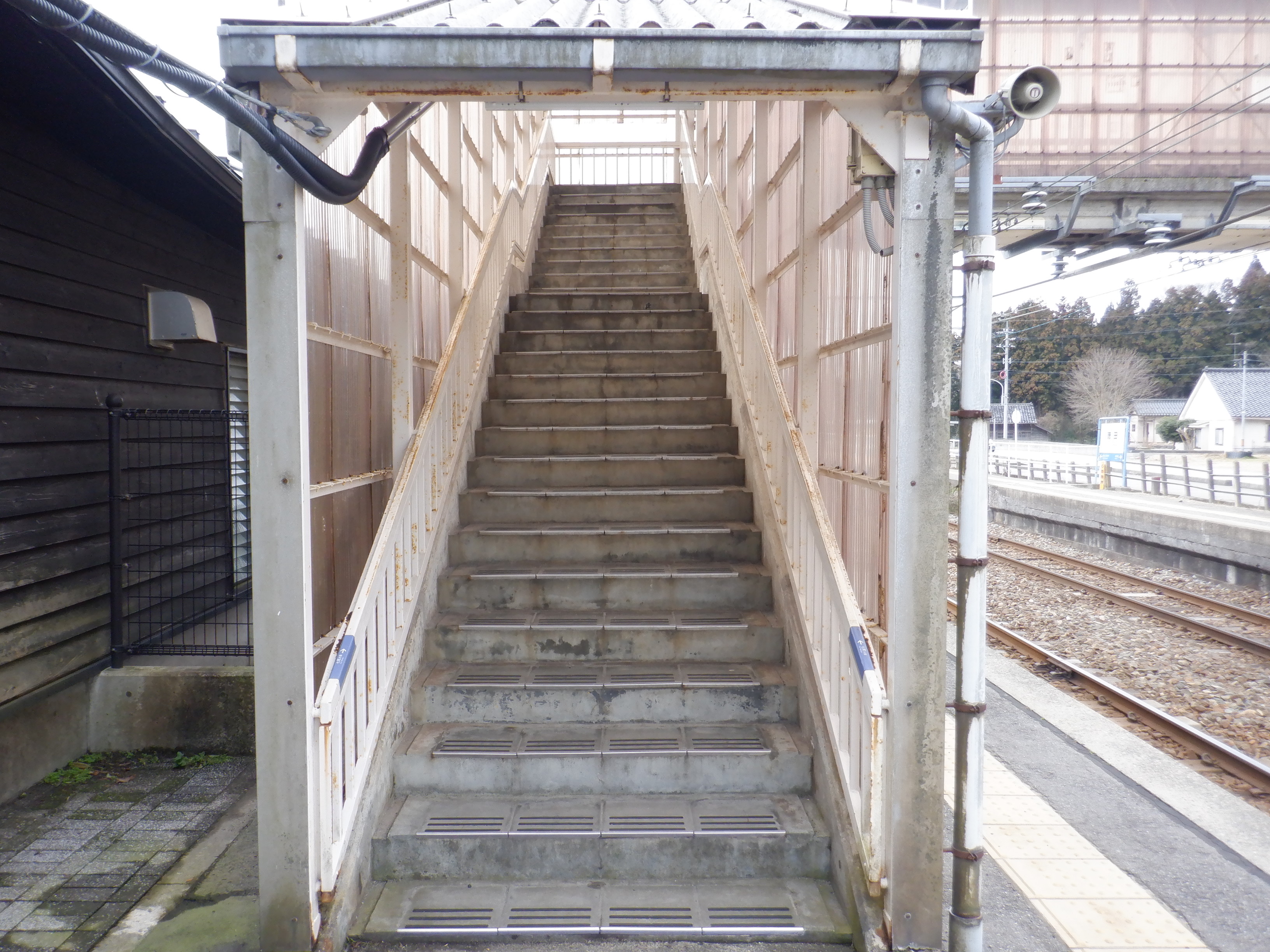 駅舎と反対側のホームから見た駅舎側の跨線橋階段。