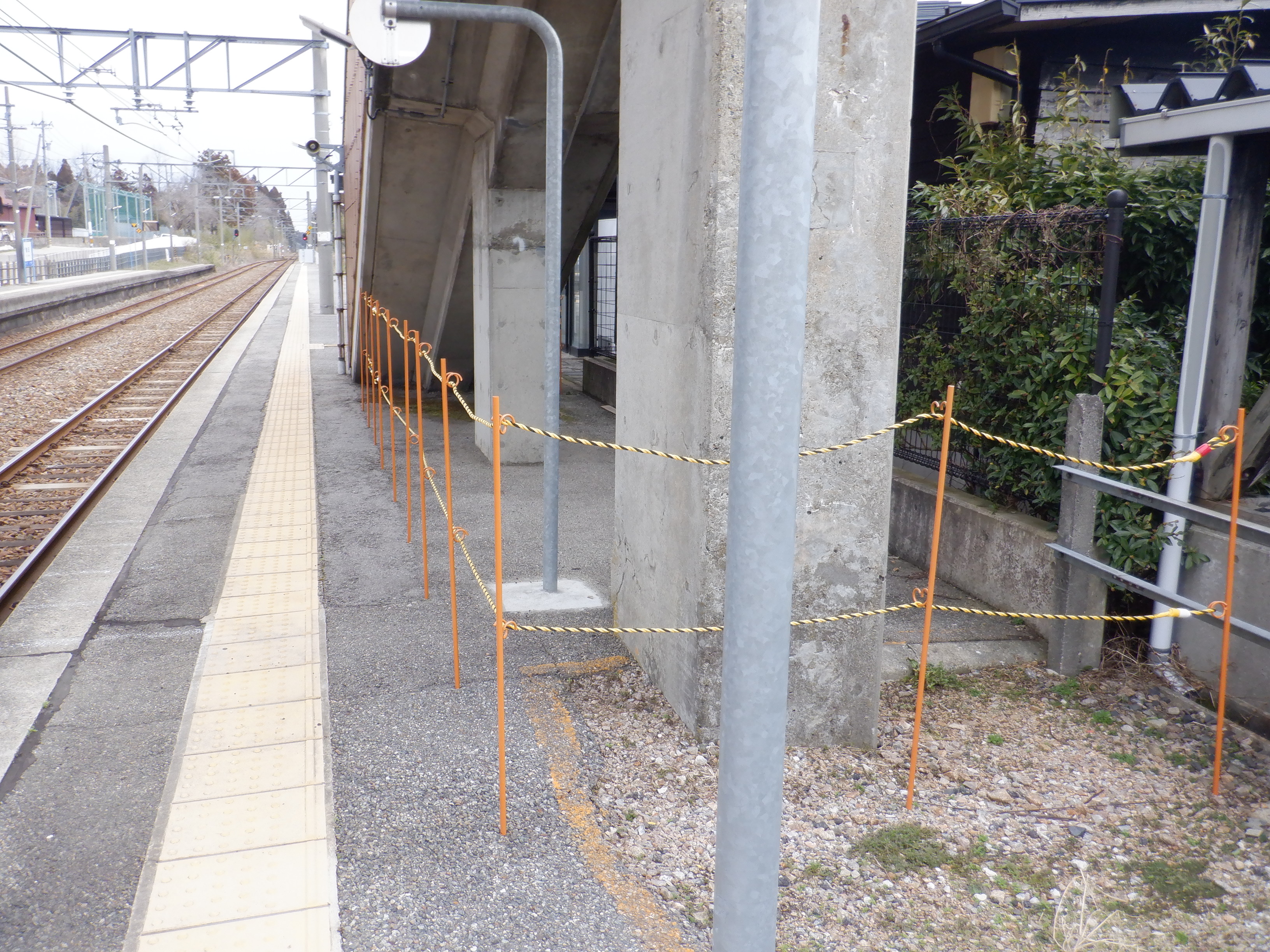 駅舎と反対側のホームの、七尾駅側のワンマンミラーのポールが設置されたところ。