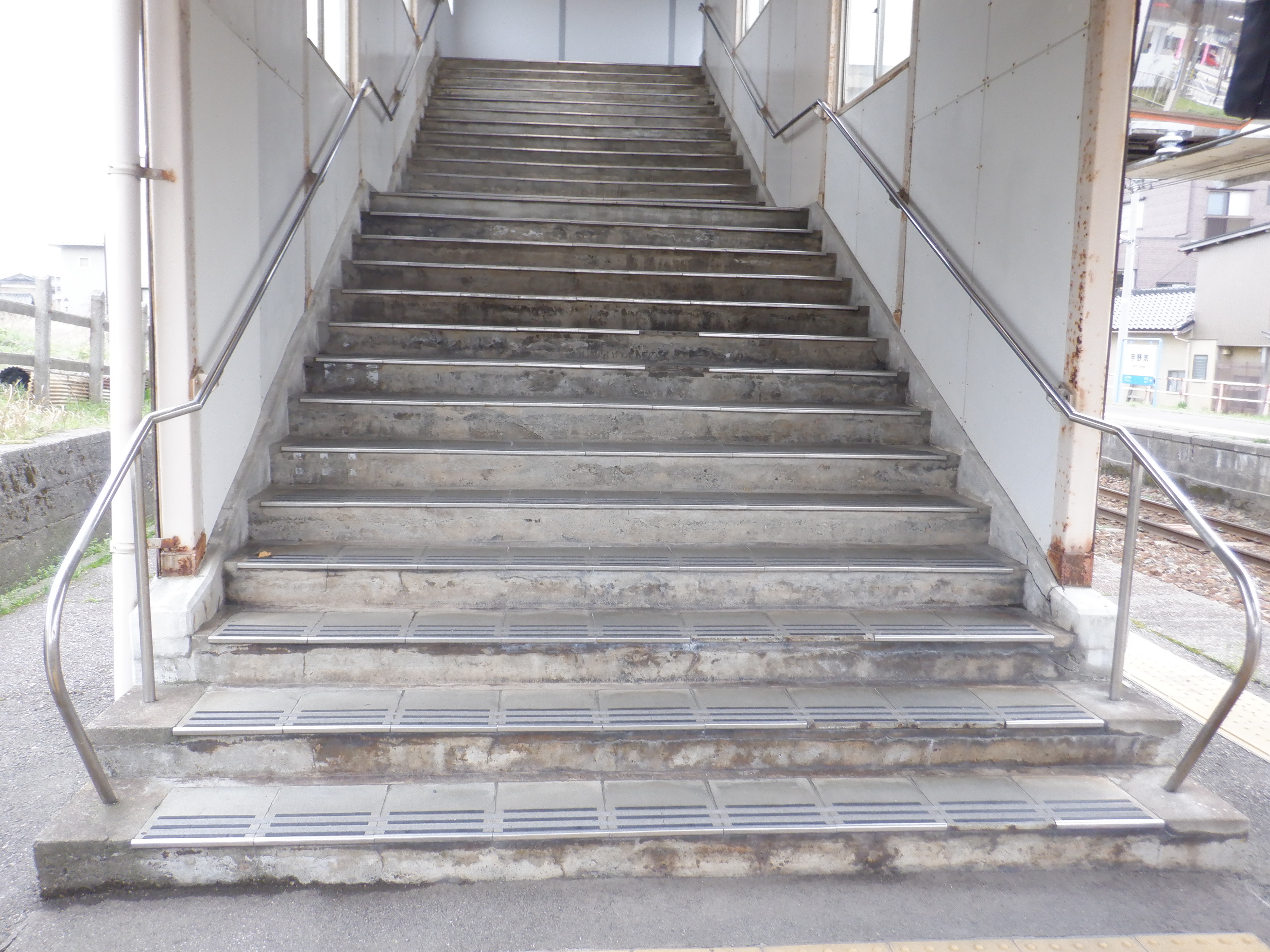 1番のりばの跨線橋階段。こちらは壁は古いままです。