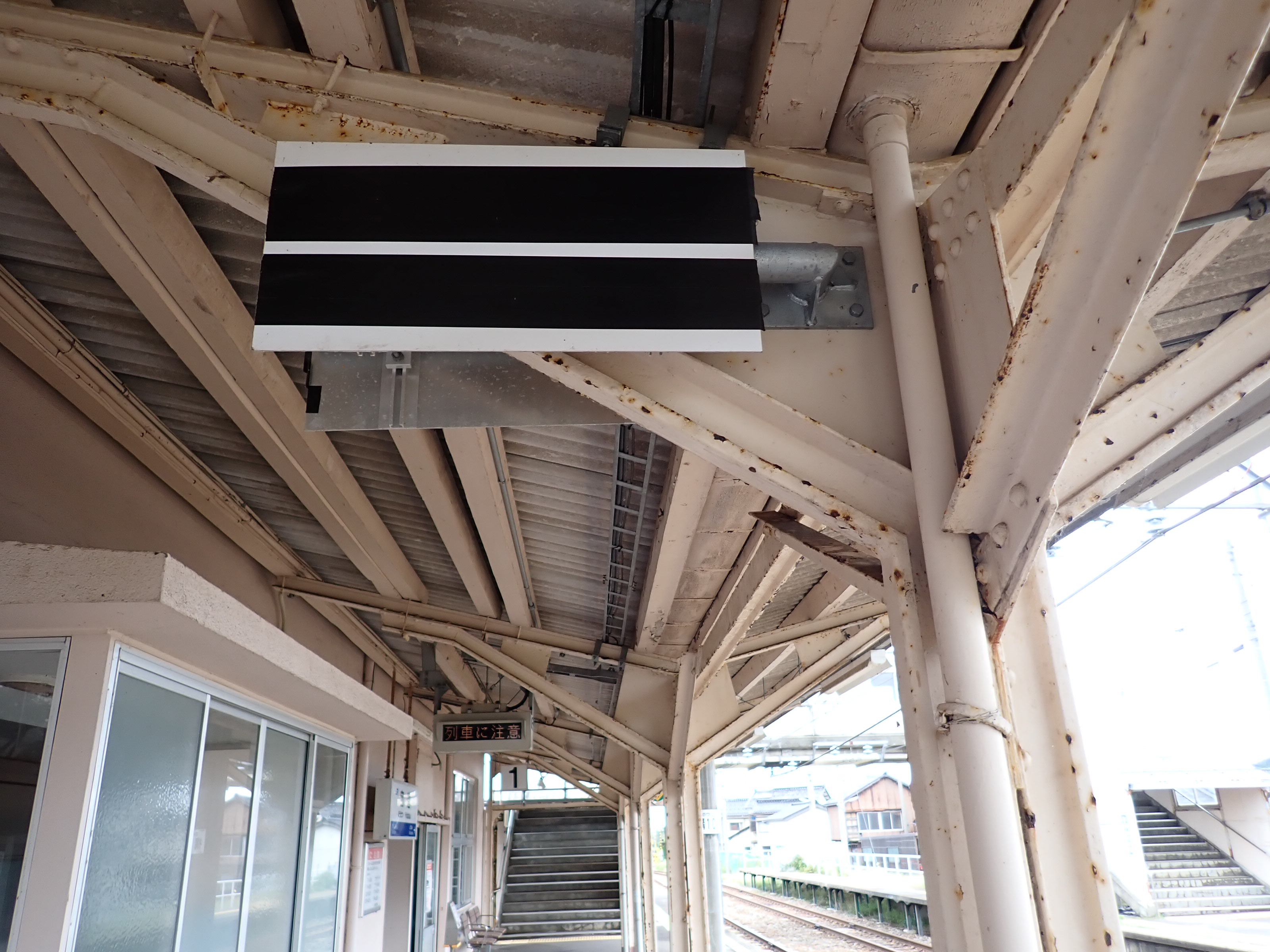 東口からホームに入るところの屋根とその支柱の表示。