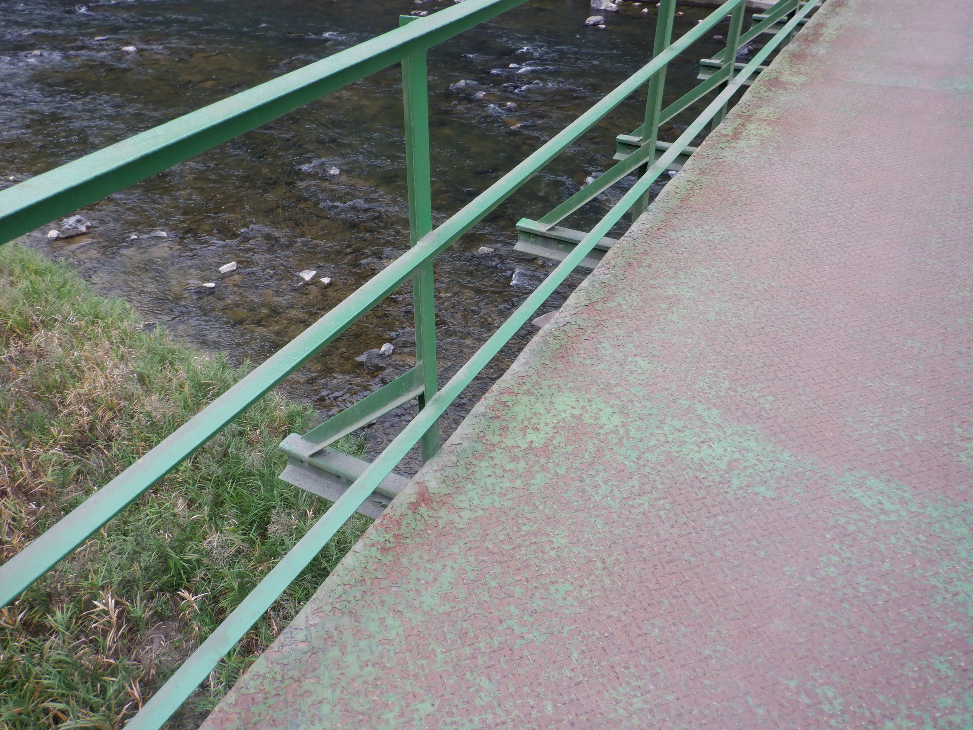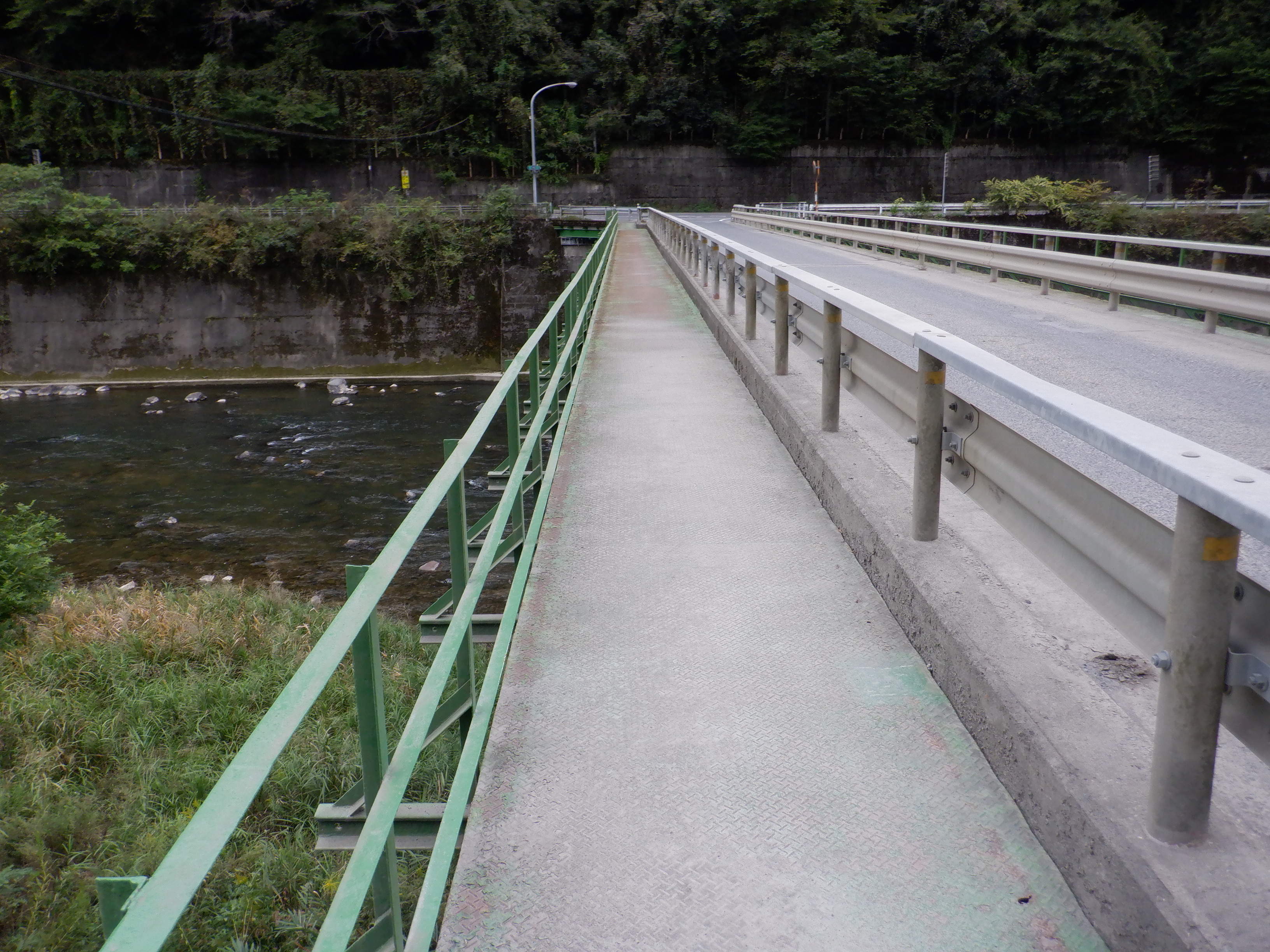 歩道はガードレールの外に鉄板の橋が付けられています。