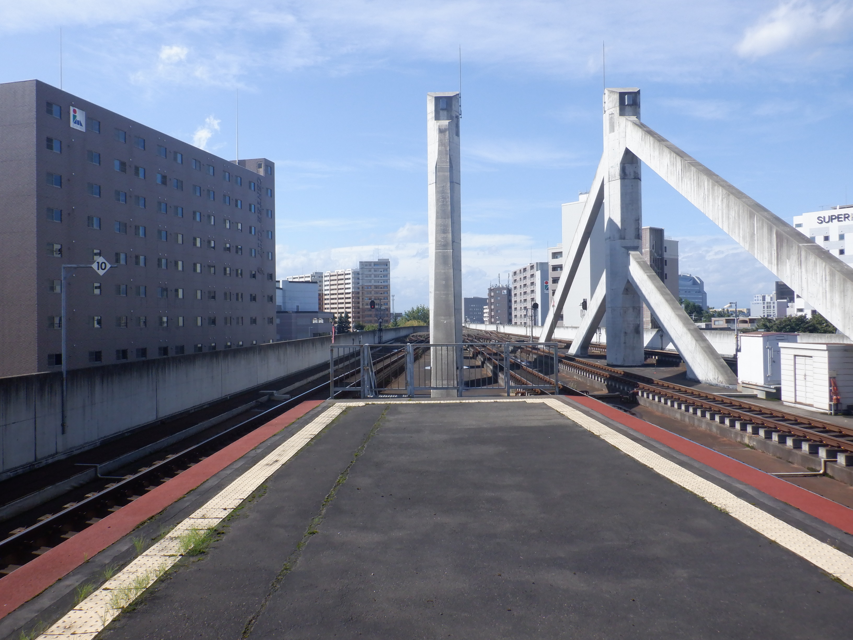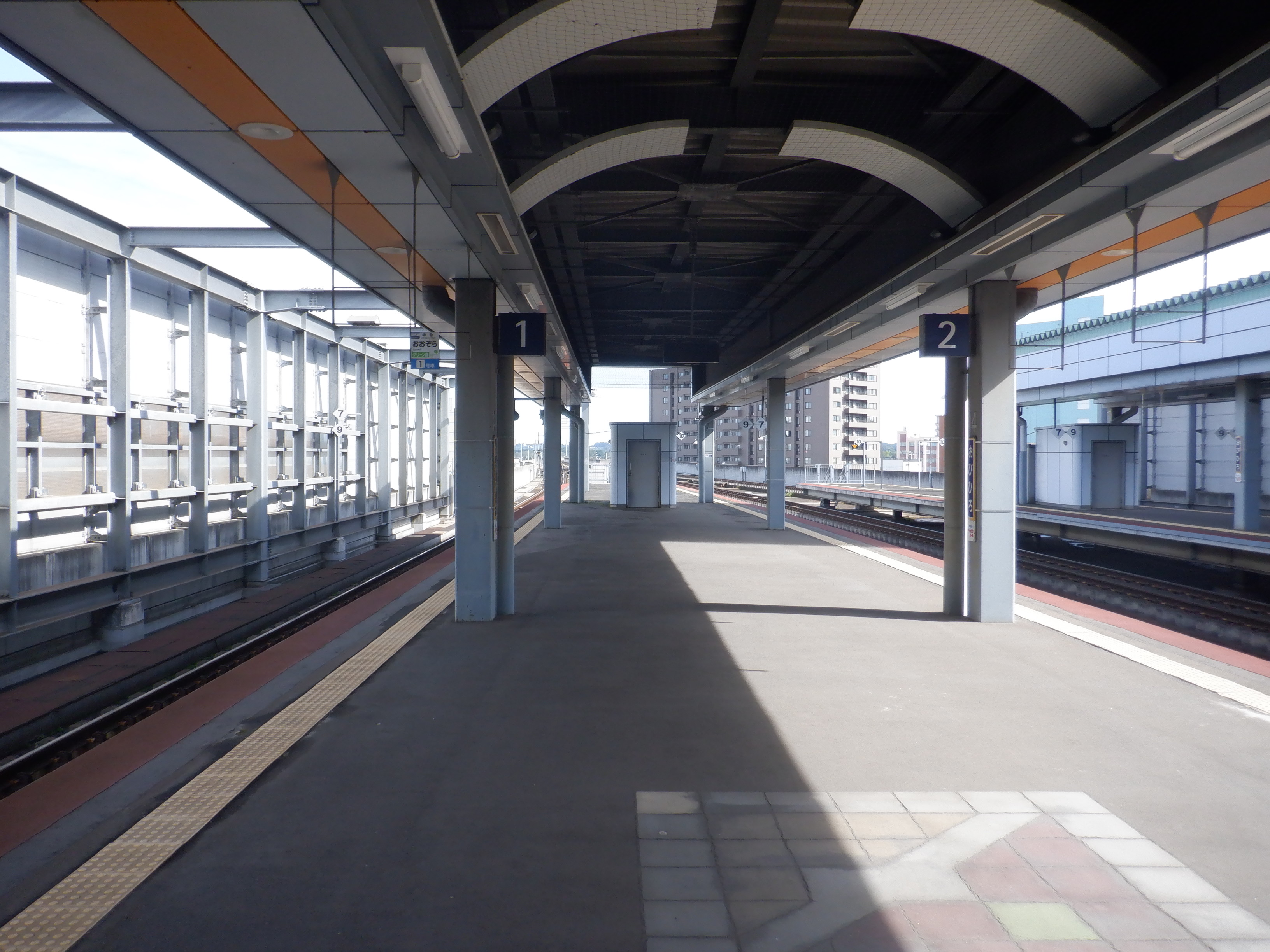 1・2番のりばと3・4番のりばそれぞれに改札がありますが、西通りと東通り、それぞれ両側を向いた出入口からの行き来をスムーズにし、両側から改札口に入っていけるように合理的な構造であることが分かります。現在は分岐する路線もなく、架線のないスッキリとした高架駅になっています。