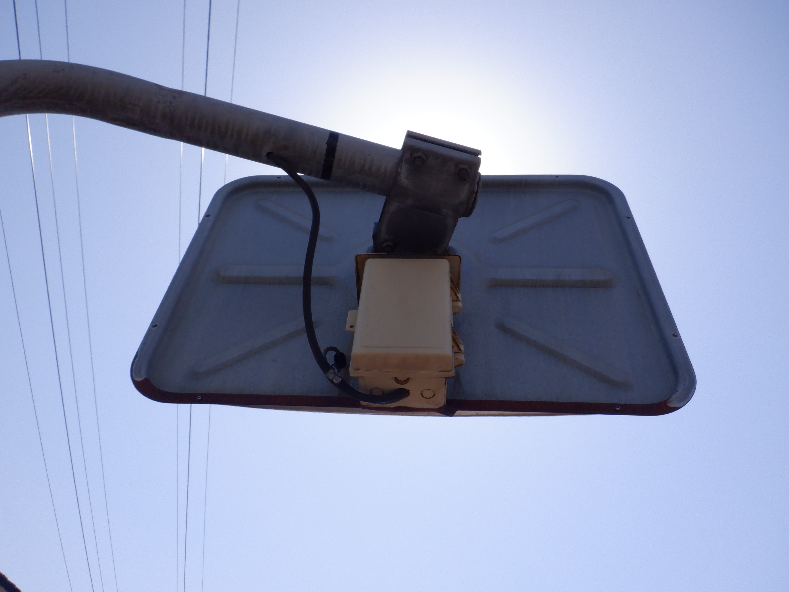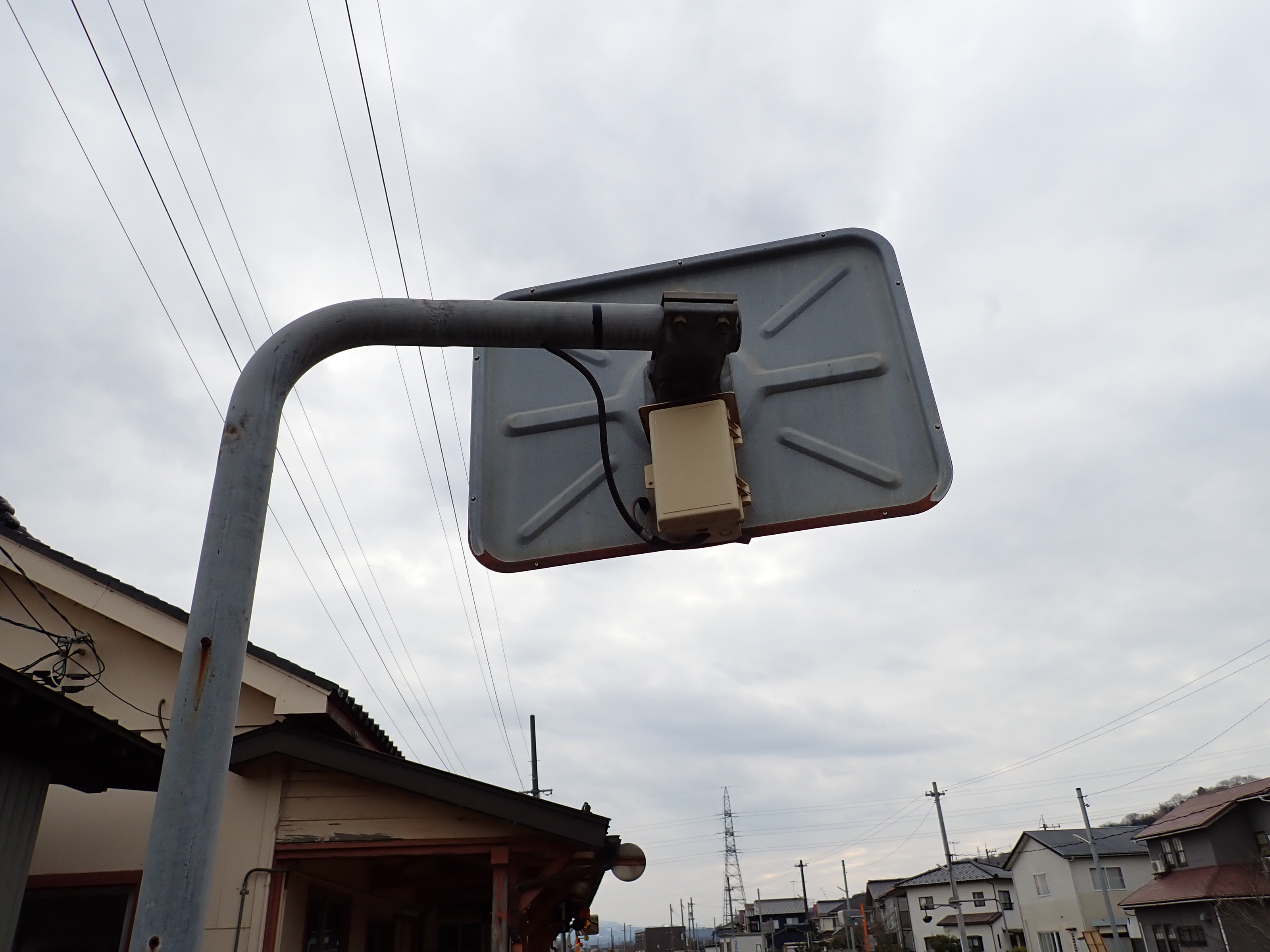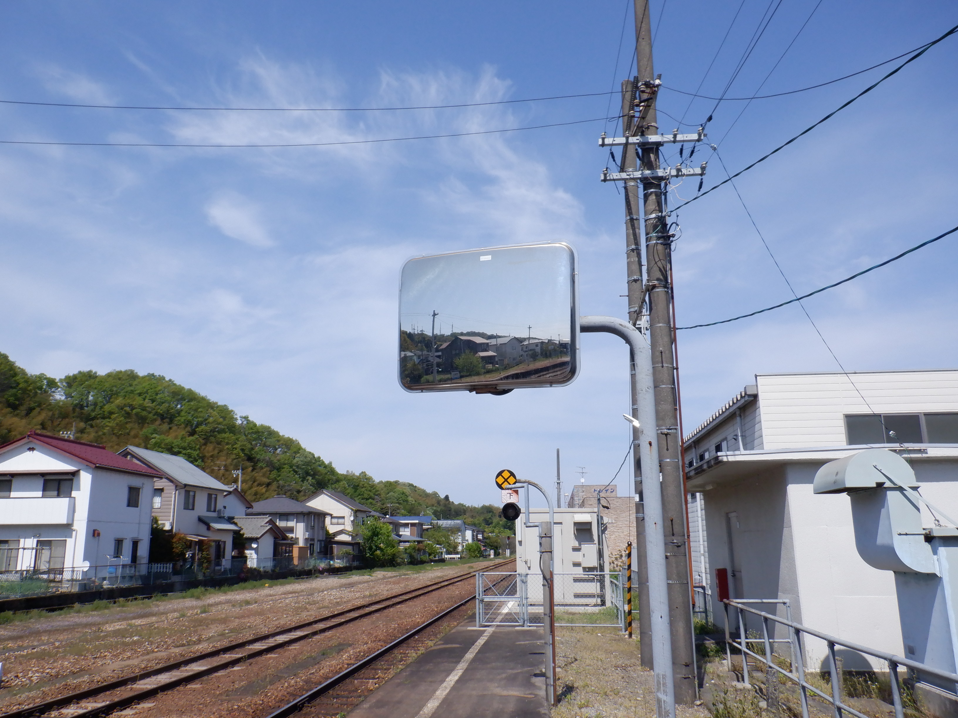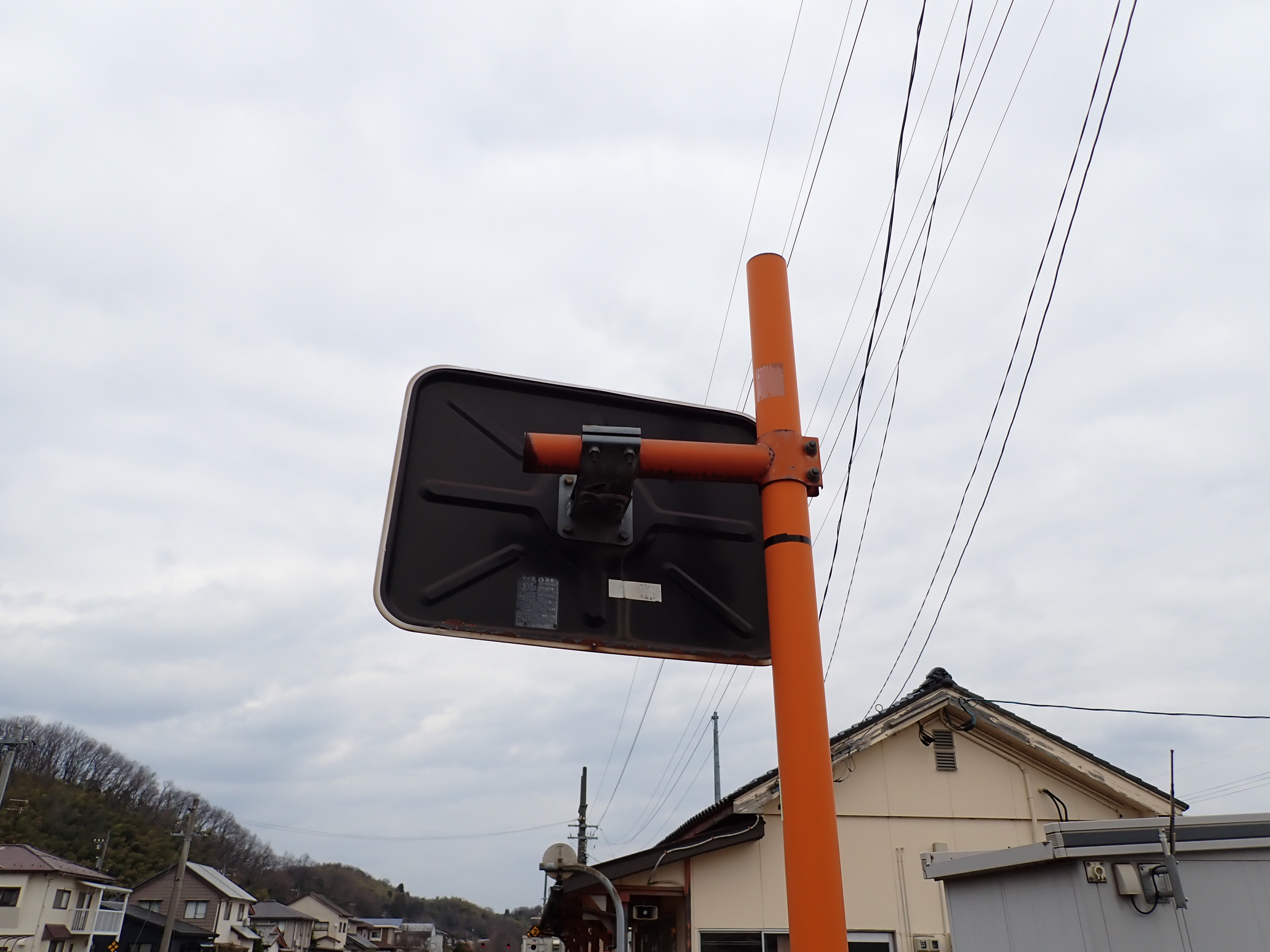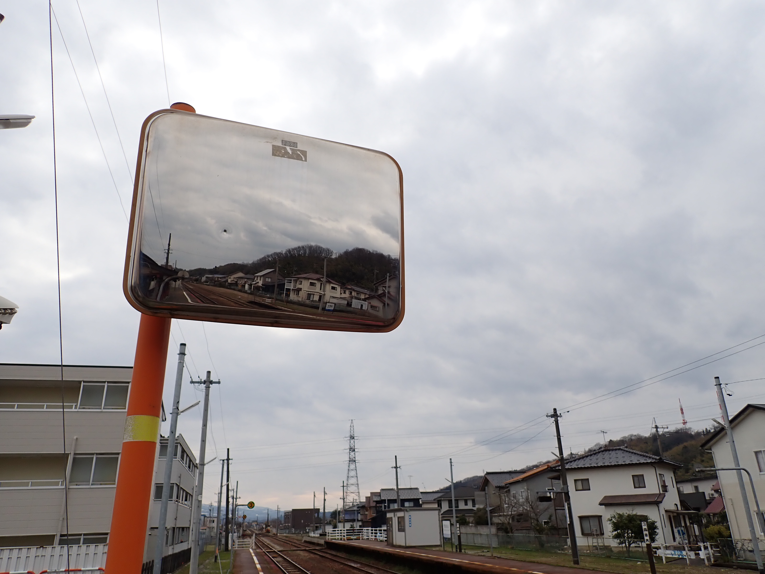 2番のりばのワンマンミラー。「くもらーず」のシールが劣化してきています。