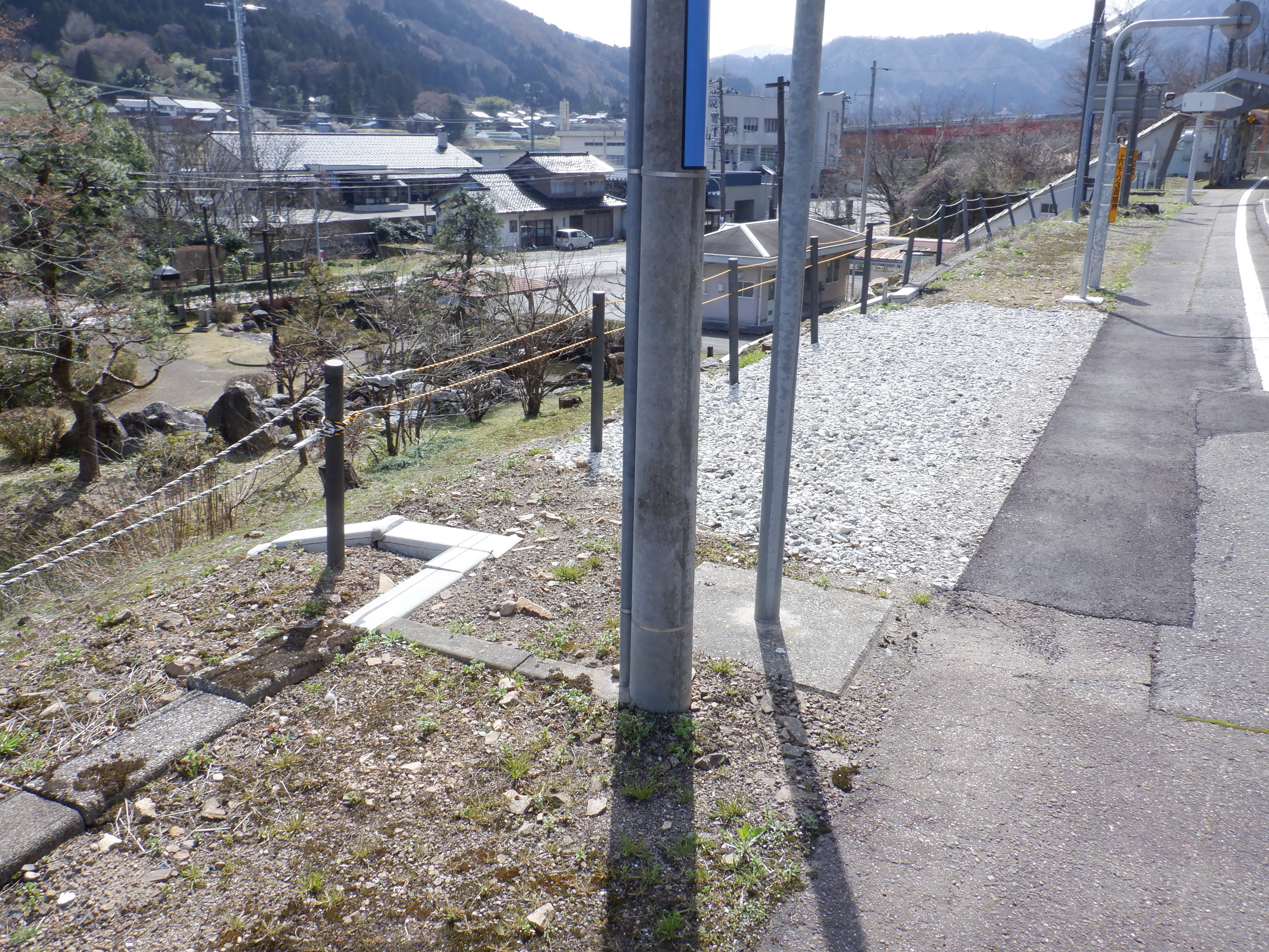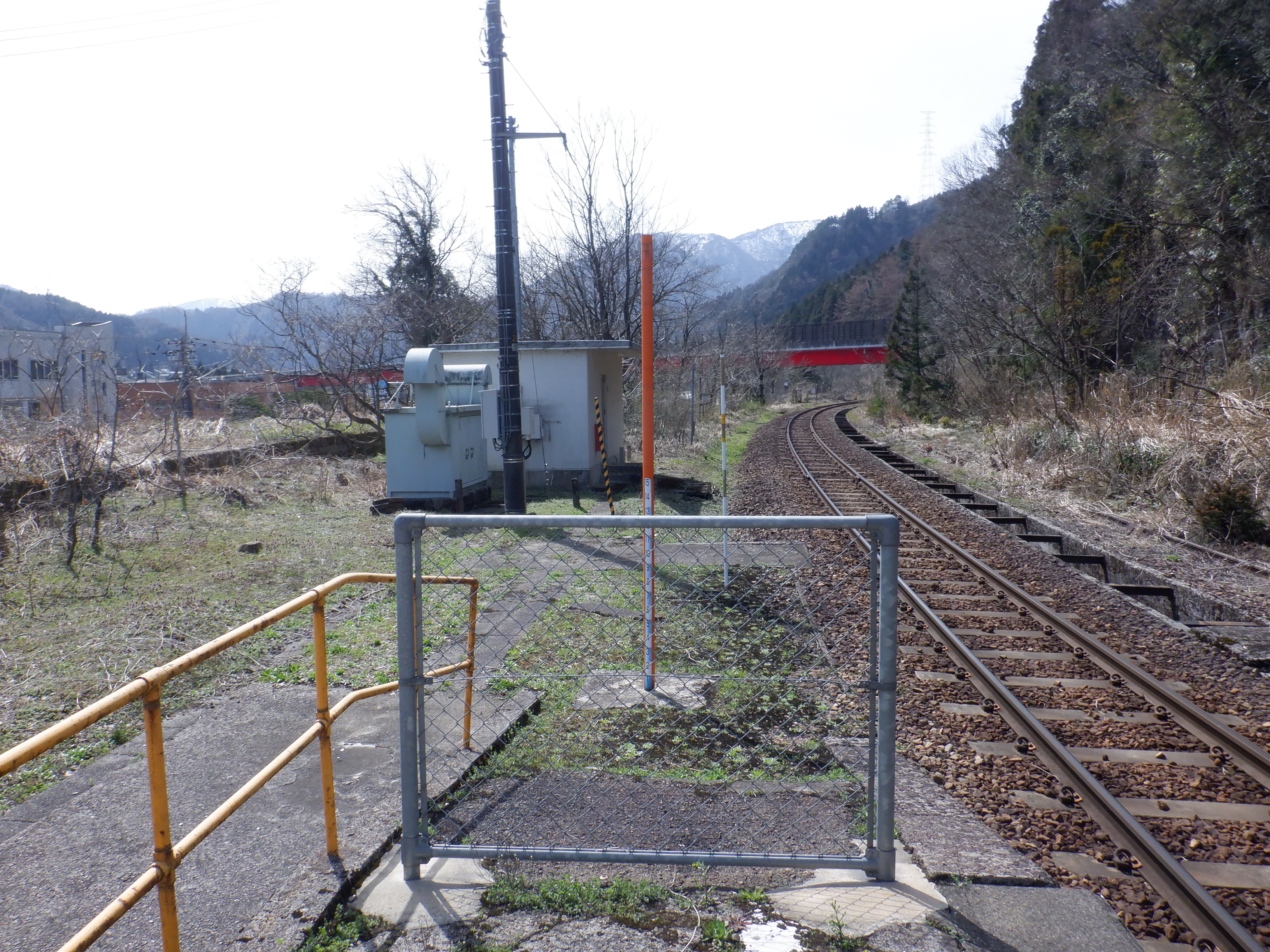 猪谷駅側の柵の向こうにかつてあったワンマンミラーは、支柱を残して撤去されていました。