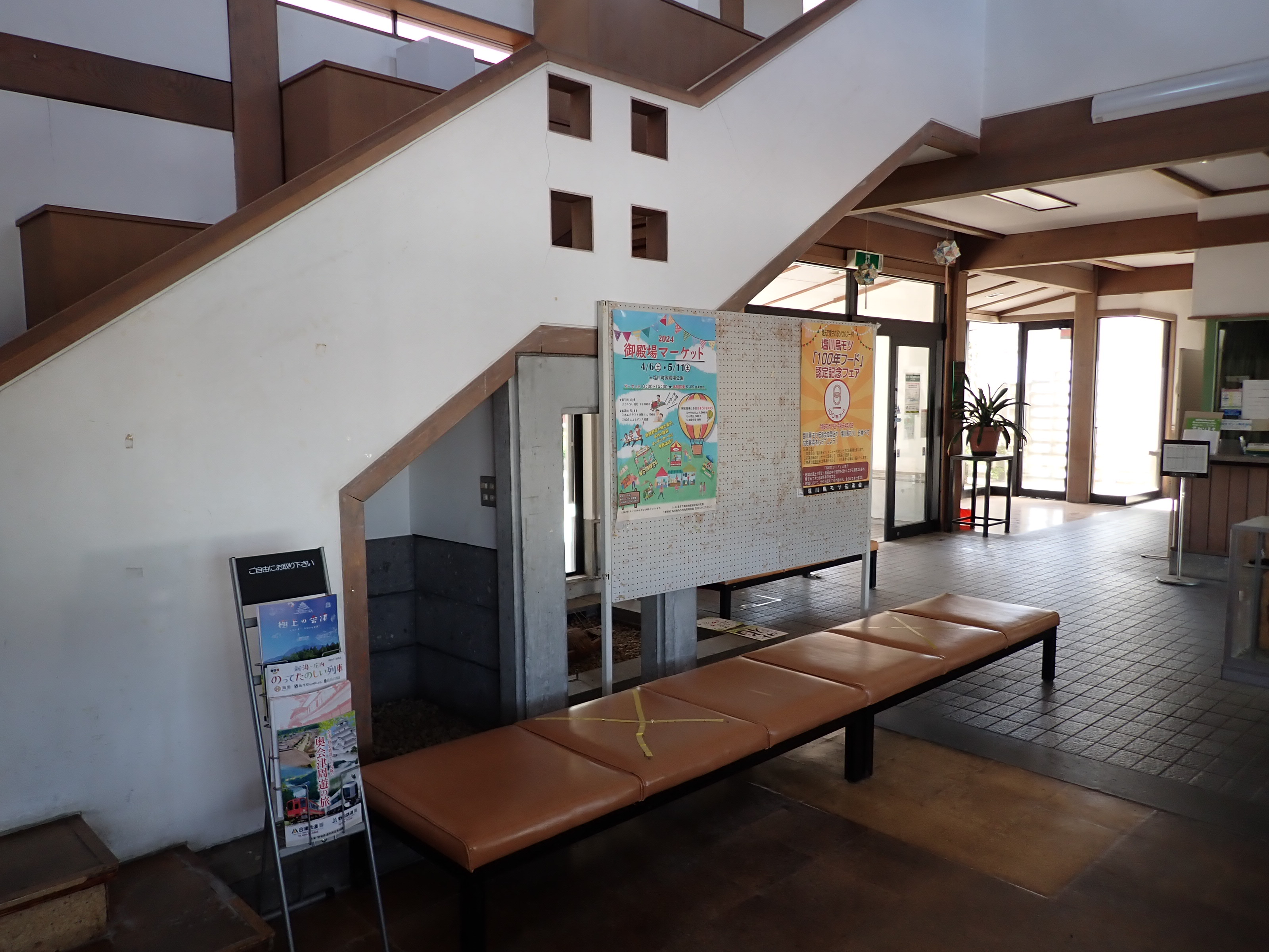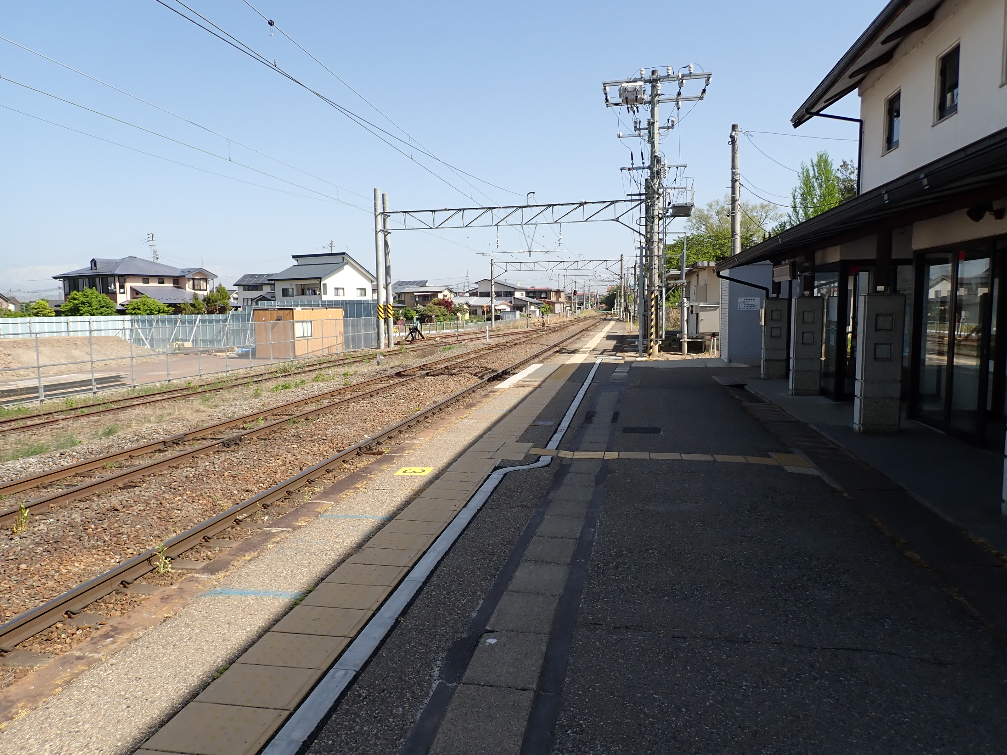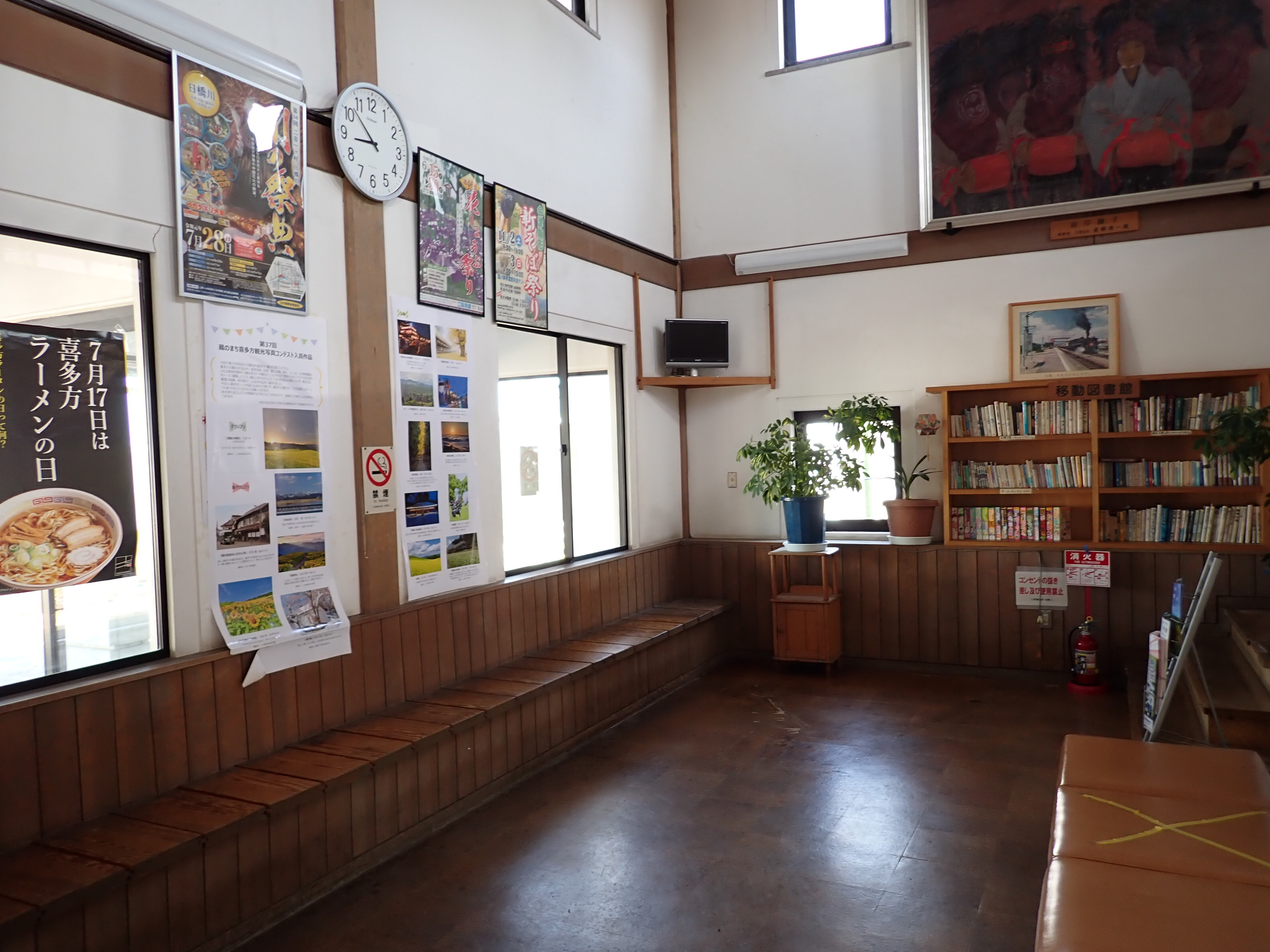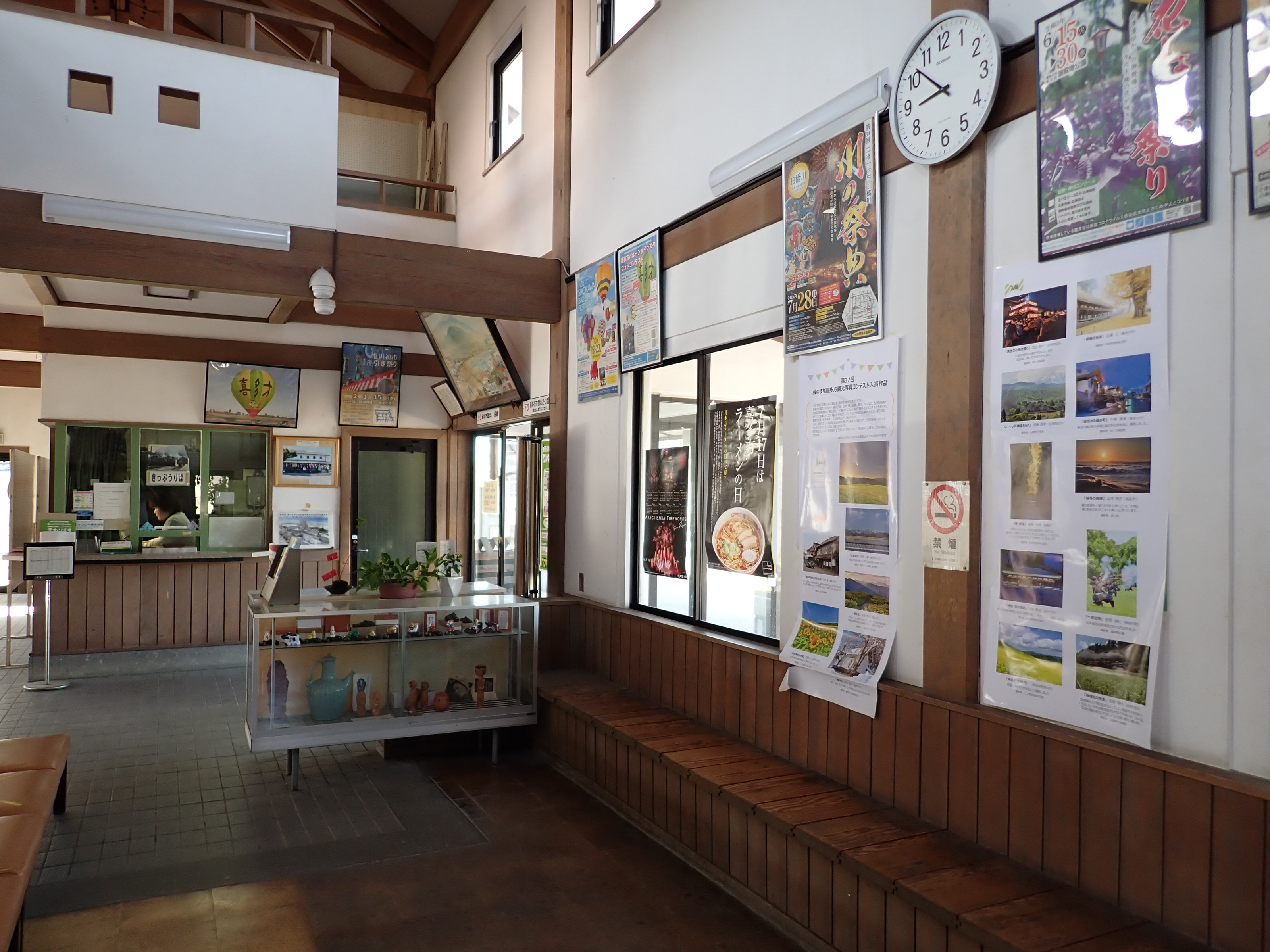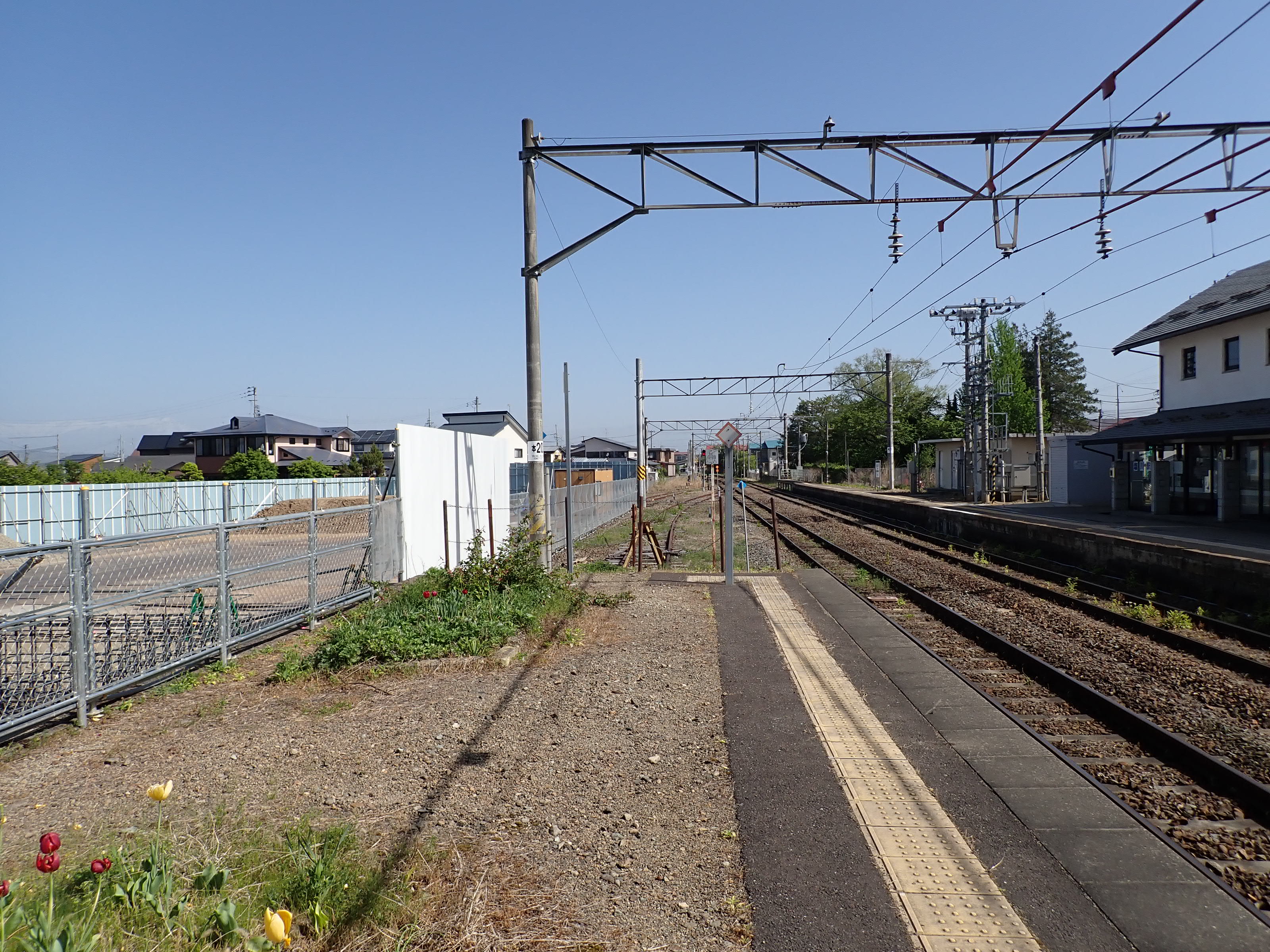 周辺の駅が極端に停車本数が少ない中にあって、喜多方と会津若松の間ではこの駅だけは全ての普通列車が停車します。駅から少し進むと古い町並みが続いています。2024年・2025年現在、駅舎と反対側との間の自由通路を建設中です。