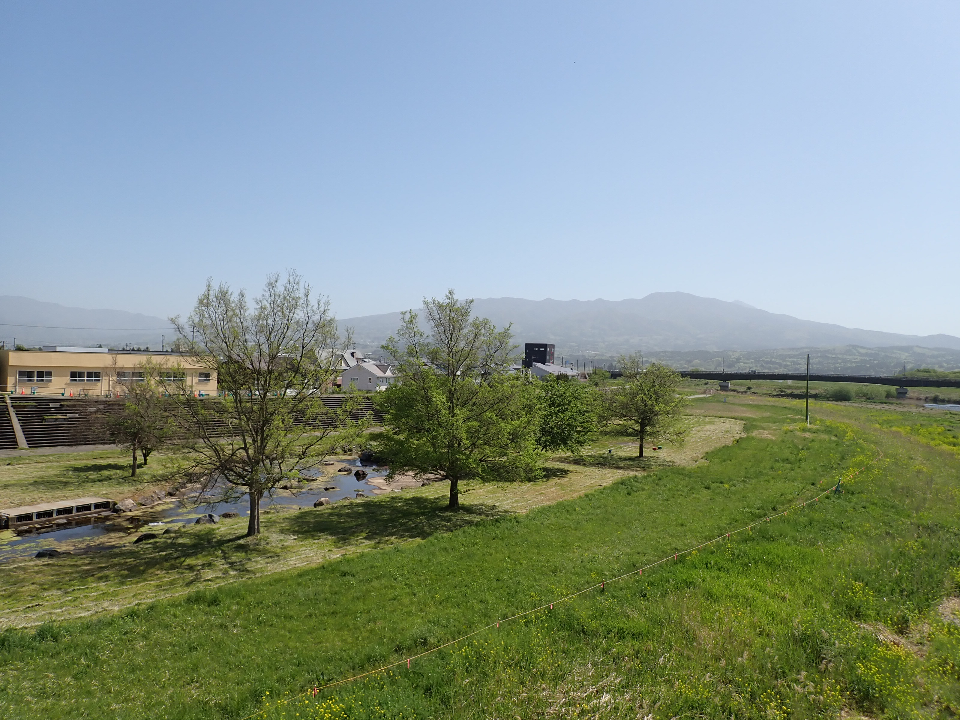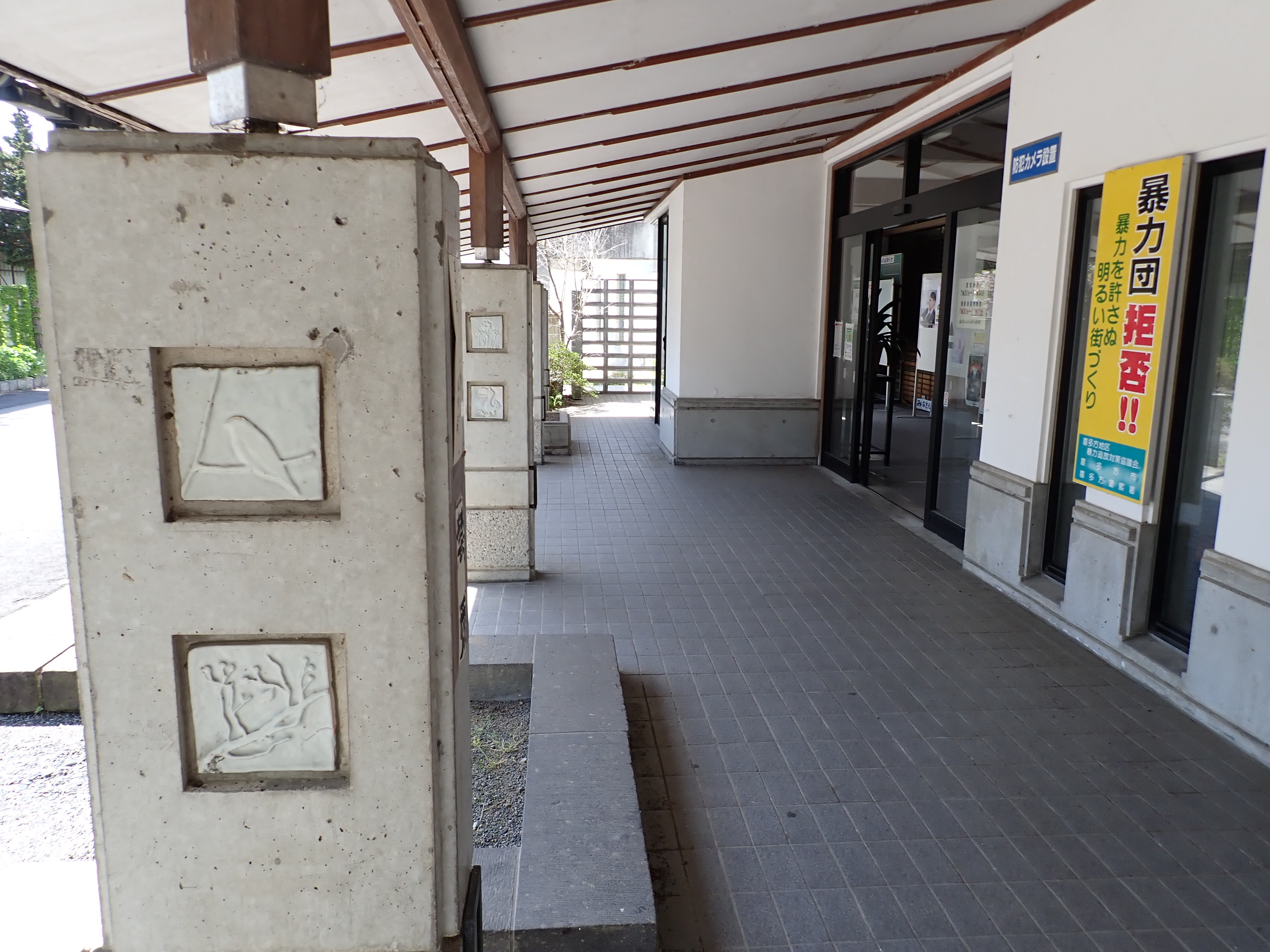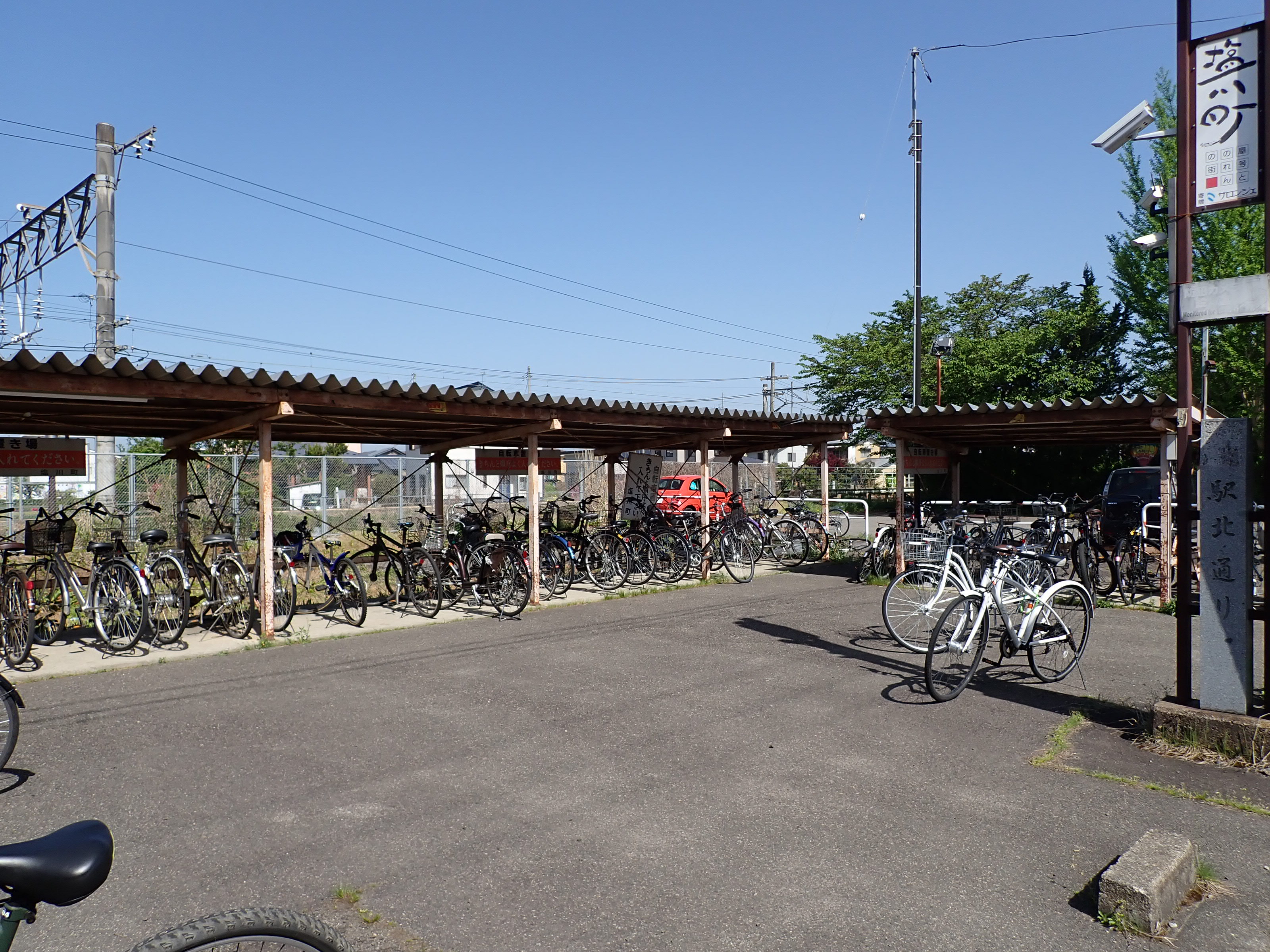 駐輪場には塩川町の表示があり、その下に喜多方市という字が見えます。