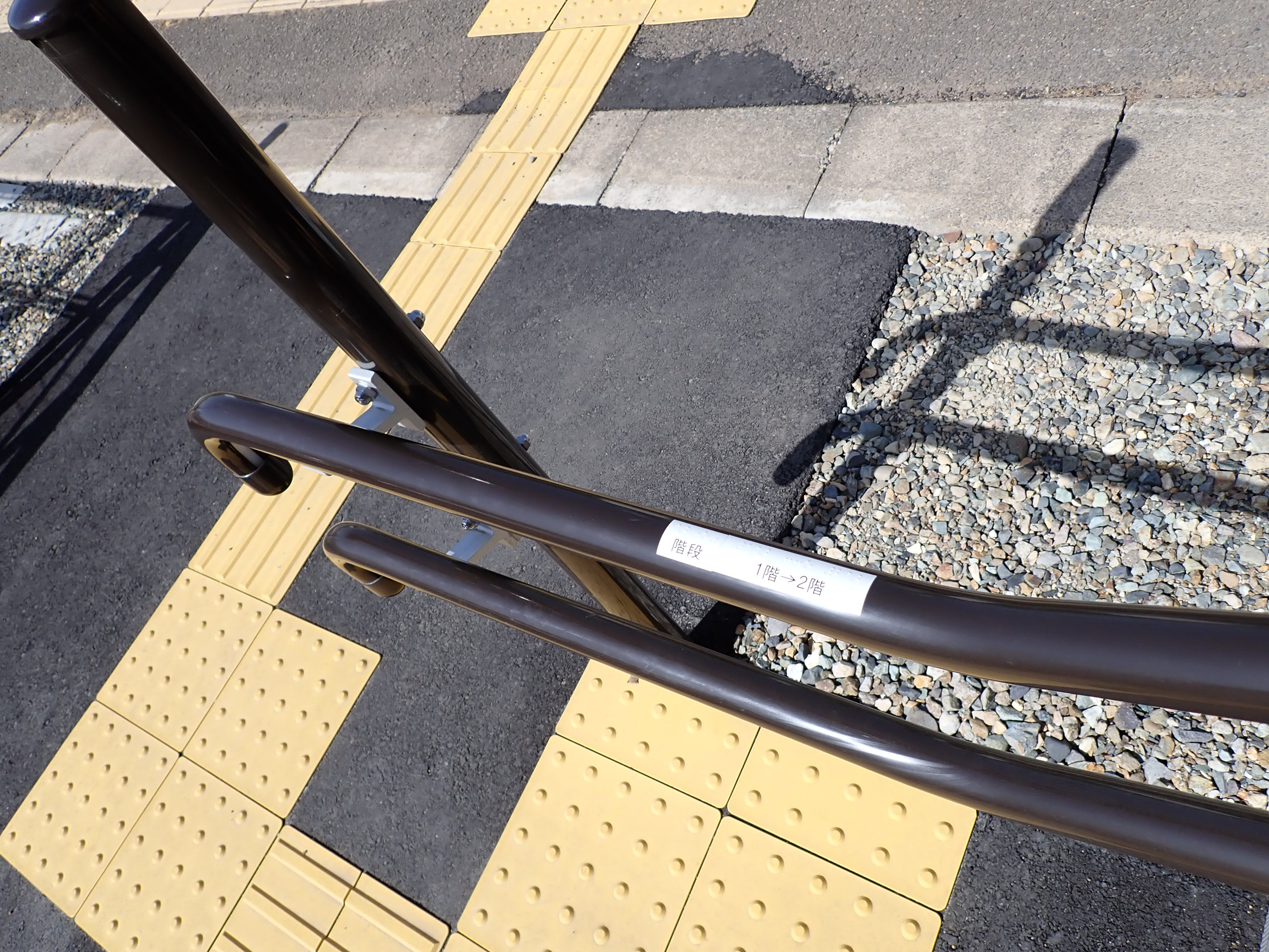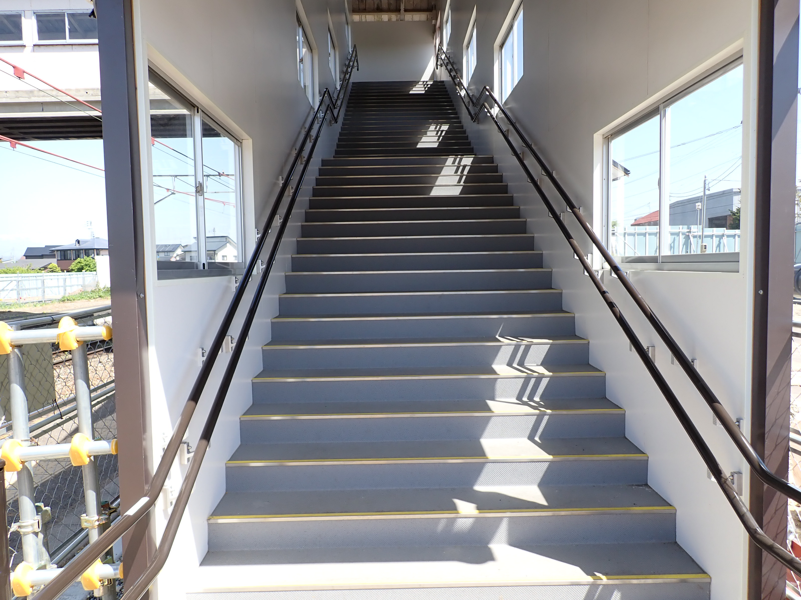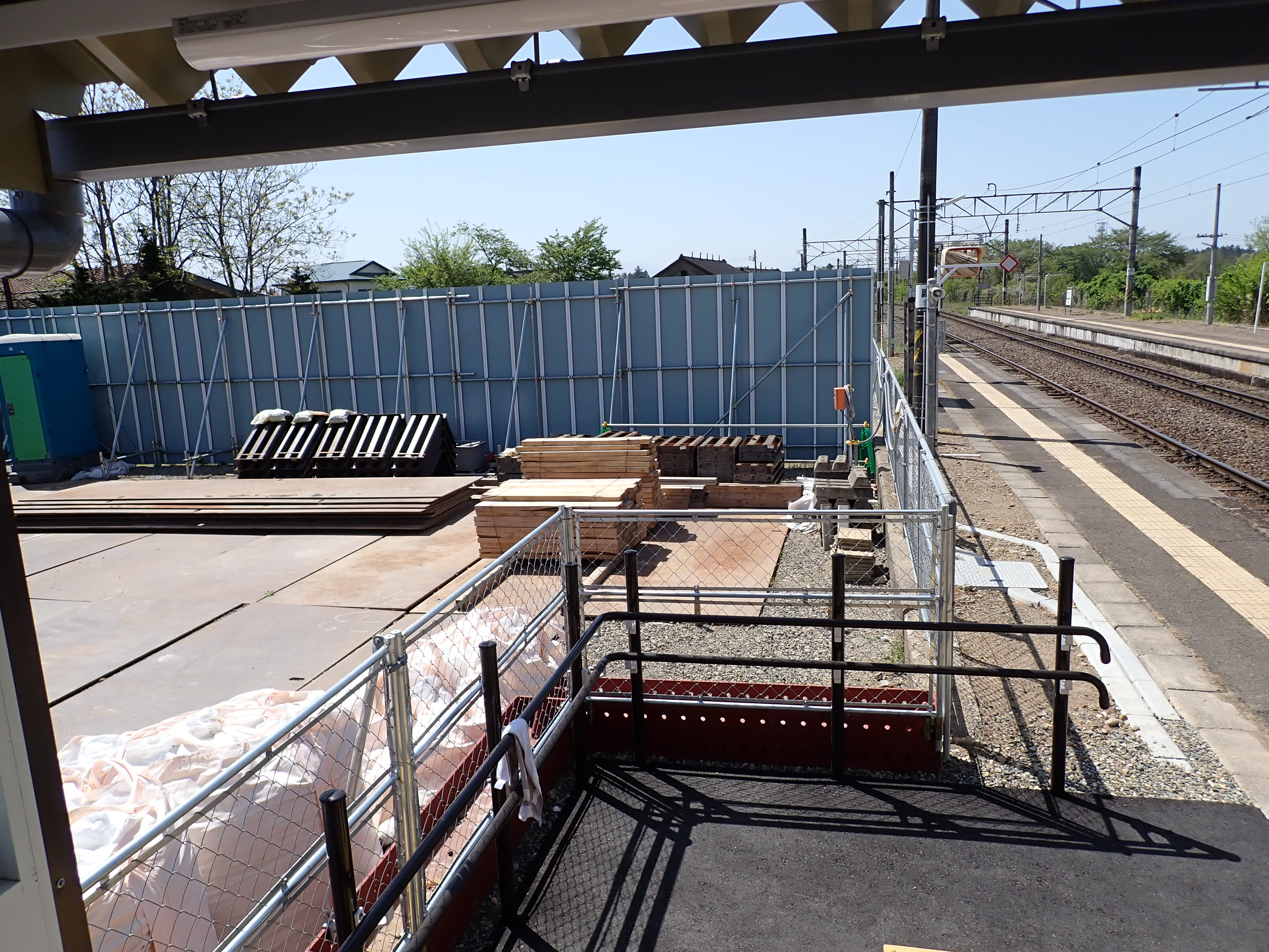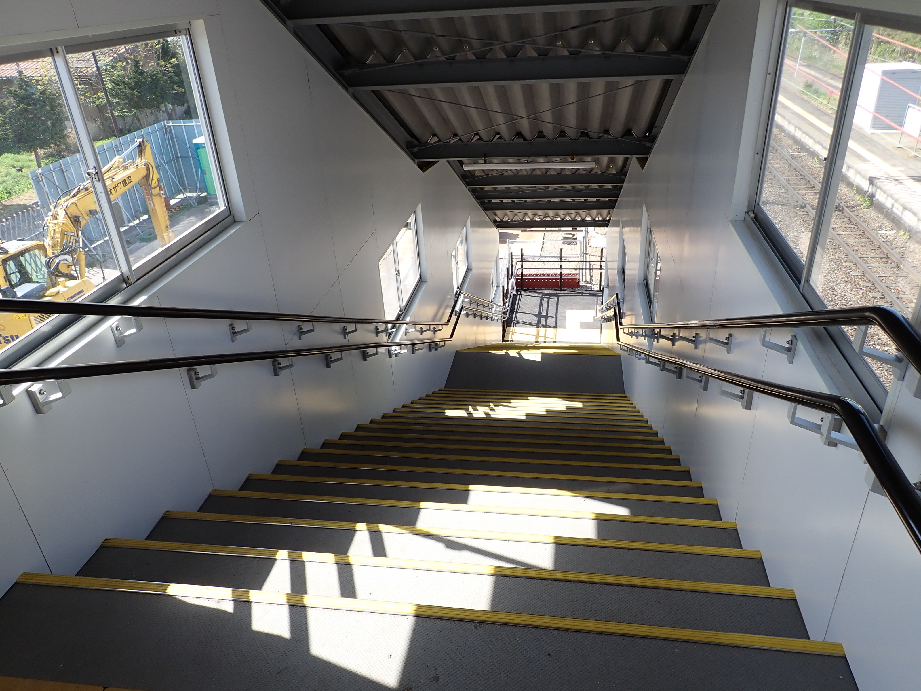 跨線橋階段の1番線側。おそらく従来の階段と反対側に作ったようで、仮設の新しいものになっています。