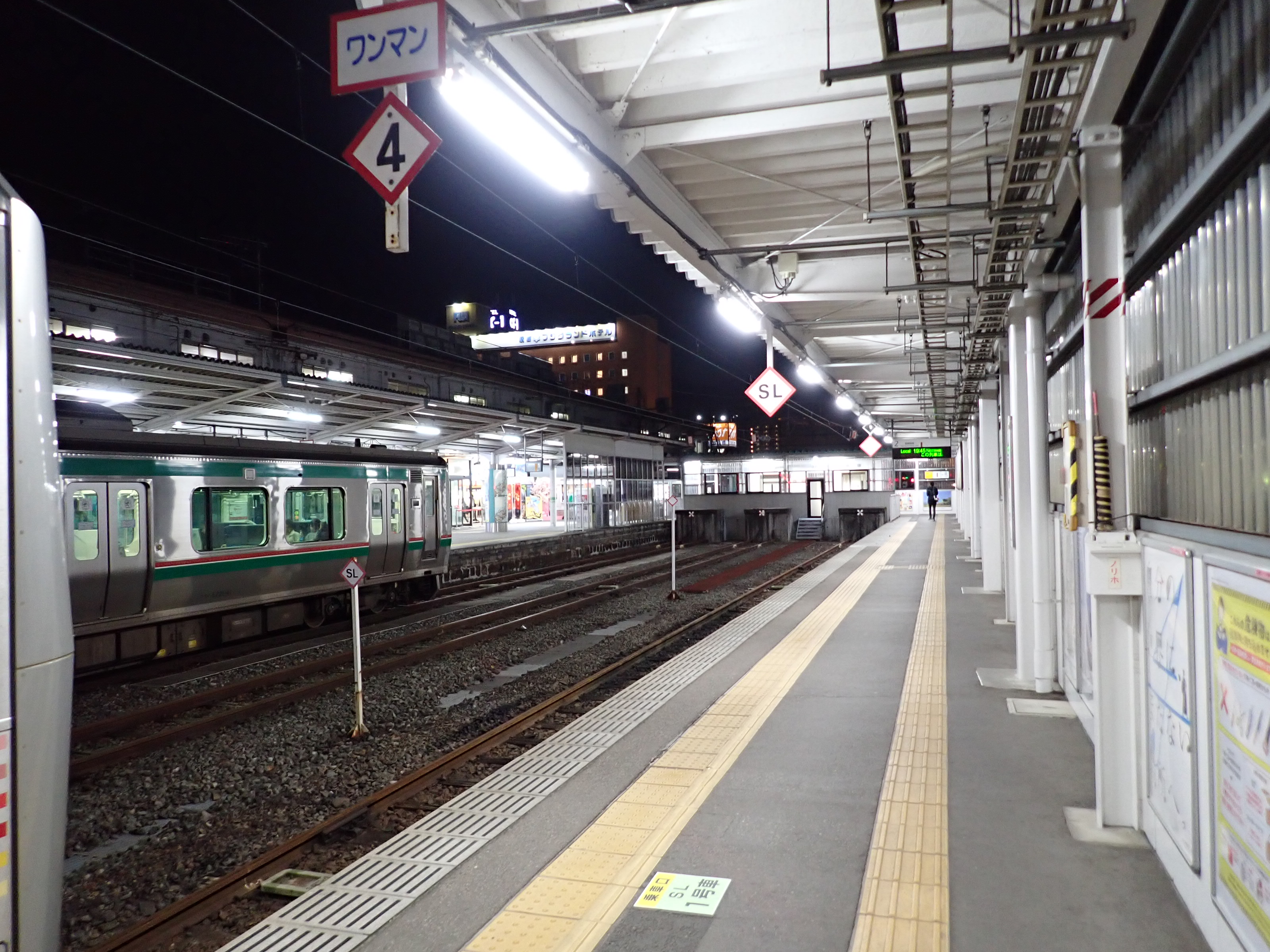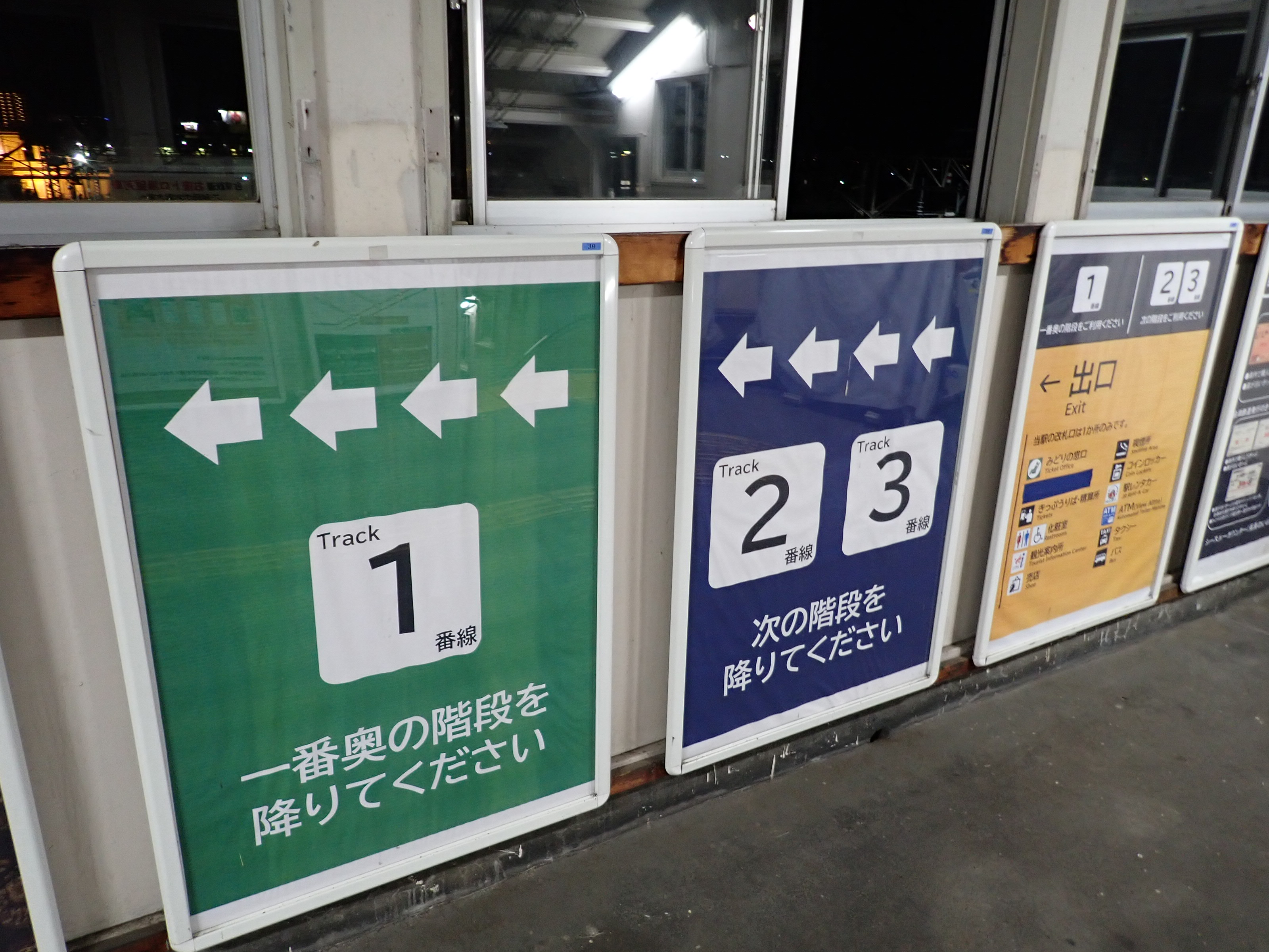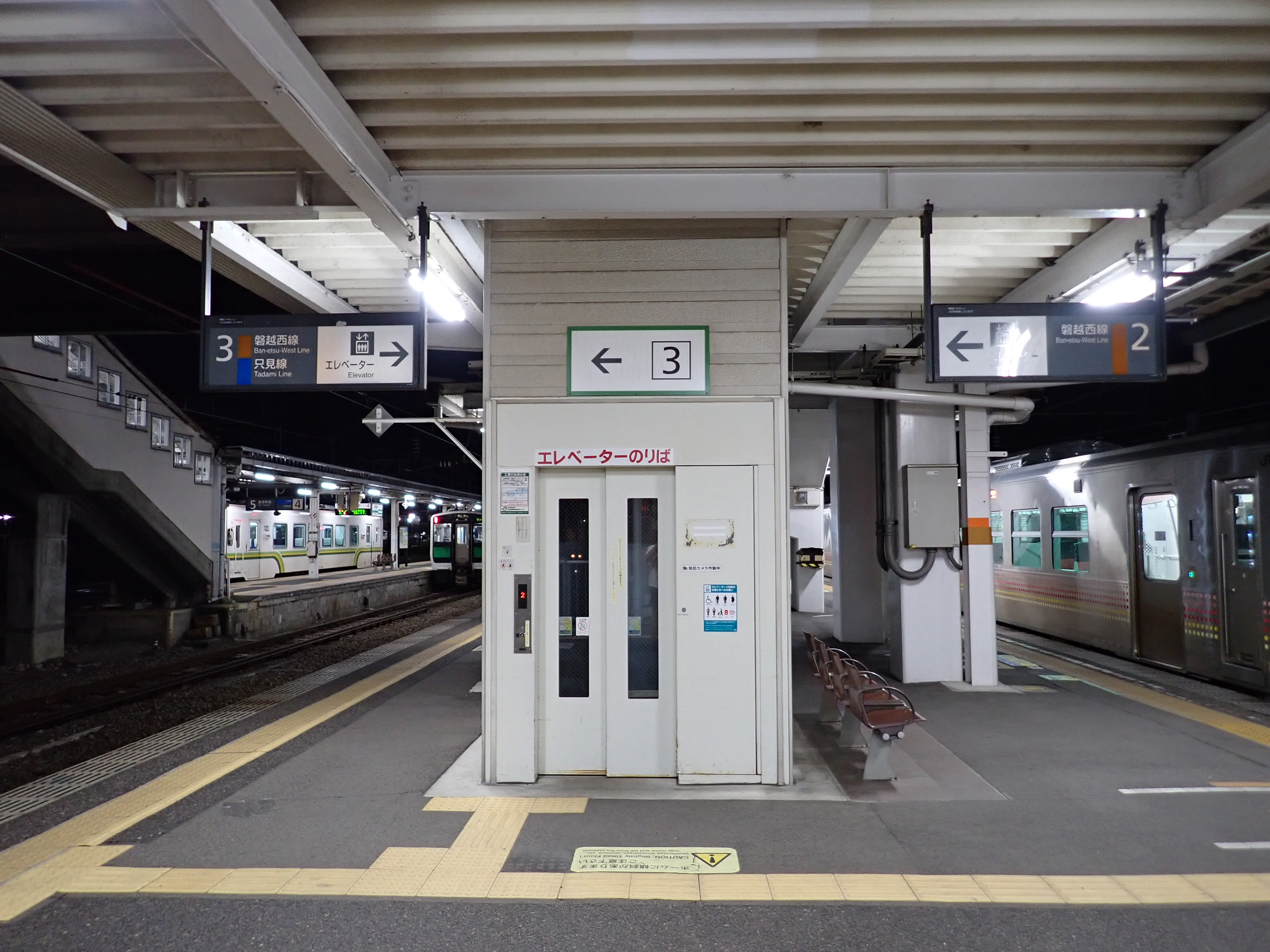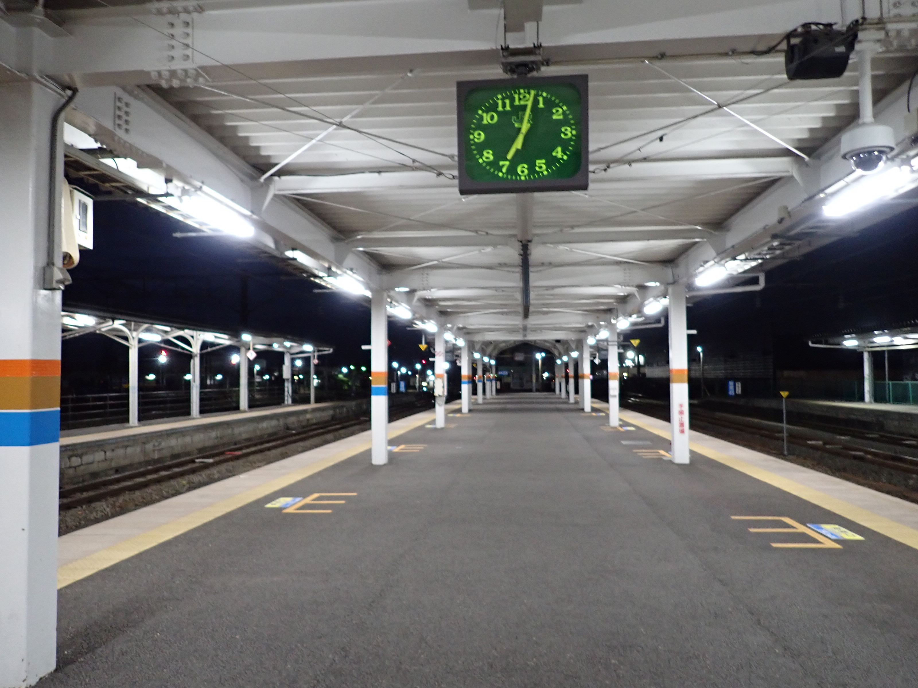 2・3番線を階段から見おろしたところ(日没後)。