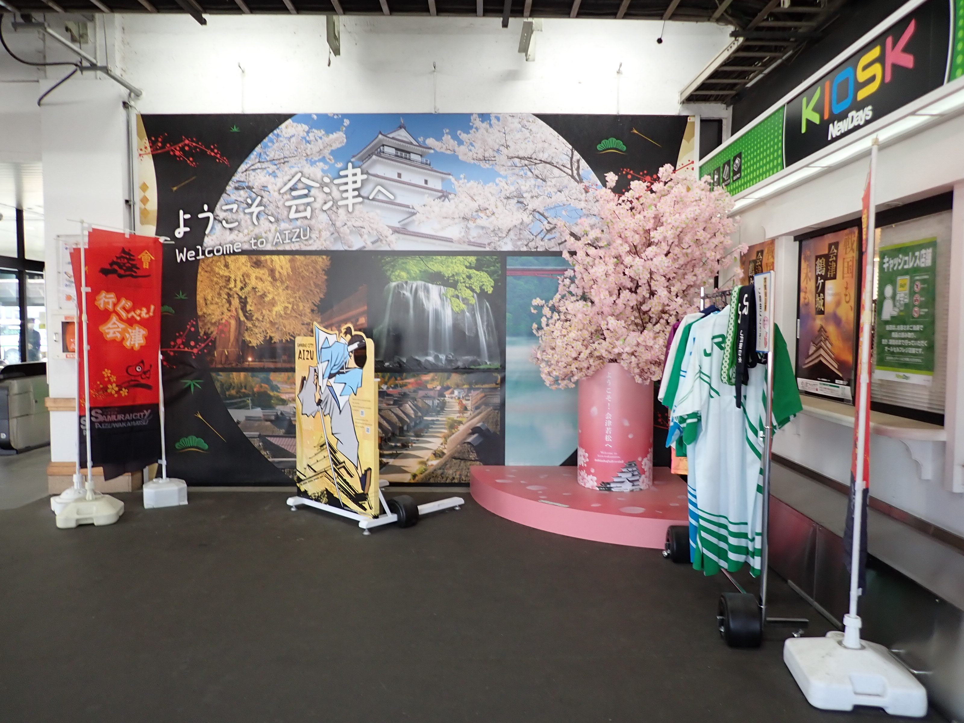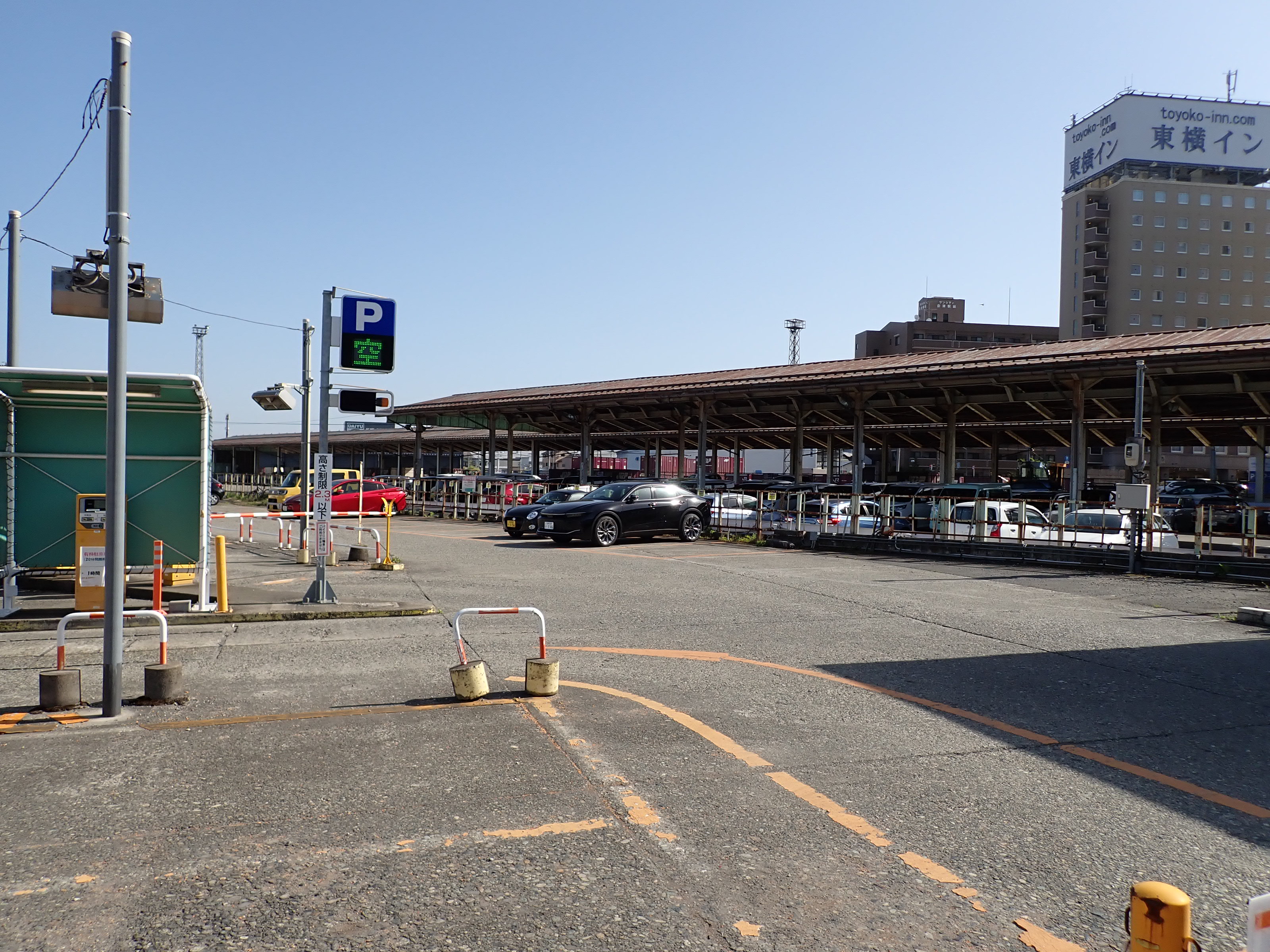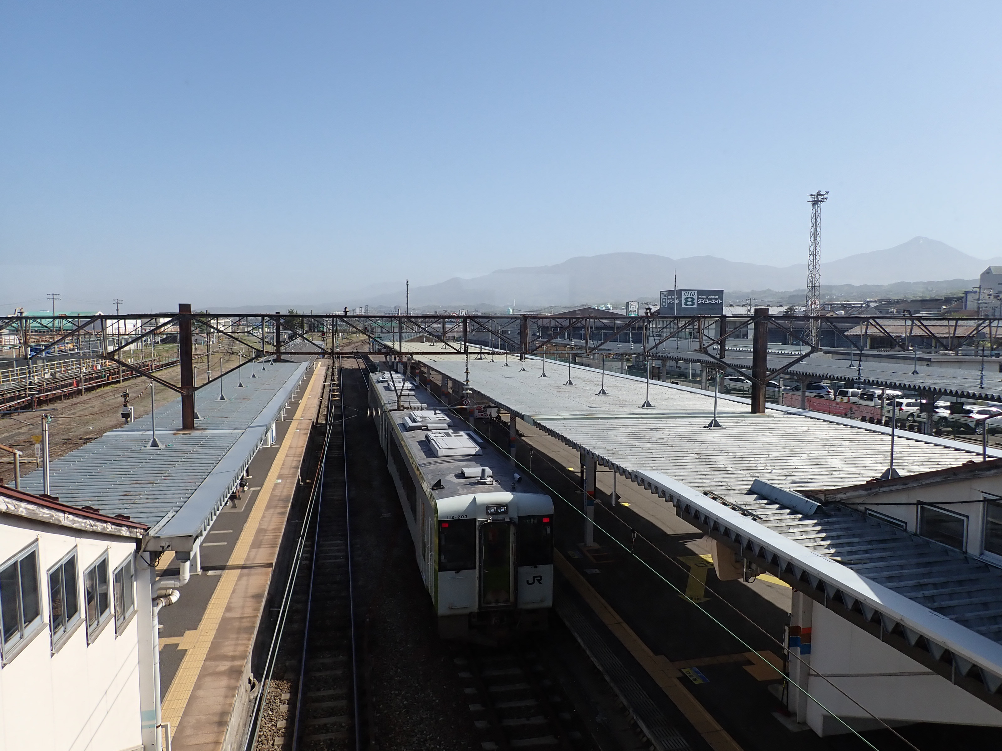 磐越西線はこの駅で進む方向が変わり、1・2番線は頭端式になっています。その逆側に只見線が進んで行きます。駅前にある貨物のオフレールステーション・駐車場の上屋が印象的です。