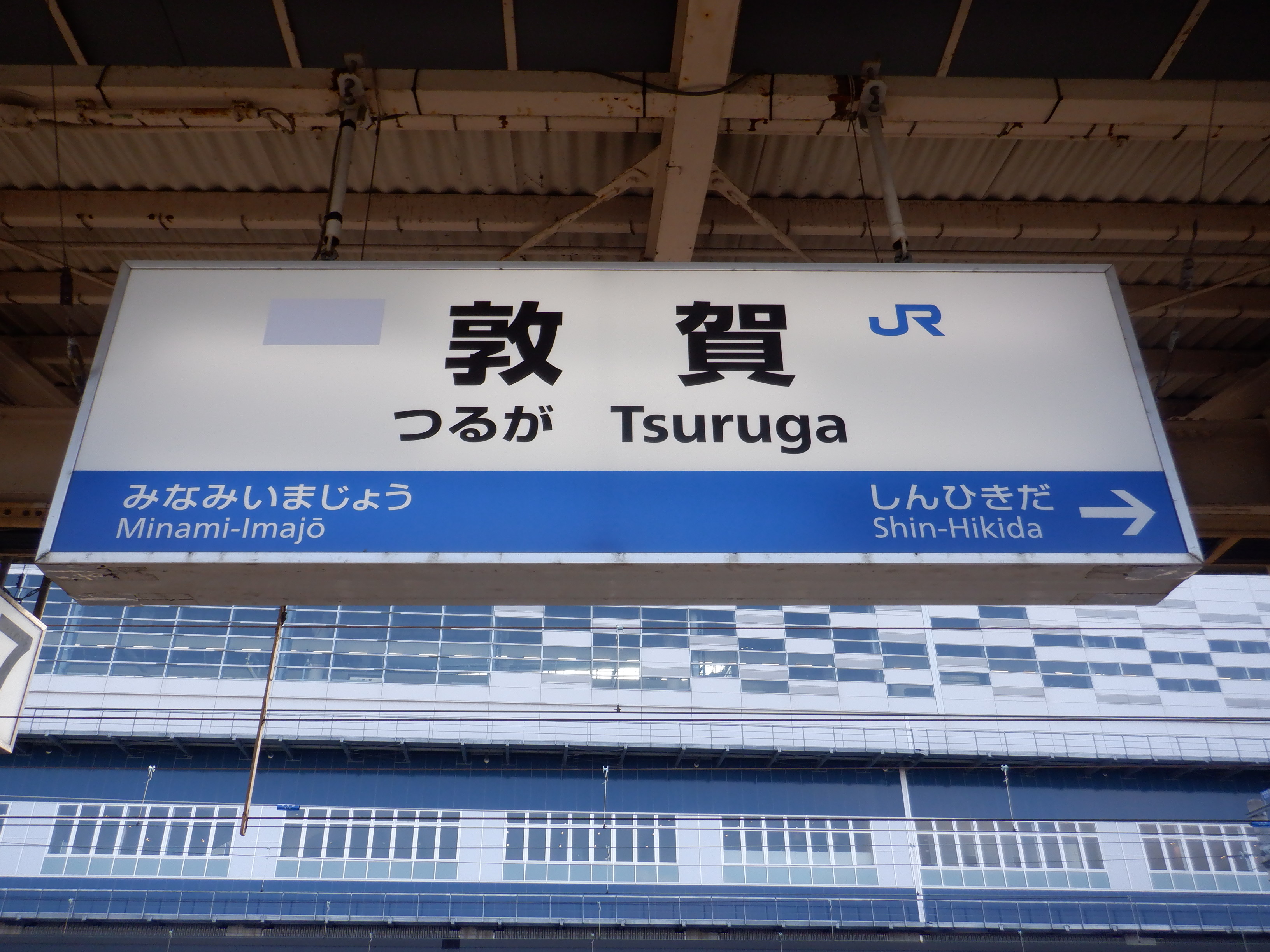 6・7番の駅名標の一つ。JRロゴが新疋田側に配置され、ハピラインのロゴがシールで隠されています。