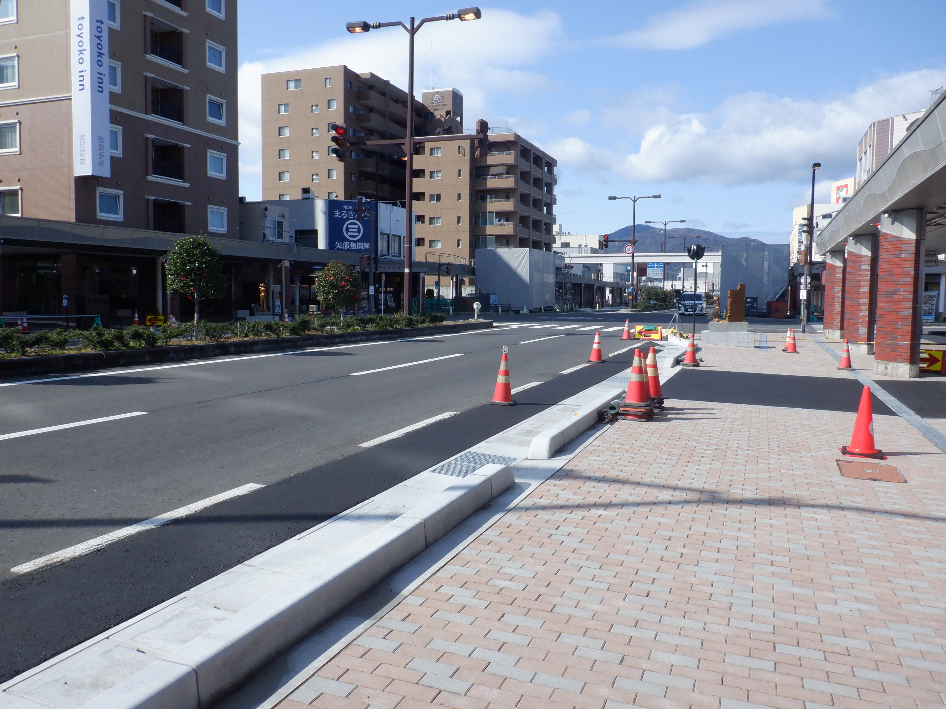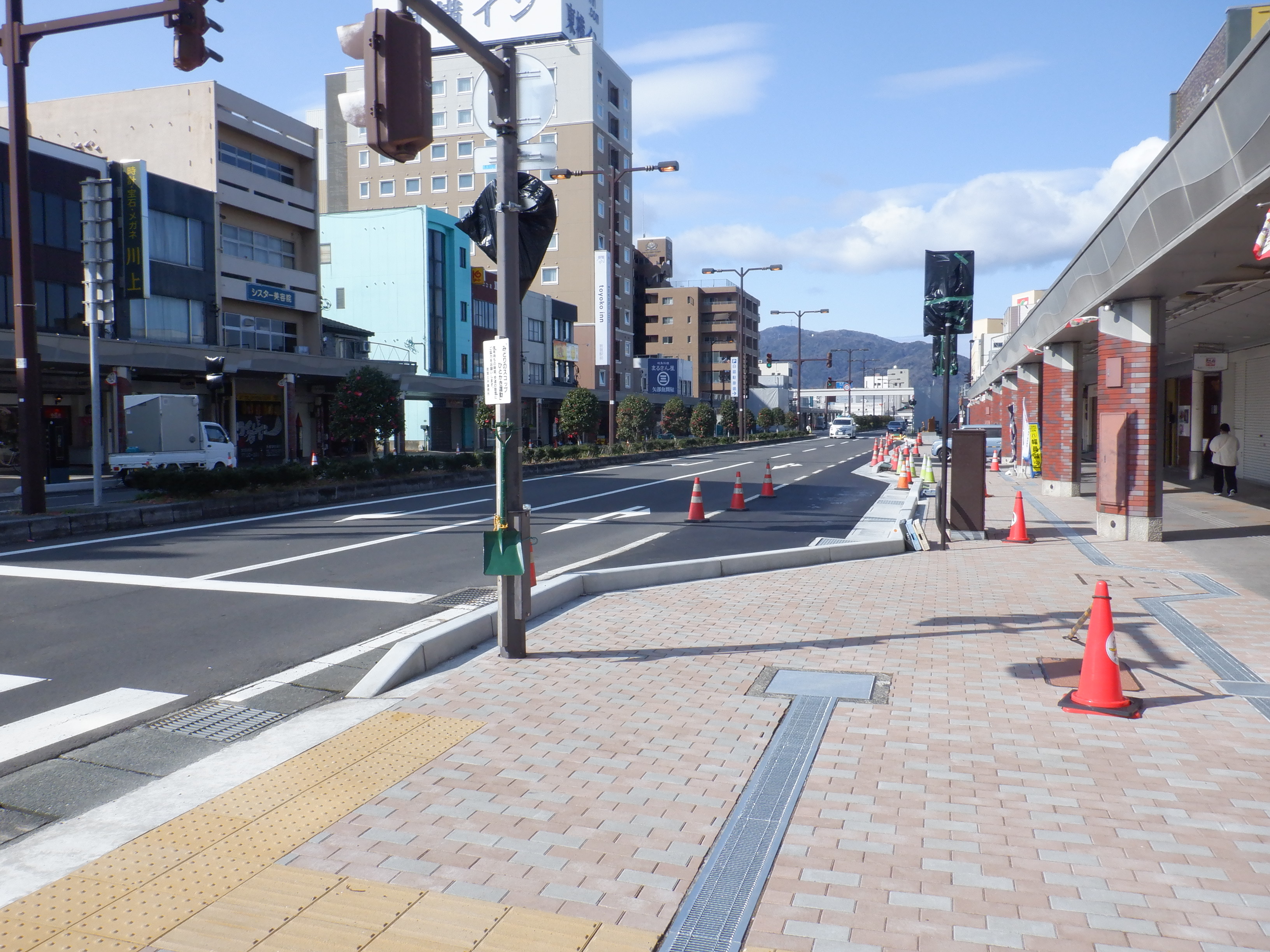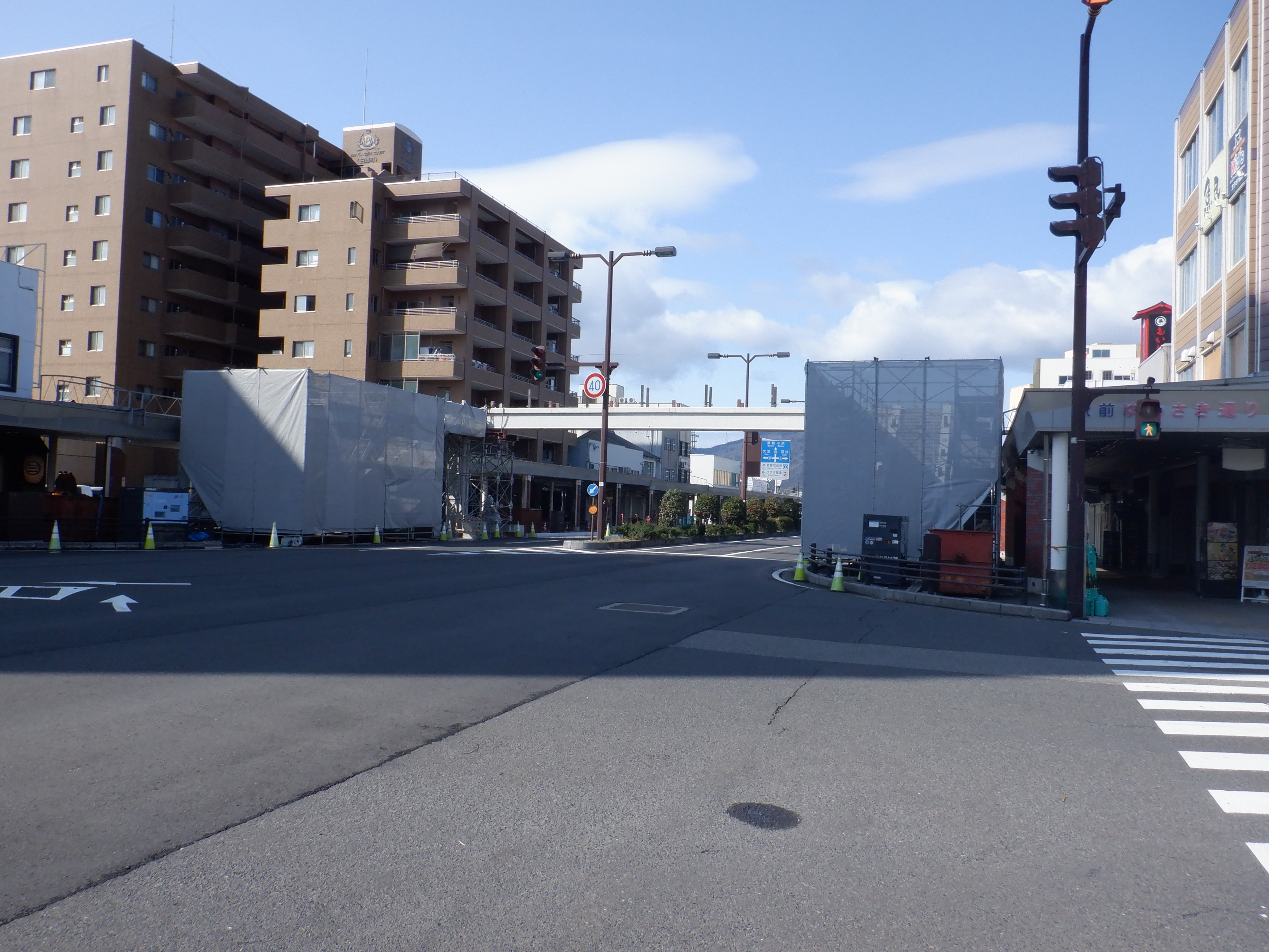 駅前の通りの工事の様子。歩道橋の撤去も進んでいます。
