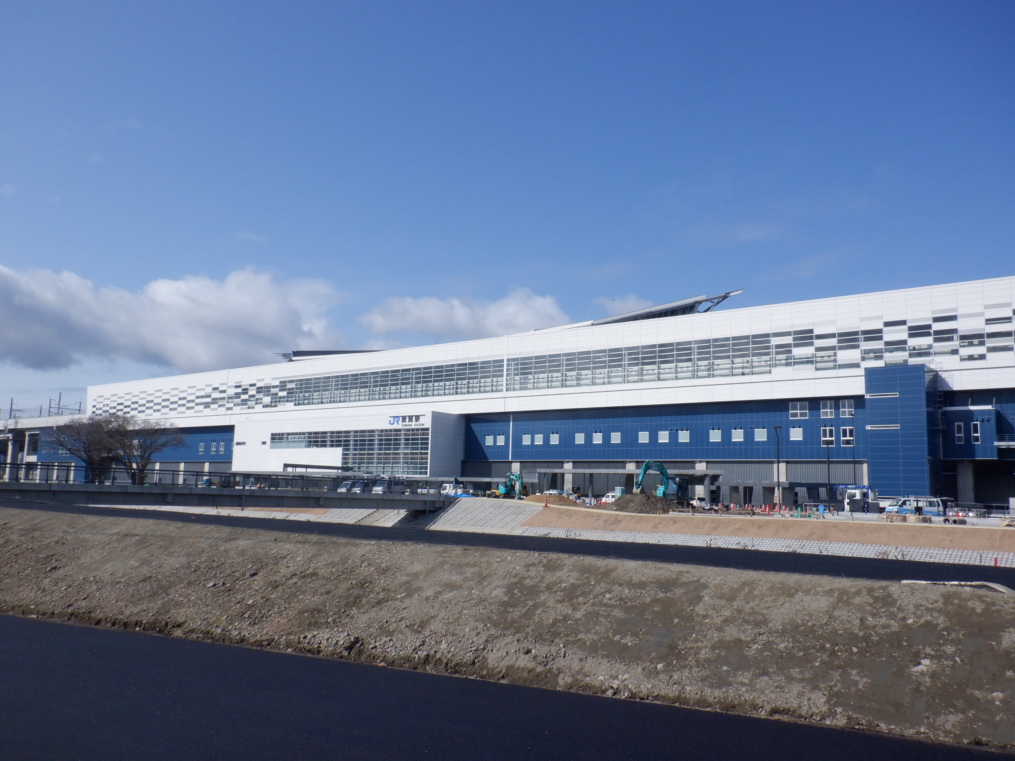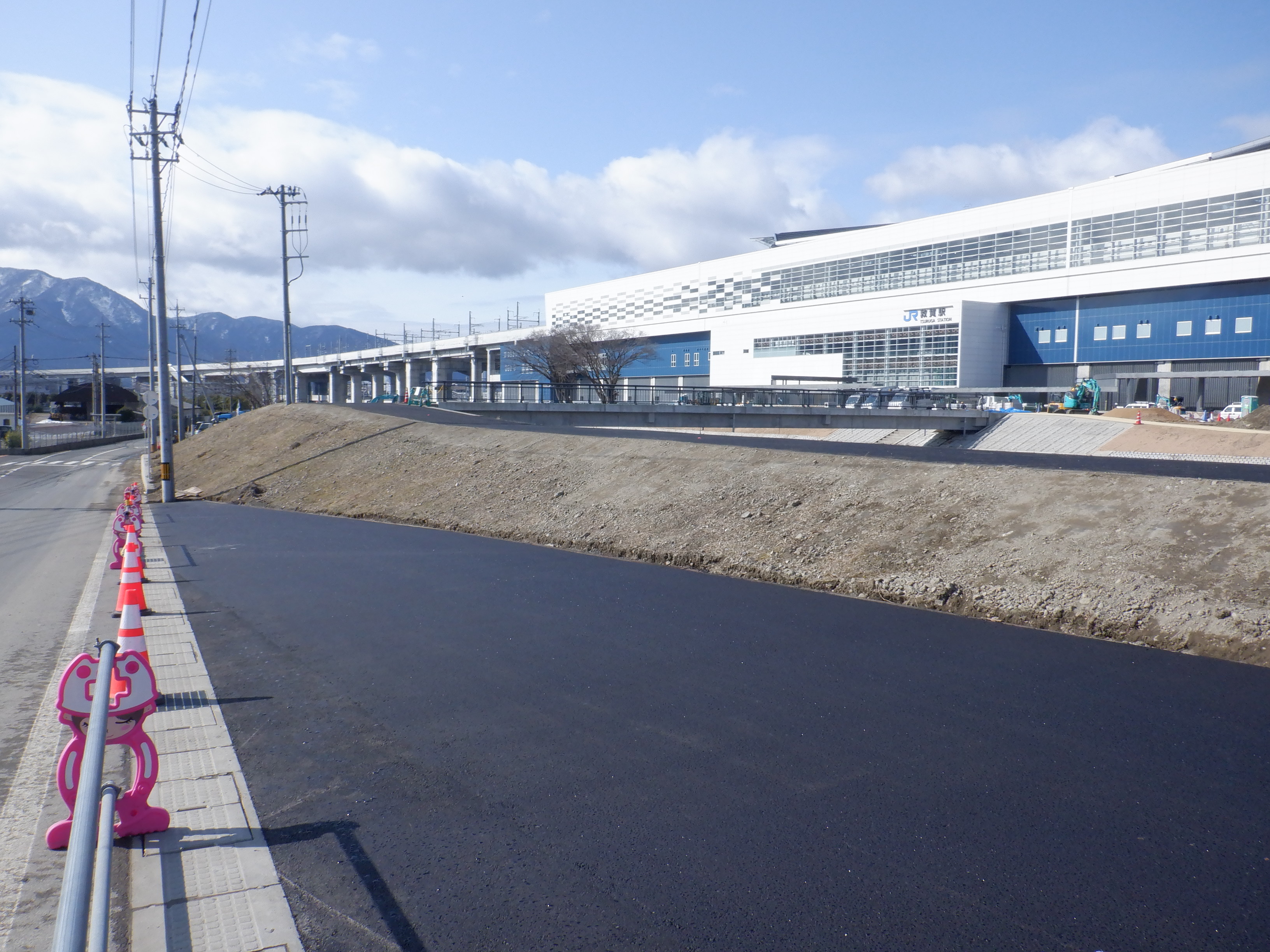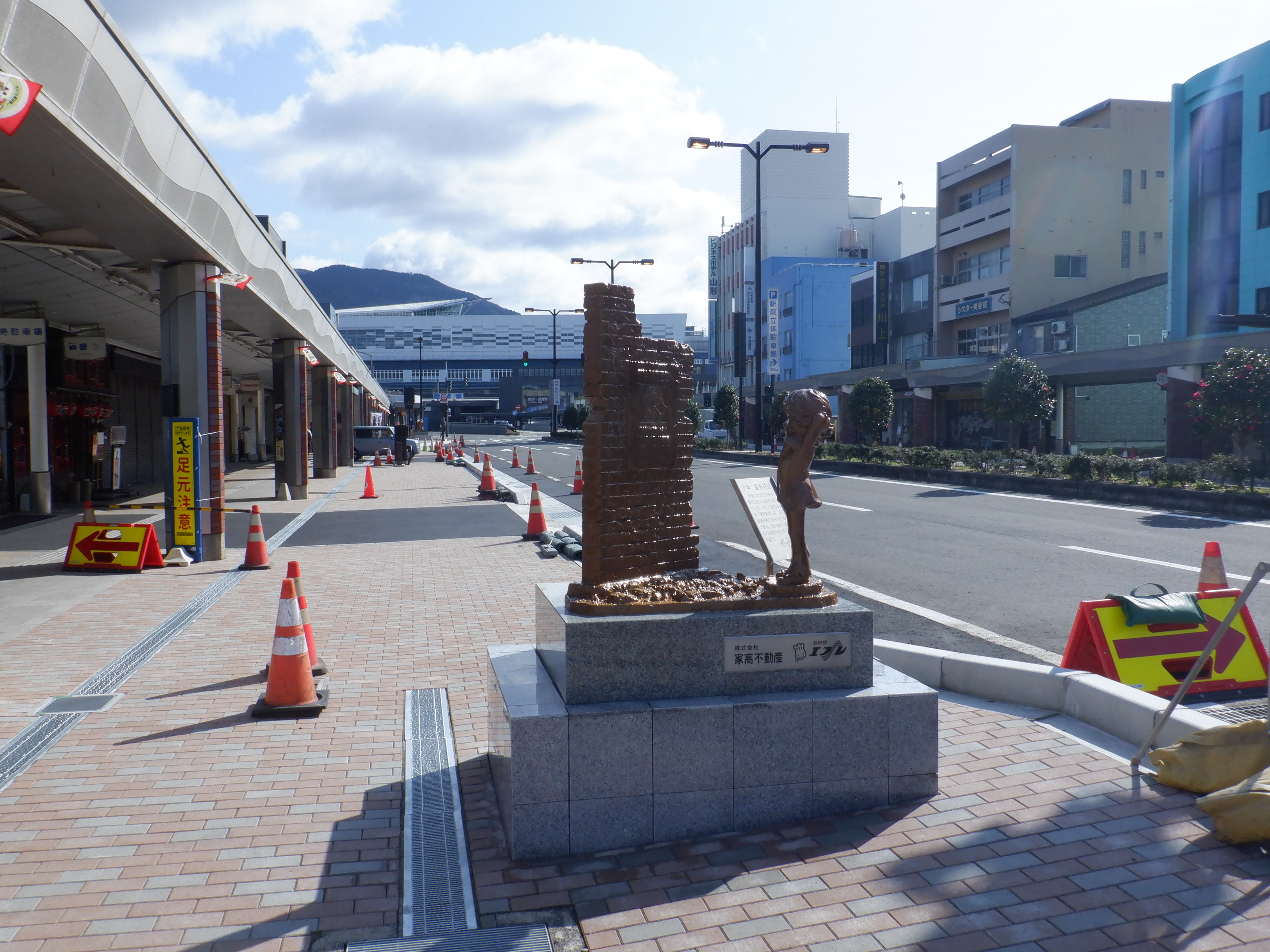 駅前の通りの工事の様子。歩道橋の撤去も進んでいます。