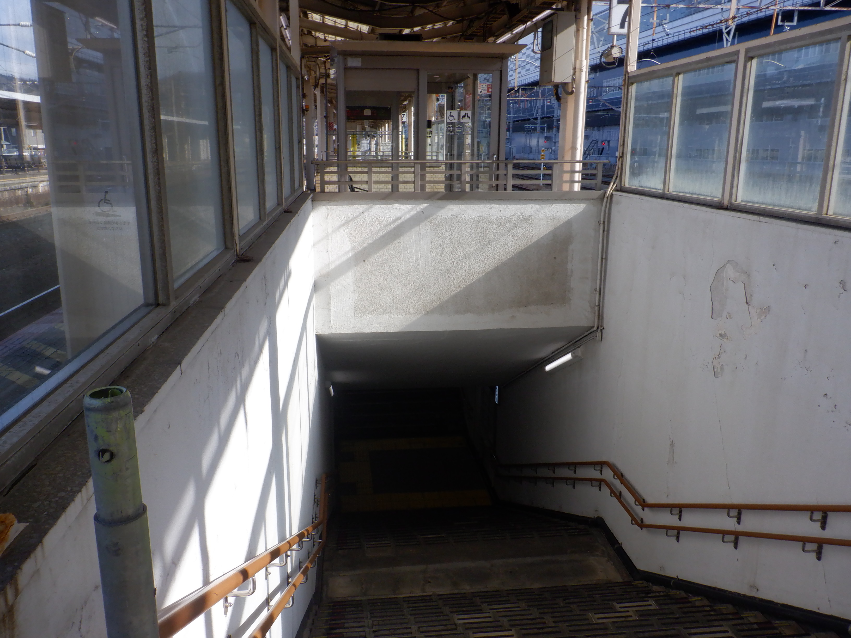 改札口から跨線橋へ上がって行く階段。