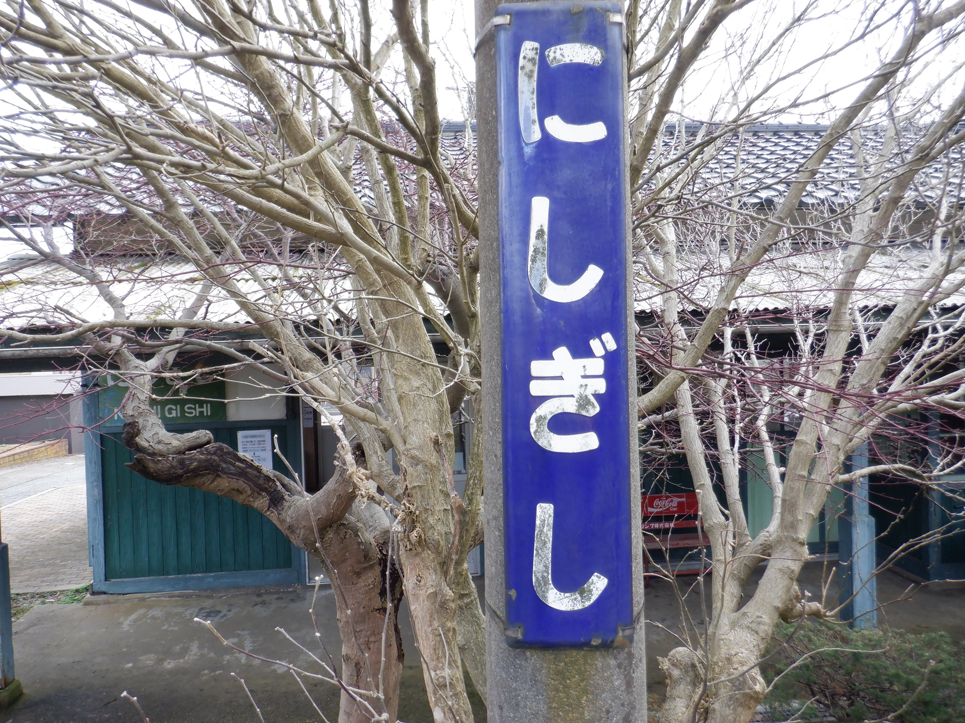 駅舎の前の柱の駅名標。