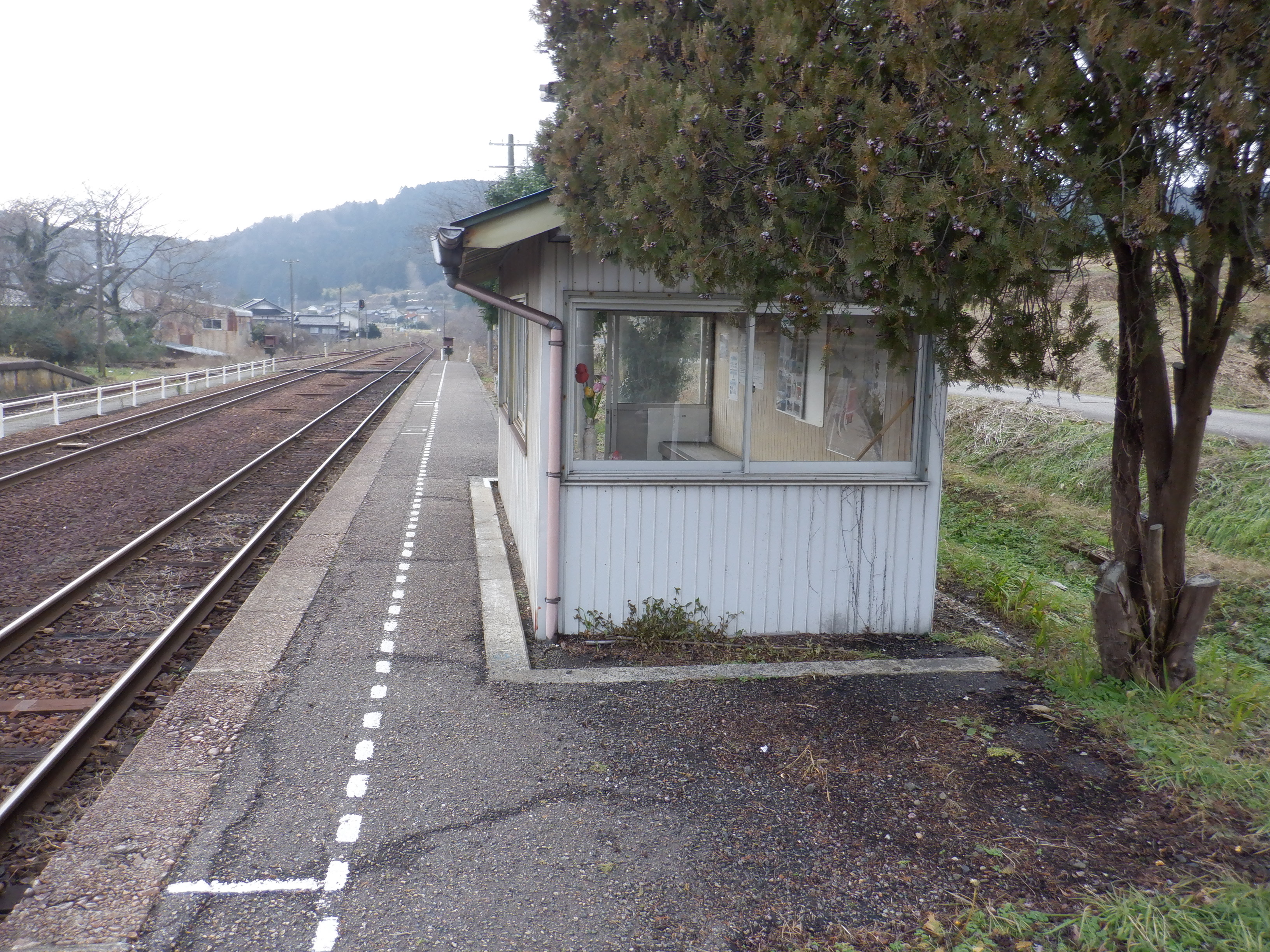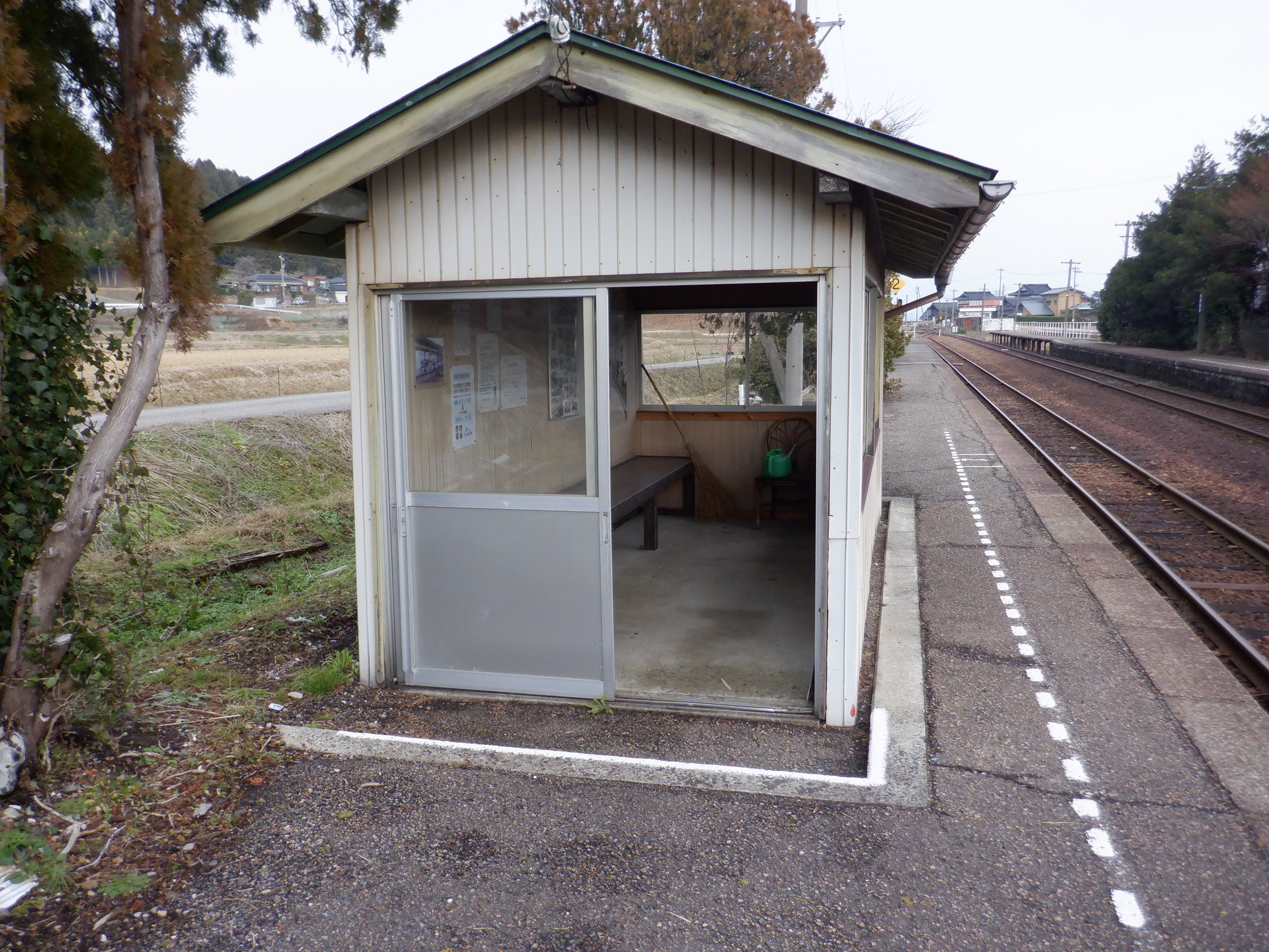 駅舎側のホームから見た駅舎と反対側のホームの待合室。