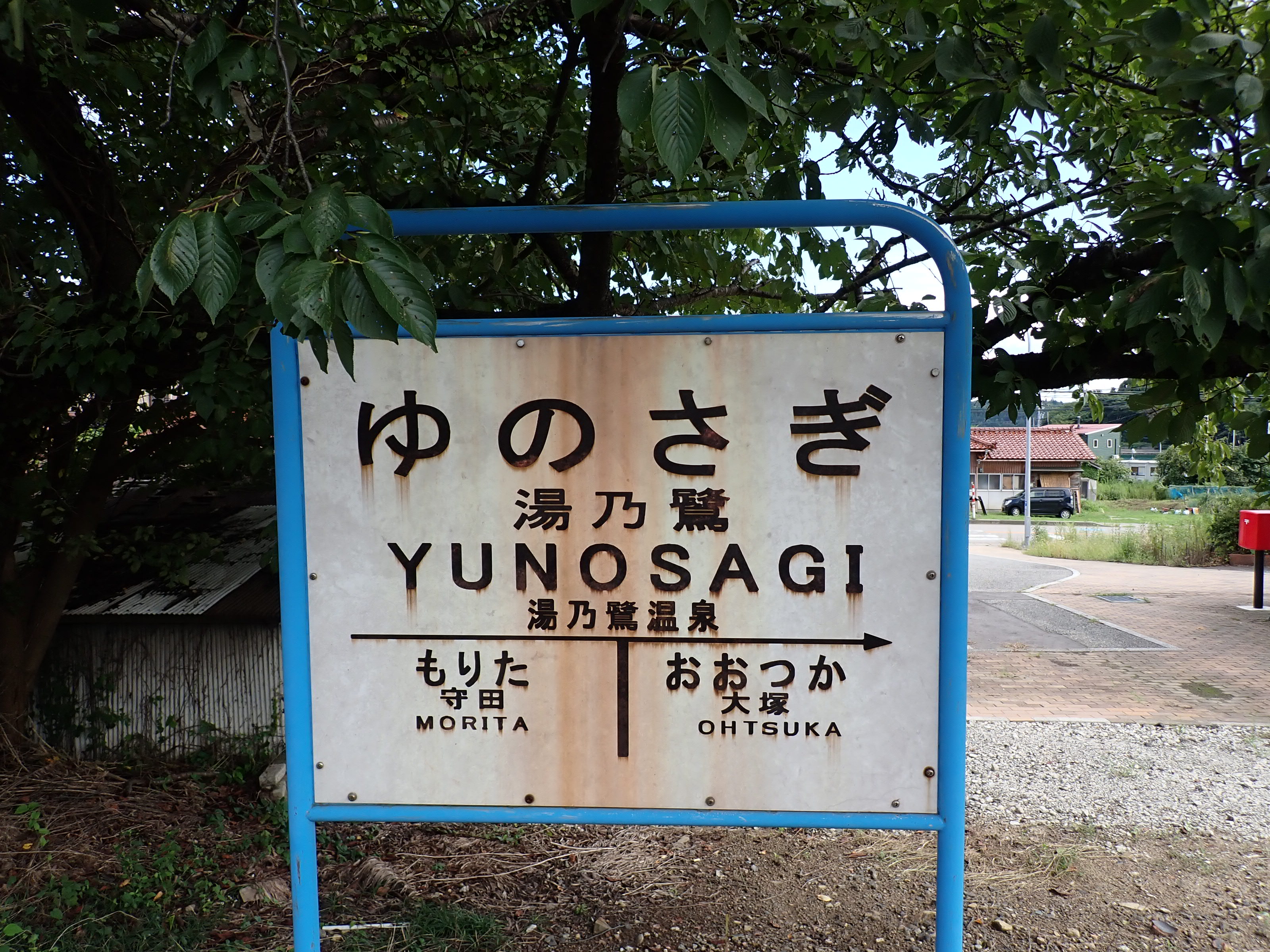 「ゆのさぎ」の縦型駅名標は、シールの部分が白くなり、一番下はすでに元の「し」になっています。