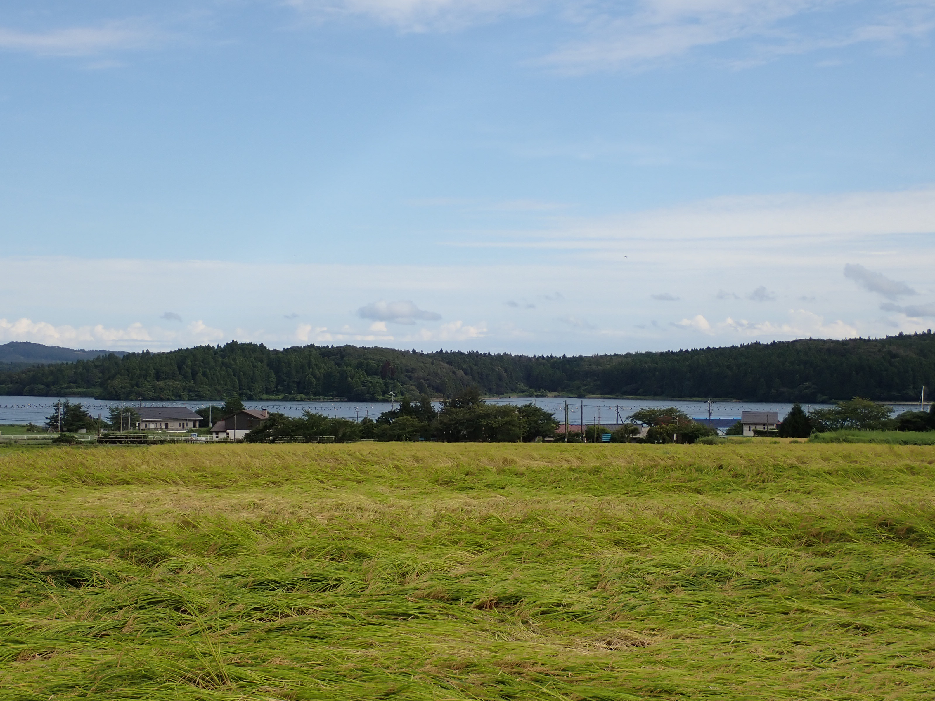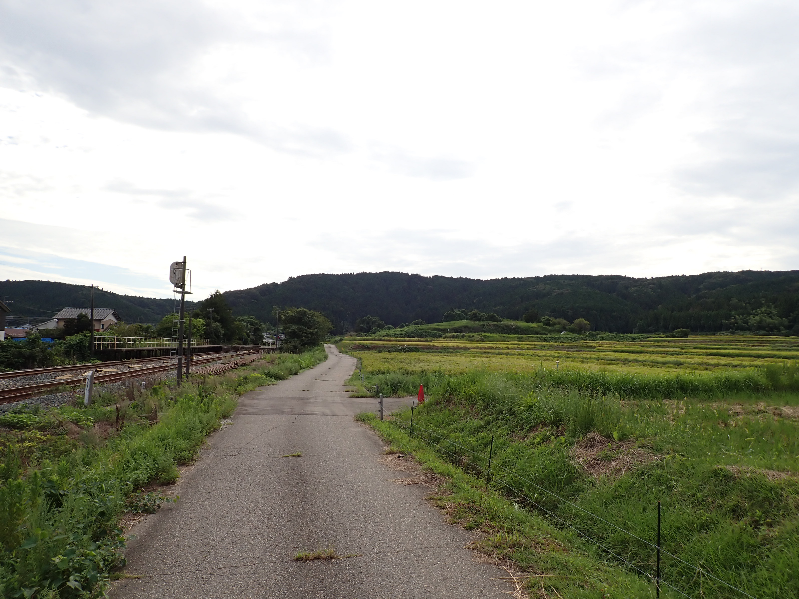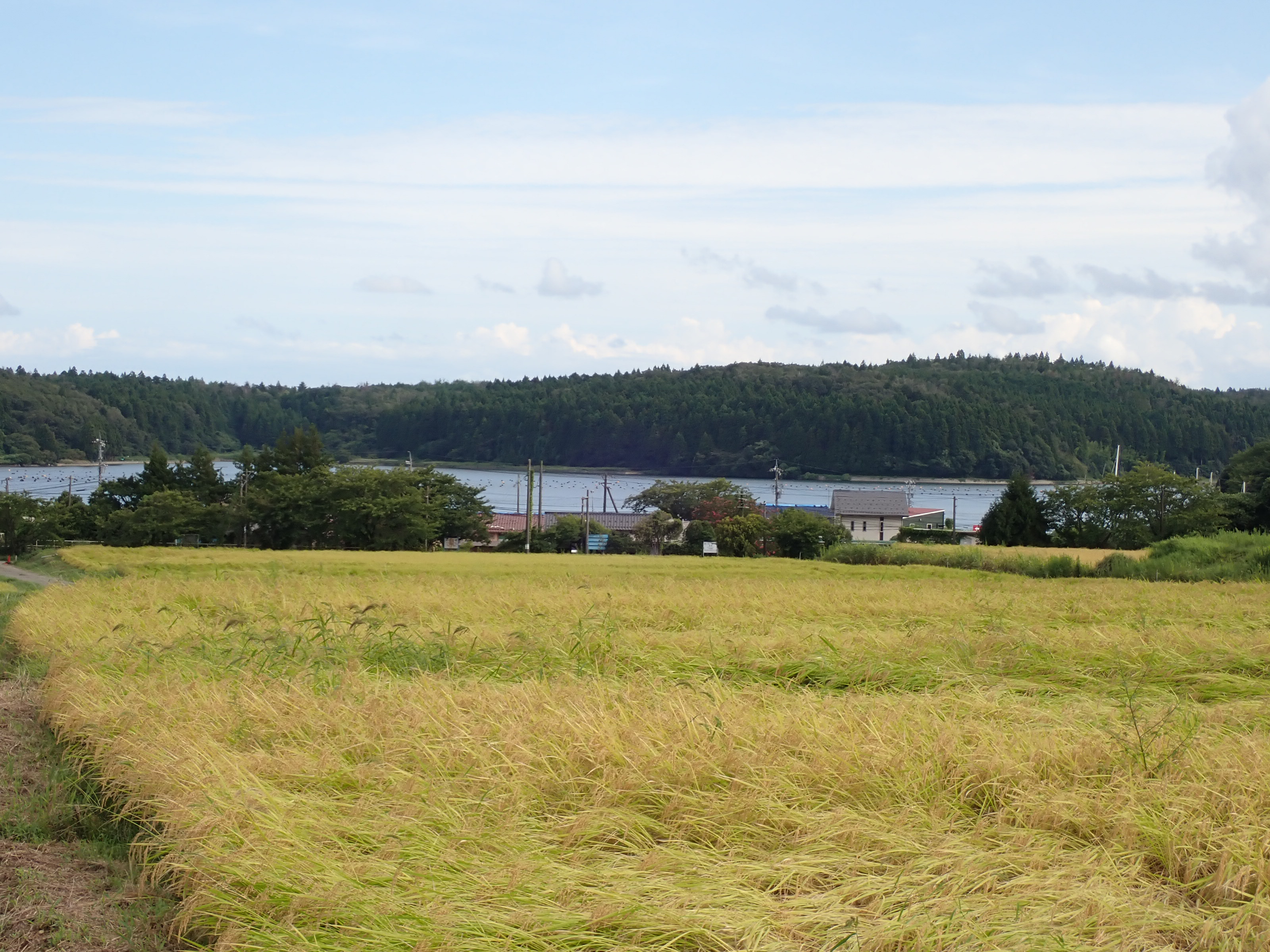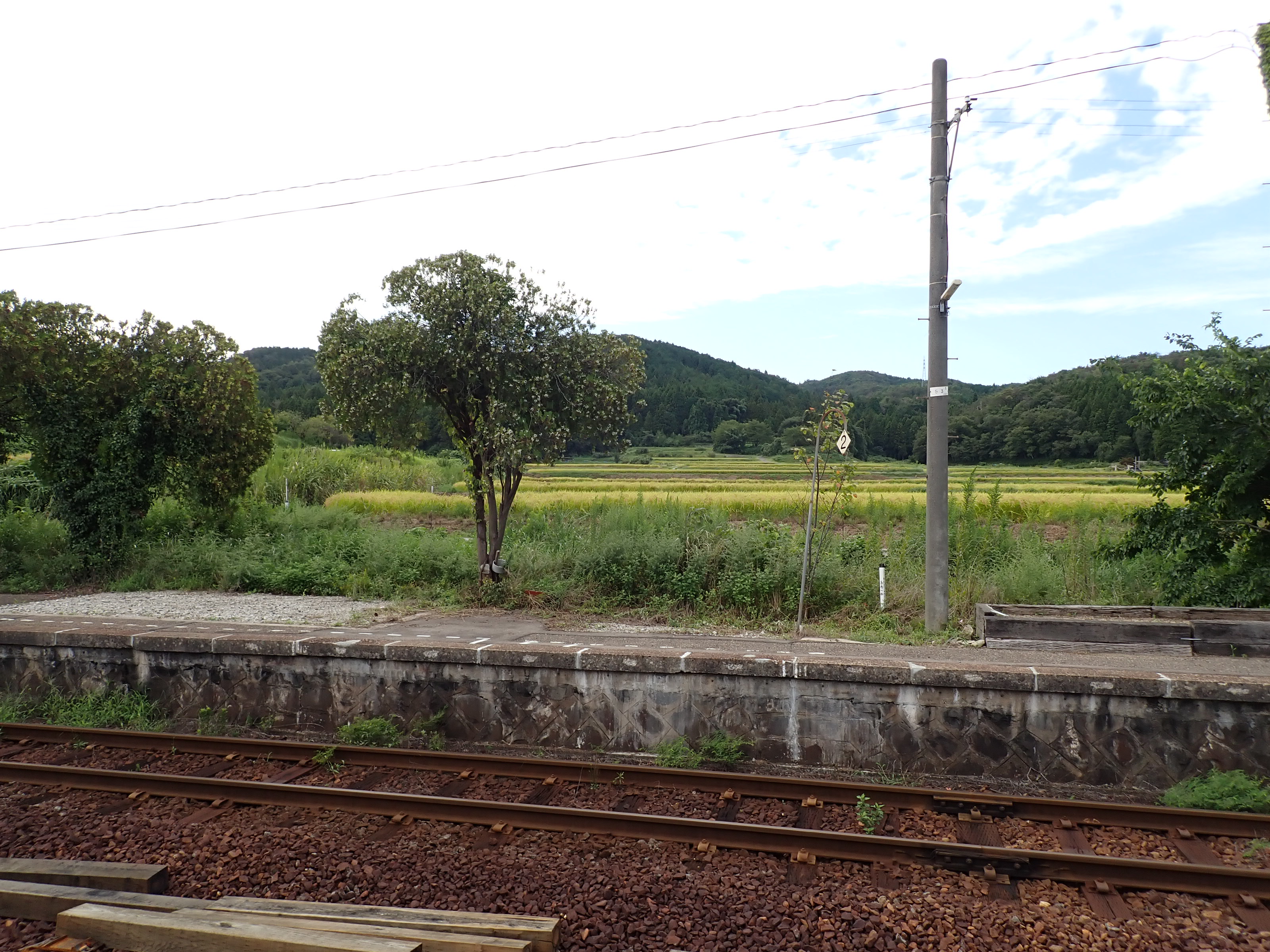 駅の反対側から、稲刈り間近の水田と西岸駅。その向こうに海が見えます。