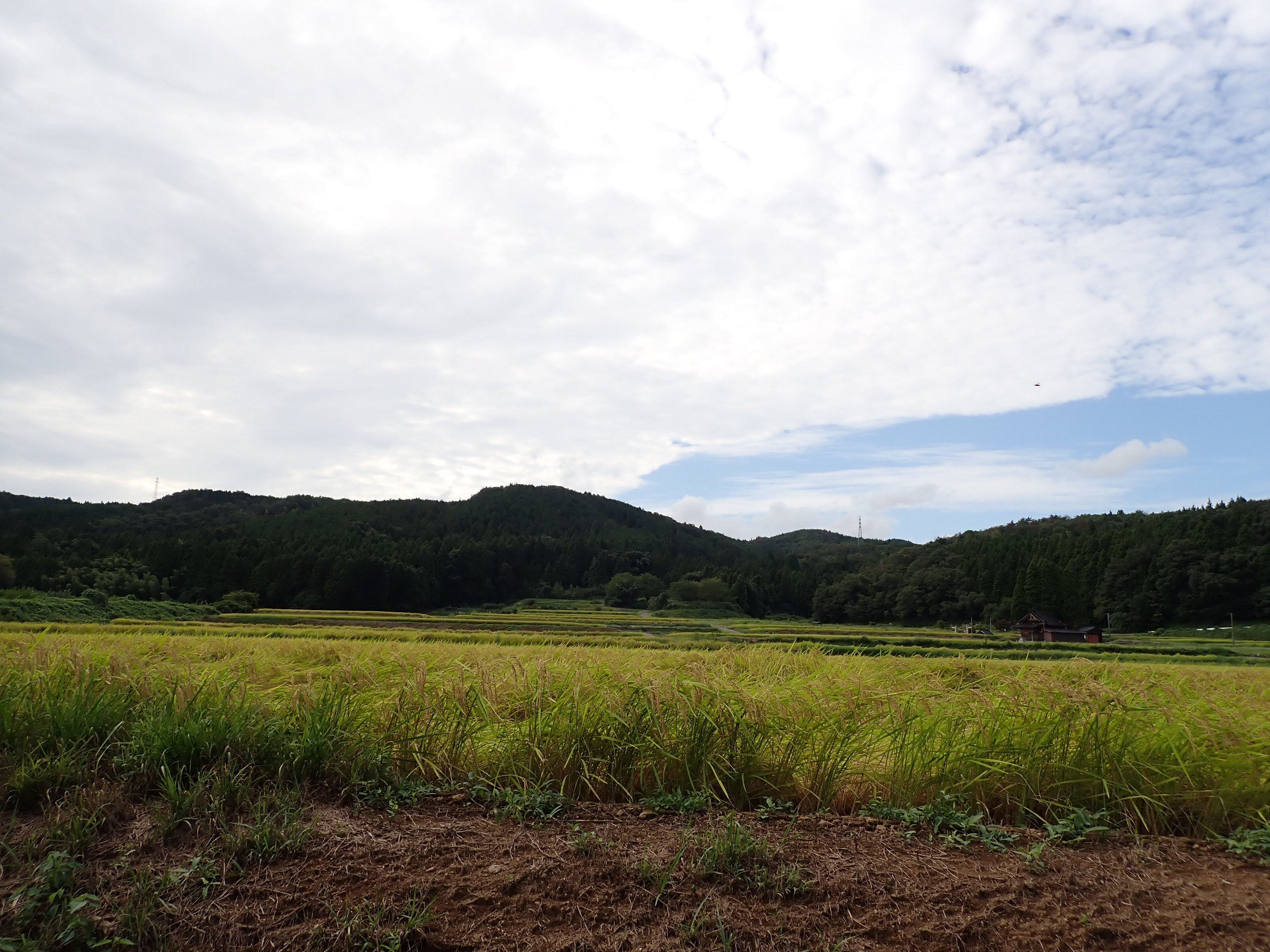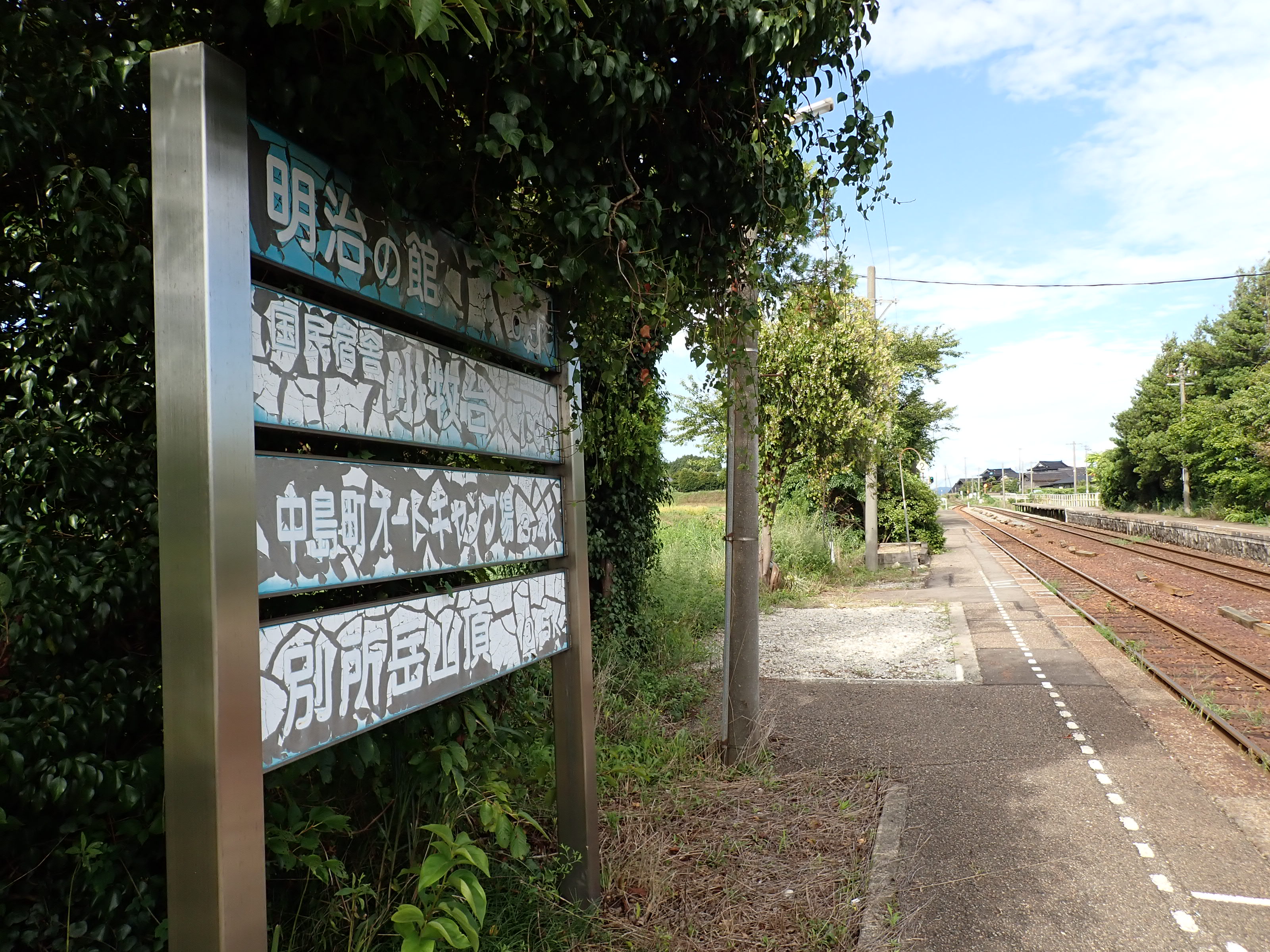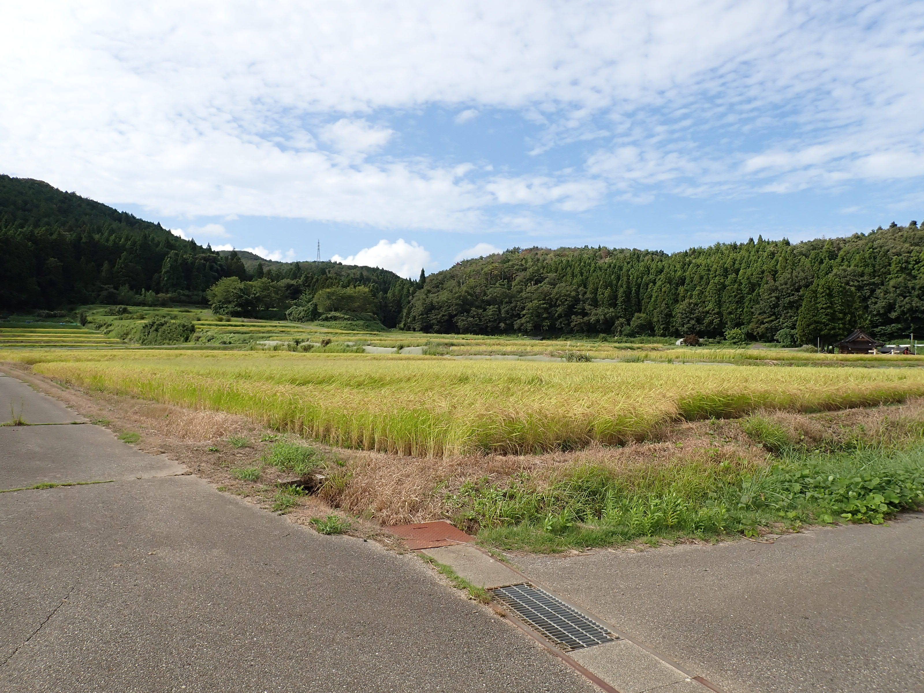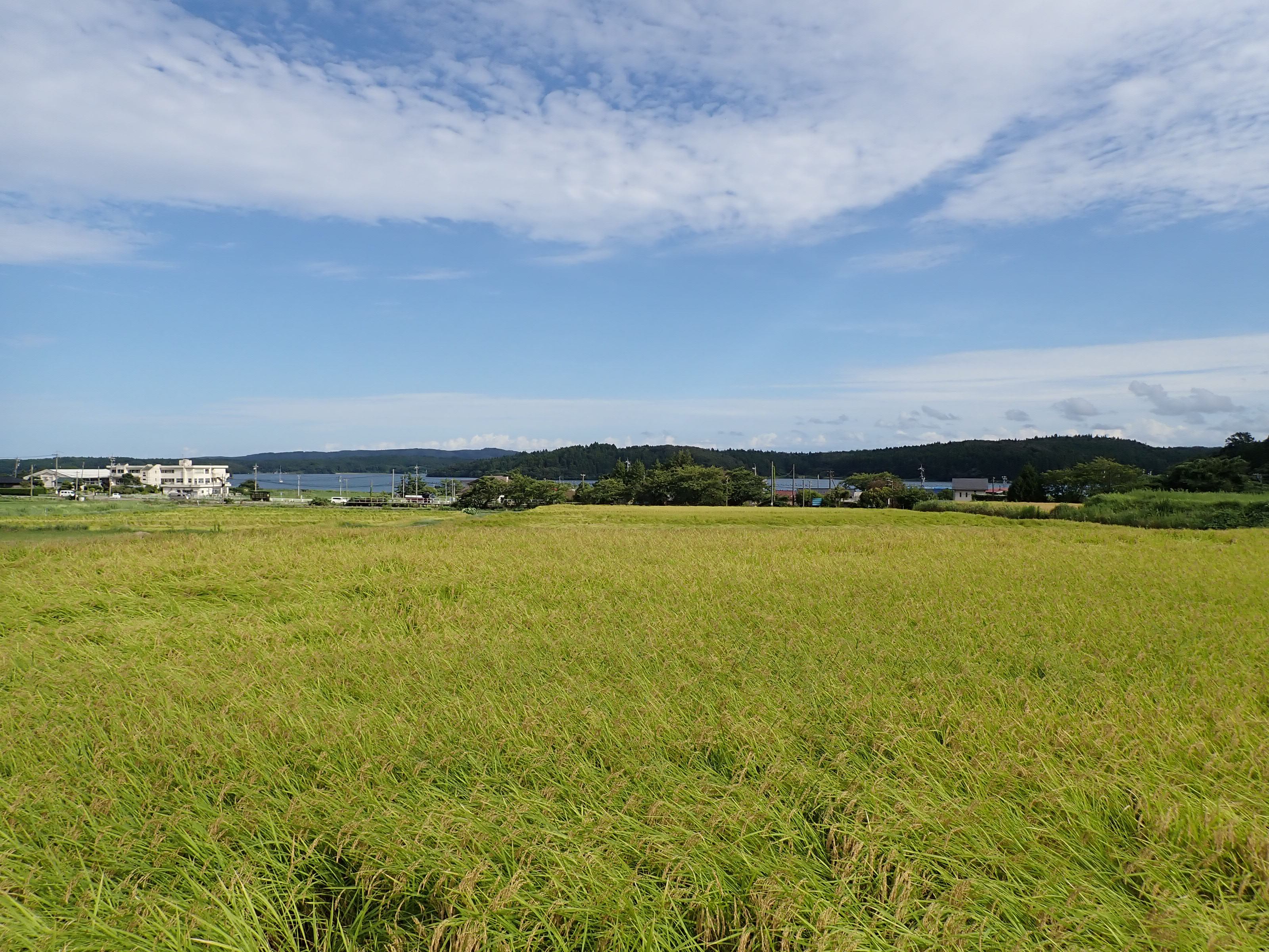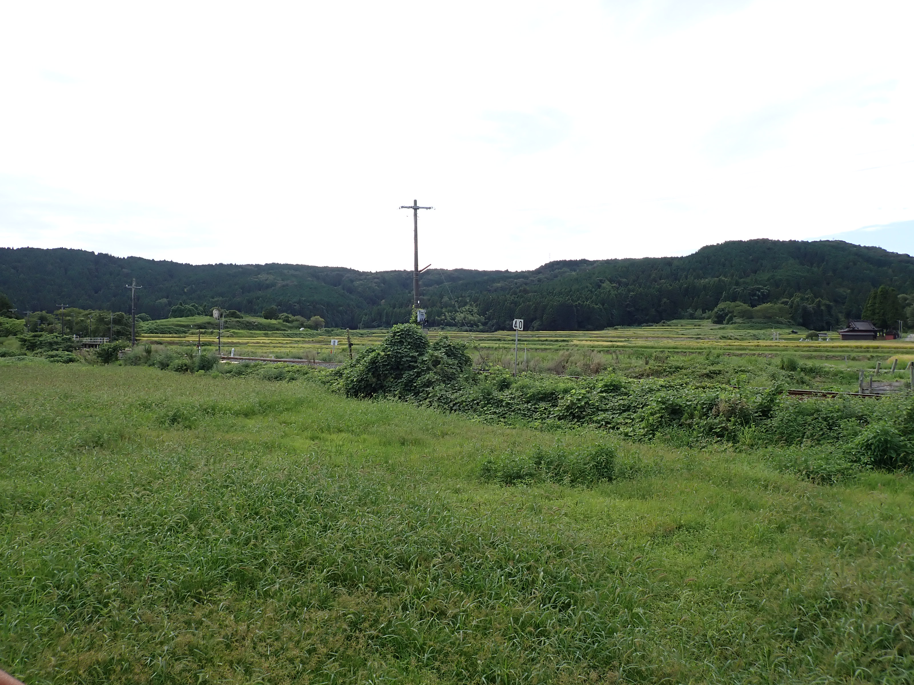 駅の反対側から、稲刈り間近の水田と西岸駅。その向こうに海が見えます。