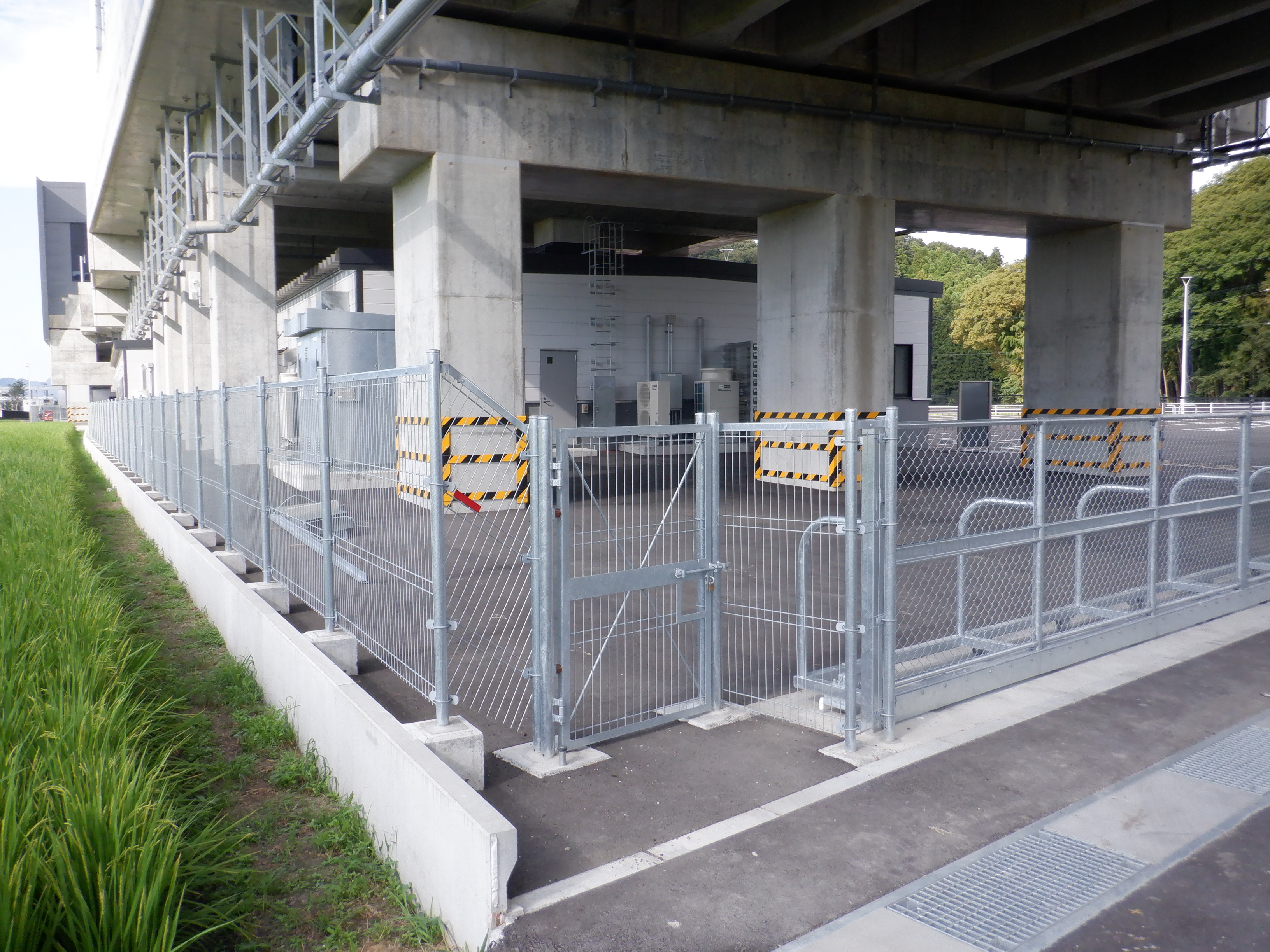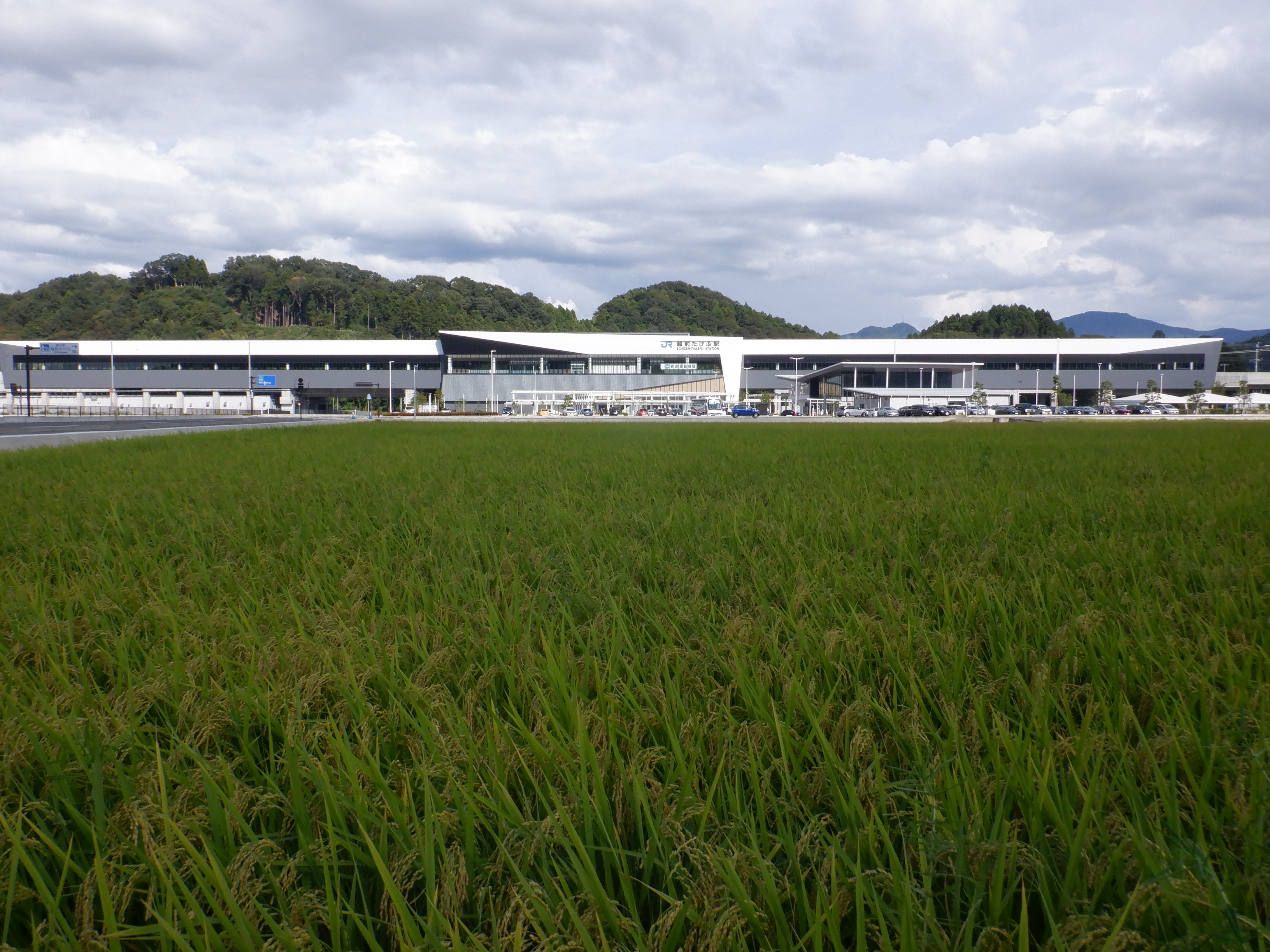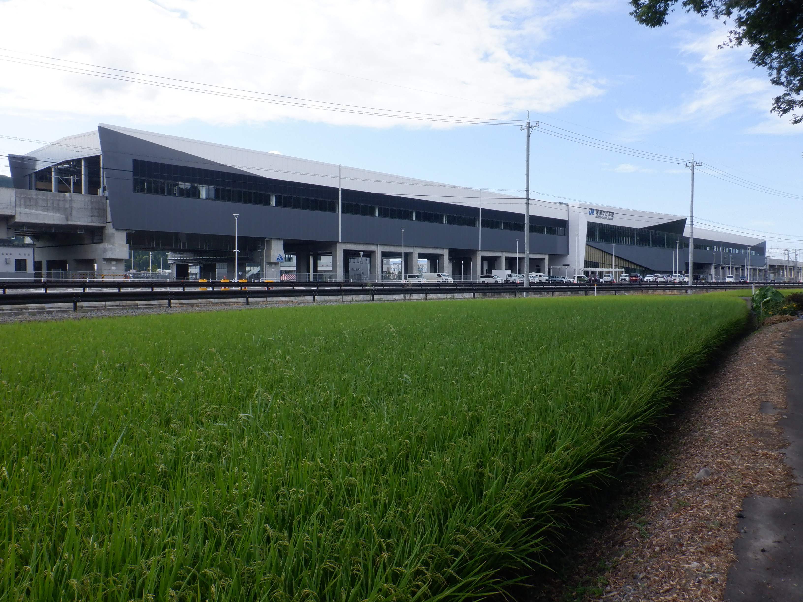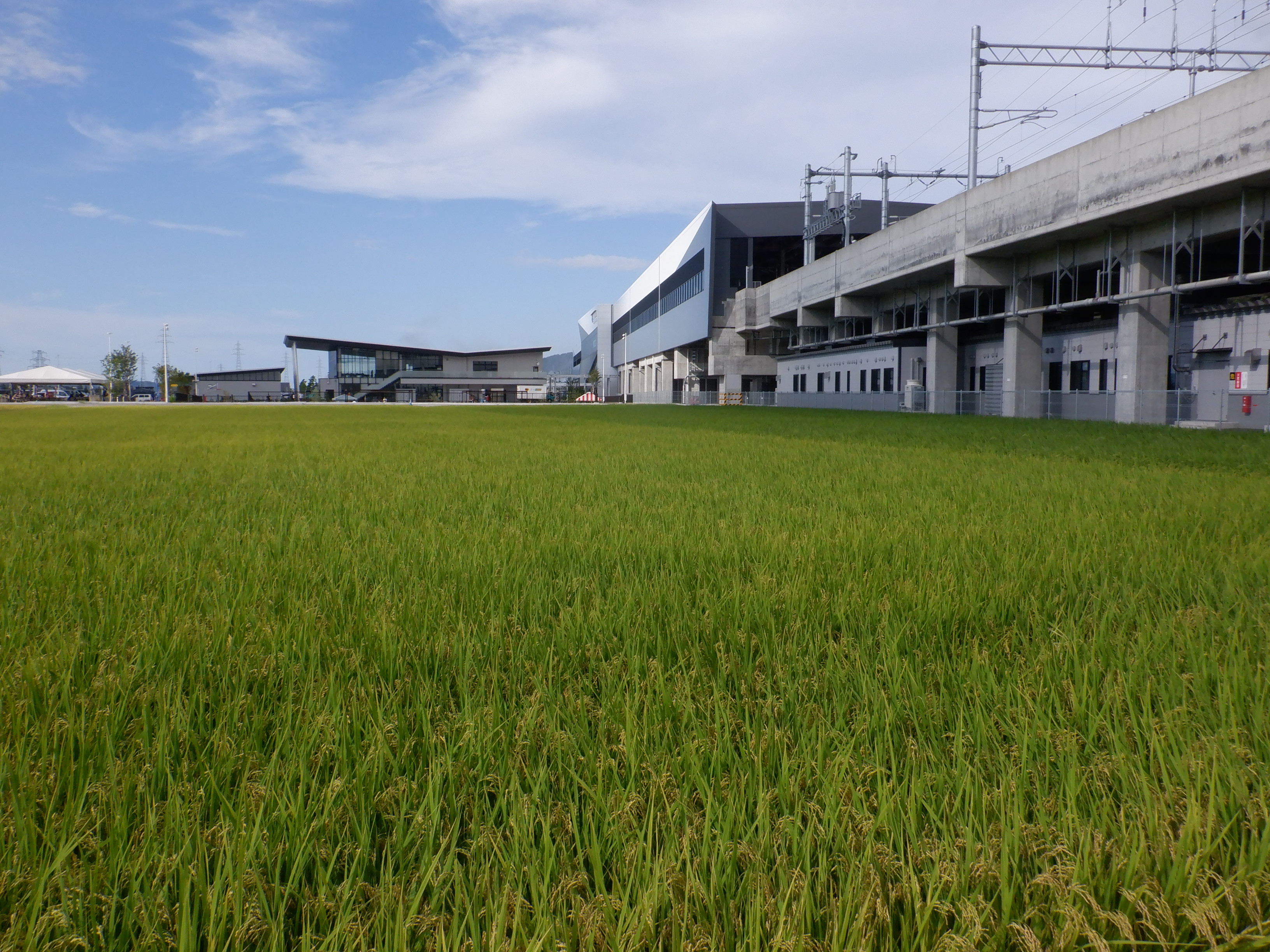 国道8号付近から見た越前たけふ駅と稲が実った水田。