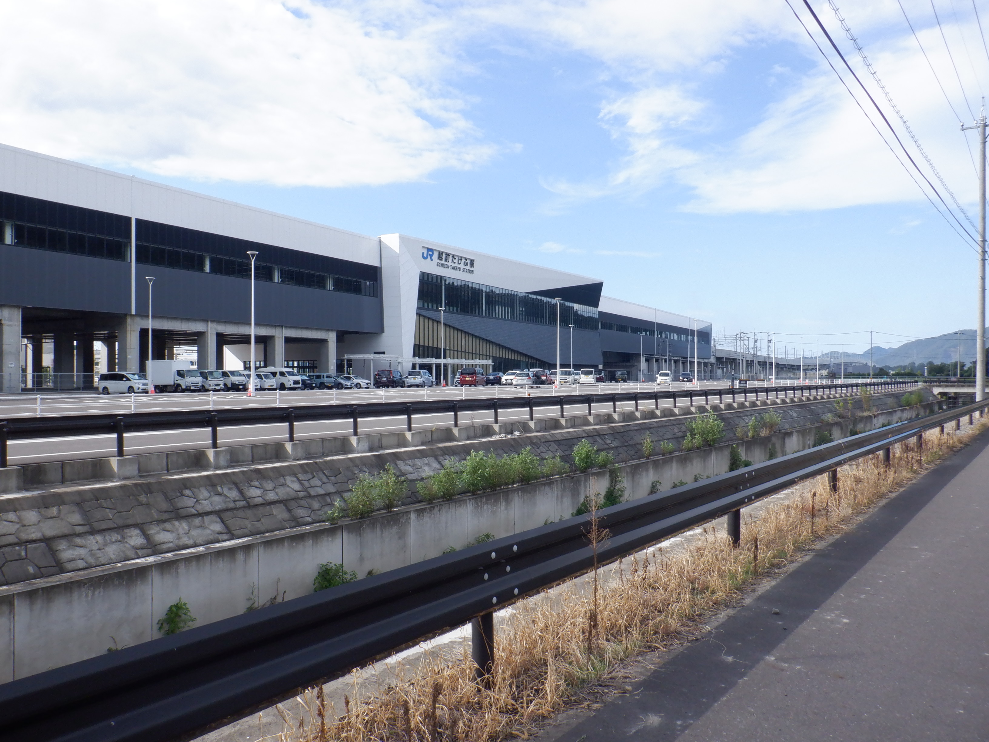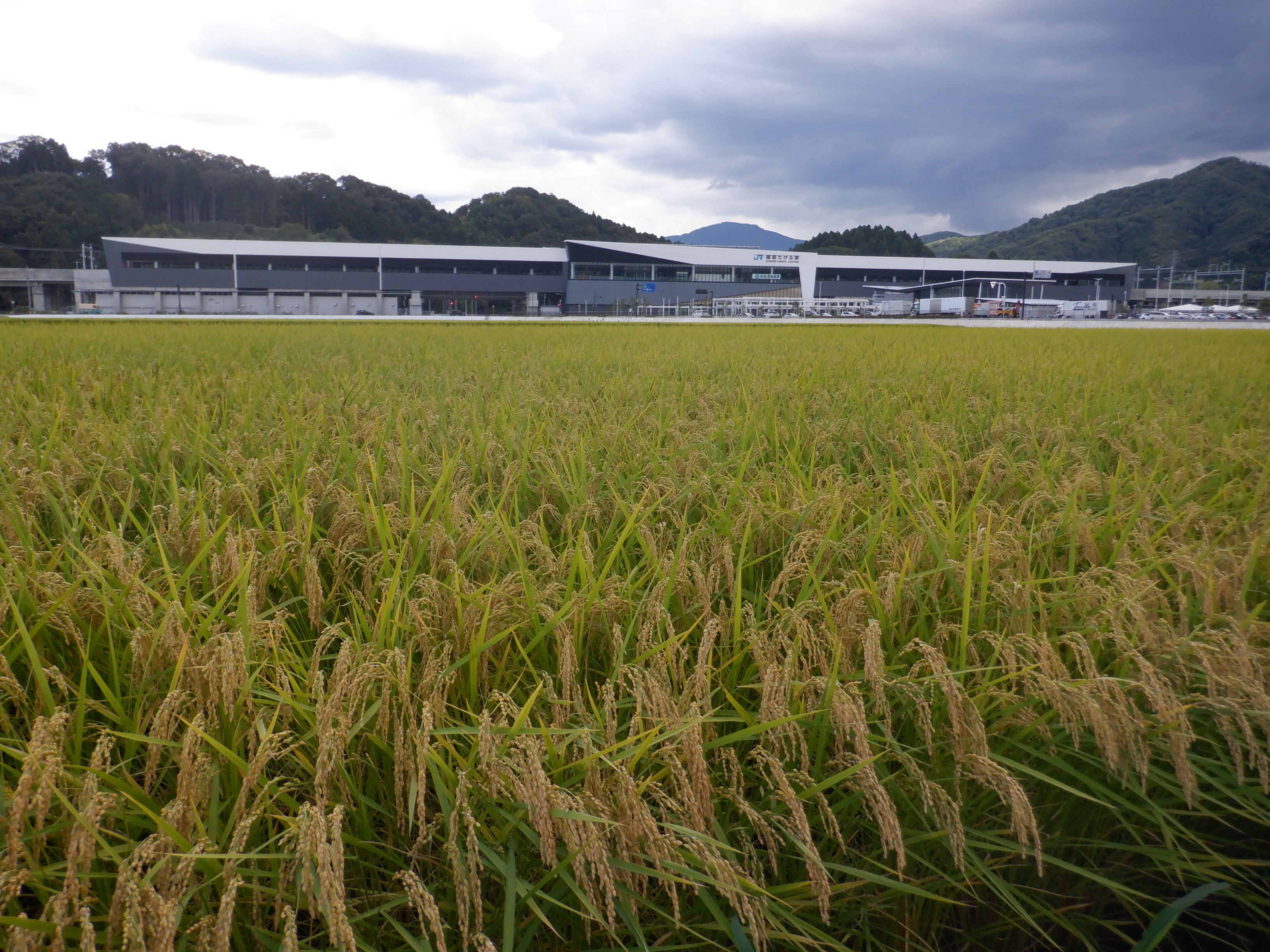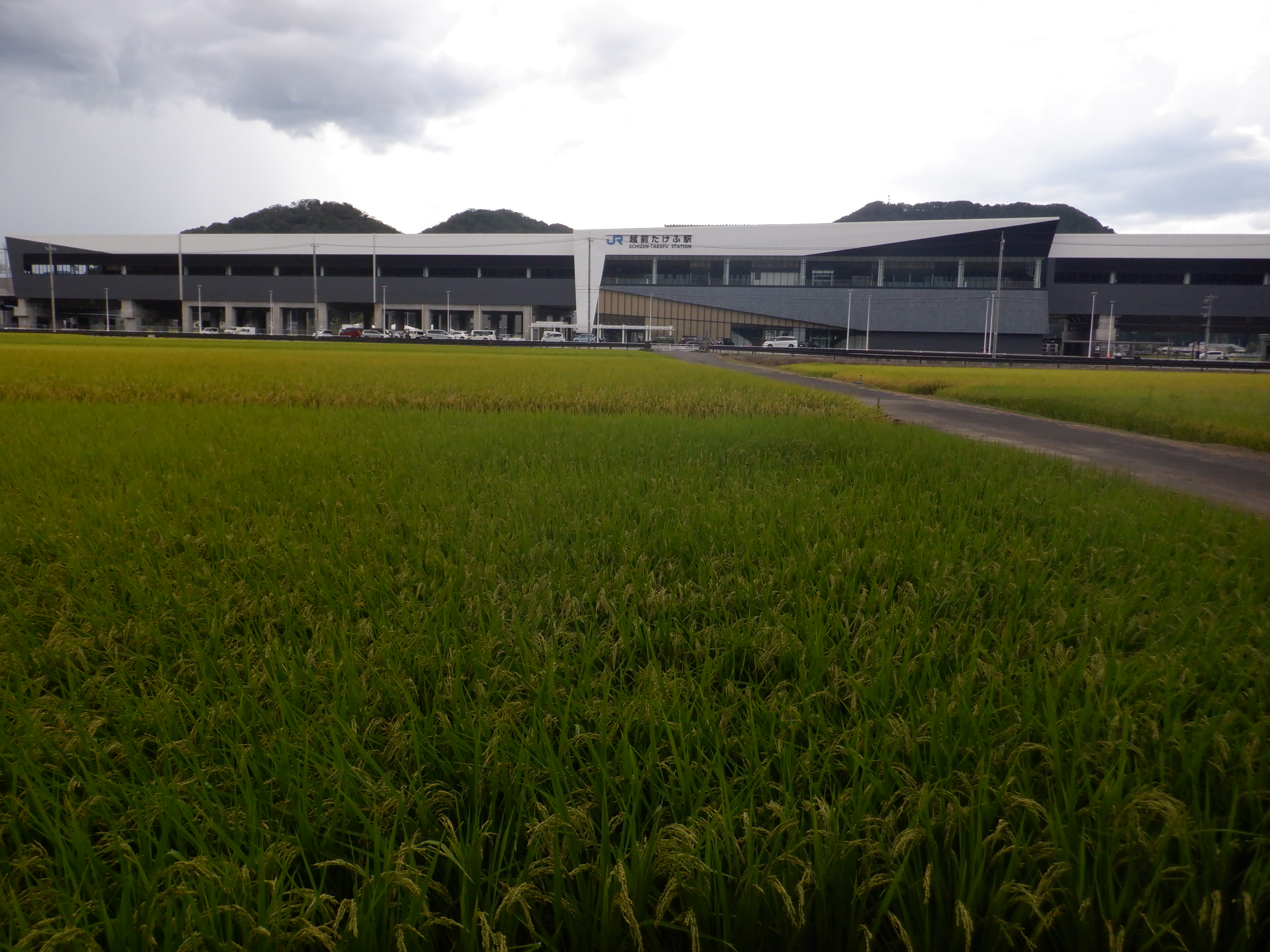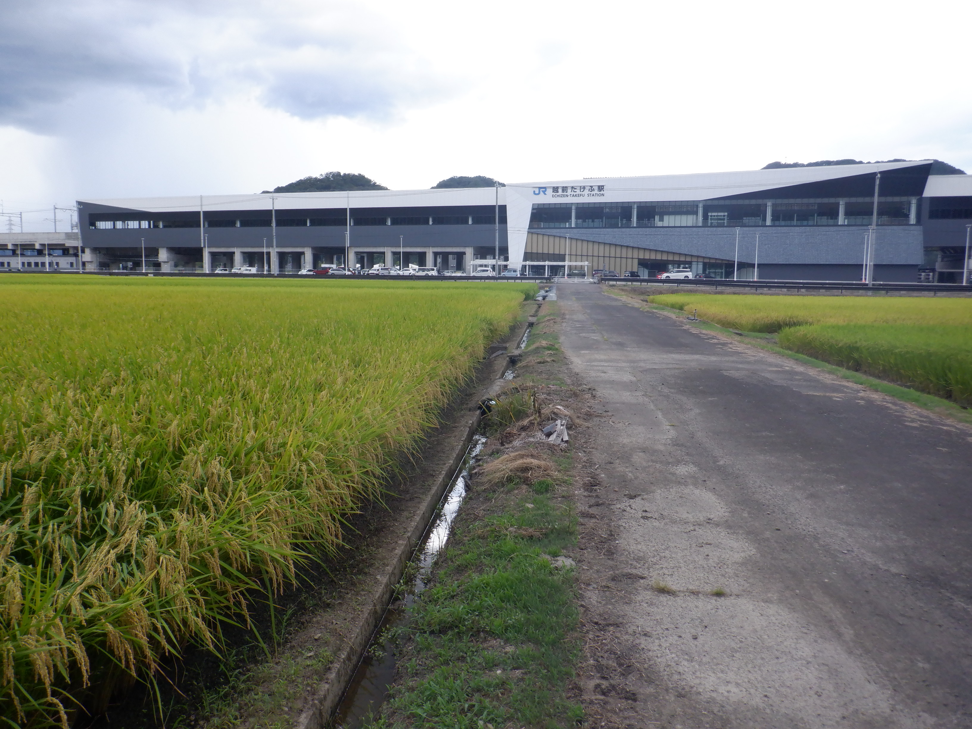 国道8号から見た越前たけふ駅。こちら側からが一面実った水田というのはこれで最後になりました。