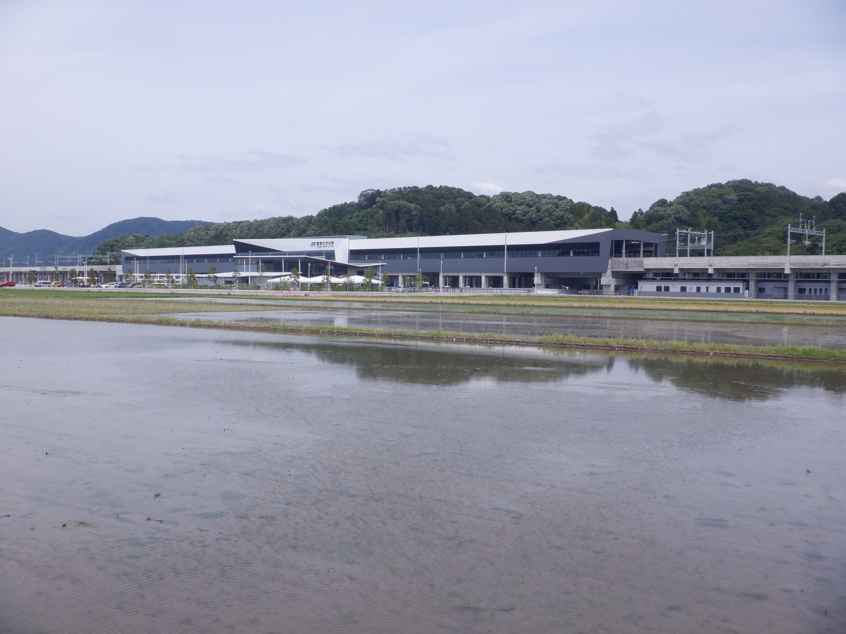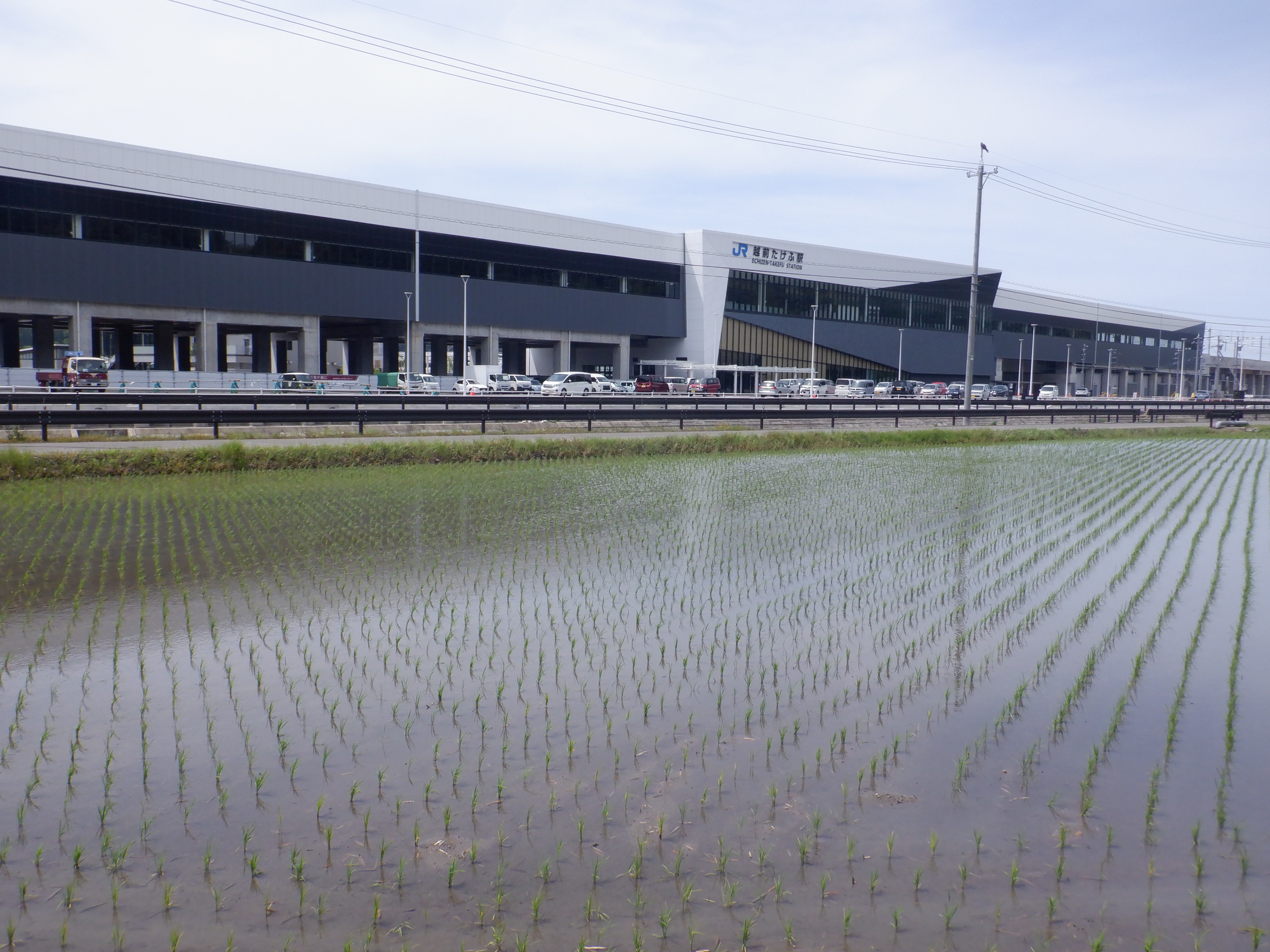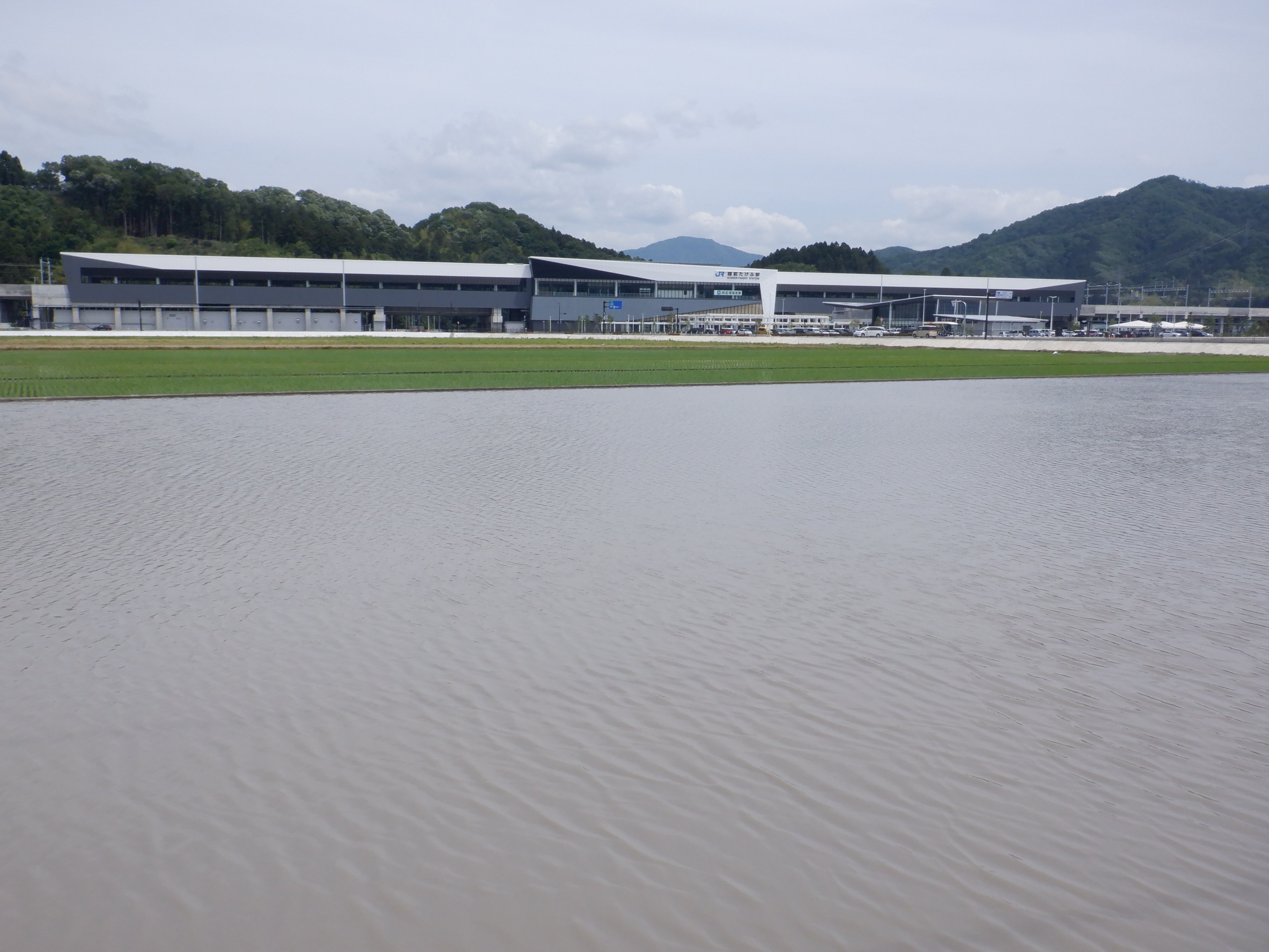 田植え直後や田植え直前の水田と越前たけふ駅。
