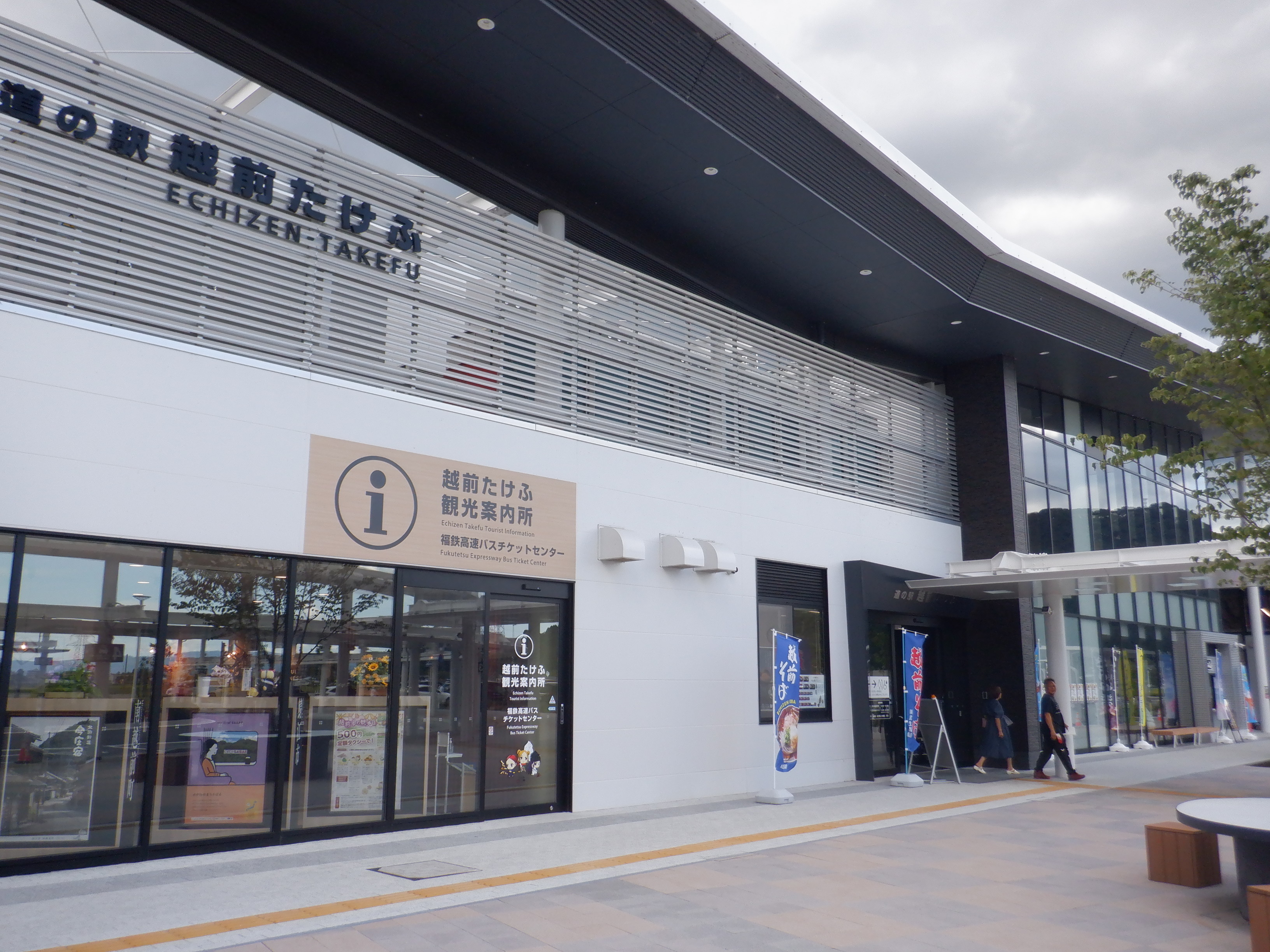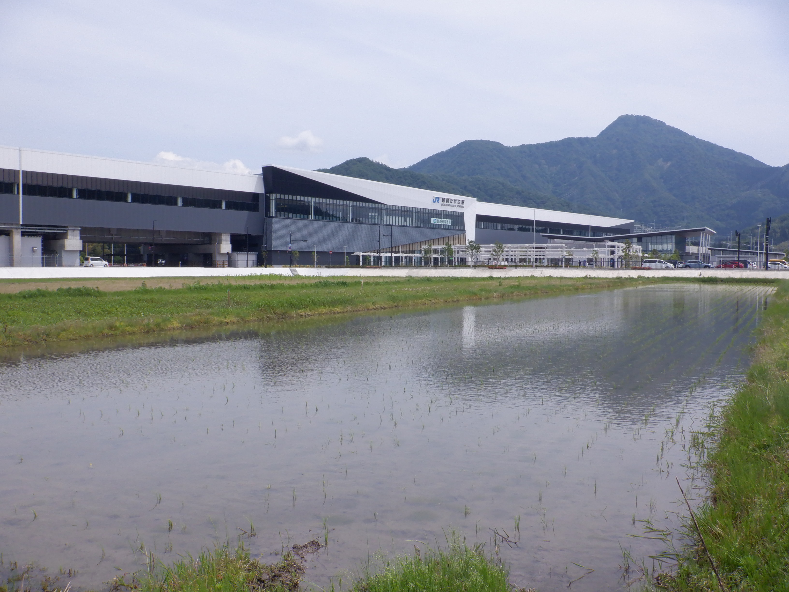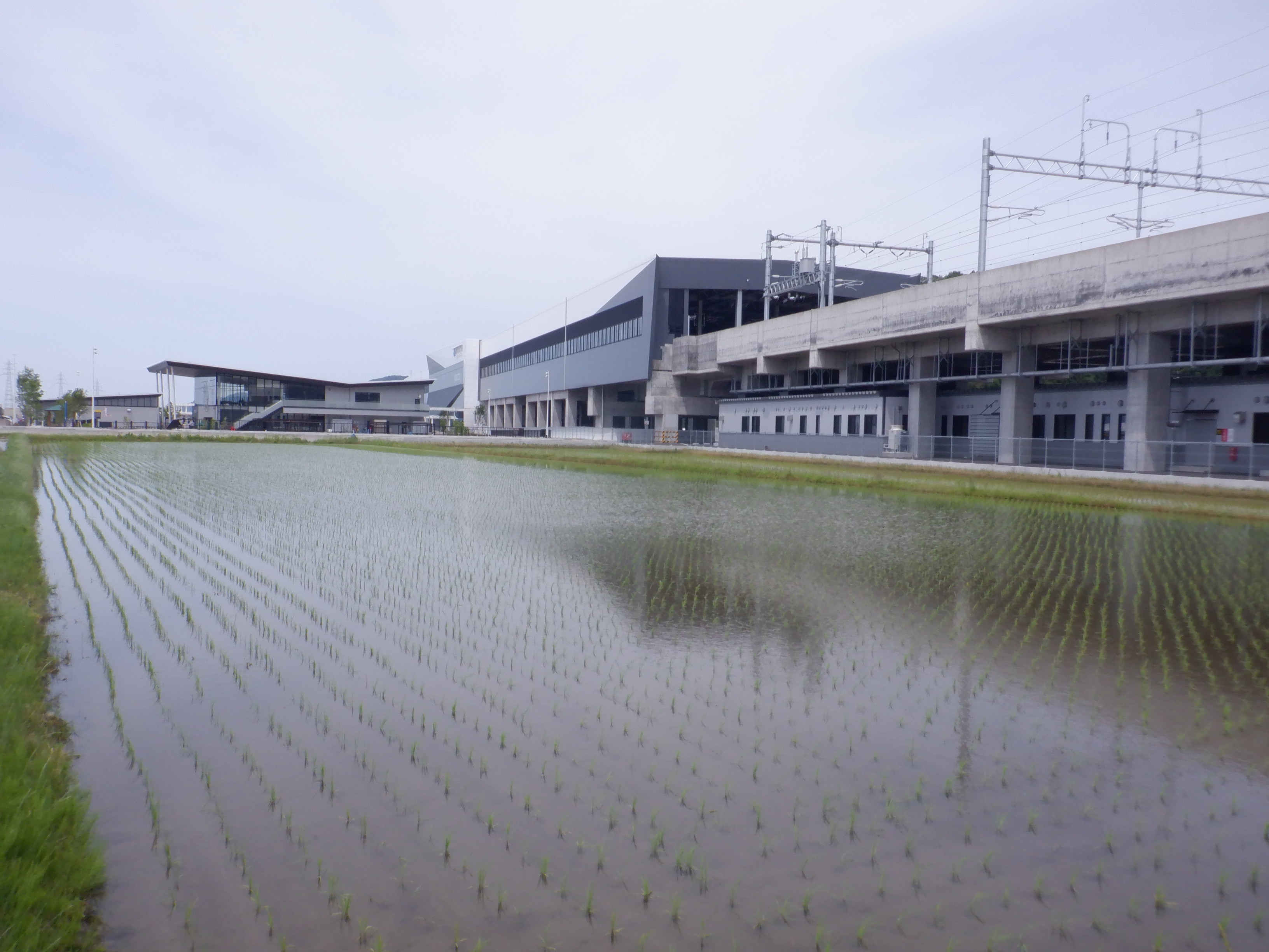 田植え直後や田植え直前の水田と越前たけふ駅。
