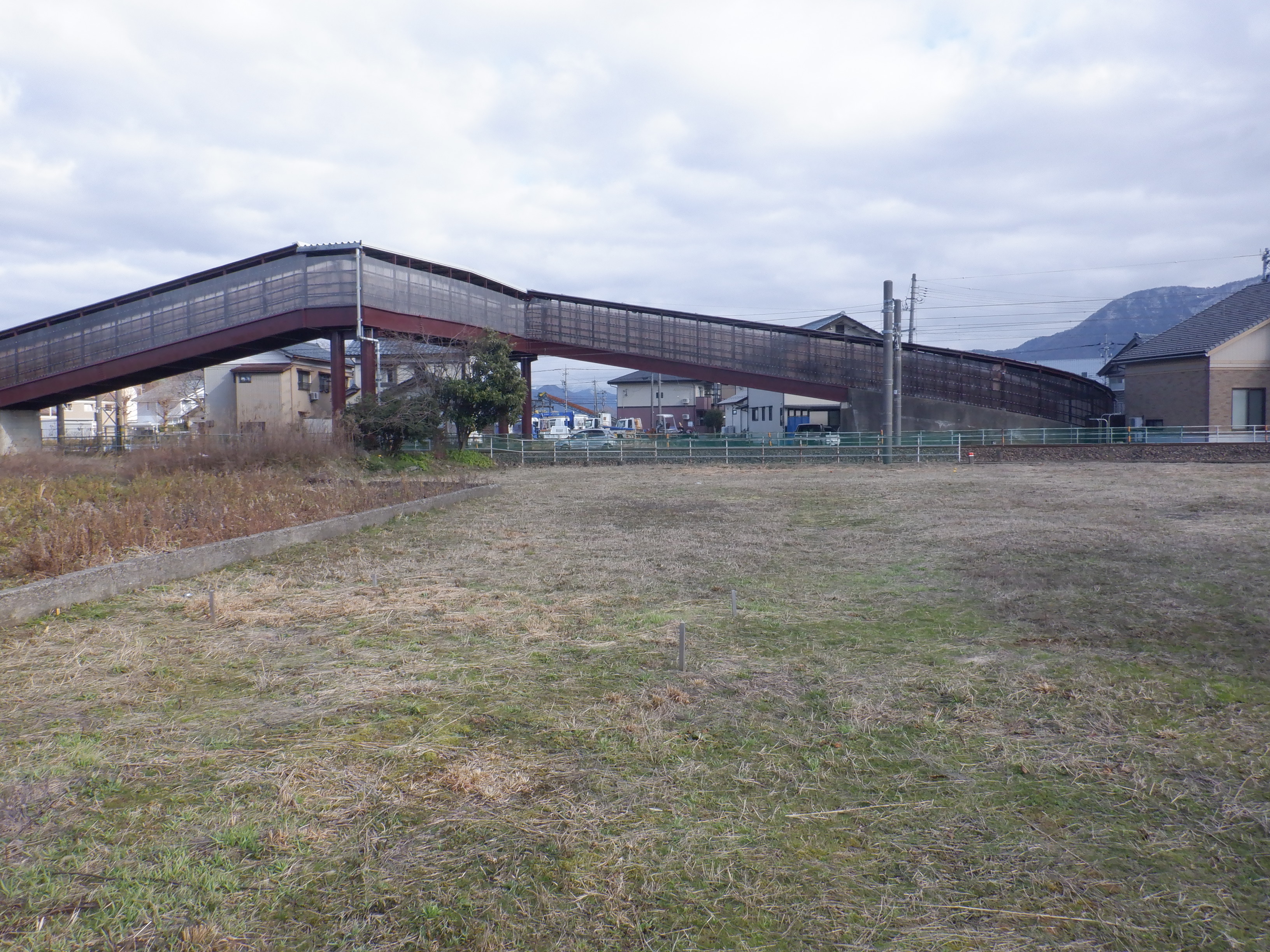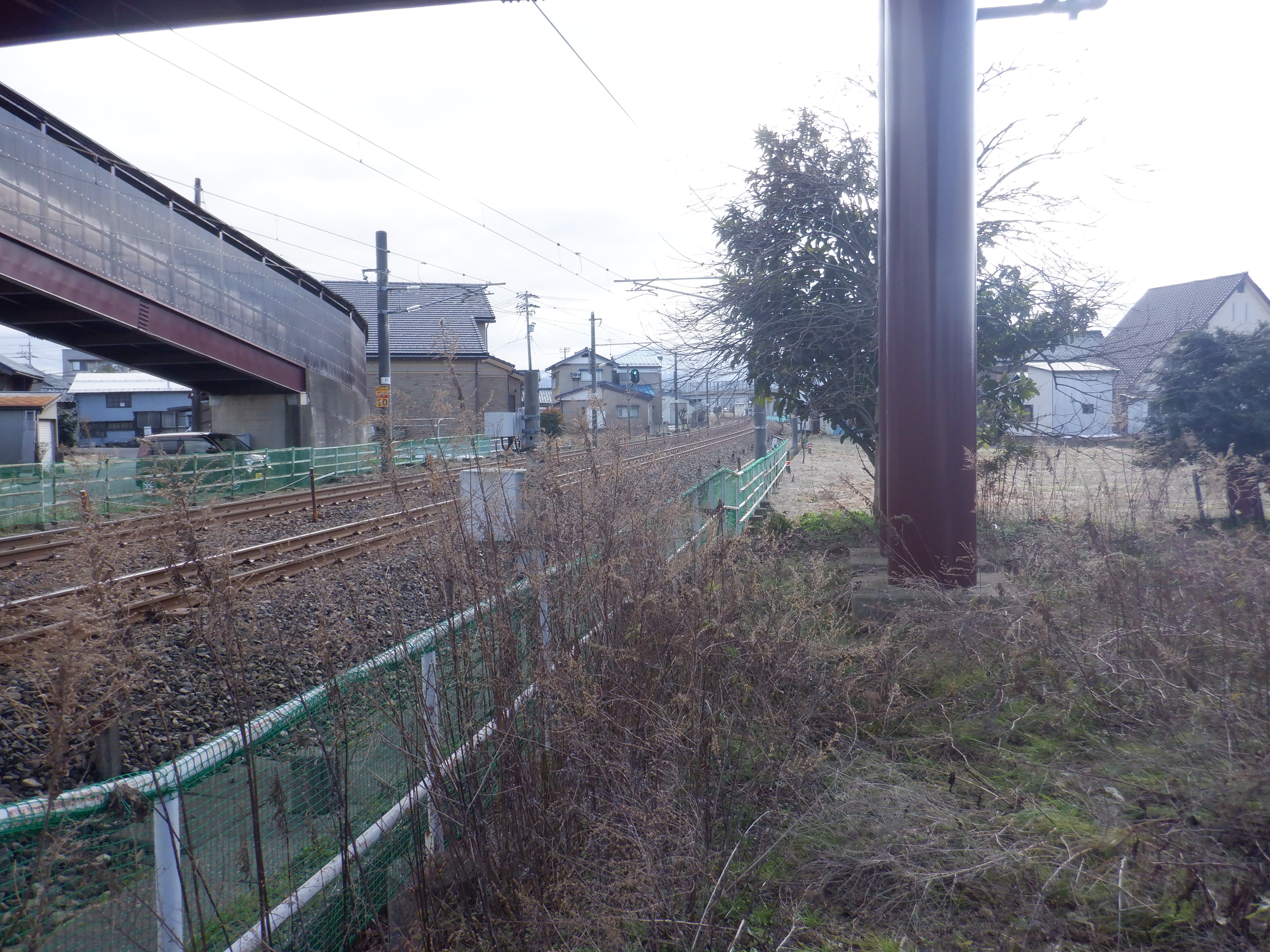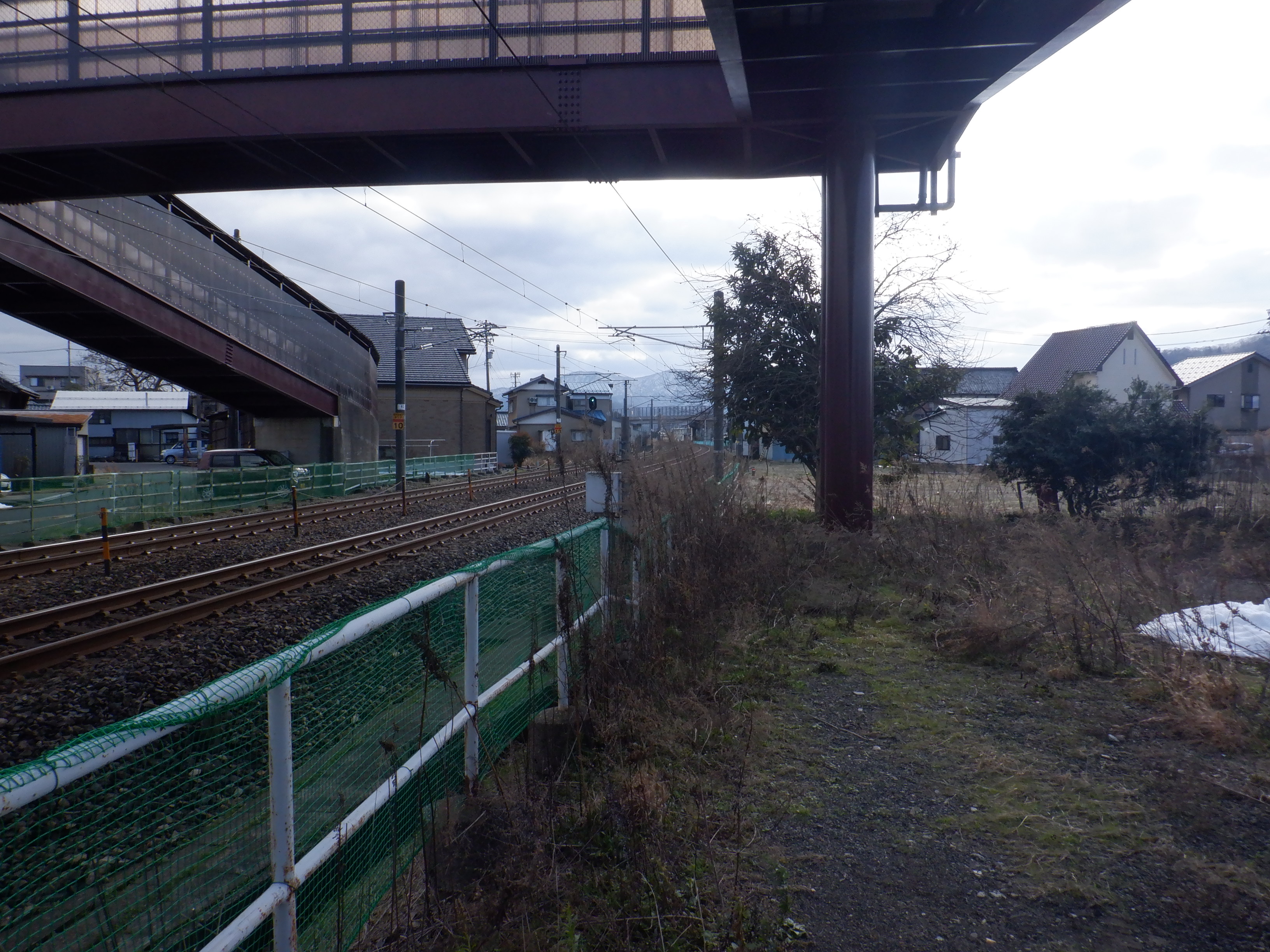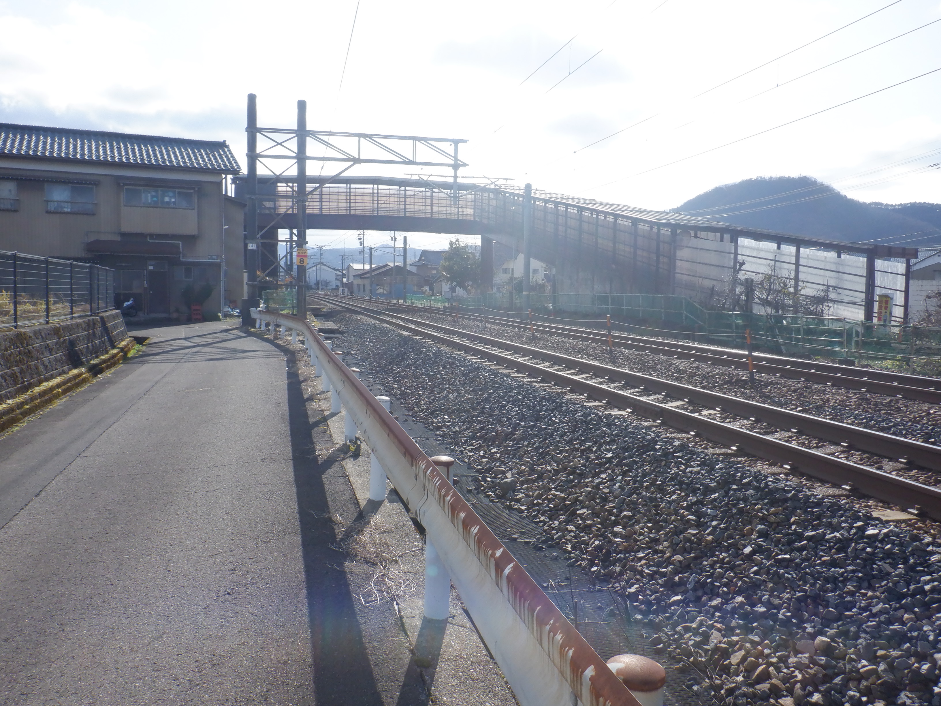 そこからしばらく進むと線路を跨ぐ歩道橋があります。この歩道橋の前後にしきぶ駅が作られることになります。