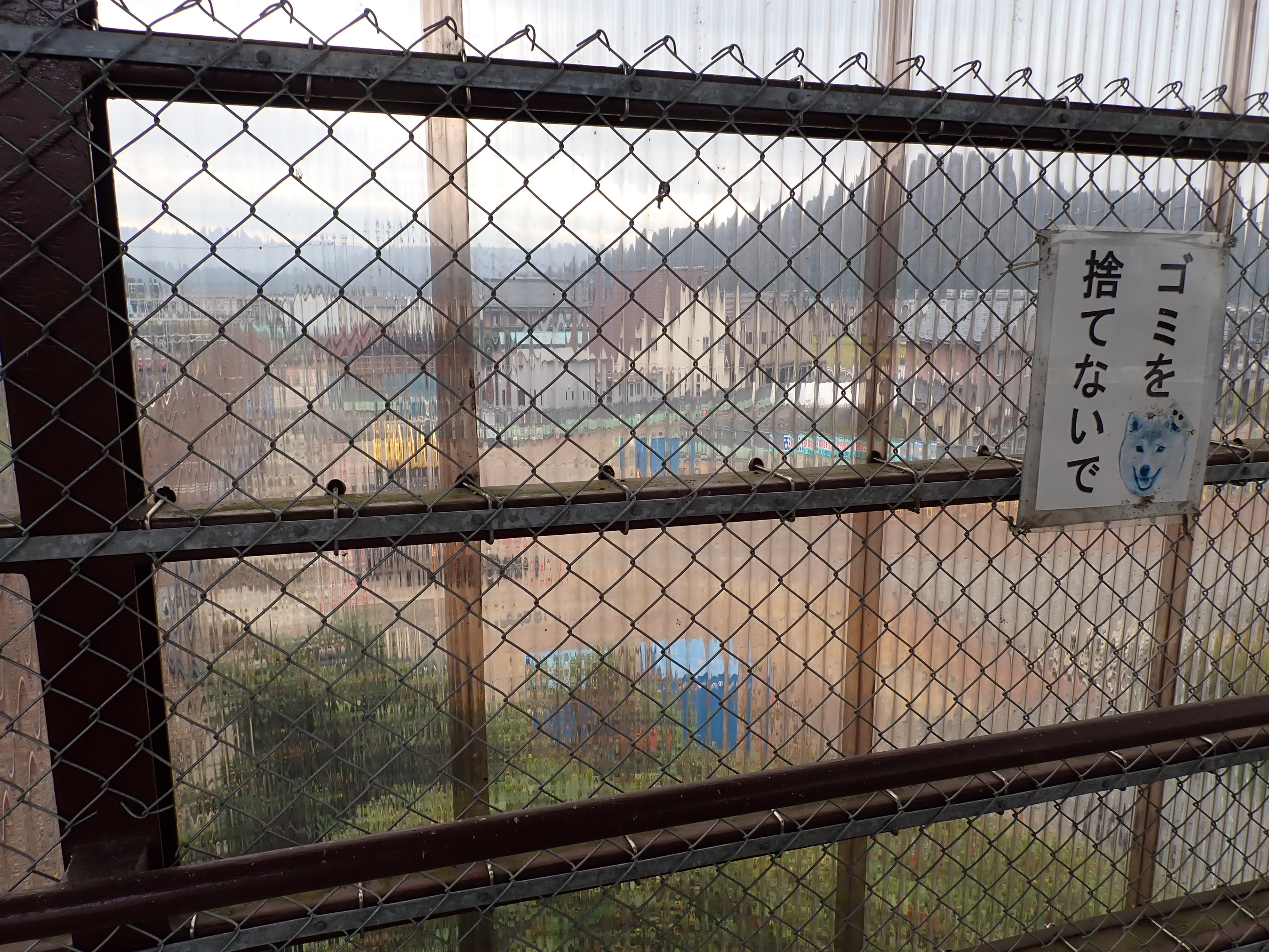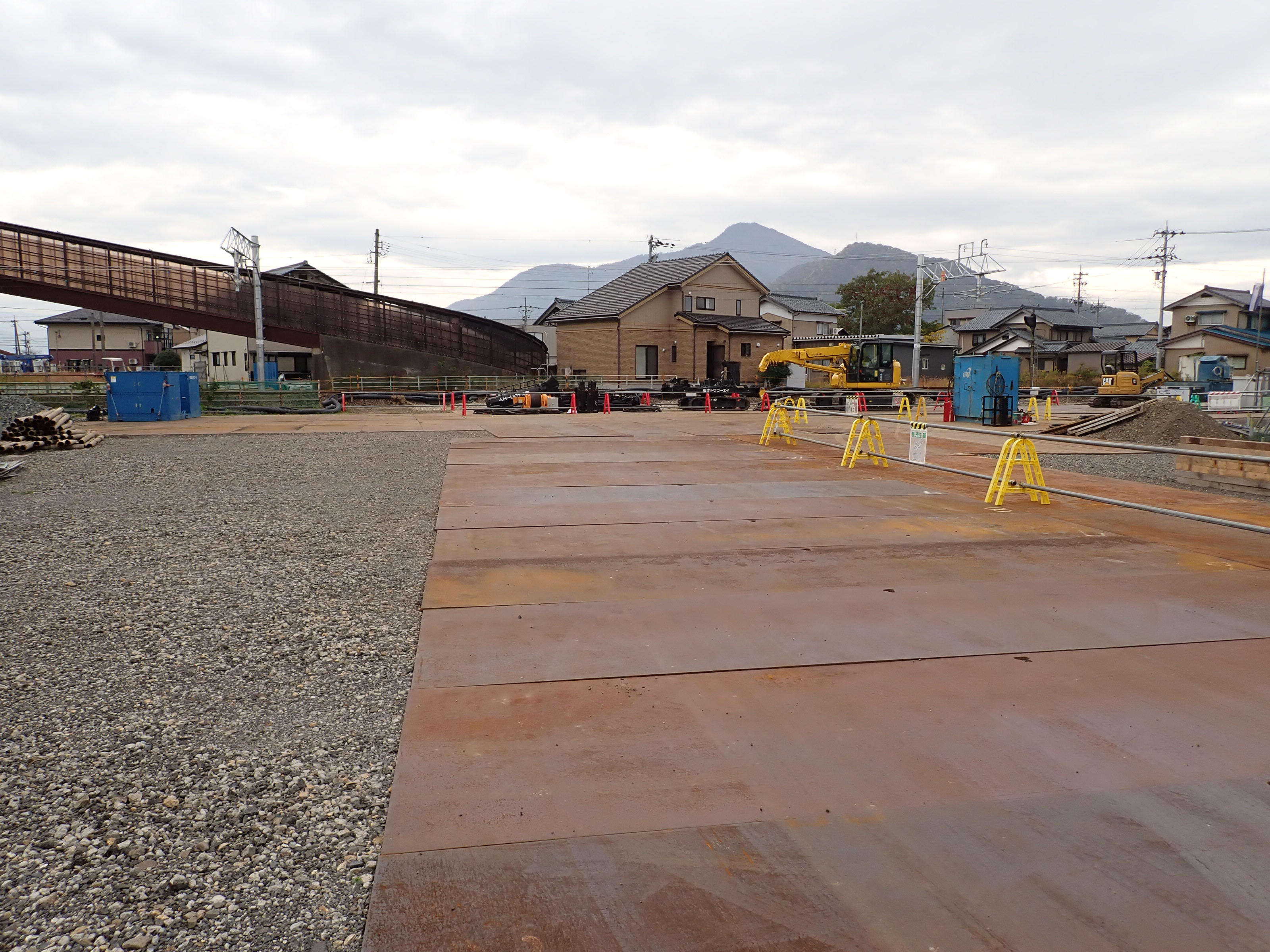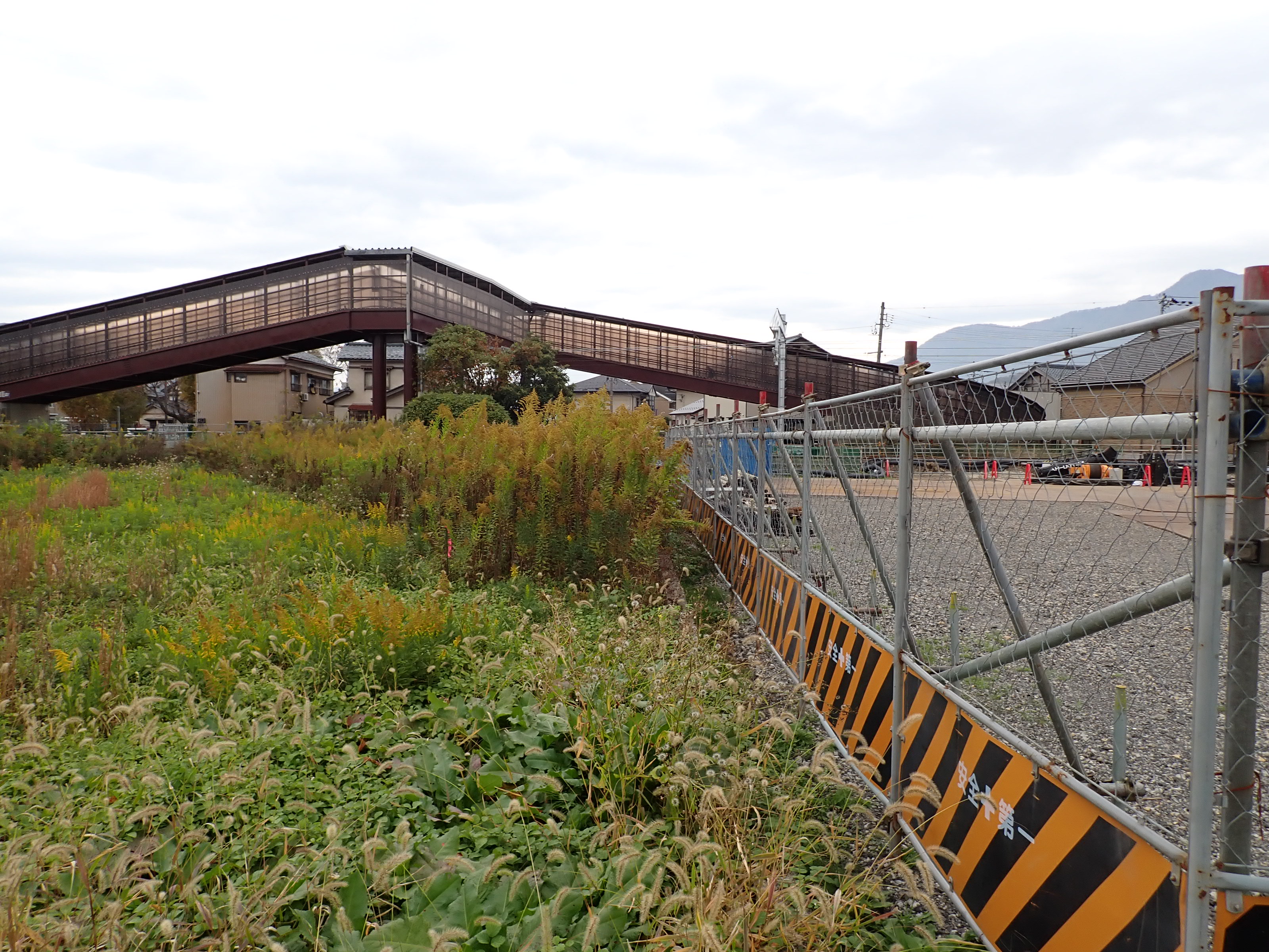 歩道橋内の様子とプラスチックトタン越しに見た駅が作られるところ。